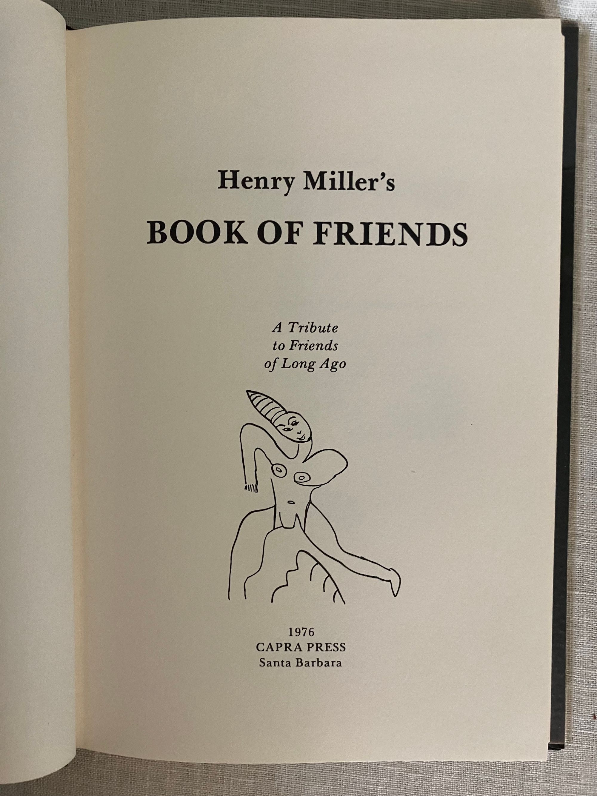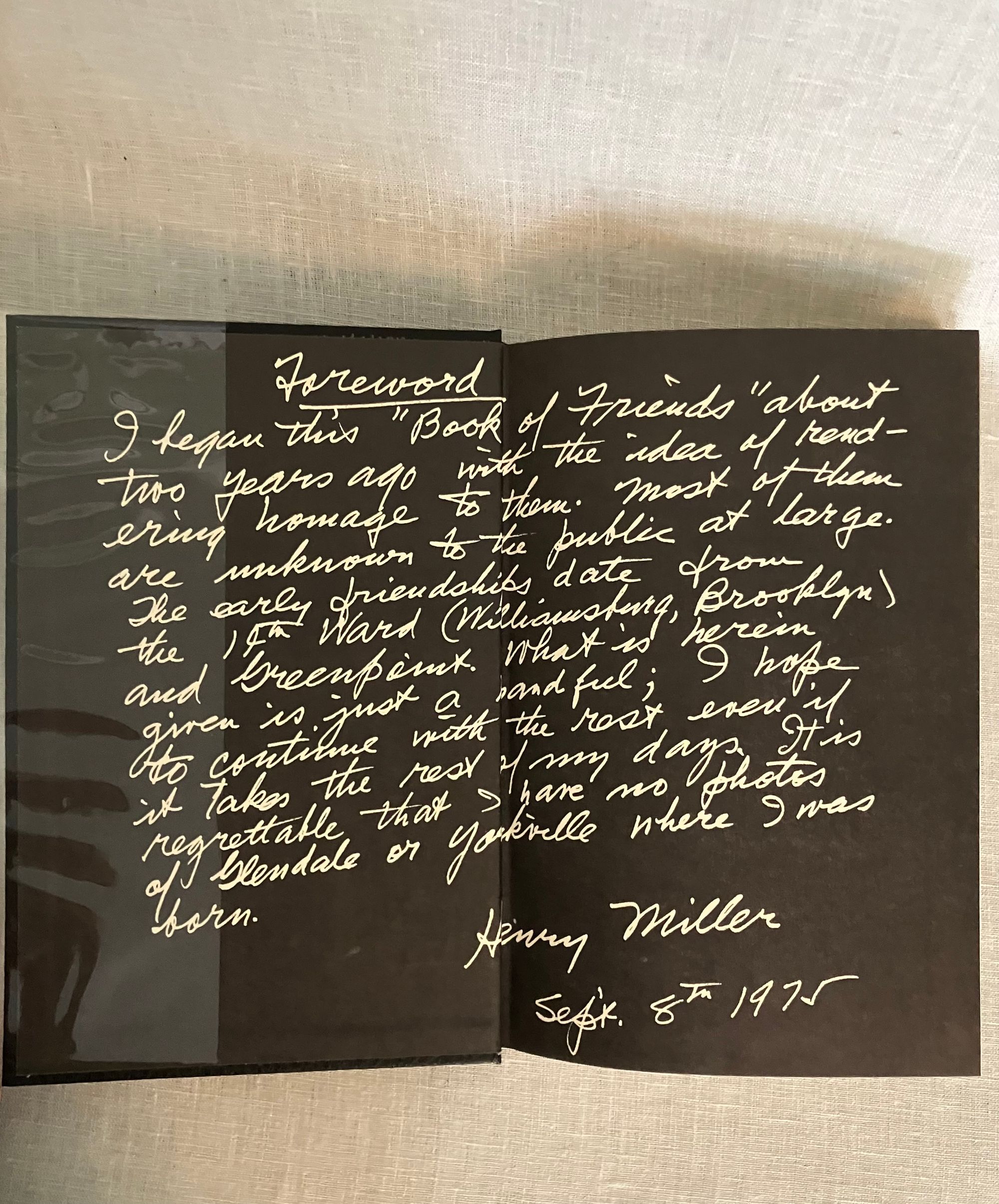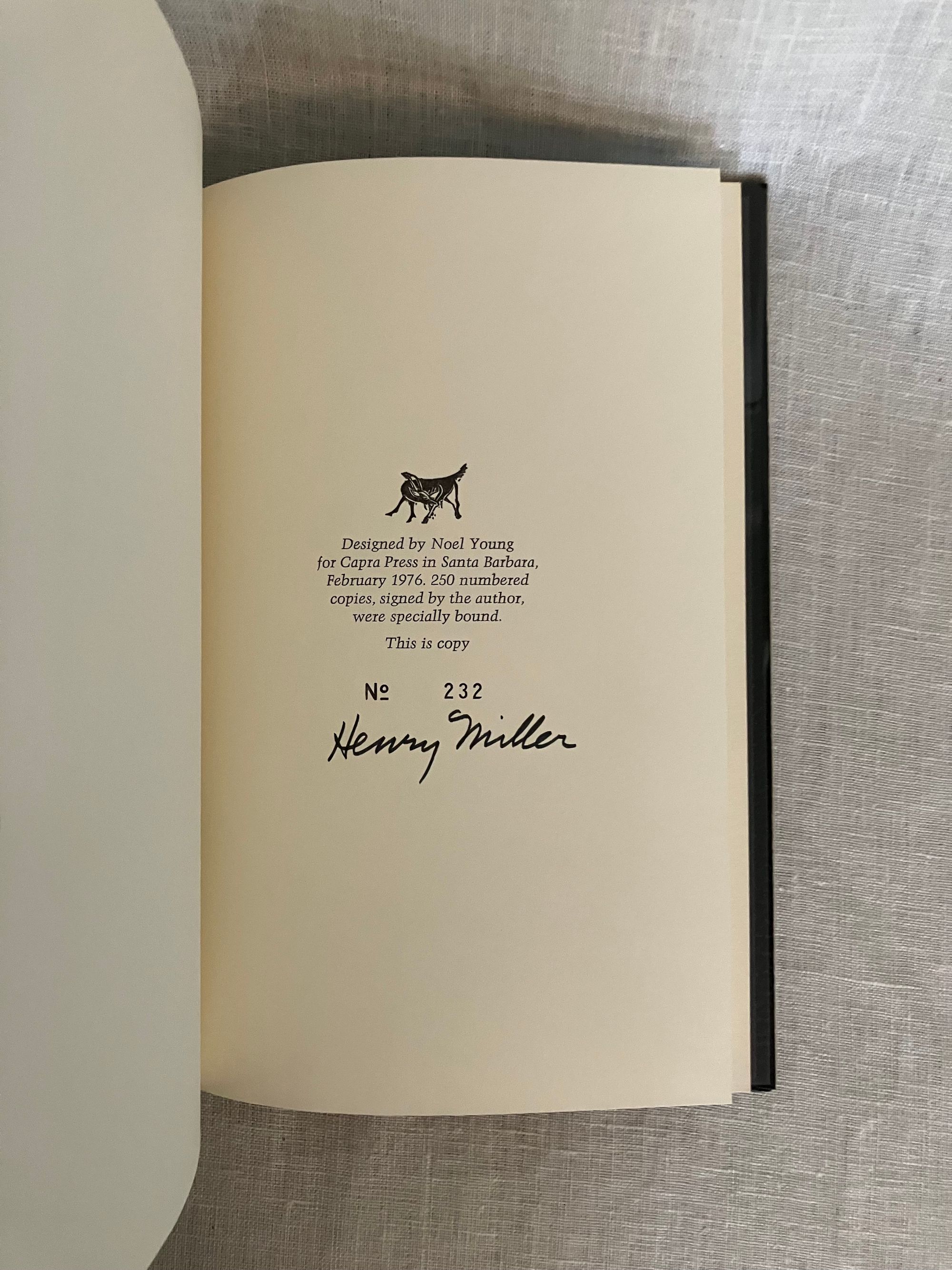 Hard cover, 8vo, in black morocco-like binding in the original acetate cover, with the artist's name in facsimile stamped in blind to the front board. Black endpapers with facsimile handwritten text of Miller's Foreword. Illustrated title page using one of Miller's drawings, and featuring photos of the New York neighborhoods mentioned in these reminiscences of the Author's youth. 138 pp. Colophon limitation page at rear lists designer Noel Young for the Capra Press, no. 232 of 250 copies, signed by Henry Miller. Printed by R.R. Donnelly & Sons, bound by Rood Associates. CONDITION: Fine, in a Near Fine, original acetate wrapper which has one small closed tear at the head of the spine.**This literary memoir is told through the stories about the Author's childhood friends, family and formative experiences growing up in the rough and tumble of New York around the turn of the twentieth century. His descriptions of a distant, unempathetic relationship with his German immigrant parents set the stage, perhaps, for his escape from the strictures of polite society and extensive travels which would later see him embracing his best creative, bohemian self. Henry Miller's (1891-1980), most famous novels, "The Tropic of Cancer" and "The Tropic of Capricorn" were long banned for censorship in his native United States. A famous case before the Supreme Court in 1964 deemed them acceptable literature. He has been credited with influencing the Beat generation authors such as Jack Kerouac.