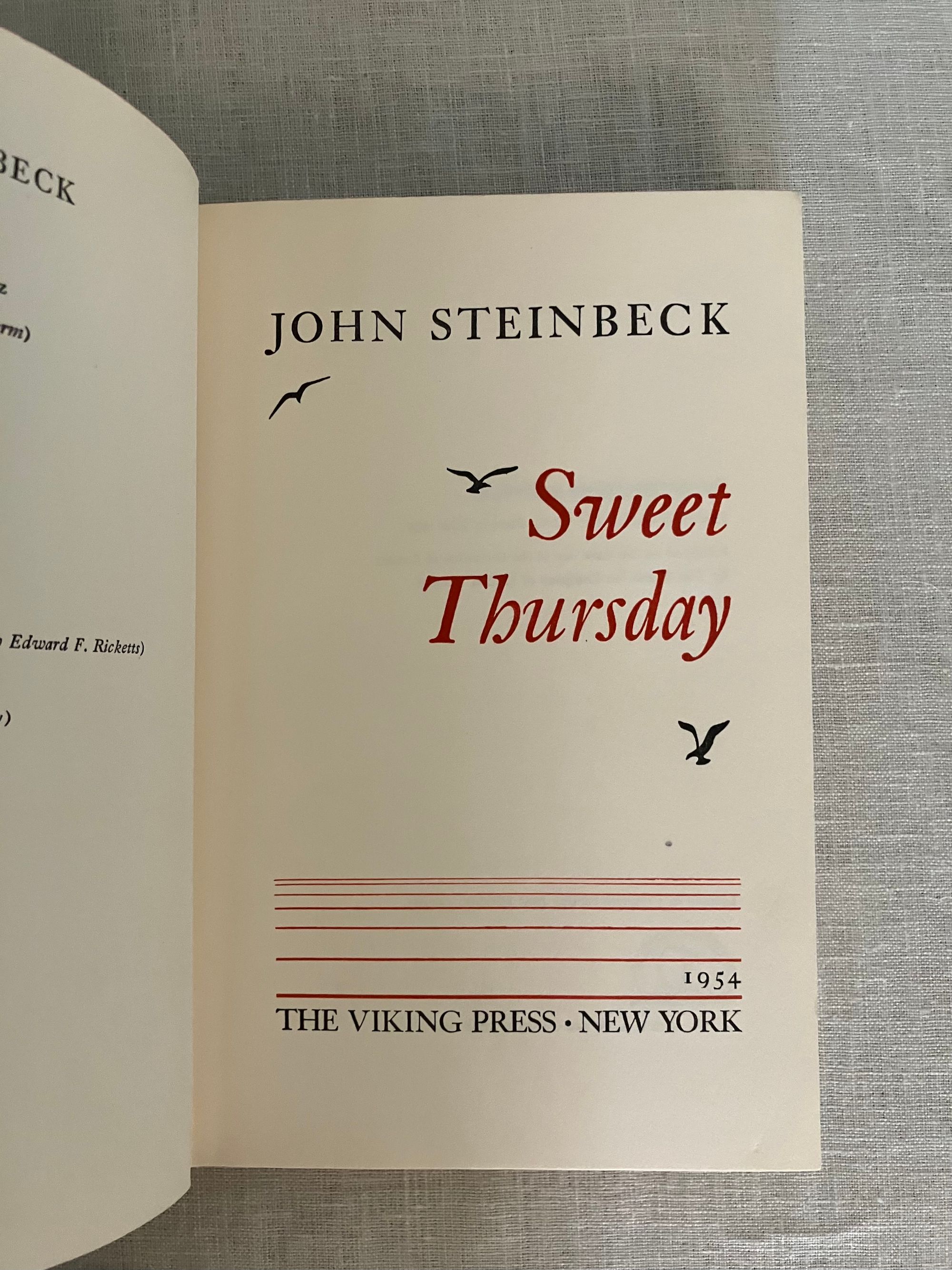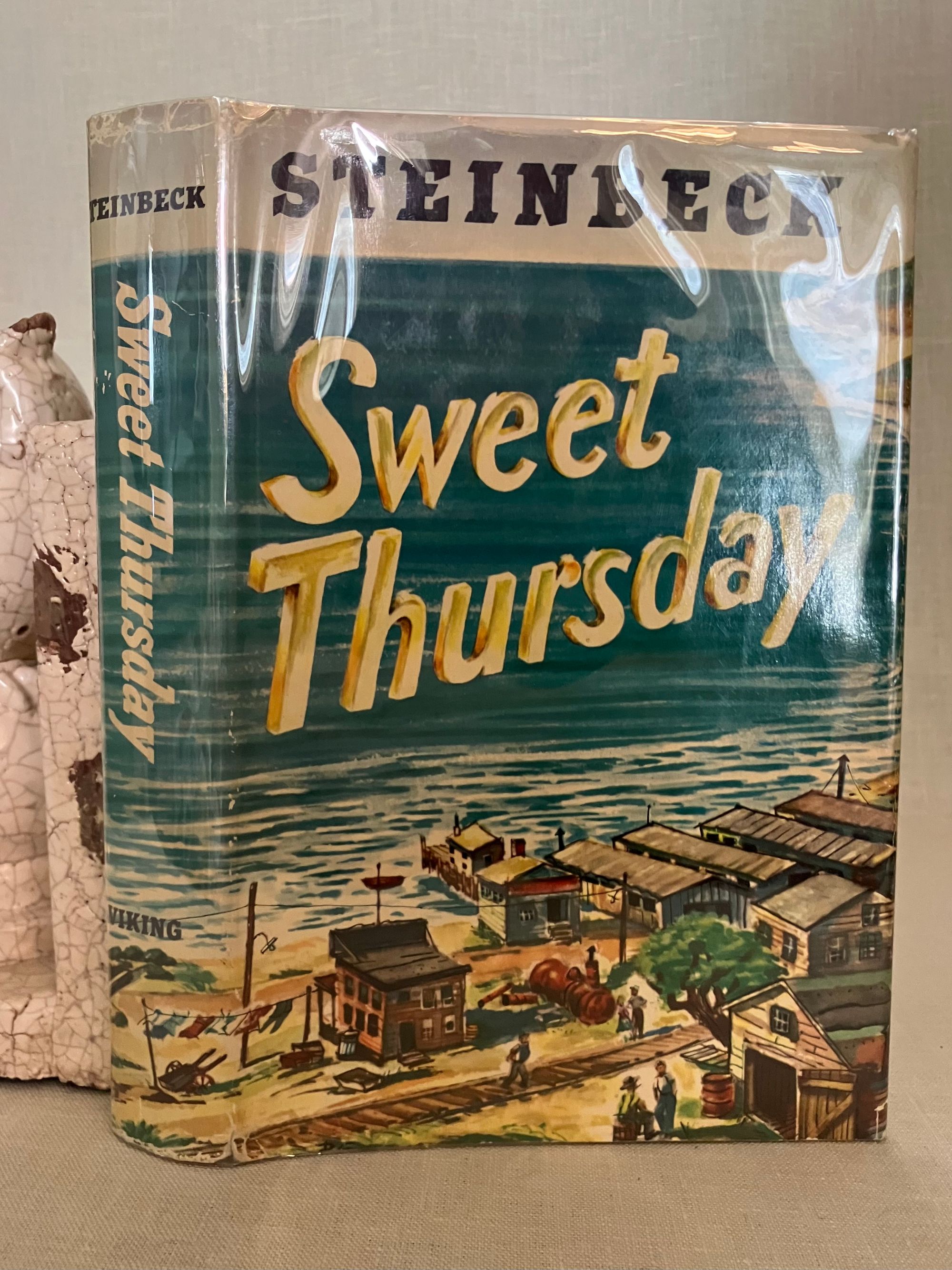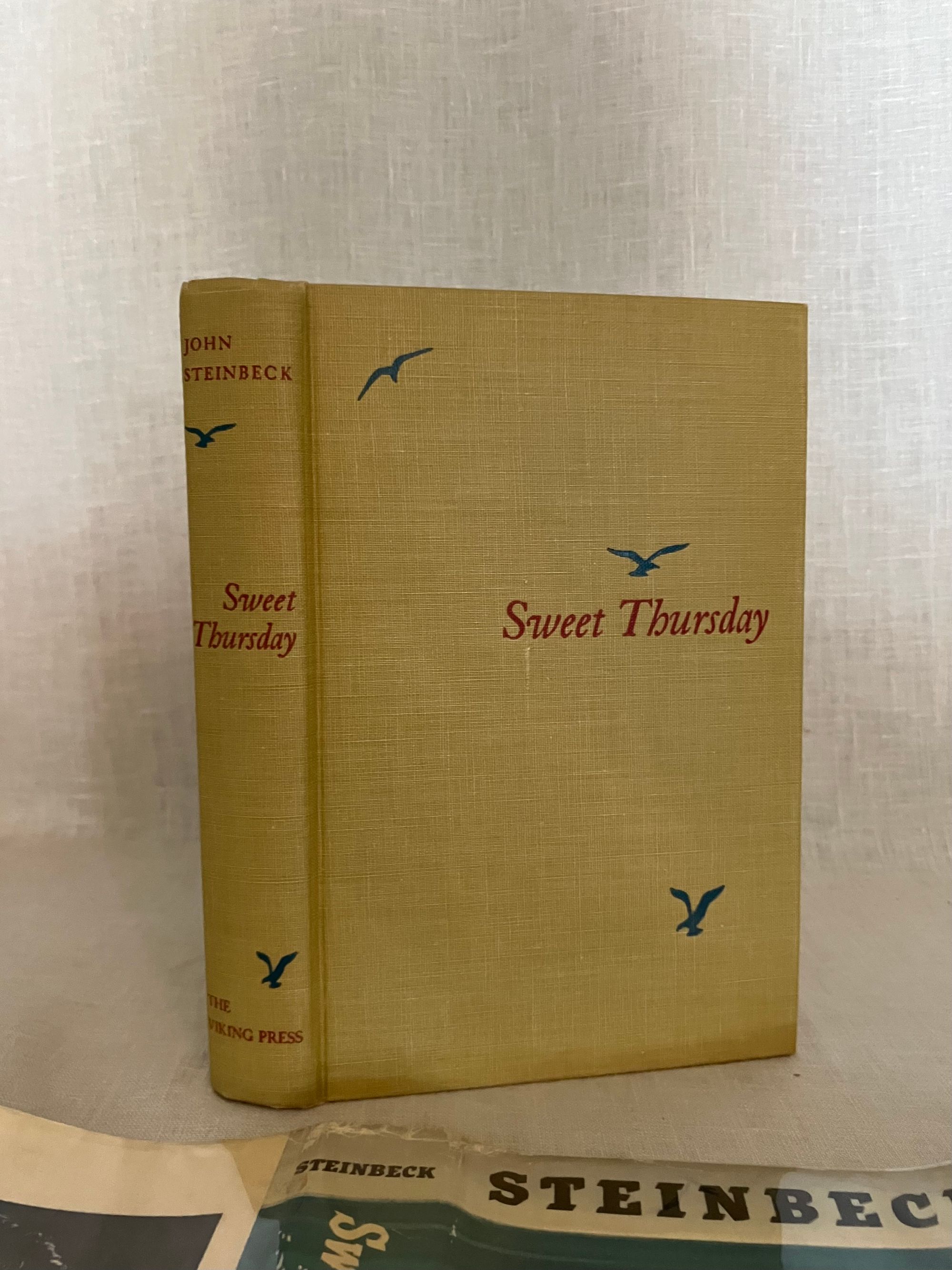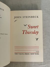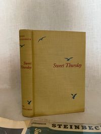 Hard cover, 8vo, in tan cloth covered boards printed with seagull decoration in teal and titles in red to boards and along spine. Top edge text block stained red. vii-x, [1]-273pp. CONDITION: Fine. Volume is very clean, with no observed faults. Dust jacket is Very Good (or a bit better) having some signs of wear at the head and foot of the spine, and a one inch closed tear at fore edge. It is not price clipped. It remains quite bright and clean. Jacket is protected in a mylar cover. This work is a continuation of the story begun with Steinbeck's 1945's novel, "Cannery Row." The derelict fish-canning district of Monterey, California is again the scene of the action, after World War II, with the homeless characters "Mack and the boys" portrayed as the skid row sidekicks of marine biologist and octopi aficionado, Doc. Doc struggles to make relevant research for Western Biological Labs. Meanwhile, a love interest, in the person of Suzy, a young woman down on her luck whom he encounters at The Bear Flag, develops, giving him the required inspiration to make a go of things. Humor, and an appreciation for the variety of particularly American characters found in these pages make this a worthy read. (Some adult content.) This book was the basis for the Rogers and Hammerstein musical "Pipe Dream," which opened on Broadway in November, 1955. It also was adapted into the 1982 movie "Cannery Row," starring Nick Nolte and Debra Winger. Goldsmith & Payne A33b, first cloth edition, p. 79. Bradford Morrow Catalogue Eight, "John Steinbeck, Harry Valentine Collection," (Santa Barbara, Cunningham Press, 1980), same as No. 227.p. 57.