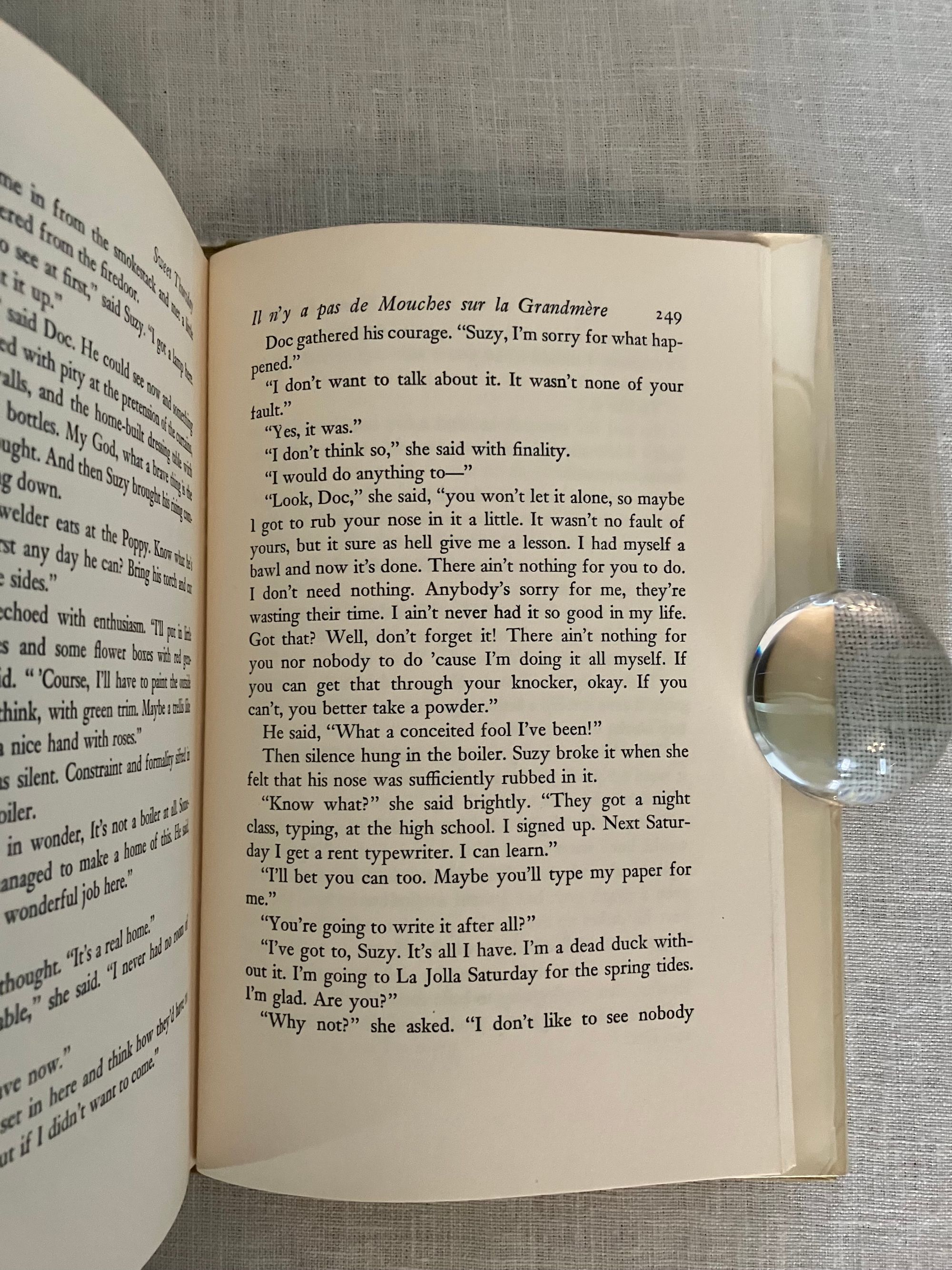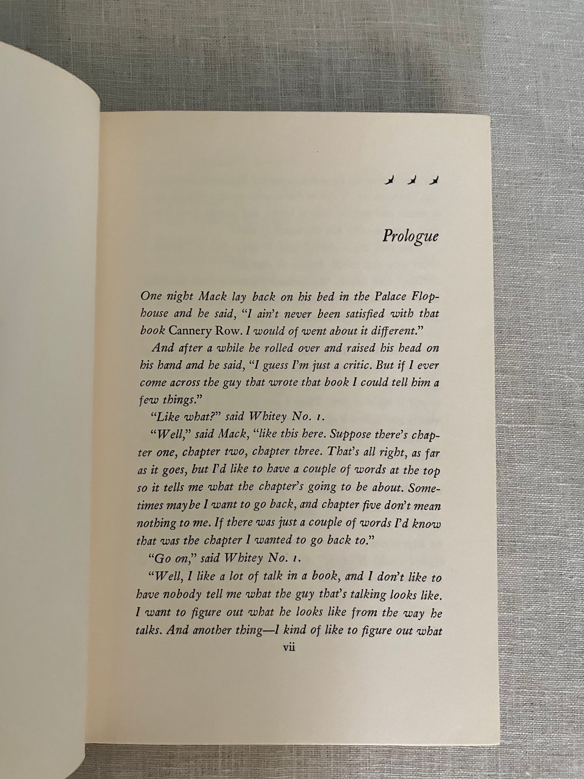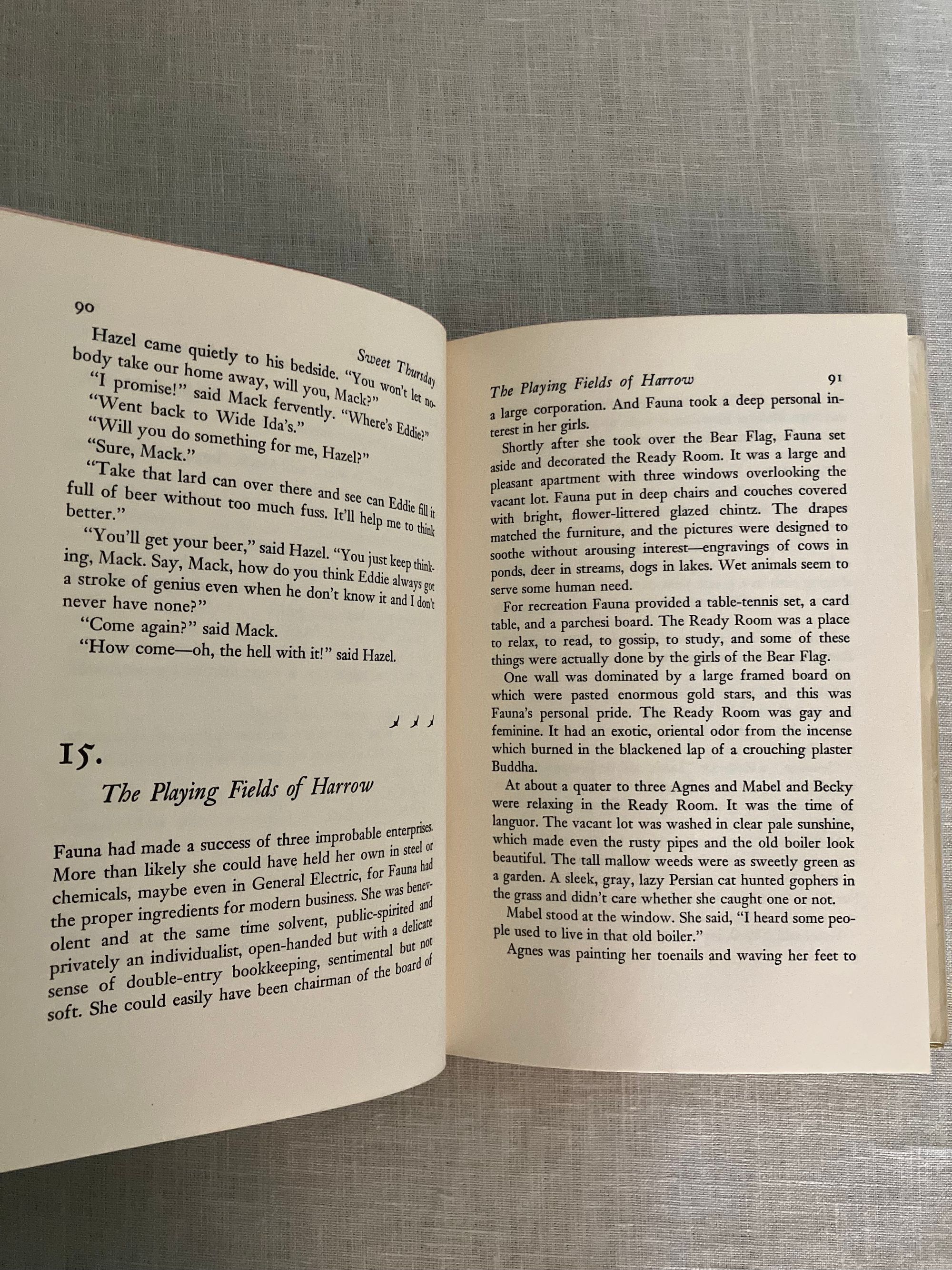 Hard cover, 8vo, in tan cloth covered boards printed with seagull decoration in teal and titles in red to boards and along spine. Top edge text block stained red. vii-x, [1]-273pp. CONDITION: Fine. Volume is very clean, with no observed faults. Dust jacket is Very Good (or a bit better) having some signs of wear at the head and foot of the spine, and a one inch closed tear at fore edge. It is not price clipped. It remains quite bright and clean. Jacket is protected in a mylar cover. This work is a continuation of the story begun with Steinbeck's 1945's novel, "Cannery Row." The derelict fish-canning district of Monterey, California is again the scene of the action, after World War II, with the homeless characters "Mack and the boys" portrayed as the skid row sidekicks of marine biologist and octopi aficionado, Doc. Doc struggles to make relevant research for Western Biological Labs. Meanwhile, a love interest, in the person of Suzy, a young woman down on her luck whom he encounters at The Bear Flag, develops, giving him the required inspiration to make a go of things. Humor, and an appreciation for the variety of particularly American characters found in these pages make this a worthy read. (Some adult content.) This book was the basis for the Rogers and Hammerstein musical "Pipe Dream," which opened on Broadway in November, 1955. It also was adapted into the 1982 movie "Cannery Row," starring Nick Nolte and Debra Winger. Goldsmith & Payne A33b, first cloth edition, p. 79. Bradford Morrow Catalogue Eight, "John Steinbeck, Harry Valentine Collection," (Santa Barbara, Cunningham Press, 1980), same as No. 227.p. 57.