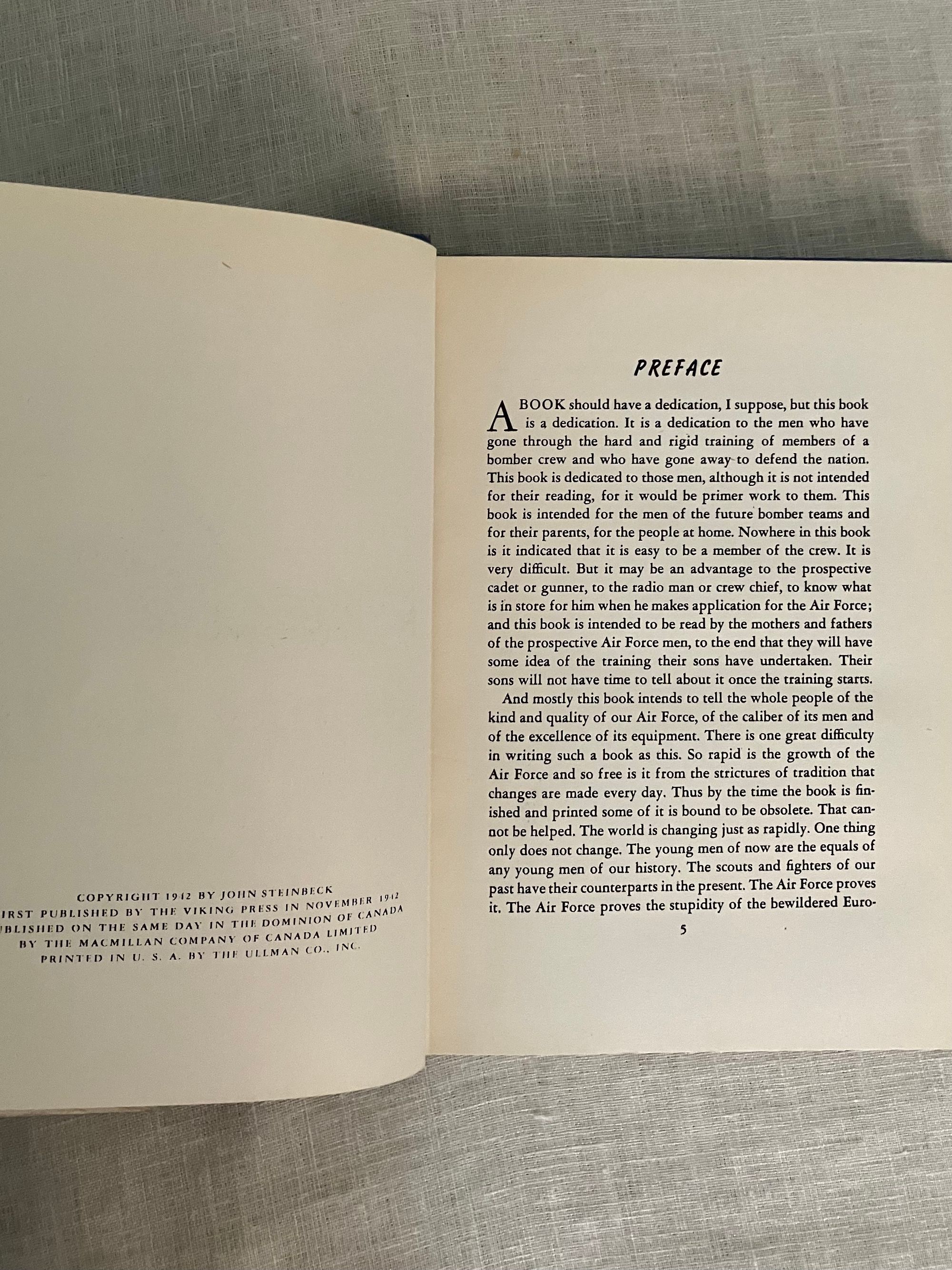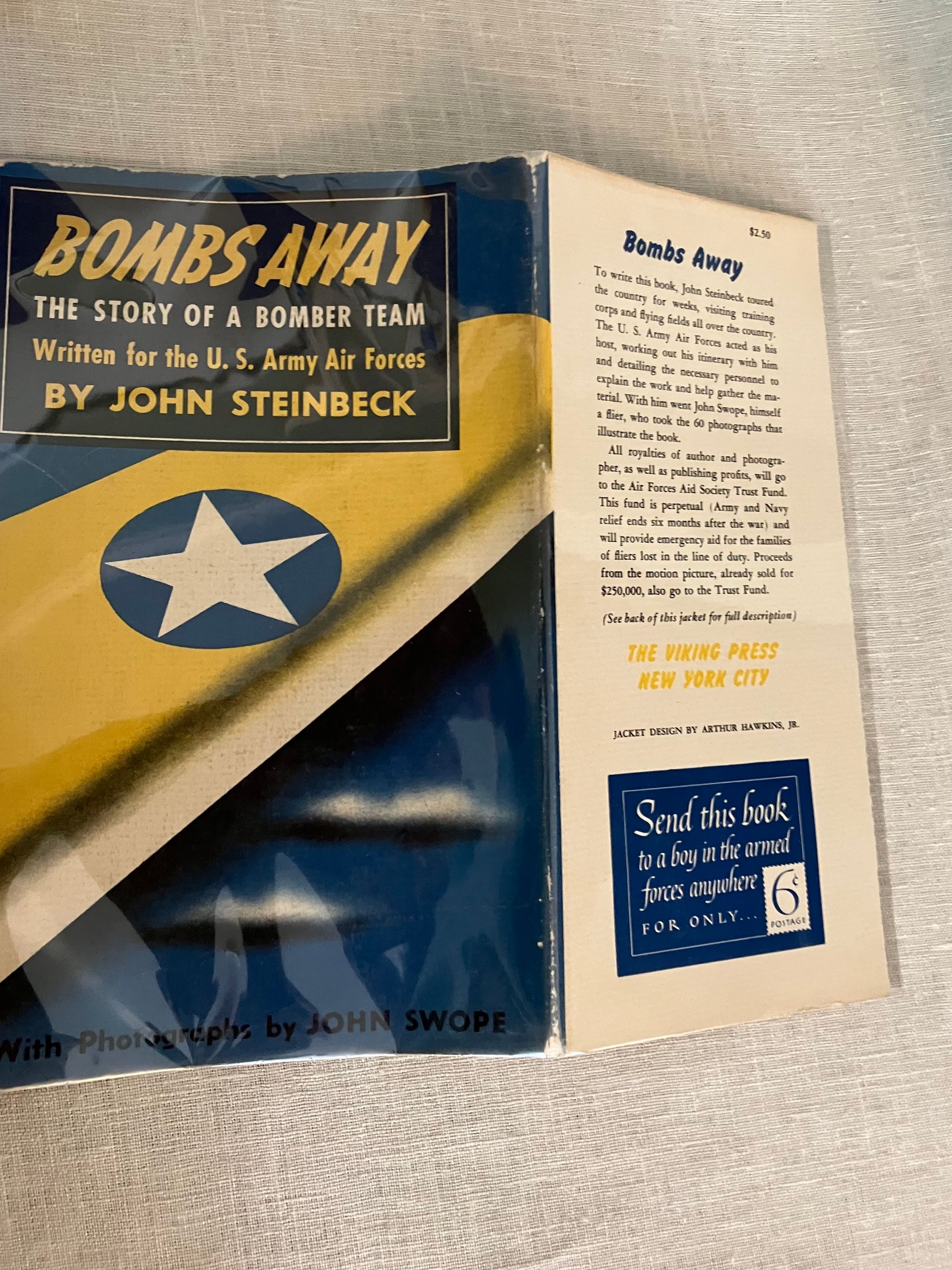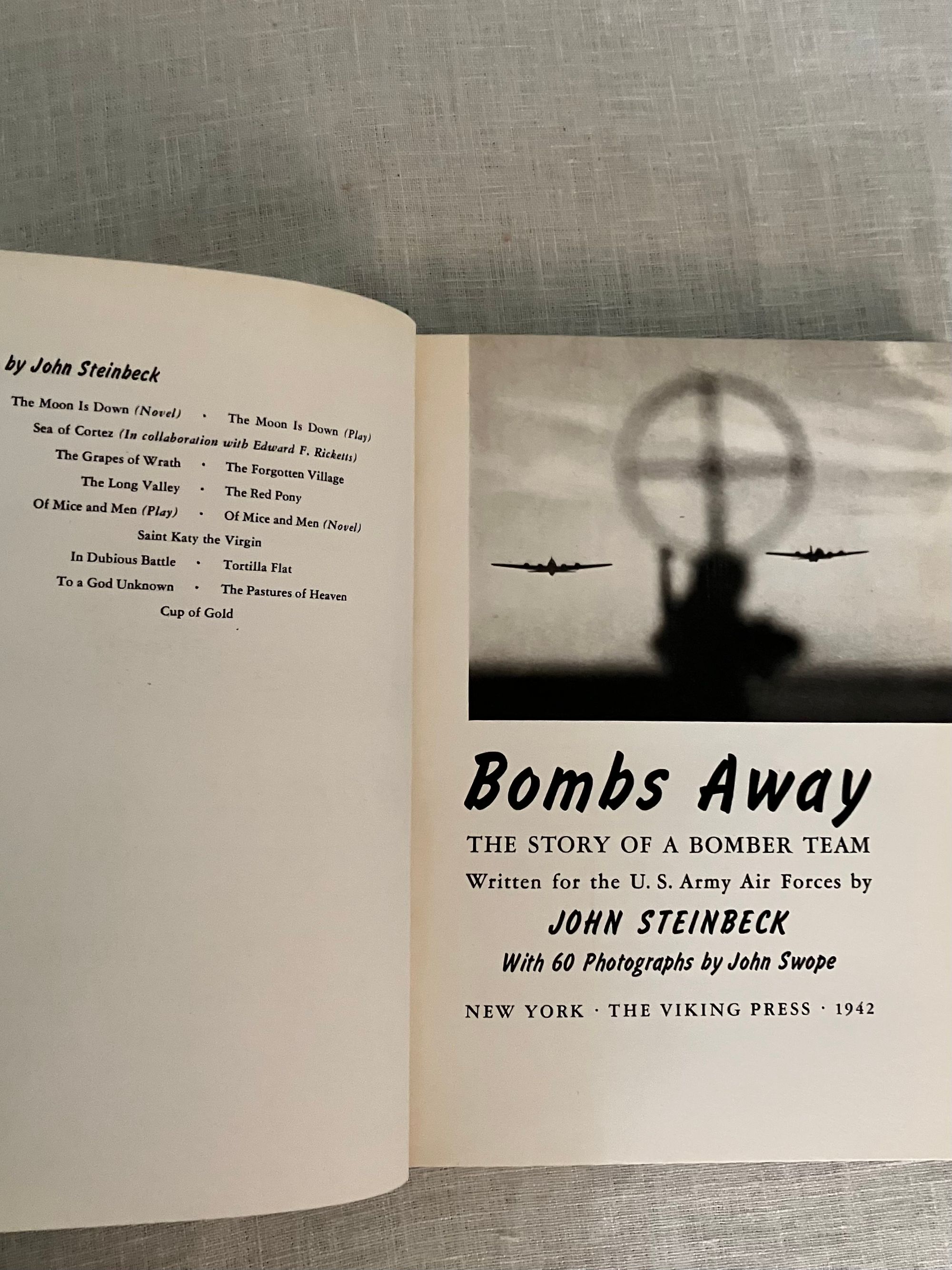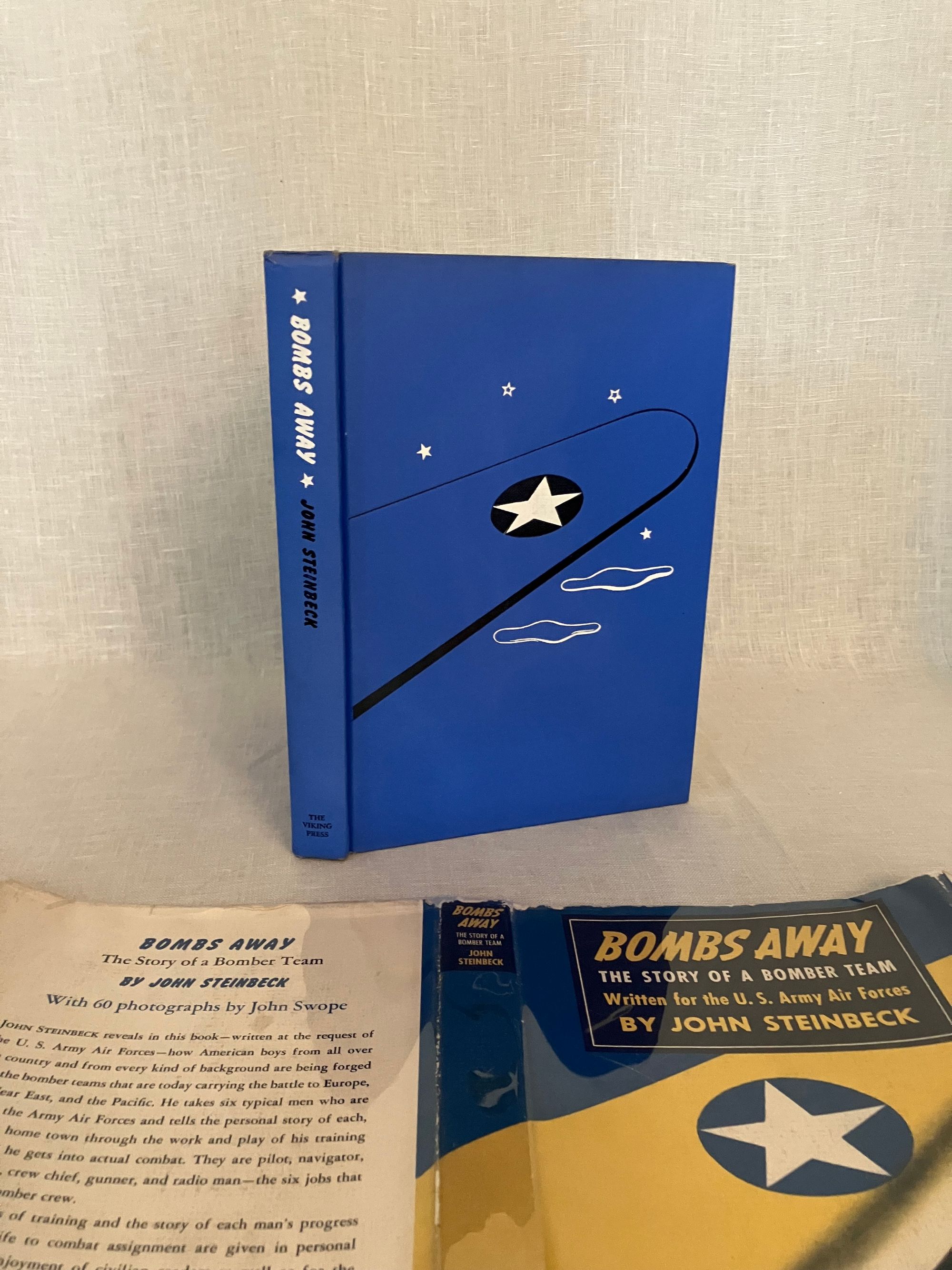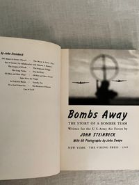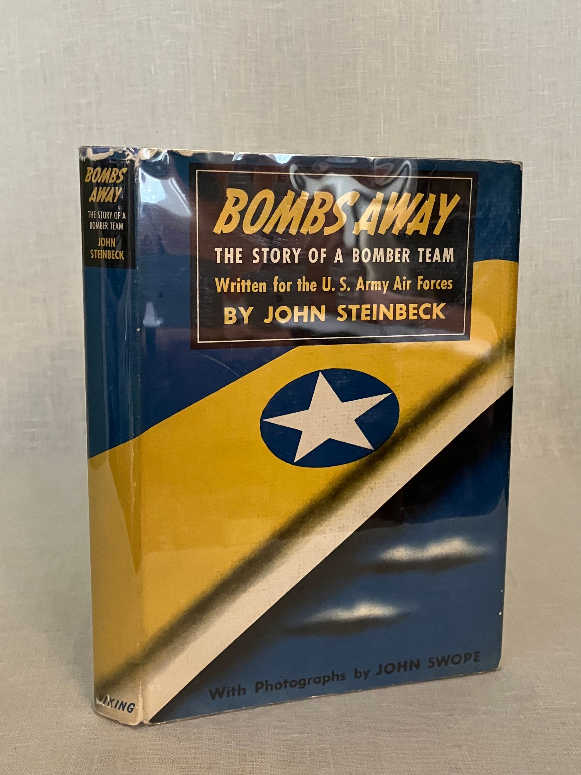 Hard cover, 8vo, in blue cloth decorated with white and black stars, clouds and airplane exhaust trail. Title in white to spine, author name in black. 184 [185] pp. CONDITION: Near Fine, with former owner's name to front endpaper and an old price in pen. Dust jacket is Very Good, and not price clipped. Small fold and quarter inch closed tear on upper rear panel, and some rubbing along rear joint of jacket. A few small chips missing on upper front edge of jacket. Book is otherwise clean, with no bumping, hinges in order. Illustrated with 60 black and white photographs by John Swope. This non-fiction work was written by Steinbeck as a patriotic contribution to the war effort during World War II, and promoted for the parents and families of Air Force personnel, or those considering enlistment. Includes stories of famous aviators and aircraft such as the Flying Fortress, and the B-24 bomber. Goldsmith & Payne, A18a. Tetsumaro Hayashi, "A New Steinbeck Bibliography 1929-1971," (Metuchen, NJ: Scarecrow Press, 1973), No. 79 (non-fiction books).