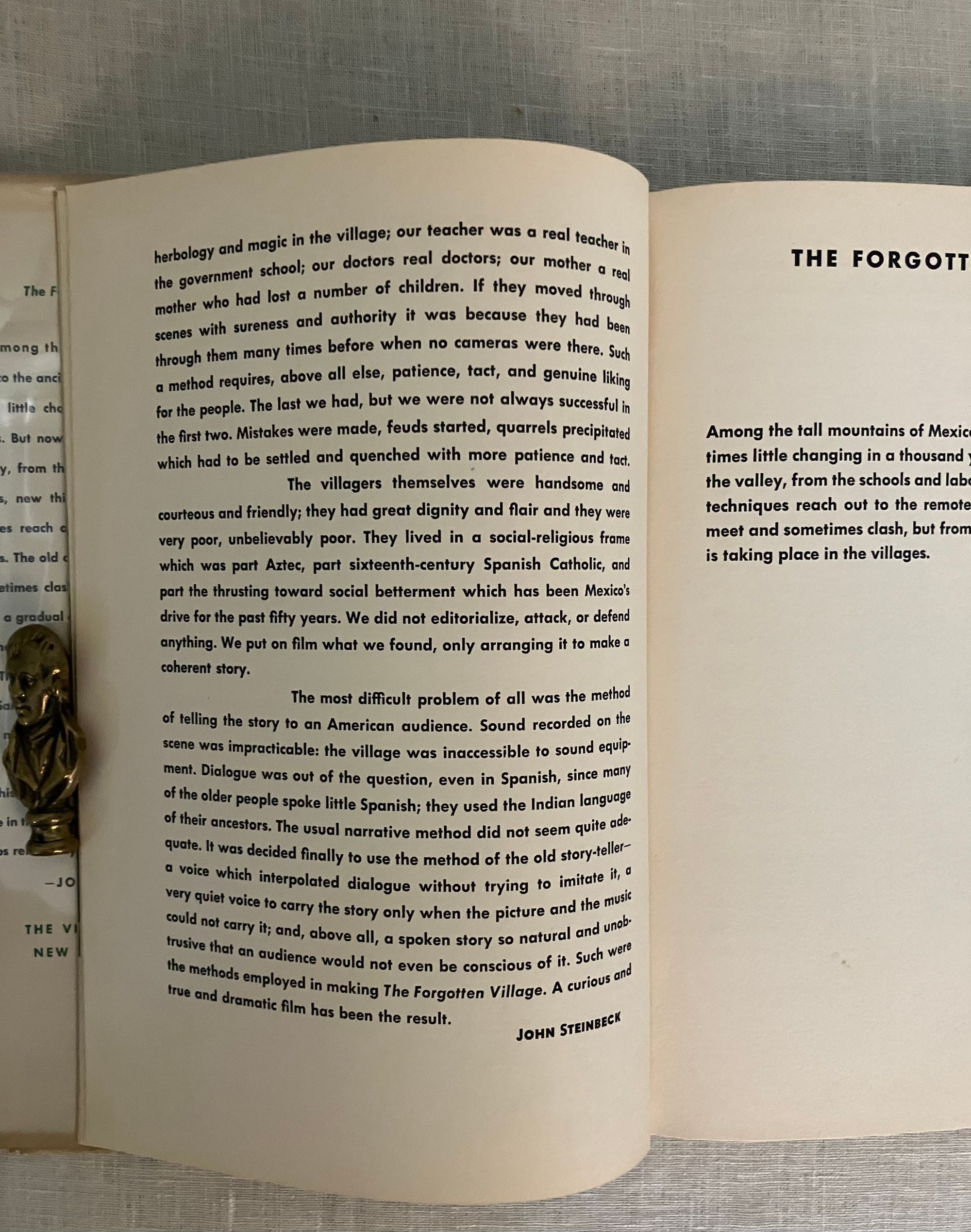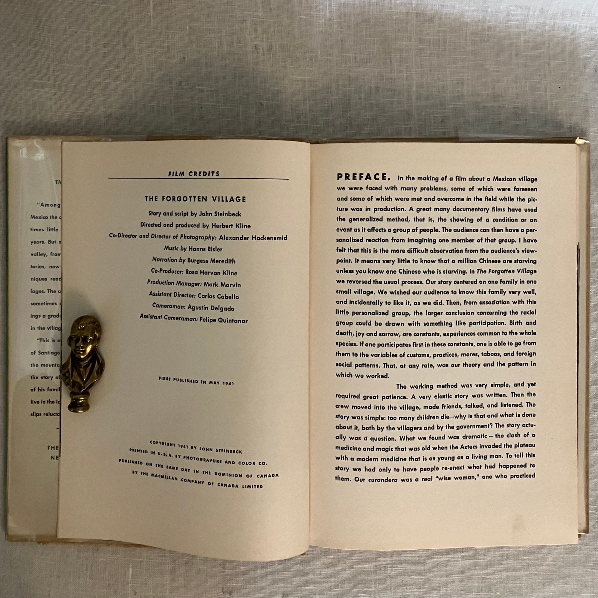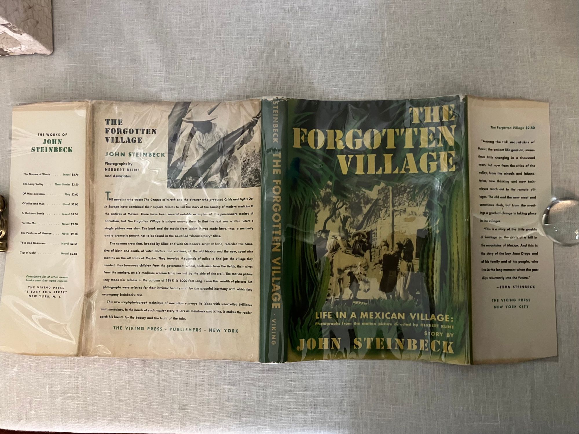 Hard cover, 4to, in natural woven cloth printed in green with pictorial scene of a farmer to the front board, the titles running vertically down the spine. In the original dust jacket, illustrated with a scene from the documentary short film, also written by John Steinbeck, and directed by Herbert Kline and Alexander Hammid. **CONDITION: Very Good Plus, in a Very Good Plus d/j. Book endpapers somewhat browned, with minor soiling to a few pages. Dust jacket with one small closed tear and a few small chips at head and foot of spine. No price to d/j, with uniformly clipped corner shaping. In a mylar protector. **The book, a work of social realism, tells the story of a boy, Juan Diego and his family living in the mountainous village of Santiago, Mexico, at a time when traditional life and culture were coming into conflict with the modern world. He faces a stark choice between acceptance from his father, or leaving to become scientifically educated at a government school. Written in its entirety before shooting began, the book incorporates 136 photographic stills from the film. The challenges of rural healthcare, including death from preventable childhood disease, superstition of modern medical practice, and dangerous births and death, had the film banned in the 1940's for what at the time was considered too graphic content under the censorship guidelines of The Hays Code. However, it was finally released without this certification. A revival of the film in 2011 was produced by UCLA's Film and Television Archive and the Packard Humanities Institute, with showings at film festivals that year. The film was nominated for a Best Documentary award by the National Board of Review in 1941. Also, the Director, Herbert Kline was nominated in 1949 for the Golden Lion Award at The Venice Film Festival. (IMDb.) Tetsumaro Hayashi, A New Steinbeck Bibliography 1929-1971.(Metuchen, NJ: Scarecrow Press, 1973.) No. 73 under "Film Stories and Scripts."
