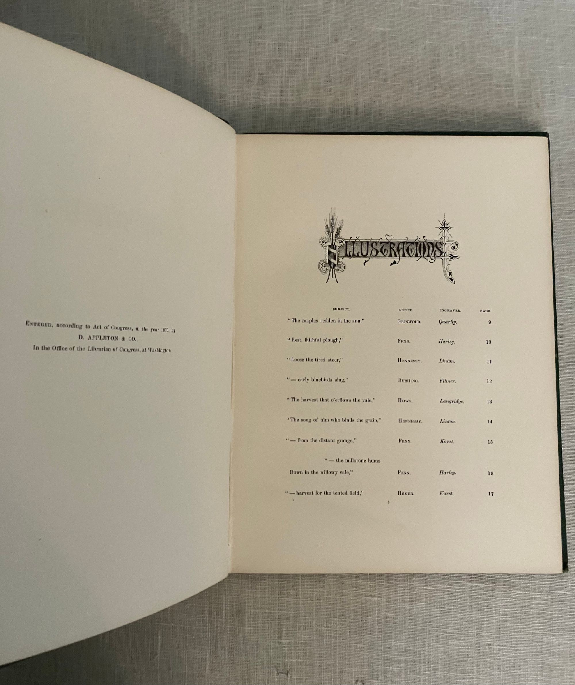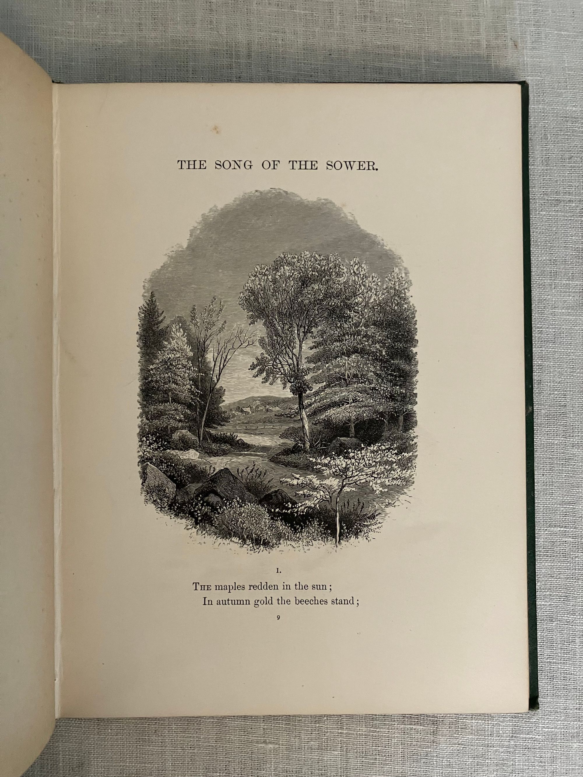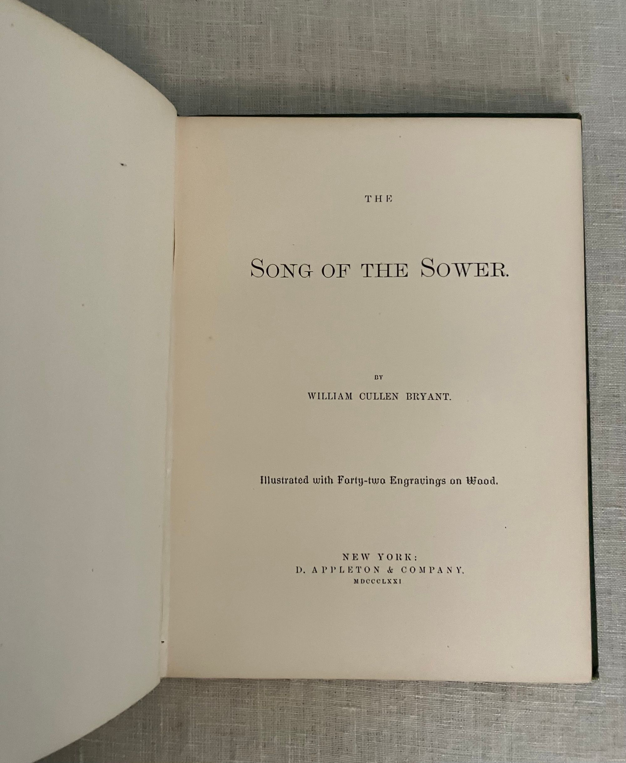 First illustrated edition. Hard cover, Crown 8vo, (measuring 6 ΒΌ x 9 inches) in publisher's original green cloth, blocked in black and gold with bands of floral and fleur de lis decoration. Boards with chamfered edges. Titles to center top board in gilt. The decorated spine features a lyre and wheat sprig in addition to the title. Rear board stamped in blind. All edges gilt, printed on glazed stock (japon?) 48 pp. Decorated half title. 42 illustrations each with facing blank page ( to counteract offset.) Copyright 1870; BAL says advertised release date was Dec. 1870. **CONDITION: Very Good. Minor rubbing to tips and very light fraying at head and foot of the spine. Inside, an Christmas 1871 gift inscription in old pencil to the ffep. All engravings face blank pages presumably to prevent offset. Several of the "guard" pages have moderate foxing to the lower third of the page, which does not affect the facing text or images. Hinges were reinforced at some point, in an inconspicuous repair. Spine cracked in one place. Pages lightly toned. **The Forty two engravings include three after American artist Winslow Homer (on pp. 17, 19 and 29), and others by the notable artists Harry Fenn and William John Hennessy. The very fine wood engraved art is notable for it detail and skill, and much care has been taken to design each page to link art to text. First released (without illustration) as part of 1864's "Thirty Poems," "The Song of the Sower," a Christian allegory, evocatively paints a picture of social challenges facing working men and women in the wake of nineteenth-century American work, highlighting the plight of those who are disadvantaged. Illustrations show, for instance, a female Massachusetts mill worker at her loom; a seamstress asleep at her work table; shipwrecked men; a starving homeless man; a widow and her hungry children, among others. The fate of these people is contrasted with those, including farmers, whose more direct connection with the land provides the solace of natural order. ** Massachusetts-born Poet WILLIAM CULLEN BRYANT (1794-1898), one of the Fireside poets, writes about the dignity and sacrifice of soldiers, and working men and women of the post-Civil War era. See Winslow Homer: A Descriptive Checklist of His Illustrations in Books, Princeton Univ. Library Chronicle, Nov. 1939 p. 27. BAL No. 1720. This would make a fine gift.