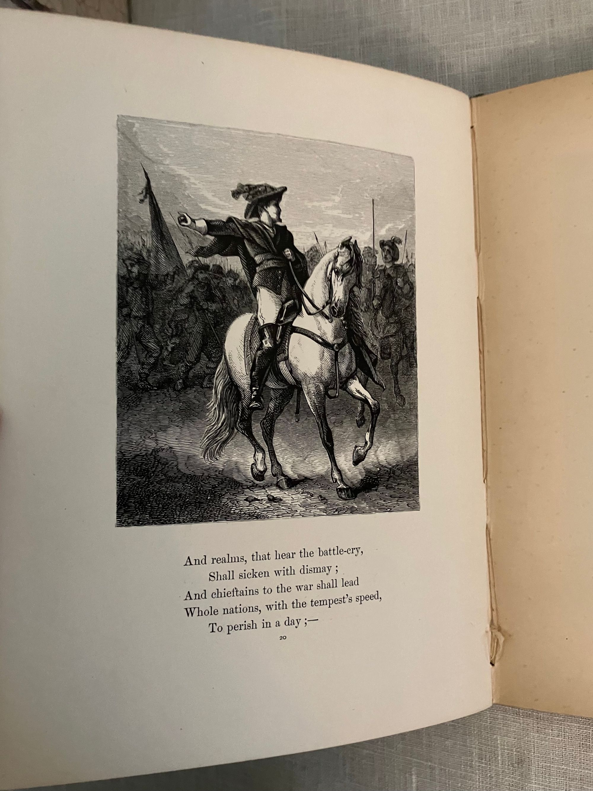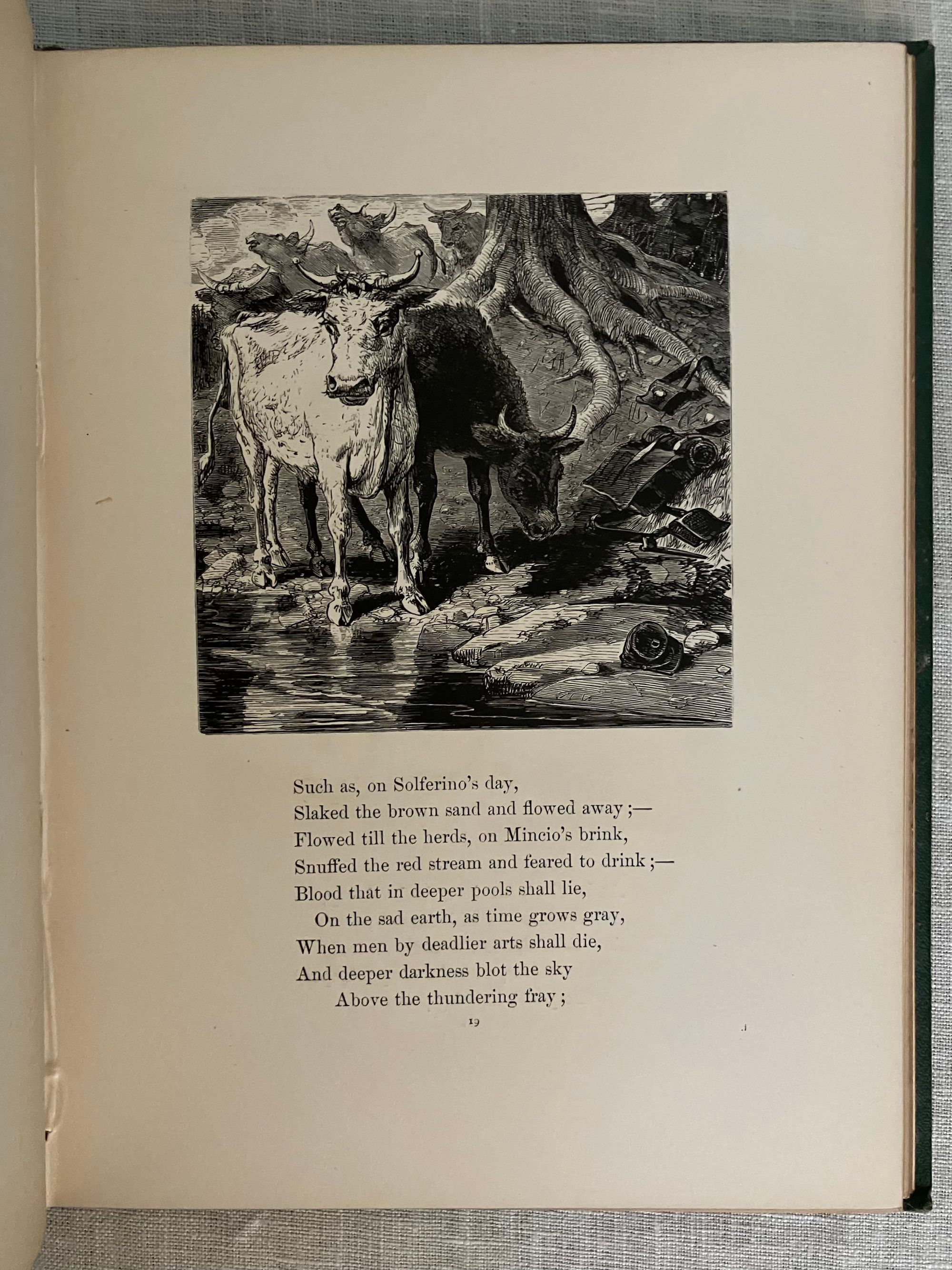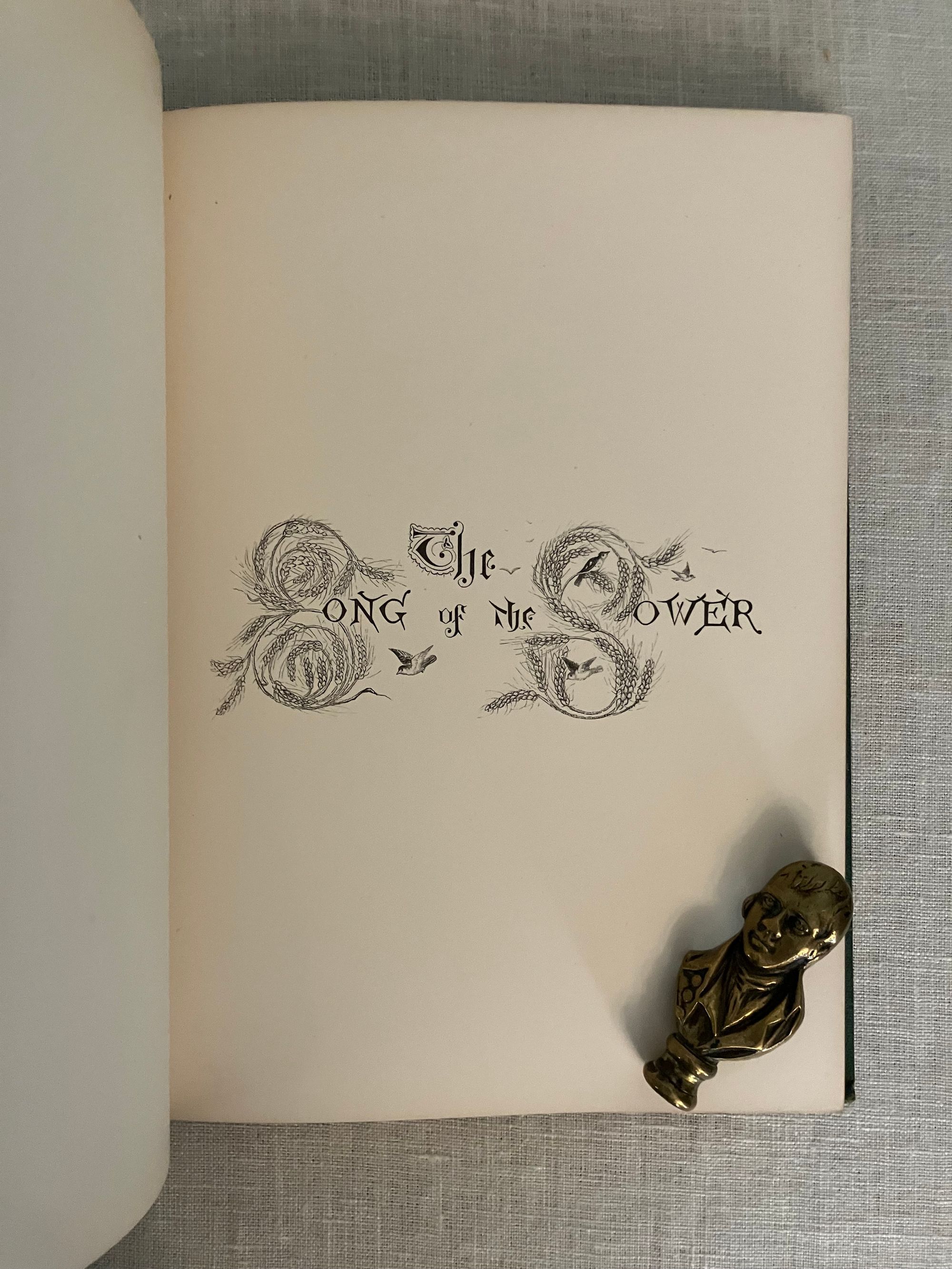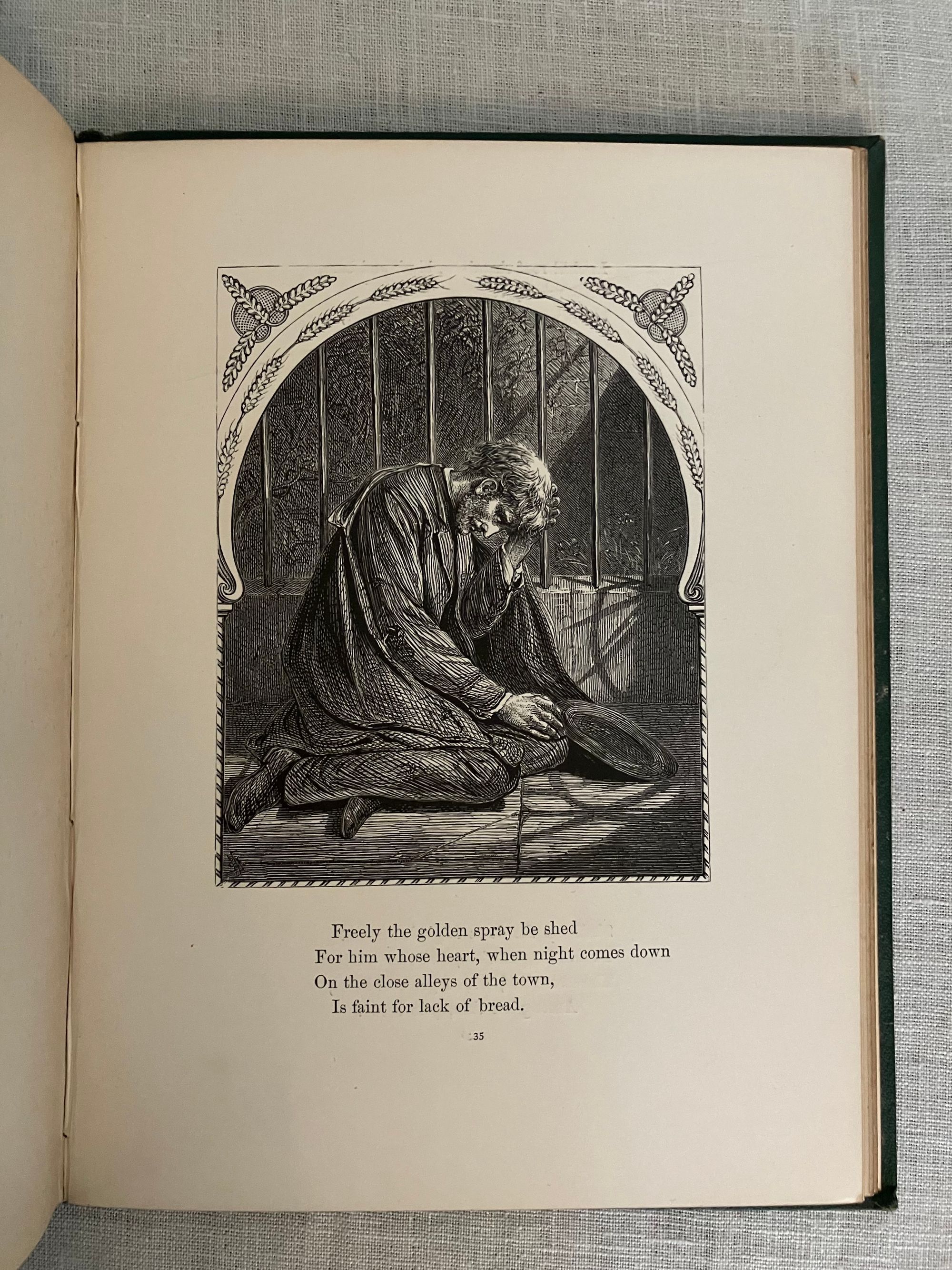 First illustrated edition. Hard cover, Crown 8vo, (measuring 6 ΒΌ x 9 inches) in publisher's original green cloth, blocked in black and gold with bands of floral and fleur de lis decoration. Boards with chamfered edges. Titles to center top board in gilt. The decorated spine features a lyre and wheat sprig in addition to the title. Rear board stamped in blind. All edges gilt, printed on glazed stock (japon?) 48 pp. Decorated half title. 42 illustrations each with facing blank page ( to counteract offset.) Copyright 1870; BAL says advertised release date was Dec. 1870. **CONDITION: Very Good. Minor rubbing to tips and very light fraying at head and foot of the spine. Inside, an Christmas 1871 gift inscription in old pencil to the ffep. All engravings face blank pages presumably to prevent offset. Several of the "guard" pages have moderate foxing to the lower third of the page, which does not affect the facing text or images. Hinges were reinforced at some point, in an inconspicuous repair. Spine cracked in one place. Pages lightly toned. **The Forty two engravings include three after American artist Winslow Homer (on pp. 17, 19 and 29), and others by the notable artists Harry Fenn and William John Hennessy. The very fine wood engraved art is notable for it detail and skill, and much care has been taken to design each page to link art to text. First released (without illustration) as part of 1864's "Thirty Poems," "The Song of the Sower," a Christian allegory, evocatively paints a picture of social challenges facing working men and women in the wake of nineteenth-century American work, highlighting the plight of those who are disadvantaged. Illustrations show, for instance, a female Massachusetts mill worker at her loom; a seamstress asleep at her work table; shipwrecked men; a starving homeless man; a widow and her hungry children, among others. The fate of these people is contrasted with those, including farmers, whose more direct connection with the land provides the solace of natural order. ** Massachusetts-born Poet WILLIAM CULLEN BRYANT (1794-1898), one of the Fireside poets, writes about the dignity and sacrifice of soldiers, and working men and women of the post-Civil War era. See Winslow Homer: A Descriptive Checklist of His Illustrations in Books, Princeton Univ. Library Chronicle, Nov. 1939 p. 27. BAL No. 1720. This would make a fine gift.