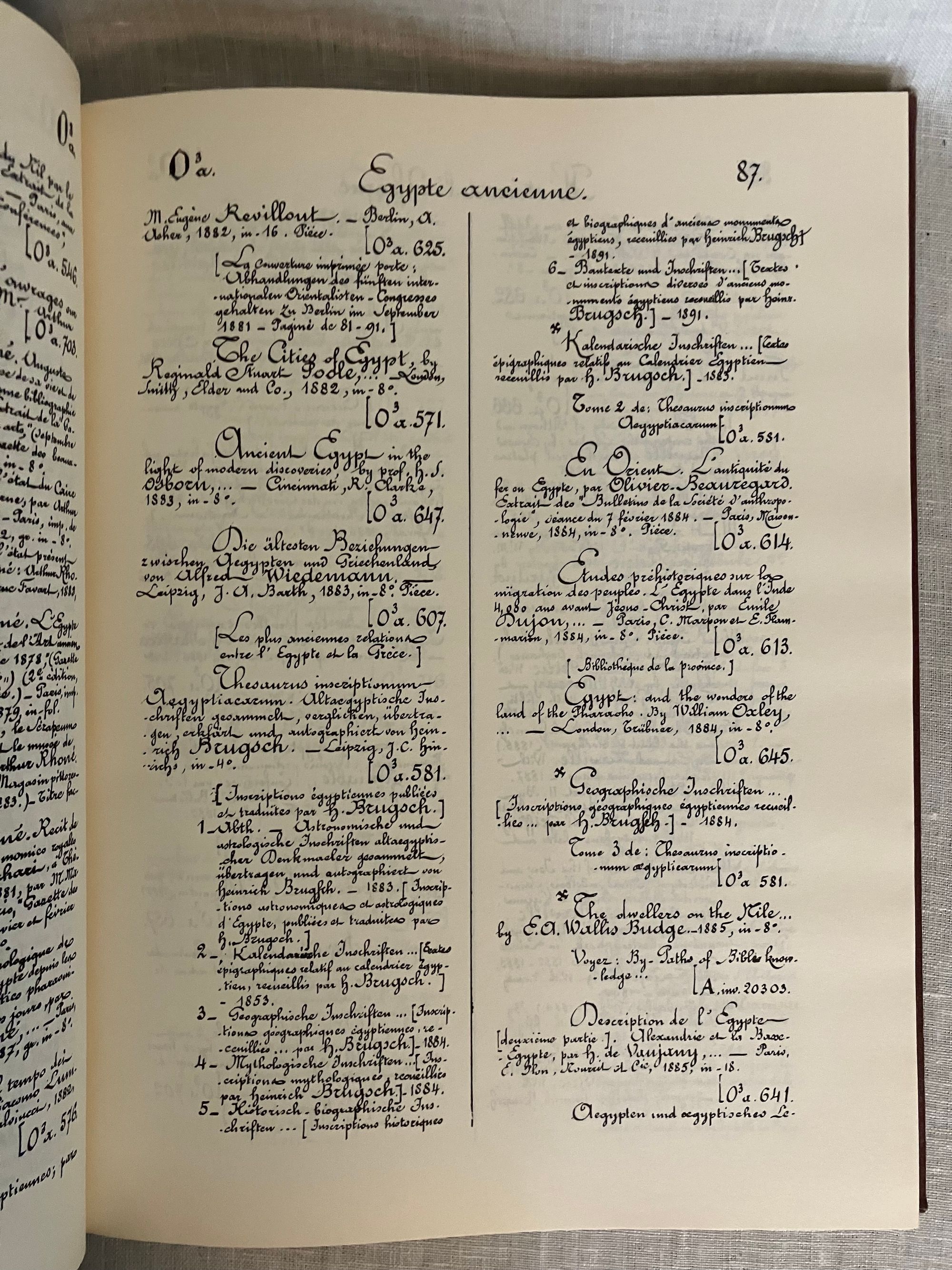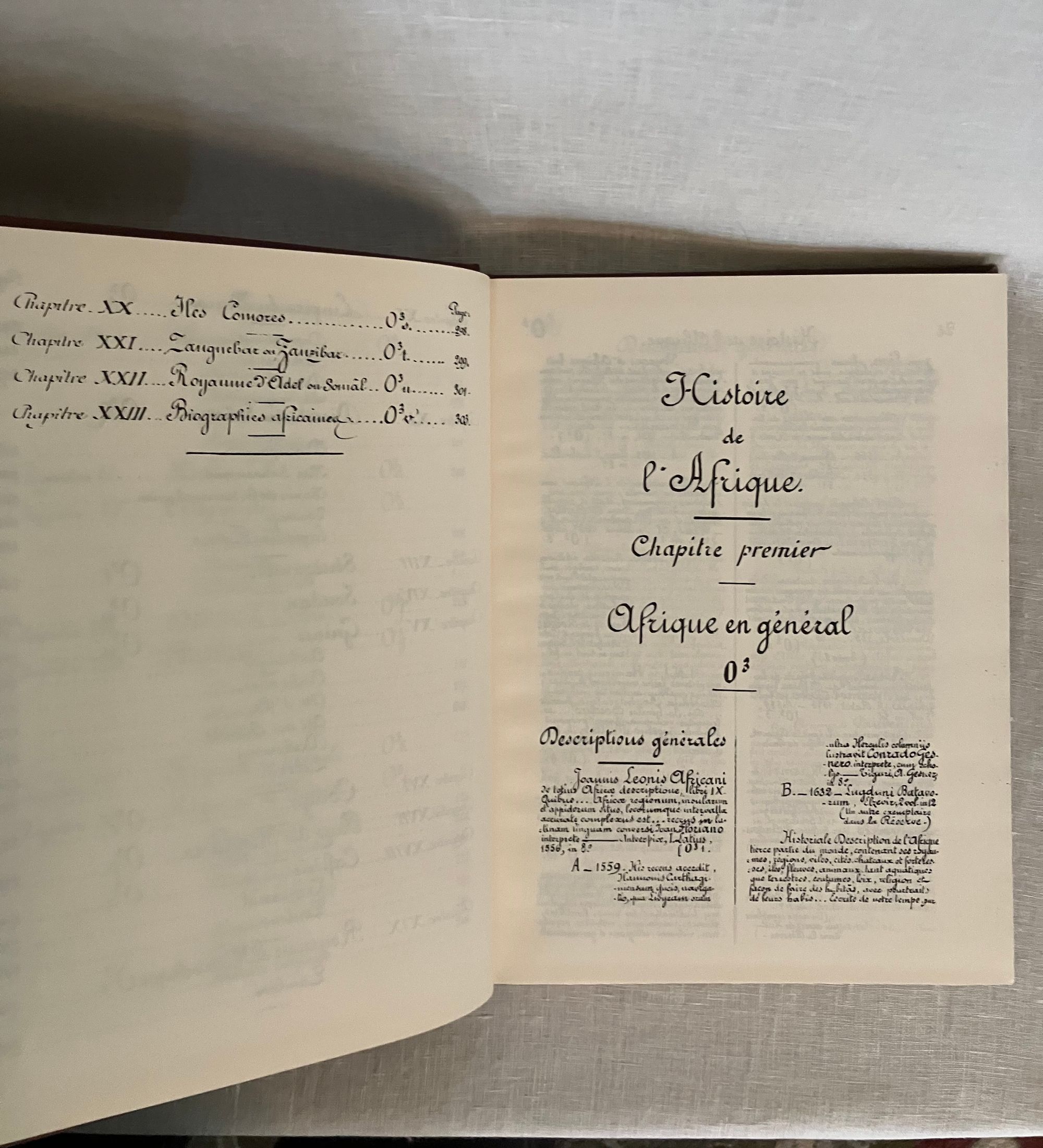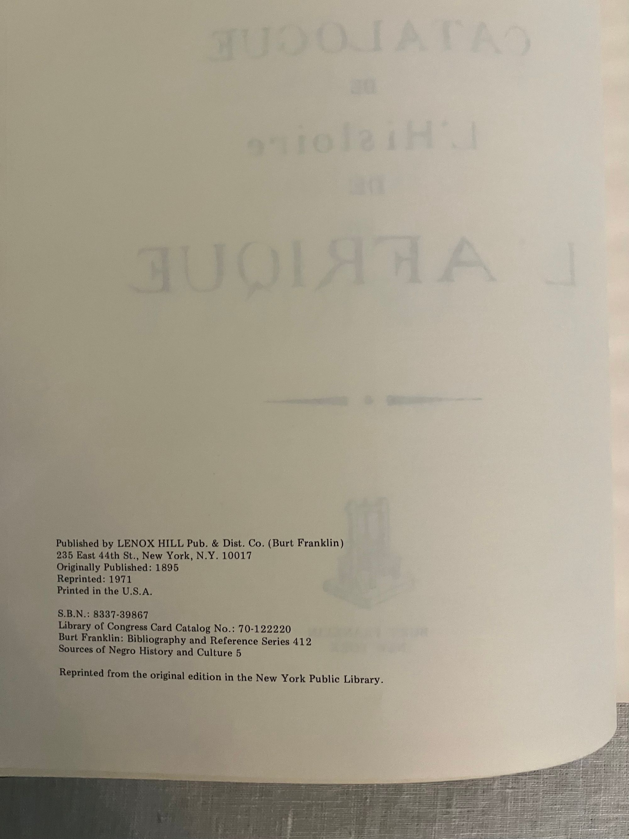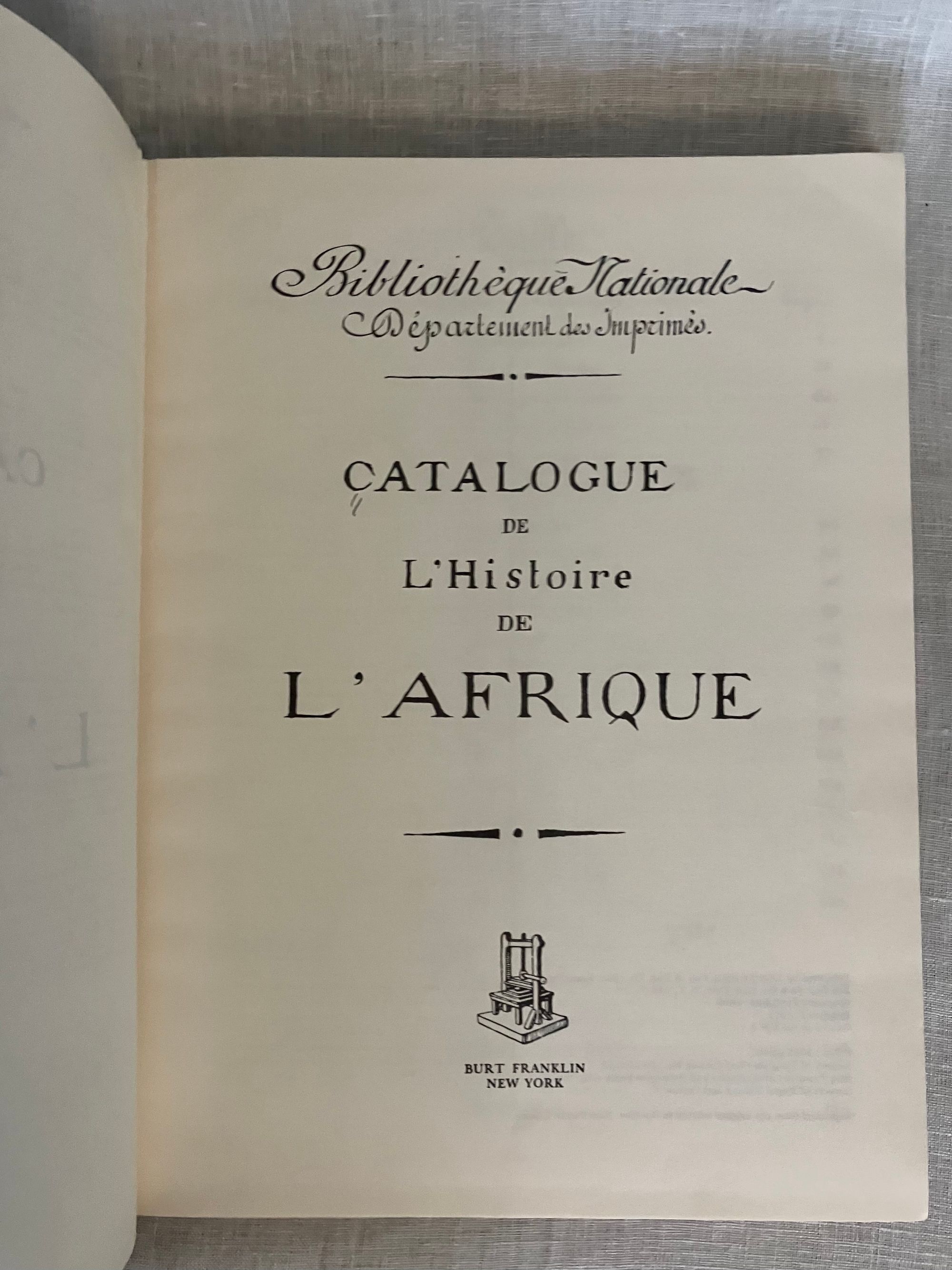 Facsimile reprint of the 1895 original, published in Paris. Part of the Burt Franklin Bibliography & Reference Series 412, Sources of Negro History and Culture 5. Hard cover, 4to in brown cloth with gold title printed to spine. 308, (4)pp. Text in 2 column format, in calligraphic French script. CONDITION: Very Good. Some sunning and light marks to boards and with two very small stains to fore edge text block. Ghost of label removal to endpaper (quarter sized). Inside is clean, bright and fresh. Catalogues important works dating from the 15th through late 19th centuries on African history, travel, and exploration, the history of the African slave trade, abolition and emancipation, citing French, German authors, as well as published works from Amsterdam, Edinburgh and London. Text in French. Sections on modern and ancient Egypt, religious history, Tripoli, Tunis, Morocco, the Sahara, Sudan, Congo, the Comoros and Zanzibar. Also includes an index of African biographies.
