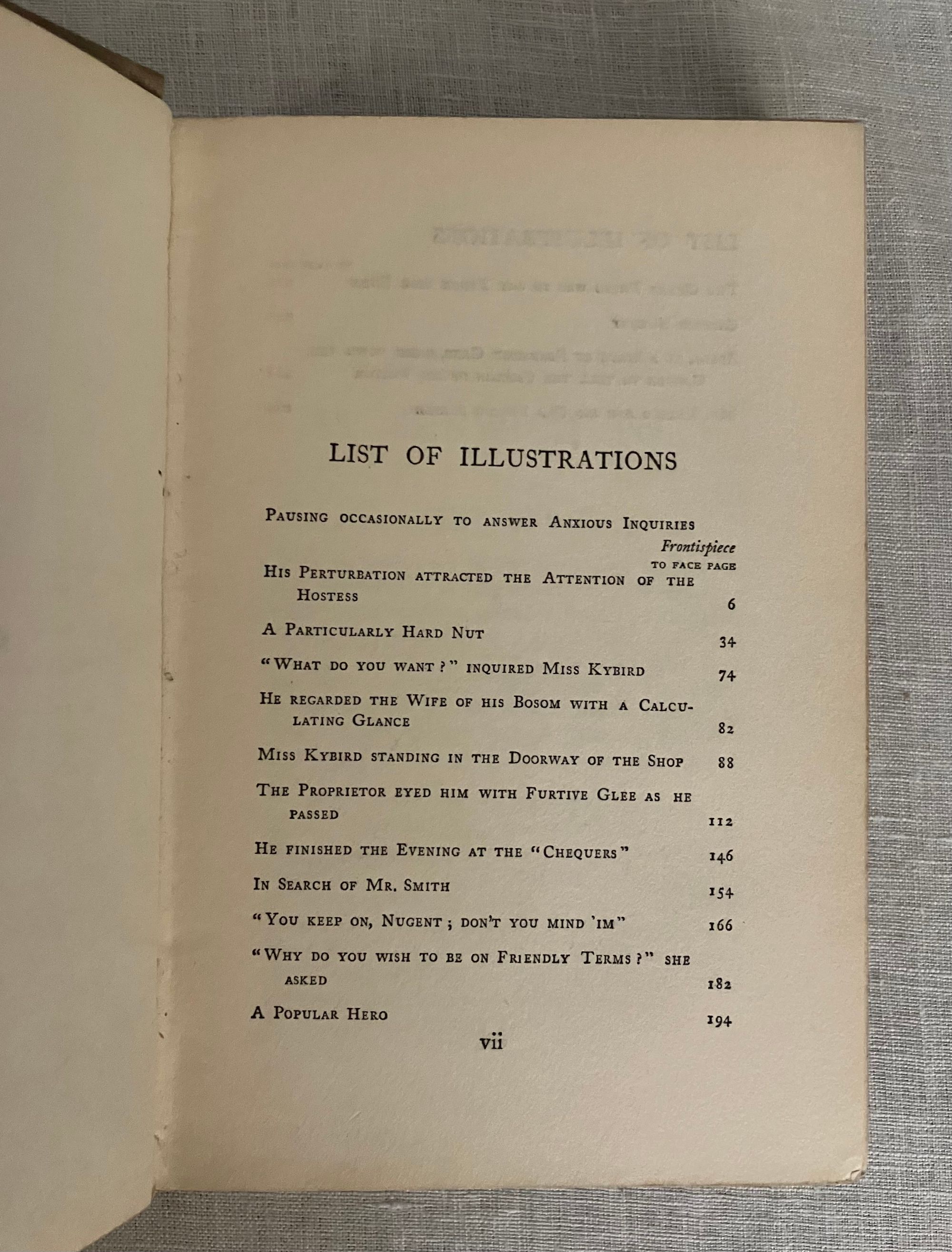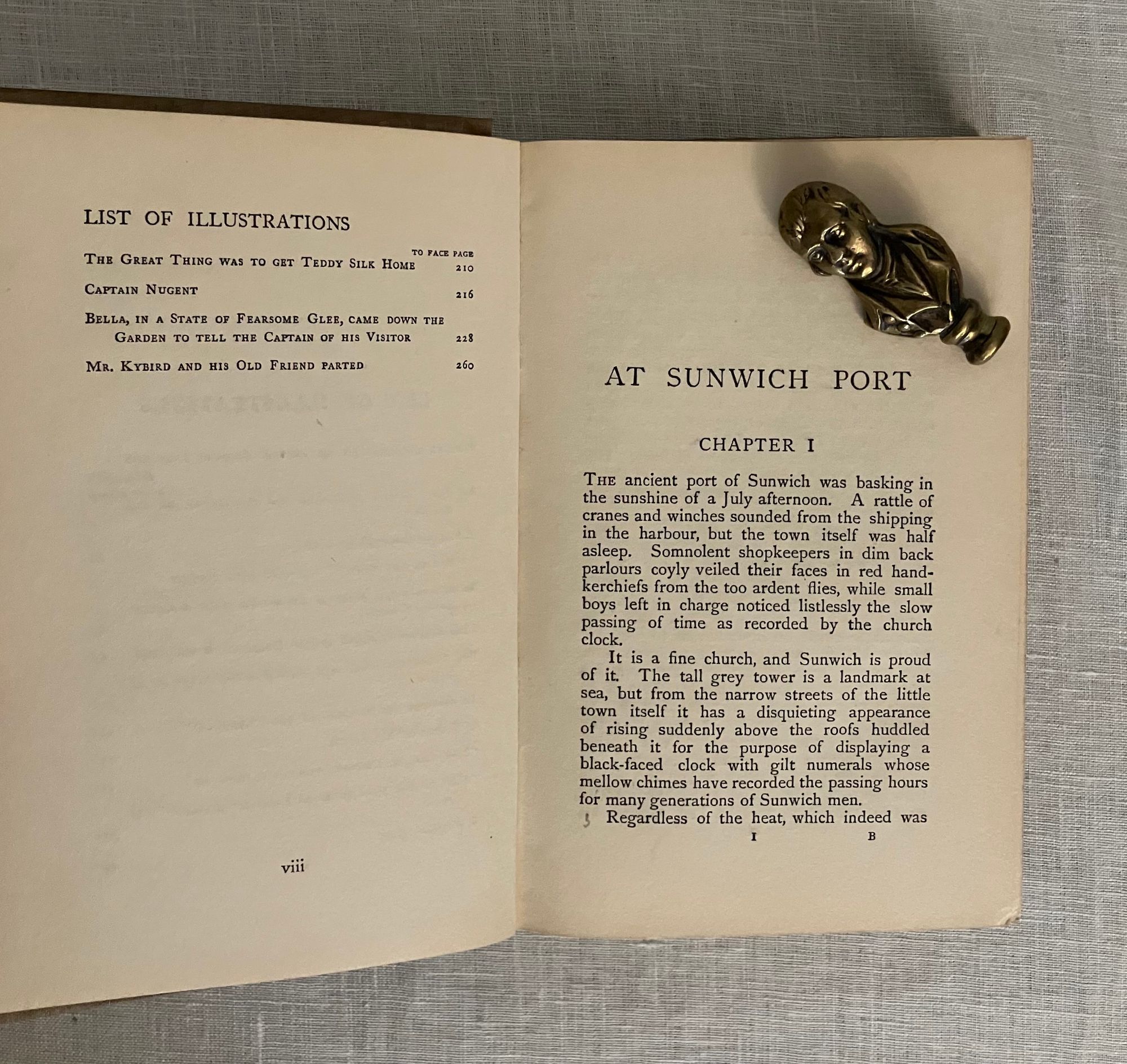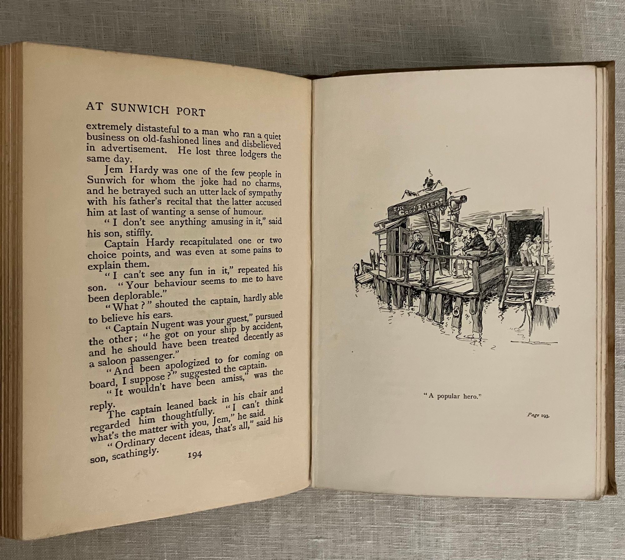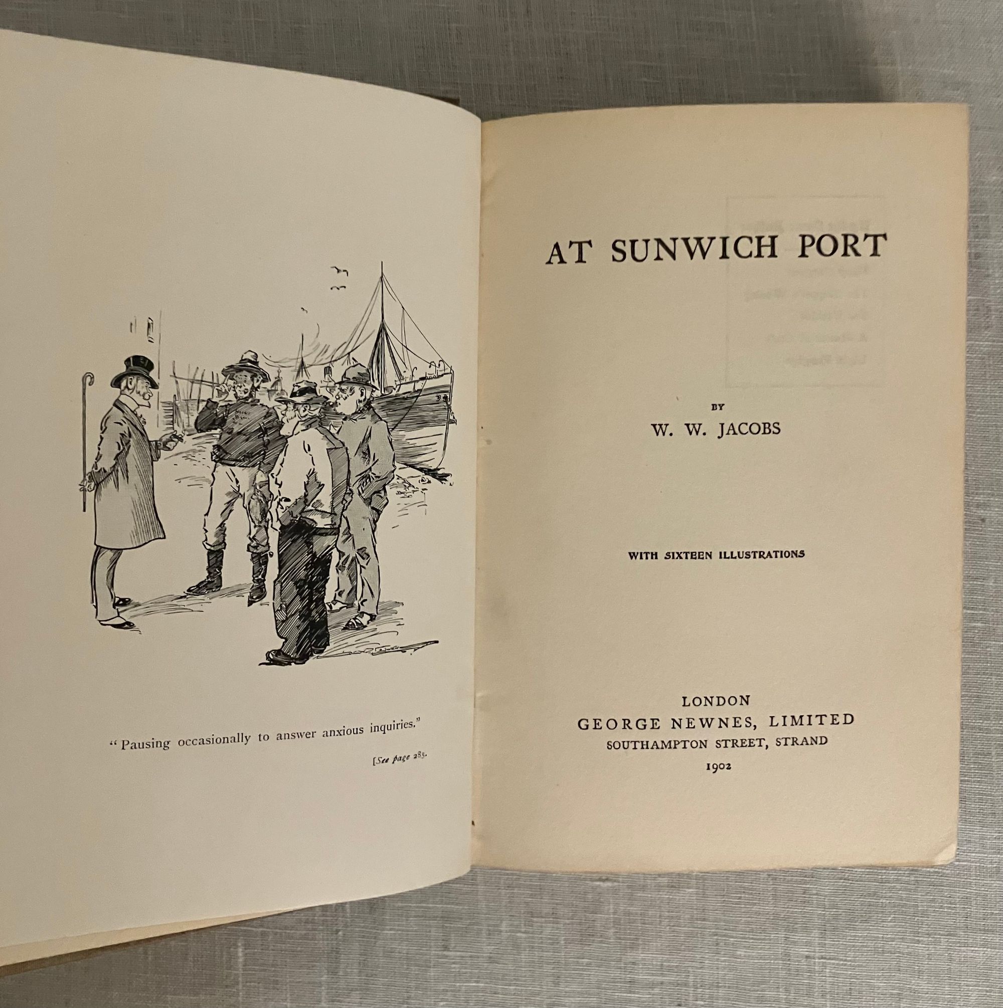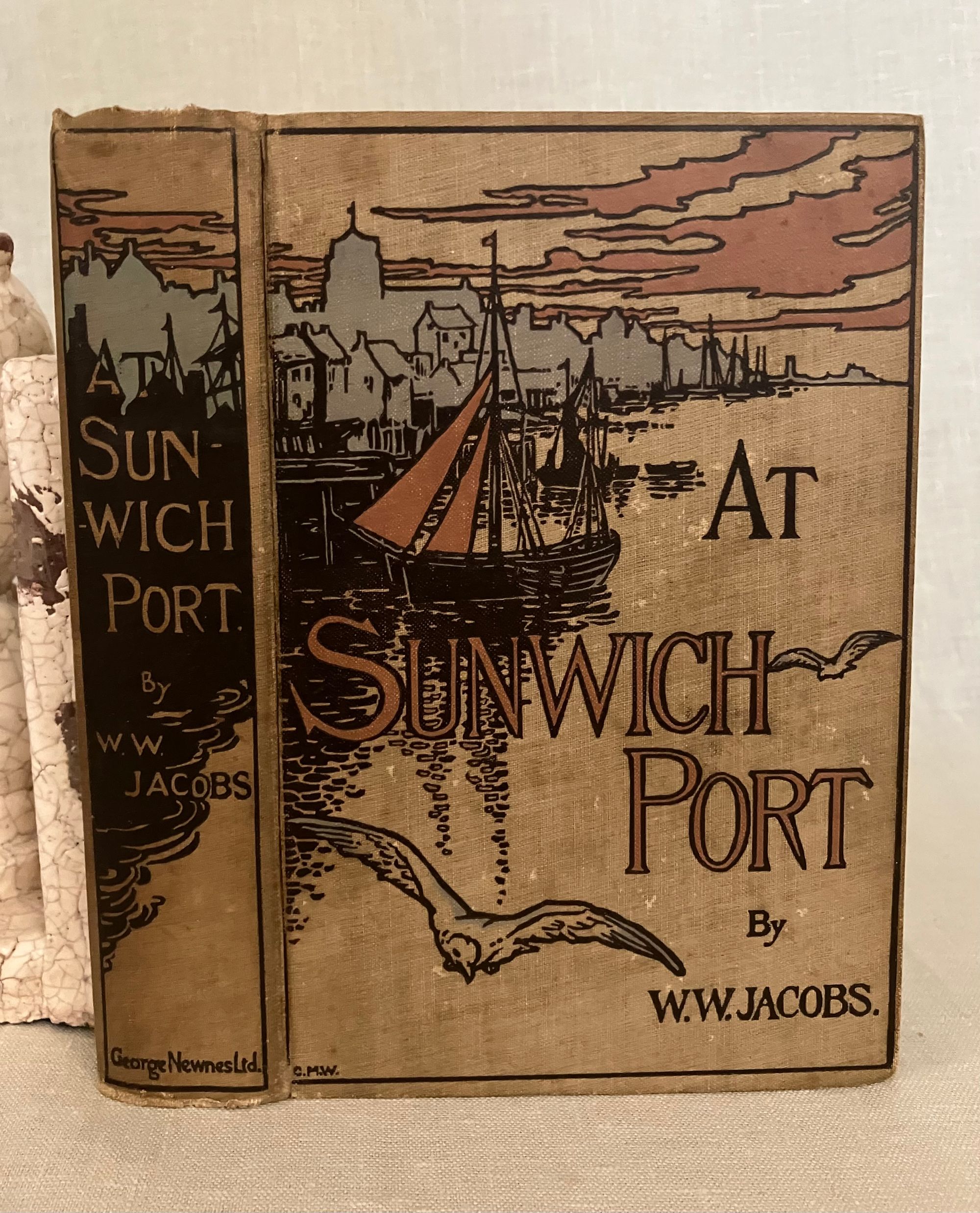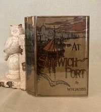 Hard cover, 8vo in tan cloth printed with a pictorial harbor scene in black, orange and blue-gray with titles to front board, illustration repeated upon spine within a ruled border. Text block edges stained tan. Printed endpapers with armorial bookplate of a Chicago socialite and her spouse. Illustrated with sixteen black and white illustrations from Will Owen ( 1869-1957), British commercial artist, poster and and book illustrator friend of the Author. 291 (292)pp. plus 4 pp. undated publisher's catalogue beginning with "The Hound of the Baskervilles." **CONDITION: Very Good. Hinges with small repair, holding firmly. Some light marks to covers. Now in mylar. ** Captain Nugent of the ship Conqueror finds himself readjusting to land ashore after losing command of his ship. Readjustment to the comic aspects of family life abound. A number of his works of light nautical fiction, including this, were produced as plays in New York and London. Apparently, G.K. Chesterson and J.B. Priestly were both admirers, including Jacobs in their anthologies of modern literature. Watson 4, 621.