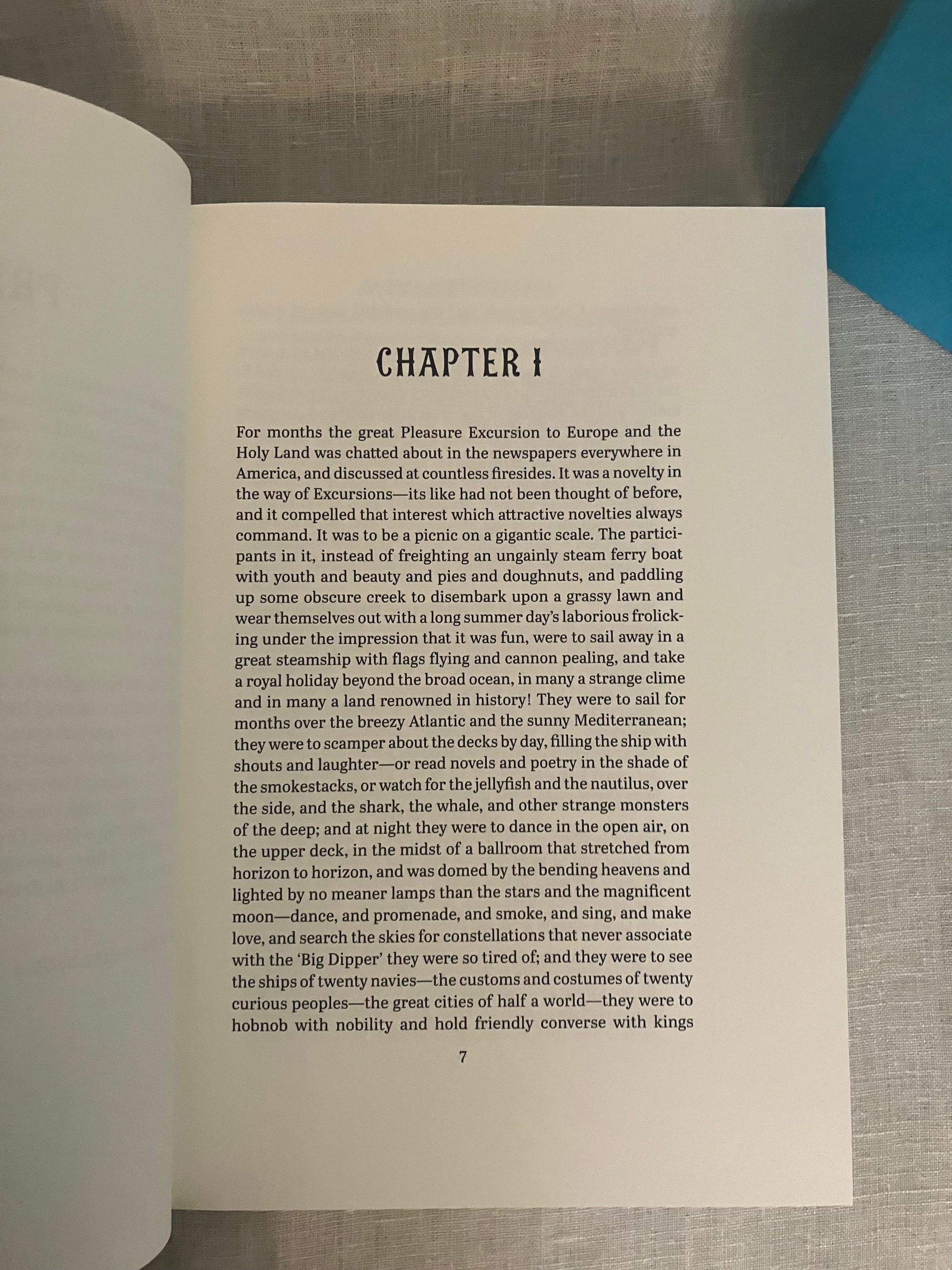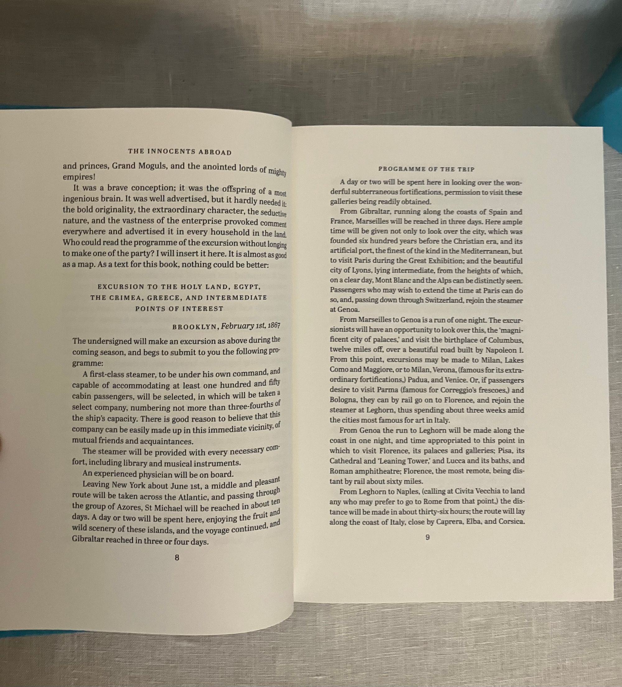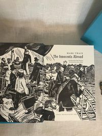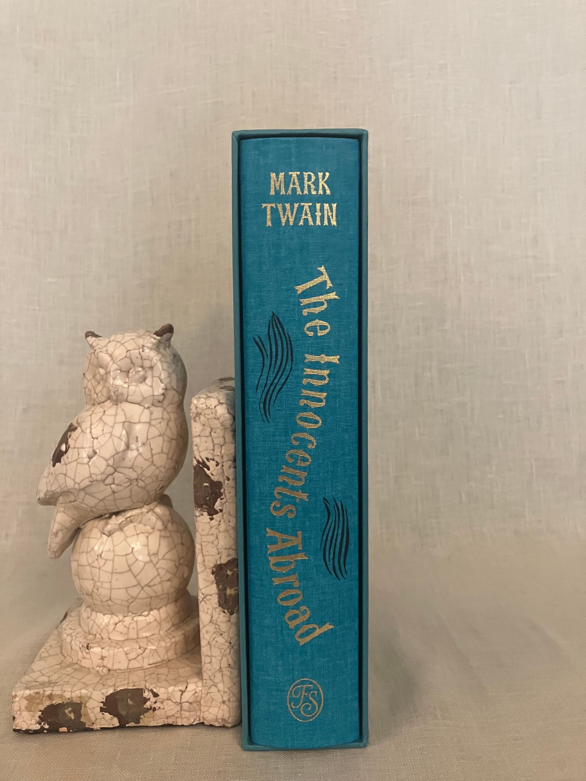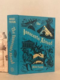 First Edition, stated first printing. Hard cover, 4to in teal blue illustrated cloth with pictorial decoration printed in gold and black to front board and spine, in the original slipcase. Illustrated map end papers, numerous linocut illustrations within text in black and white, plus seven full page in color. xxvii, 561 [563] pp. Printed and bound in Llandysul, Wales. CONDITION. Fine, like new.** A classic travelogue debuting Twain's signature witty and satiric style. Departing from New York, the five month "great pleasure excursion" by steamer and rail takes the reader through, perhaps, some of the less expected sights in Paris, Spain, Gibralter, Tangier, Alexandria, Cairo and various Holy Land venues, circling northward toward the Black Sea past Constantinople and around to Athens toward stops in many Italian cities including Florence, Rome and Venice, Naples, Pompeii, and toward Cadiz, hence to Bermuda and finally returning to New York. First published in 1869, this was Twain's first book, assembled from letters published in correspondence to the Alta California Newspaper. Mark Twain or, Samuel Langhorne Clemens (1835-1910), spent five months cruising aboard the steamship "Quaker City" promoted by the Plymouth Church of Brooklyn's Rev. Henry Ward Beecher. They departed New York on June,1867 with 165 carefully screened passengers, being promised the sight of "the ships of twenty navies--the customs and costumes of twenty curious peoples--the great cities of half a world...they were to "hob-nob with nobility and hold friendly converse with Kings and princes, Grand Moguls and the anointed lords of mighty empires!" (The "great pleasure excursion" included a visit to The International Exhibition in Paris.) This was a best-seller in its time and still remains excellent reading today.