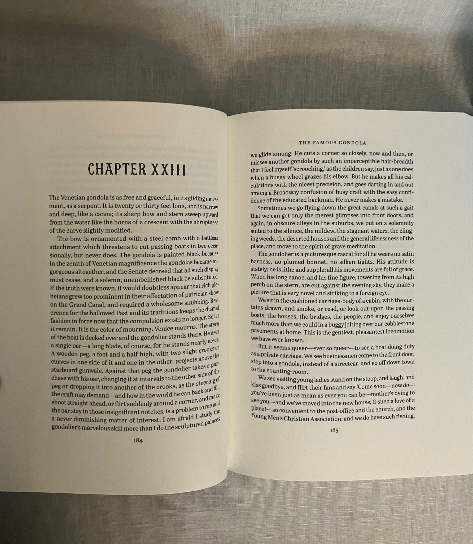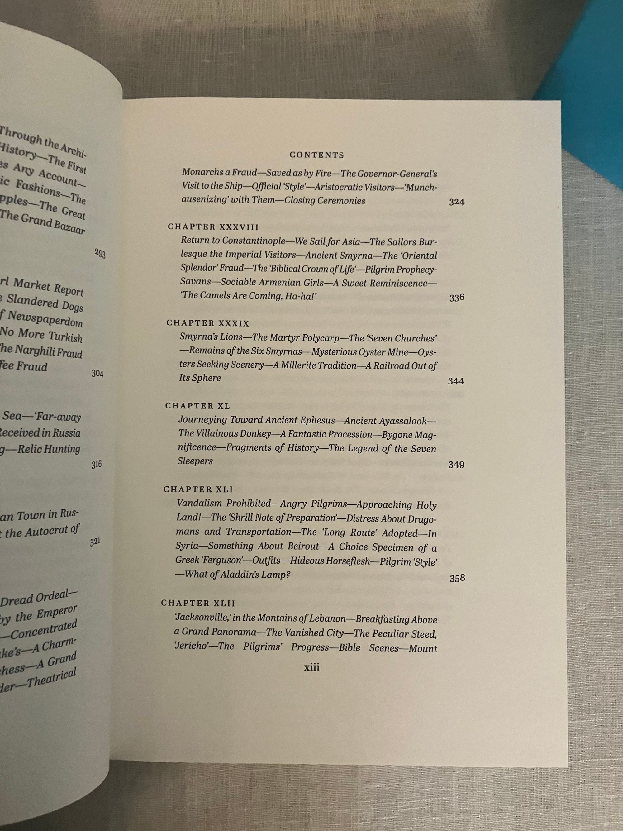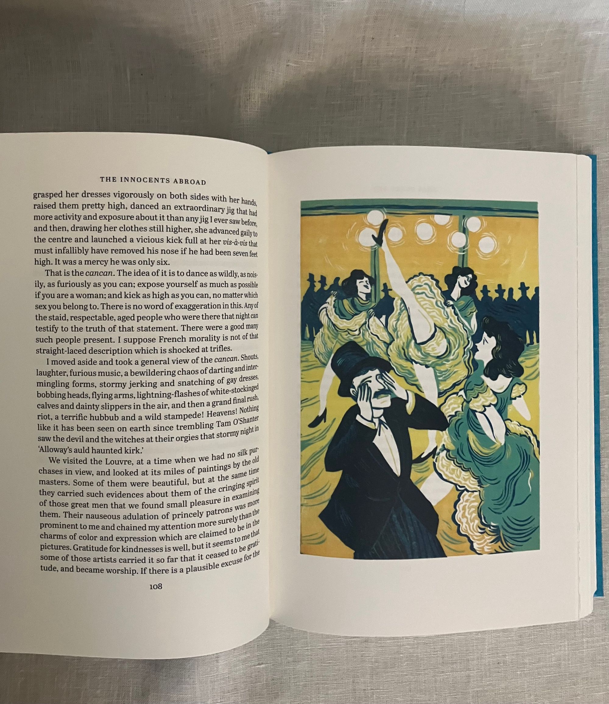 First Edition, stated first printing. Hard cover, 4to in teal blue illustrated cloth with pictorial decoration printed in gold and black to front board and spine, in the original slipcase. Illustrated map end papers, numerous linocut illustrations within text in black and white, plus seven full page in color. xxvii, 561 [563] pp. Printed and bound in Llandysul, Wales. CONDITION. Fine, like new.** A classic travelogue debuting Twain's signature witty and satiric style. Departing from New York, the five month "great pleasure excursion" by steamer and rail takes the reader through, perhaps, some of the less expected sights in Paris, Spain, Gibralter, Tangier, Alexandria, Cairo and various Holy Land venues, circling northward toward the Black Sea past Constantinople and around to Athens toward stops in many Italian cities including Florence, Rome and Venice, Naples, Pompeii, and toward Cadiz, hence to Bermuda and finally returning to New York. First published in 1869, this was Twain's first book, assembled from letters published in correspondence to the Alta California Newspaper. Mark Twain or, Samuel Langhorne Clemens (1835-1910), spent five months cruising aboard the steamship "Quaker City" promoted by the Plymouth Church of Brooklyn's Rev. Henry Ward Beecher. They departed New York on June,1867 with 165 carefully screened passengers, being promised the sight of "the ships of twenty navies--the customs and costumes of twenty curious peoples--the great cities of half a world...they were to "hob-nob with nobility and hold friendly converse with Kings and princes, Grand Moguls and the anointed lords of mighty empires!" (The "great pleasure excursion" included a visit to The International Exhibition in Paris.) This was a best-seller in its time and still remains excellent reading today.