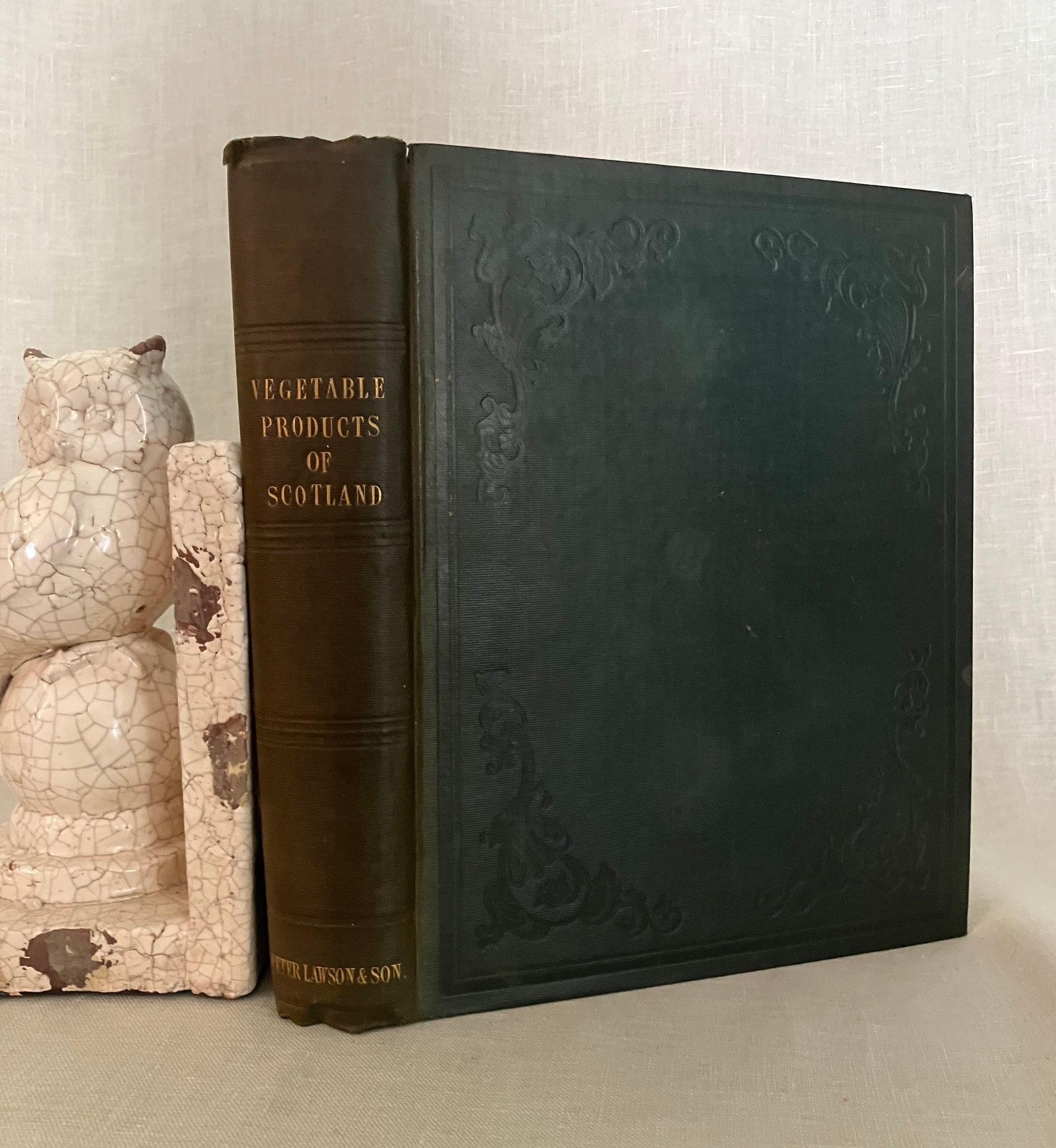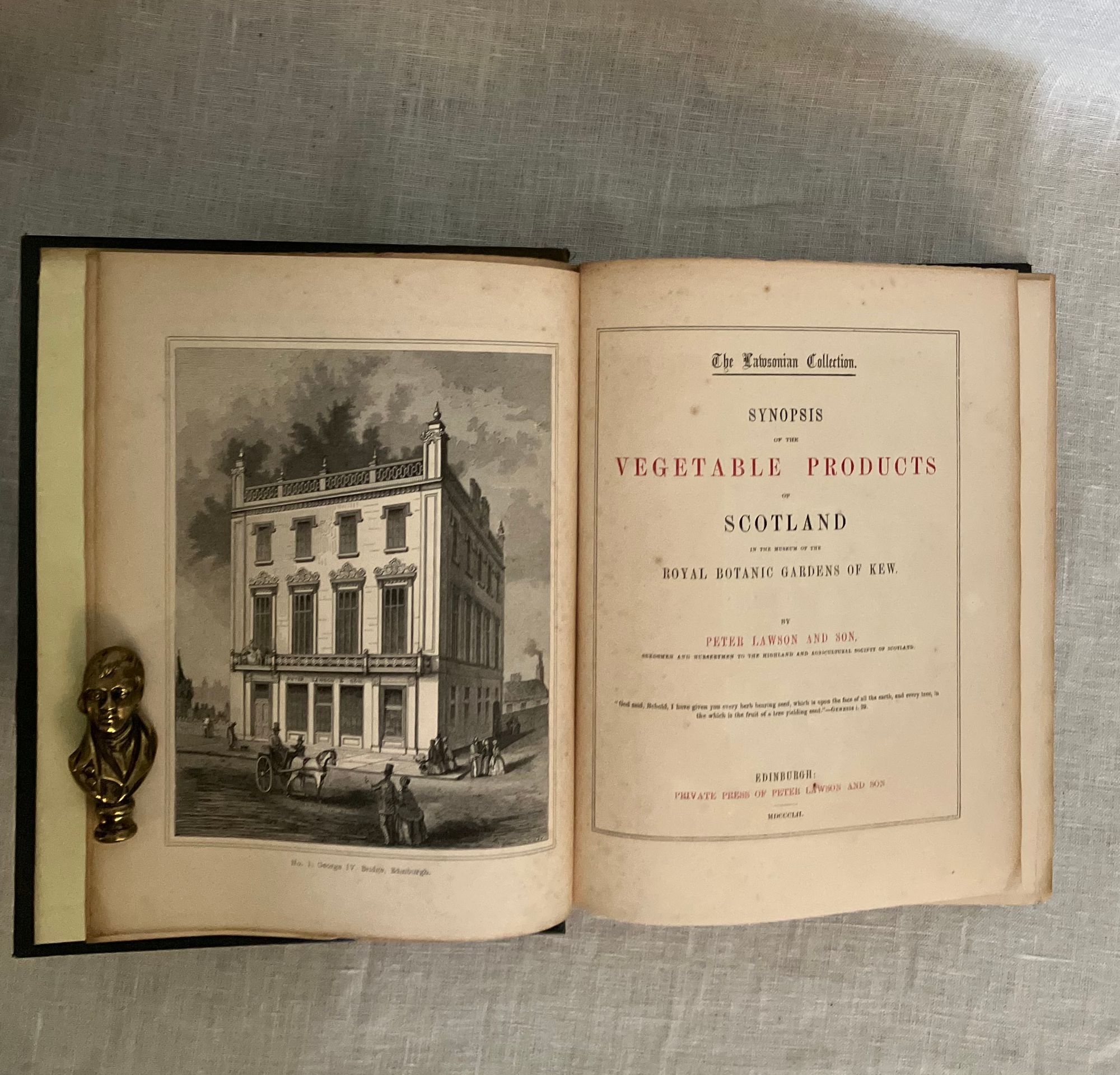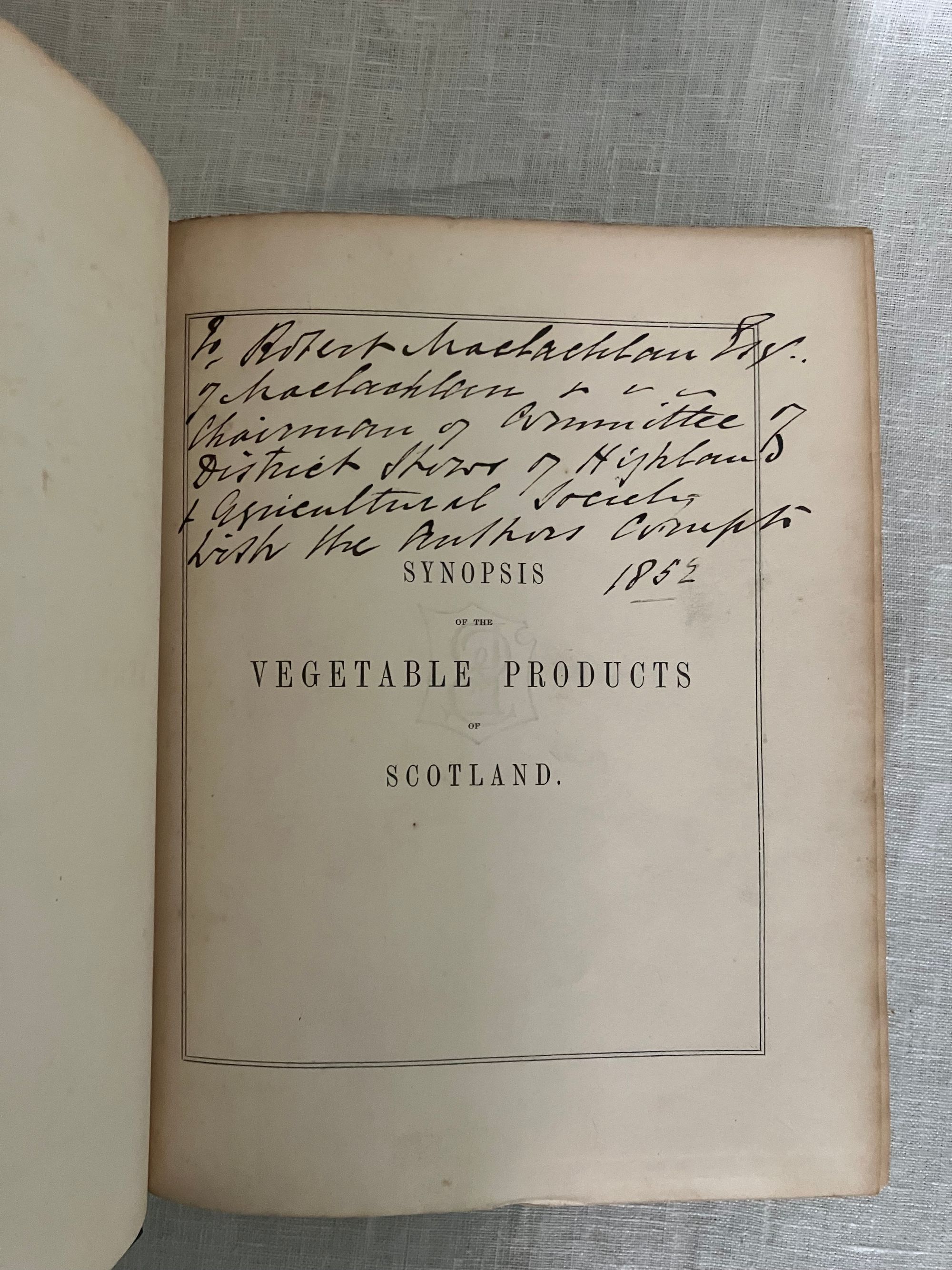 Hard cover, 8vo, in green cloth, ruled in blind with corner floral festoons, the spine with faux compartments blocked in gold with title and publisher, top edge trimmed, others untrimmed, inscription to half title in old fountain pen, frontispiece engraving of the commercial premises located at George IV Bridge, Edinburgh. xx, v.p.** CONDITION: About Good: Some spots to front cover, front hinge has been reglued, rear hinge is in order. Mild toning of contents. About half of pages unopened. Moderate age toning to contents. Descriptions of agricultural products available to grow in the Scottish climate, giving Latin and common names, habits, and suggestions for cultivation. **Division I: Cereal grains, various, leguminous plants, 136pp. Division II: Plants Cultivated for their Herbage and Forrage: including many clovers vetches, broom, etc., and brassicas, 128pp. Division III: Plants Cultivated Chiefly for Their Roots: potatoes, turnips, rutabaga, beets, parsnips, sweet potato, 64pp. Division IV: Plants Cultivated for their Uses in the Arts and Manufactures, linen, hemp, flax, sunflower, lavender, dyer's weed, dyer's woodruff, saffron crocus, buckthorn, dyer's broom, etc., 80pp. Division V: Plants Cultivated for their Timber, Bark etc., oaks, alder, hornbeam, willow, ash, etc., rhododendron, hollies, junipers. Appendix of fruit trees, (peaces, cherries, apples, quinces, strawberries, raspberries, mulberries, guava, pine apples, pot herbs etc.) their types, habits, synonyms, uses and price guide for both the garden or the glasshouse conservatory, 83pp. ** Peter Lawson & Son, "Seedsmen to the Highland Society of Scotland." The Preface indicates this publication was prepared after the company's success at The GREAT INDUSTRIAL EXHIBITION OF ALL NATIONS, or THE CRYSTAL PALACE EXHIBITION, held at London's Hyde Park from May 1 -15th October, 1851. Seedsmen Lawson & Company secured the large council medal for Class 3, their collection featuring Raw Materials "Vegetable, Animal, and Mineral for industrial, and agricultural and medical use, from all parts of the Globe." The Preface states that the Authors "placed their collection at the disposal of the Royal Commissioners. Under subsequent arrangements, however, with the British Government, the entire collection was deposited in the Museum of the Royal Botanic Gardens at Kew, under the immediate superintendence of the Director, SIR WILLIAM JACKSON HOOKER. The book's recipient, ROBERT MACLACHLAN OF MACLACLAN, was Chairman of the Committee of the District Shows of the Highland & Agricultural Society, founded in 1784 when another member of the Maclachlan clan, Alexander, was involved in the leadership of the organization, (See Alexander Ramsay, History of the Highland and Agricultural Society of Scotland, with Notices of Anterior Societies for the Promotion of Agriculture in Scotland, (Edinburgh: W. Blackwood & Sons,1879)p. 532. This annual agricultural show continues today. G.E. Wickens, "Two Centuries of Economic Botanist at Kew, Part I", The Kew Magazine (May, 1993) p. 88.