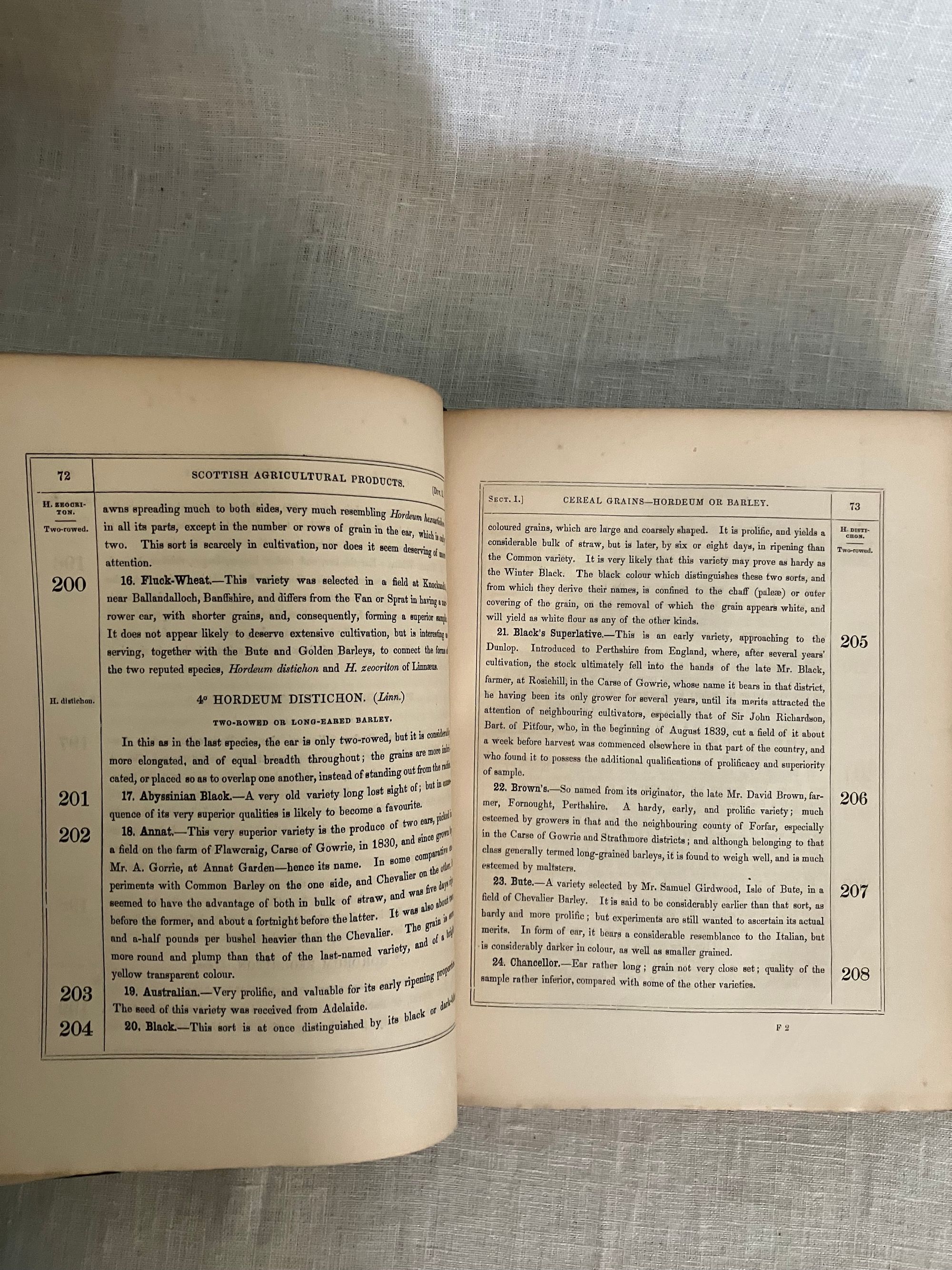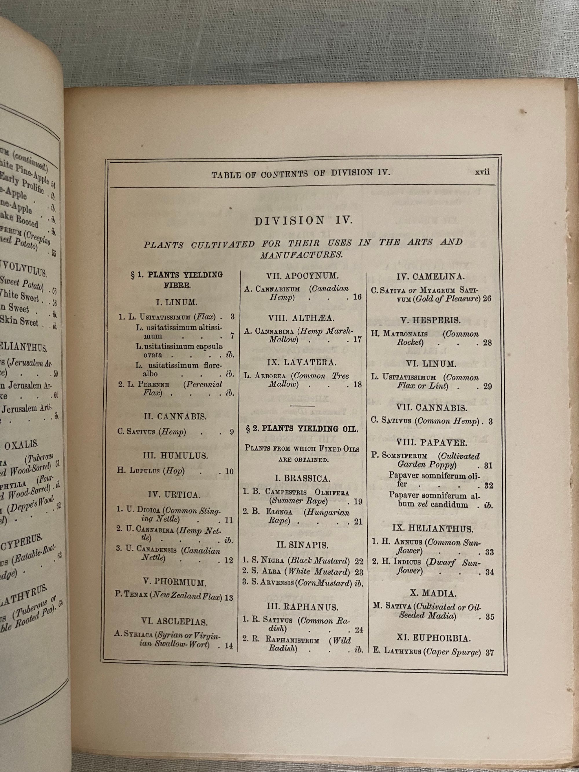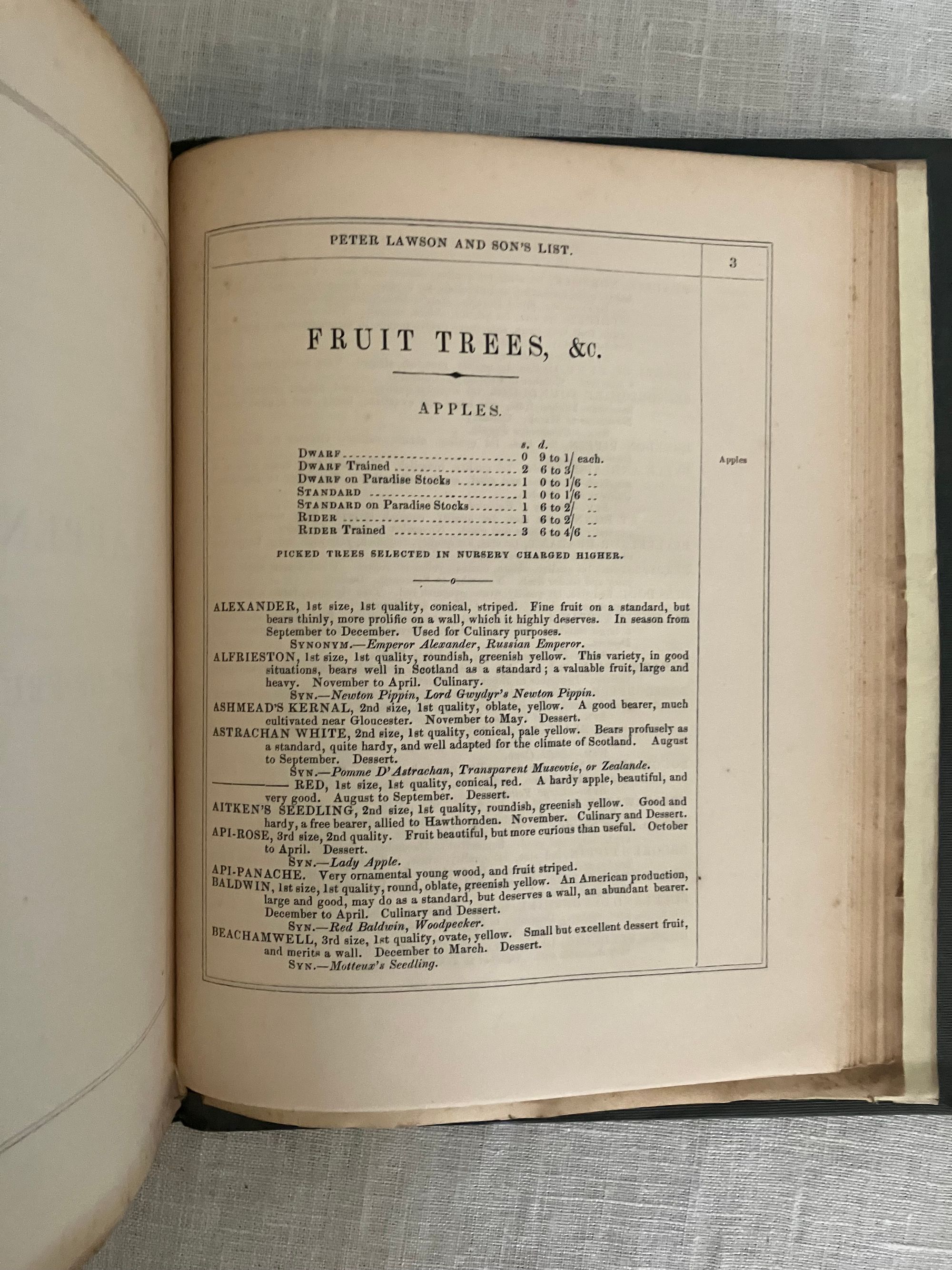 Hard cover, 8vo, in green cloth, ruled in blind with corner floral festoons, the spine with faux compartments blocked in gold with title and publisher, top edge trimmed, others untrimmed, inscription to half title in old fountain pen, frontispiece engraving of the commercial premises located at George IV Bridge, Edinburgh. xx, v.p.** CONDITION: About Good: Some spots to front cover, front hinge has been reglued, rear hinge is in order. Mild toning of contents. About half of pages unopened. Moderate age toning to contents. Descriptions of agricultural products available to grow in the Scottish climate, giving Latin and common names, habits, and suggestions for cultivation. **Division I: Cereal grains, various, leguminous plants, 136pp. Division II: Plants Cultivated for their Herbage and Forrage: including many clovers vetches, broom, etc., and brassicas, 128pp. Division III: Plants Cultivated Chiefly for Their Roots: potatoes, turnips, rutabaga, beets, parsnips, sweet potato, 64pp. Division IV: Plants Cultivated for their Uses in the Arts and Manufactures, linen, hemp, flax, sunflower, lavender, dyer's weed, dyer's woodruff, saffron crocus, buckthorn, dyer's broom, etc., 80pp. Division V: Plants Cultivated for their Timber, Bark etc., oaks, alder, hornbeam, willow, ash, etc., rhododendron, hollies, junipers. Appendix of fruit trees, (peaces, cherries, apples, quinces, strawberries, raspberries, mulberries, guava, pine apples, pot herbs etc.) their types, habits, synonyms, uses and price guide for both the garden or the glasshouse conservatory, 83pp. ** Peter Lawson & Son, "Seedsmen to the Highland Society of Scotland." The Preface indicates this publication was prepared after the company's success at The GREAT INDUSTRIAL EXHIBITION OF ALL NATIONS, or THE CRYSTAL PALACE EXHIBITION, held at London's Hyde Park from May 1 -15th October, 1851. Seedsmen Lawson & Company secured the large council medal for Class 3, their collection featuring Raw Materials "Vegetable, Animal, and Mineral for industrial, and agricultural and medical use, from all parts of the Globe." The Preface states that the Authors "placed their collection at the disposal of the Royal Commissioners. Under subsequent arrangements, however, with the British Government, the entire collection was deposited in the Museum of the Royal Botanic Gardens at Kew, under the immediate superintendence of the Director, SIR WILLIAM JACKSON HOOKER. The book's recipient, ROBERT MACLACHLAN OF MACLACLAN, was Chairman of the Committee of the District Shows of the Highland & Agricultural Society, founded in 1784 when another member of the Maclachlan clan, Alexander, was involved in the leadership of the organization, (See Alexander Ramsay, History of the Highland and Agricultural Society of Scotland, with Notices of Anterior Societies for the Promotion of Agriculture in Scotland, (Edinburgh: W. Blackwood & Sons,1879)p. 532. This annual agricultural show continues today. G.E. Wickens, "Two Centuries of Economic Botanist at Kew, Part I", The Kew Magazine (May, 1993) p. 88.