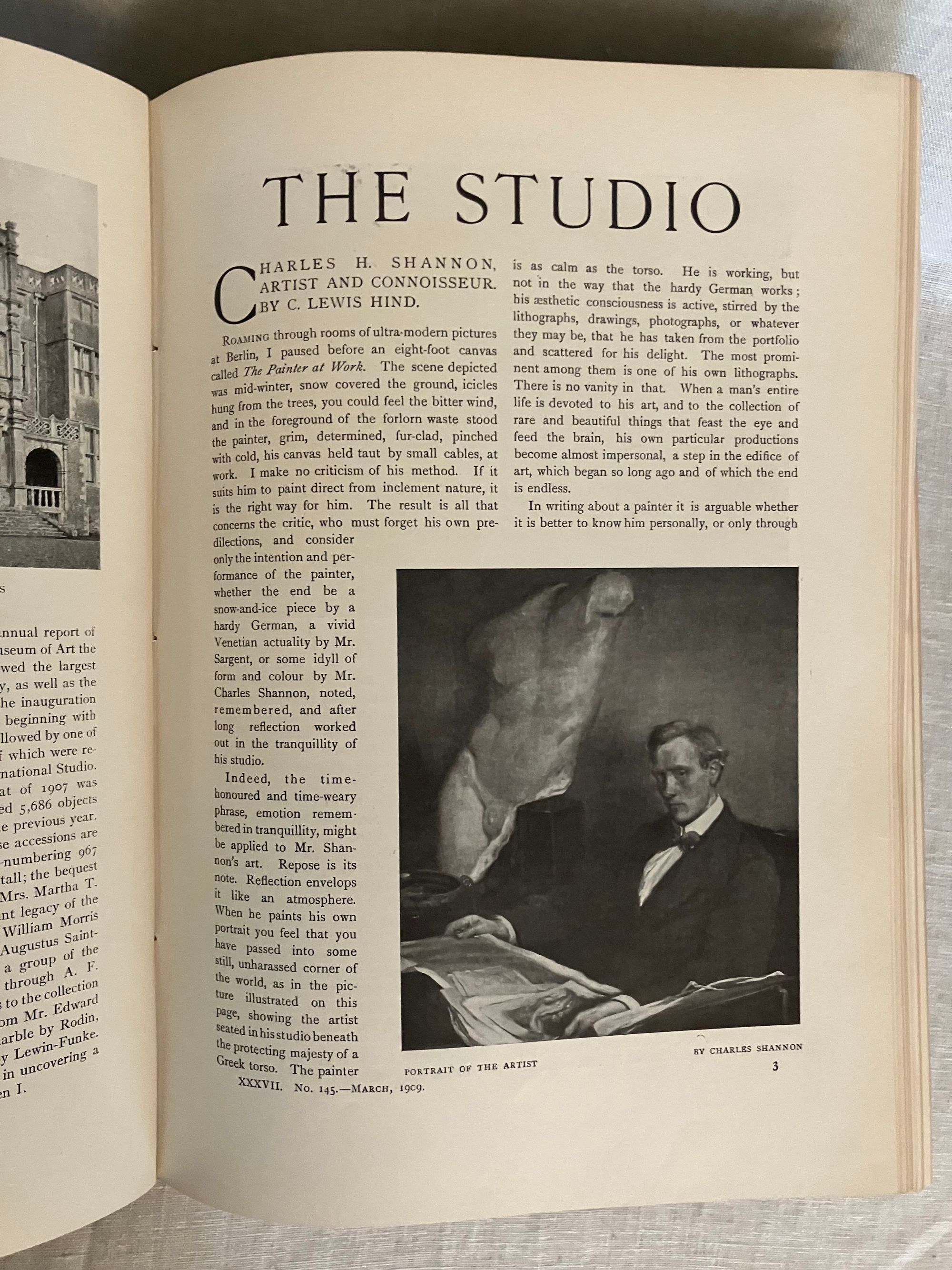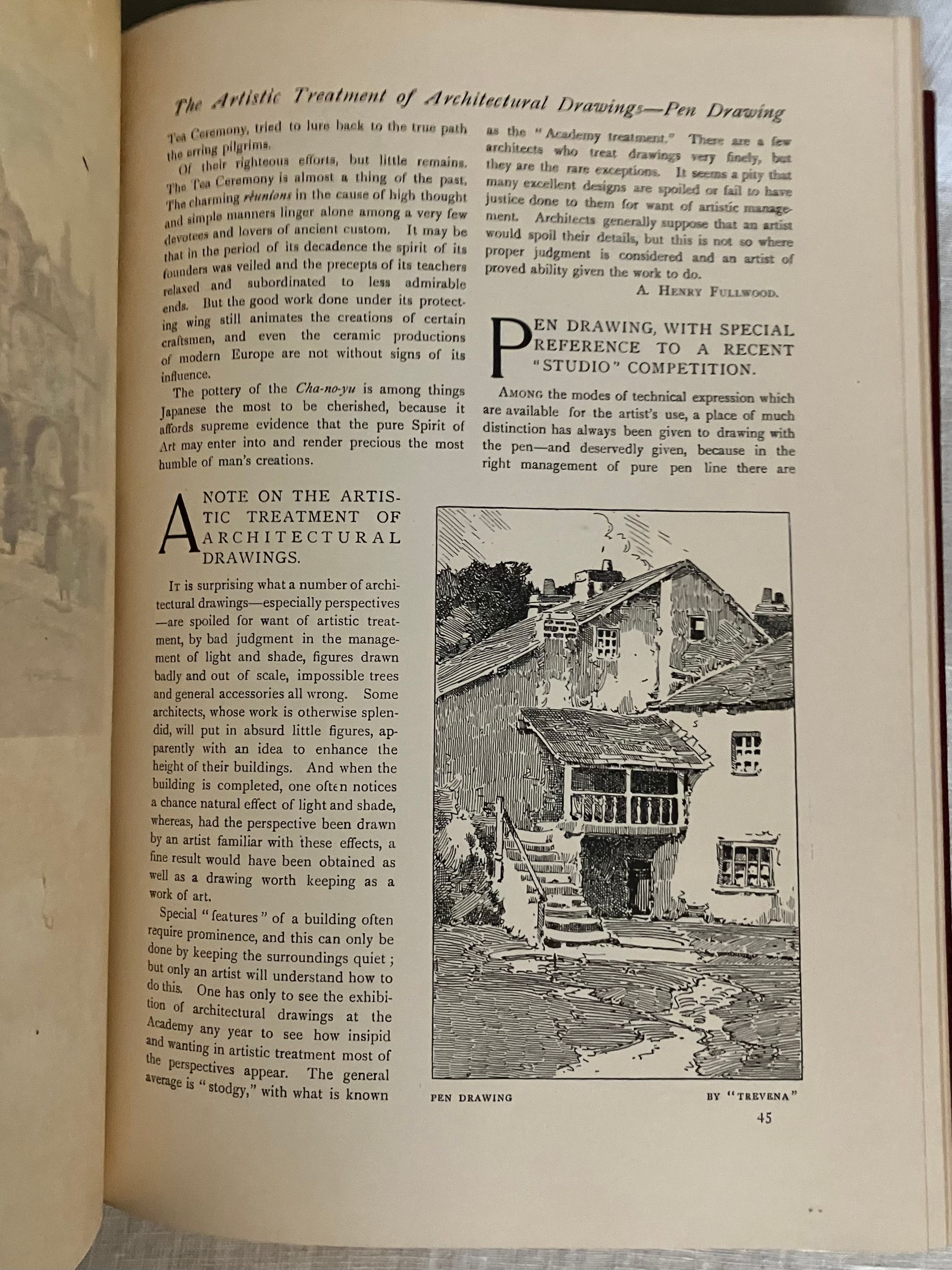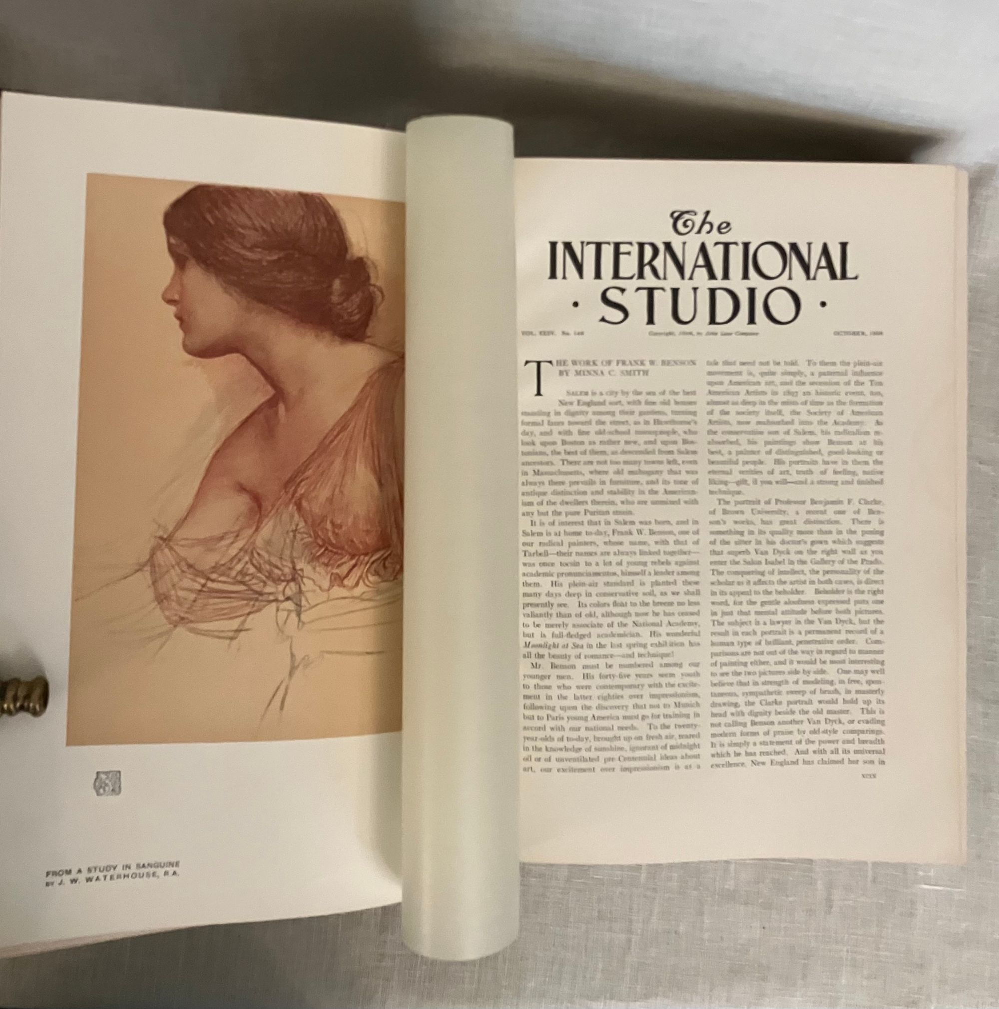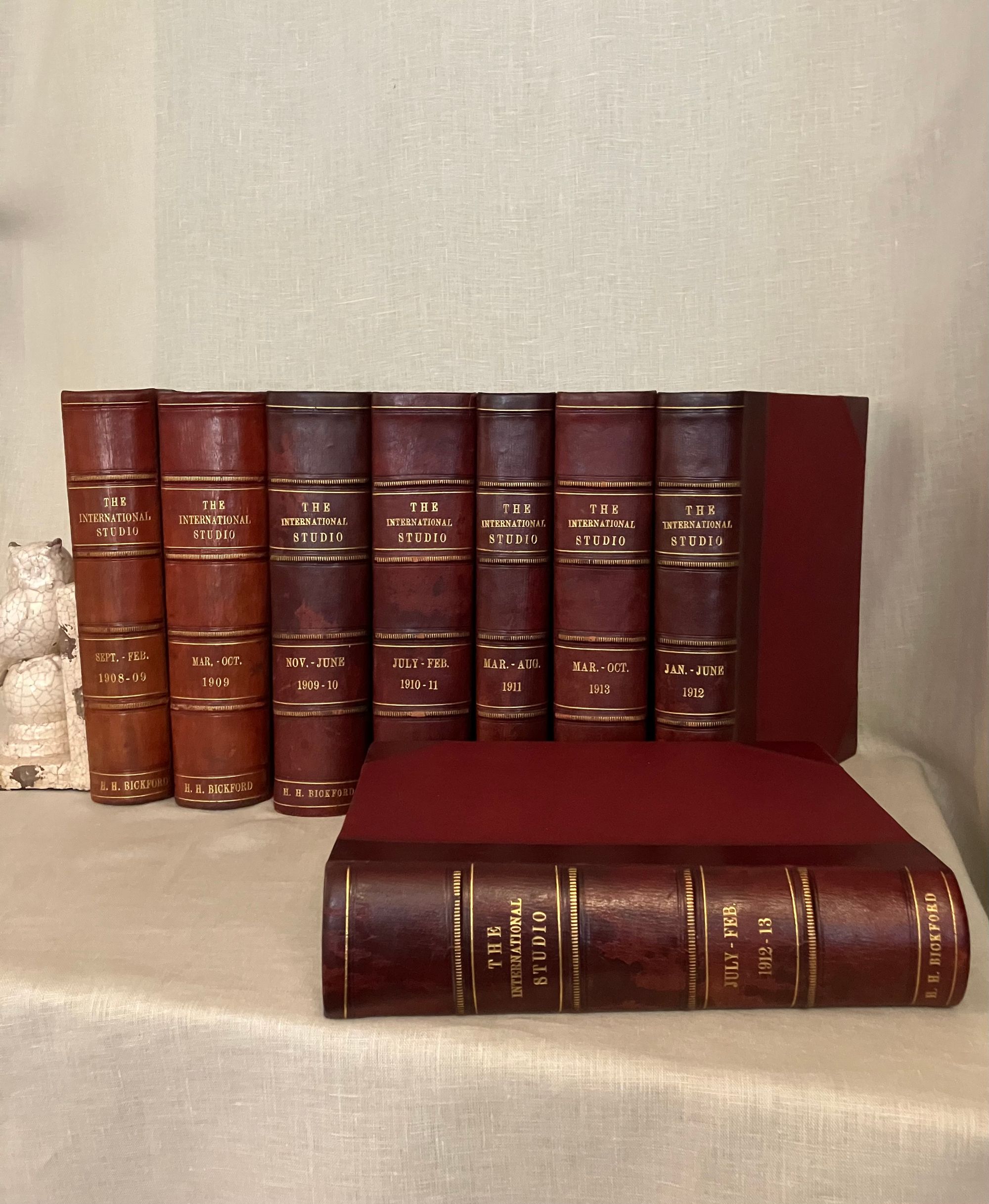 Hard cover, 4to in three-quarter calf over red cloth covered boards, the raised bands on the spines ruled in gilt and blind, with "H.H. Bickford" tooled at the foot. Each volume bound with a preliminary indexes, except for last one. Original wraps and advertising-only pages were not included. Page numbering begins with roman numerals and changes to numeric; v.p. Illustrated with many black and white halftone reproductions, some full page with tissue guards, fewer in color, with some tipped in on colored card. CONDITION: Very Good. Original owner stamp in blue ink to head of a number of pages of earlier issues, sometimes upon front of plates: "Return to H.H. Bickford's Private Library." (See provenance below.) Light shelfwear. Front hinge reinforced with woven tape on several volumes. Lacking Volume Thirty Nine and Forty [would have been bound as 2-in-1] so, sadly, not quite complete. Some light offset opposite black and white illustrations, occasional light marks. Last vol. was bound with punched three ring holes at gutter edge of some issues. One page found lacking, copy supplied. NOTE: I inadvertently left one volume out of the group picture; this has now been replaced.**CONTENTS: Articles and reviews by some of the taste-makers of the age, including book reviews, gallery-talk, artist profiles, exhibit reviews and more highlighting the American School, British Art Nouveau, Arts and Crafts Movements, and European art and design, including German Bauhaus, Hungarian, Swedish, Turkish, and Japanese art. "The International Studio" was a successor to the British art journal, "The Studio," begun in 1893 by Charles Horne and editor Gleason White; the International edition debuted in New York in 1897 and continued until 1931. British publisher John Lane had previously, with partner Charles Elkins, been publisher of works designed by Charles S. Shannon and Charles Ricketts, and in 1887, the two co-founded London's The Bodley Head publishing firm. Lane then relocated to New York in 1896, forming the John Lane Company, producers of this periodical.**SELECTION of British artists include: in-depth pieces on Charles S. Shannon, the stained glass panel designs of Edward Burne-Jones, A.E. Newcombe, E.A. Taylor and Jessie M. King and the Glasgow School of Art, William Morris in Glasgow, the National Competition of Schools of Art 1910, the Brussels Universal Exhibition of 1910, Italianate, and Arts and Crafts style architecture. A number of British Arts and Crafts style fine book bindings are illustrated, a number of them by women, as well as other handcrafts shown at the Arts & Crafts Exhibition Society. Book illustration and architectural illustration are also considered. AMERICAN art is also heavily promoted: Frank W. Benson, John Singer Sargent, Winslow Homer, William Merrit Chase and William Morris Hunt being shown in Germany. Works at the Metropolitan Museum, a Philadelphia Architectural Exhibition, Miniatures by Laura Coombs Hills (of Newburyport) and other women painters of the American Society of Miniature Painters, Philadelphia portraitist Ella S. Hergesheimer, the Jewelry Exhibition in Boston at the Society of Arts and Crafts in 1907. et al. INTERNATIONALLY, there is a whole series on Japanese art including Utamaro's eighteenth century woodblocks in color reproduction, Japanese ceramic artists, silks and carvings in wood or jade. A book by Yone Noguchi, "The Pilgrimage" is reviewed. Spanish painters Joaquin Sorolla y Bastida and the Basque artist Ignacio Zuoaga are profiled in a review of a show at the Hispanic Society of America. A landscape scene by Swedish painter Carl Larsson, younger brother to King Gustav V, is illustrated in color. German bauhaus interiors earn coverage in the discussion of The Brussels Universal Exhibition: Max Läger, Emanuel von Seidl, R. Riemerschmid, Bruno Paul and Albin Müller being shown. Otto Fischer and Hans Von Hayek are mentioned in a Vienna exhibition. **PROVENANCE: From the Private Library of original owner, HIRAM HOOKER BICKFORD, A.I.A. ( 1864-1929), a Barre, Vermont born son of a carpenter and house builder, who began his architectural career in central Massachusetts as trainee draughtsman at the Fitchburg Offices of Henry M. Francis. In 1887, he relocated to the Elmira, New York area, joining Architects Pierce and Dockstader, becoming a partner in 1891. Bickford and partner Joseph H. Pierce, went on to some fame: "For a period of at least three decades, 1890-1920, Joseph H. Pierce and Hiram H. Bickford were the foremost architects of the central-southern tier of New York State. In Elmira, a city with a half dozen firms, no others matched Pierce & Bickford's facility in handling the most up-to-date stylistic fashions. Their professional supremacy extended east to Cortland, north to Geneva and west to Allegany County. They were also a major influence in northern Pennsylvania and received large commissions throughout the rest of New York and in New Jersey." (Architects of Standing, Pierce and Bickford, Elmira, N.Y. 1890-1932 by Roger G. Reed) Bickford was elected President of the Central New York Chapter of the A.I.A. from 1918-1920. His notable works include stone stairs and walls at Watkins Glen, The Arnot Art Gallery, Corning Glass Works, Cortland County and Arnot-Ogden Hopitals,, Elmira College Library, YMCA and Masonic Temple, as well as the Elmira Free Academy. (A.I.A. historical directory.)**REF: J. Hare, Elmira Star-Gazette,"Woodlawn Cemetery chapel is symbol of Elmira's historical architecture duo" (5/15/2023) **Note: These will ONLY be sold as a set. Heavy set (63 lbs.) may require extra postage if mailed abroad or priority. (AMJ)
