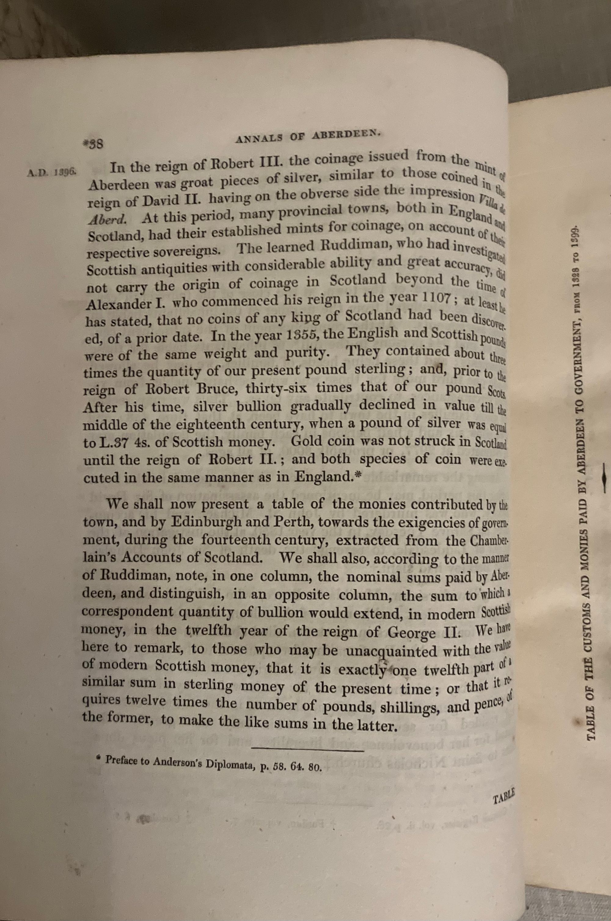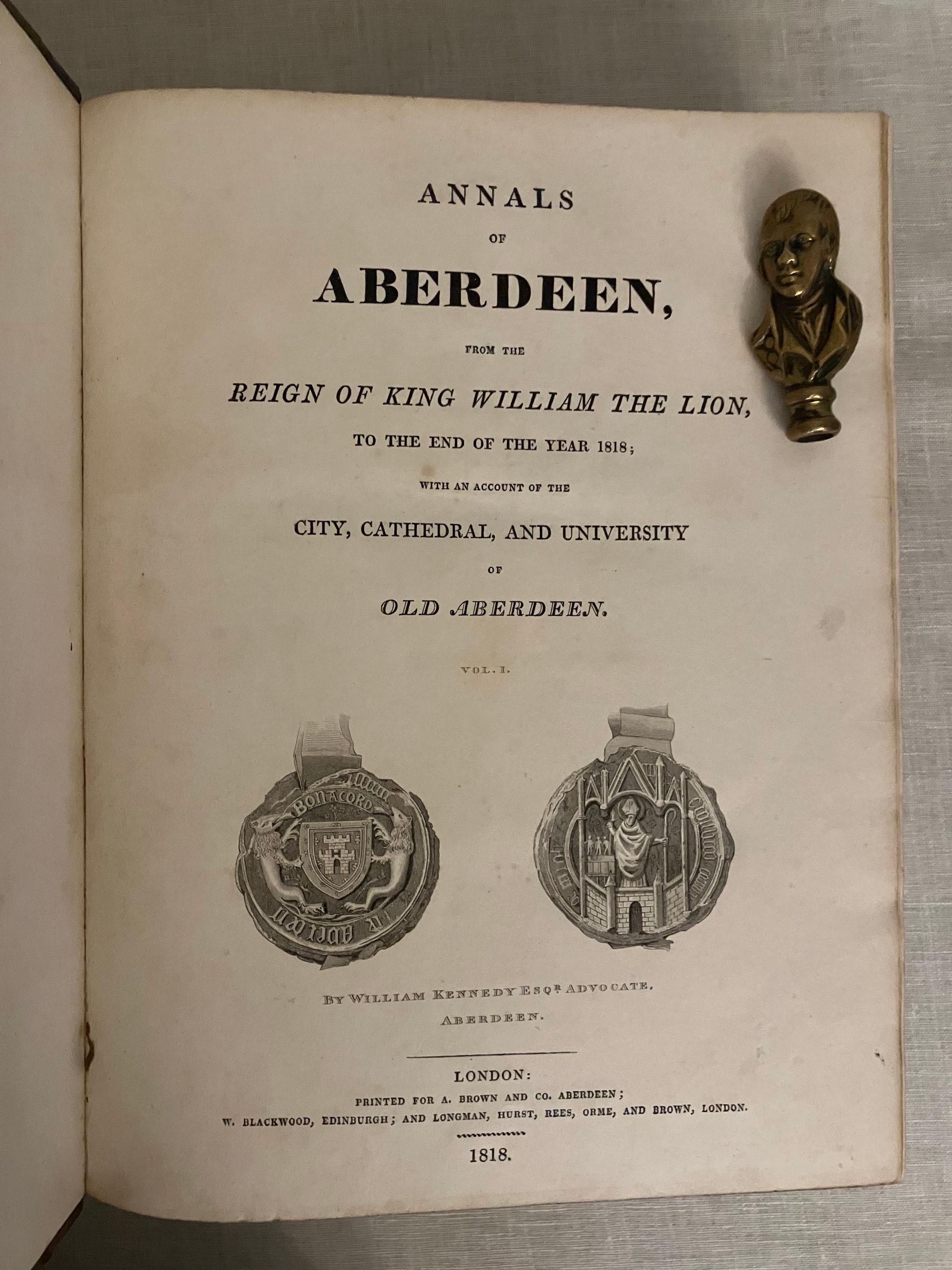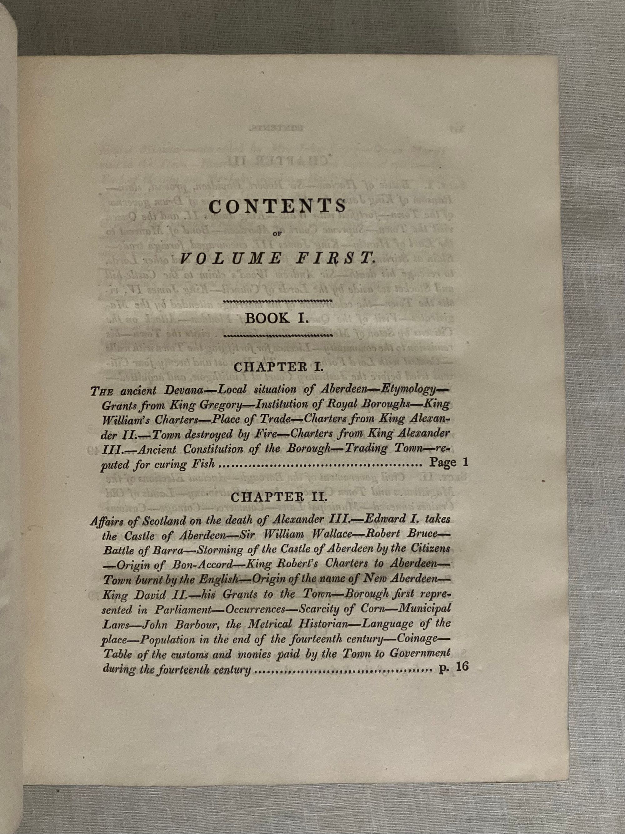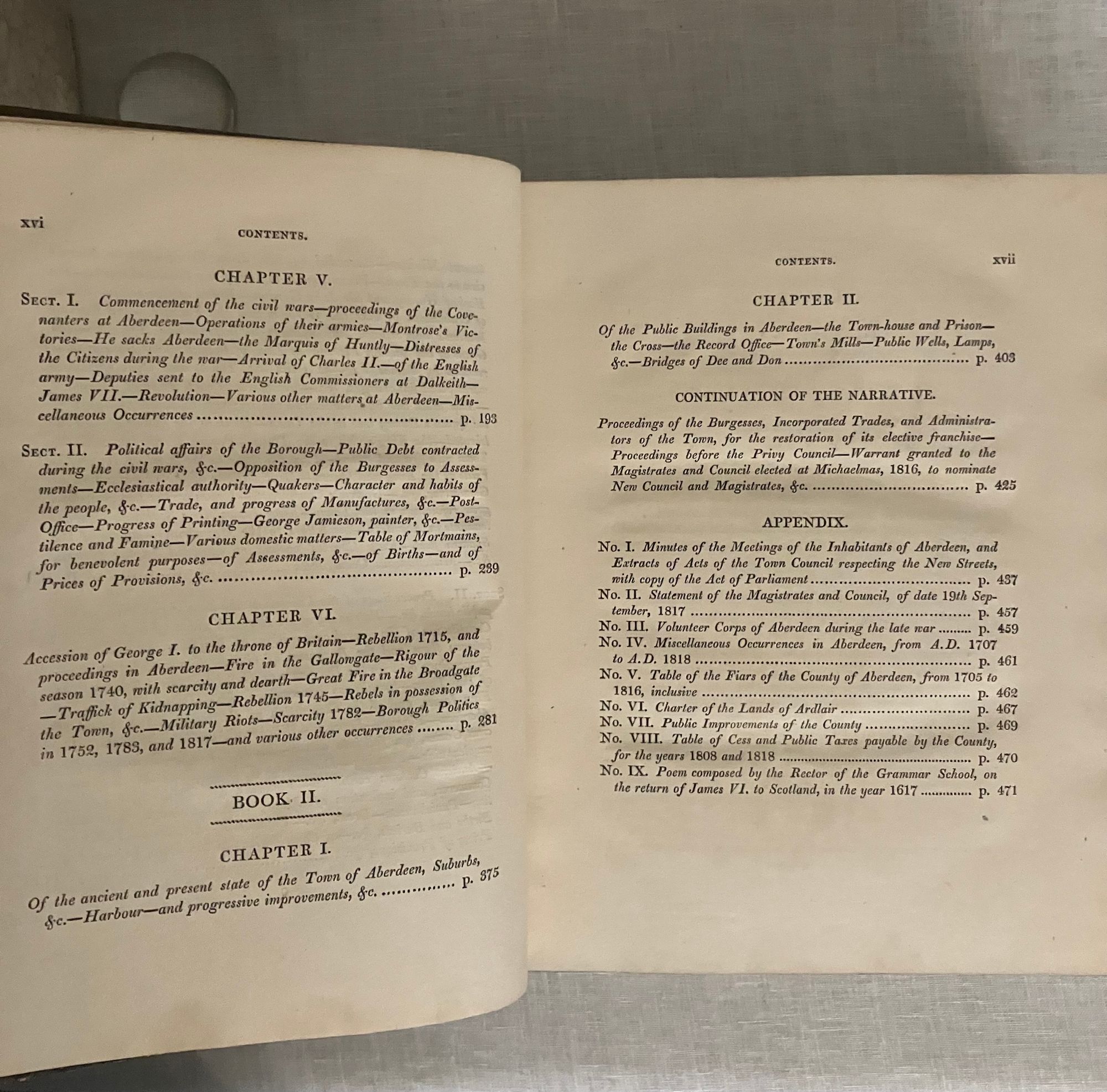 First Edition: two volumes bound in one. Hard cover, quarto. [4] (title & dedication), xviii (preface & contents of vol I), iv (contents of vol II), 1-482 (with addition of 37*, 38*), 1-496, 483-490 (index to vol I), 497-500 (index to vol II), [2]. In three-quarter leather binding with five raised bands and gold lettering to spine. **CONDITION: Very Good. Some wear to corners of covers, and some scattered foxing or other marks to text. Hinges cracked but holding firm. ** A comprehensive history of the ancient city of Aberdeen, Scotland, including illustrative charts and original documents. With subjects including: "The Ancient Devana", "Grants from King Gregory", "King William's Charters", "Charters from King Alexander III", "Trading town - reputed for curing Fish", "Edward I takes the Castle of Aberdeen - Sir William Wallace - Robert Bruce - Battle of Barra", "Storming of the Castle of Aberdeen by the Citizens", "John Barbour, the Metrical Historian", "Of Saint Nicholas Church and Quire", "Of Marischal College and University", "Ancient Music School", "Of the Progress of Printing", "Of the Butcher Market - Fish Market - Meal, Poultry and other Markets - Weigh-house - and Weights and Measures", "Ancient Hospital of Saint Peter", "Of the institution of the University, and foundation of King's College, by Bishop Elphinston". ** Notes: The subject of one of these chapters, John Barbour (c.1320-1395) was a Scottish poet, known for his historical romance written in Scots, "The Brus" (The Bruce) (c.1375). This poem tells of the Battle of Bannockburn in 1314, where Robert the Bruce defeated the English army of Edward II. One of its most famous lines is "A! Fredome is a noble thing!" ** According to the University of Aberdeen archives website, author William Kennedy (1759-1836) attended Marischal College, Aberdeen, from 1774 to 1775/6, and was an advocate in Aberdeen. (AJ) Note:Heavy Book (over 6 lbs.) may require extra postage if going overseas or priority.