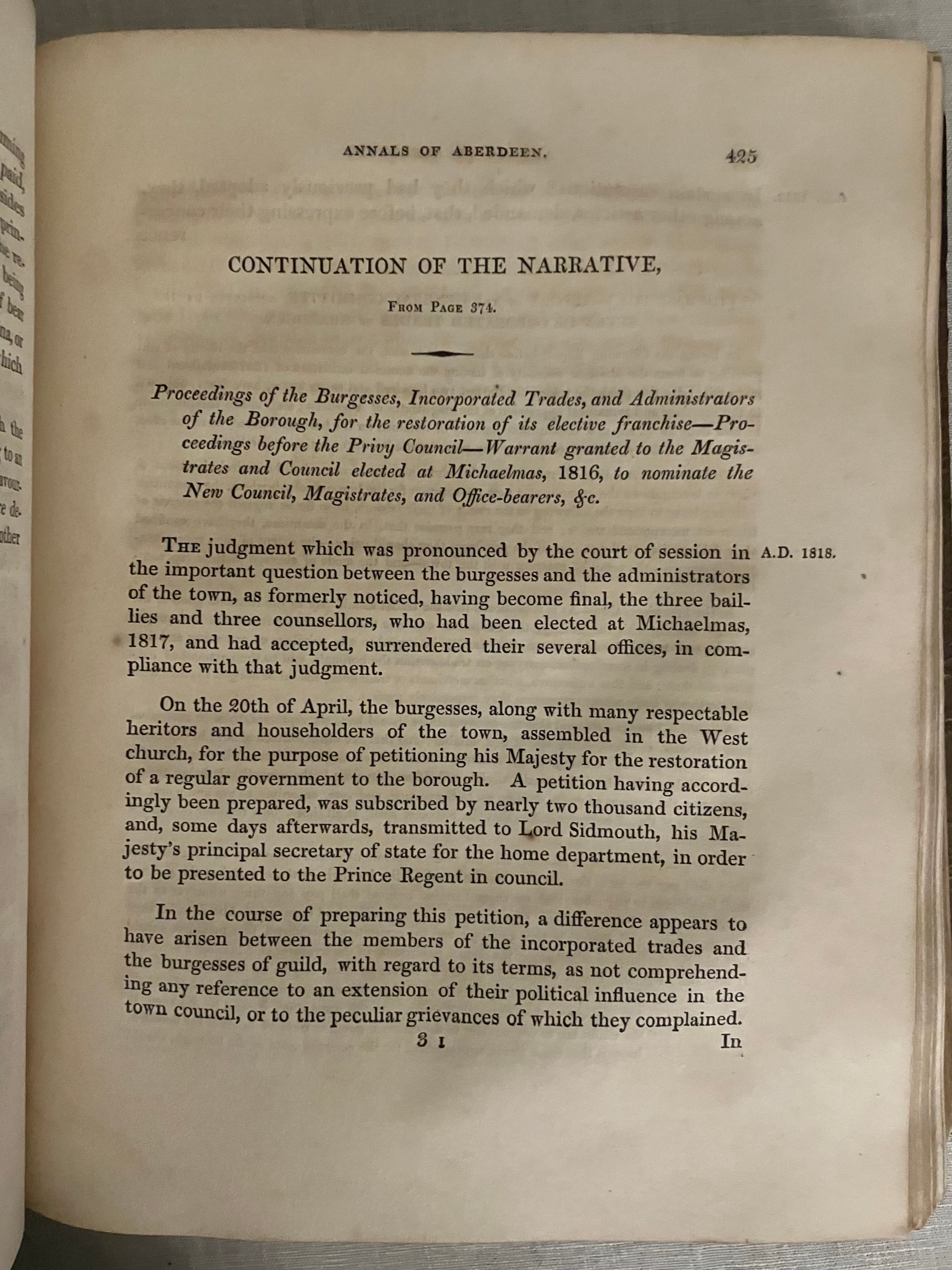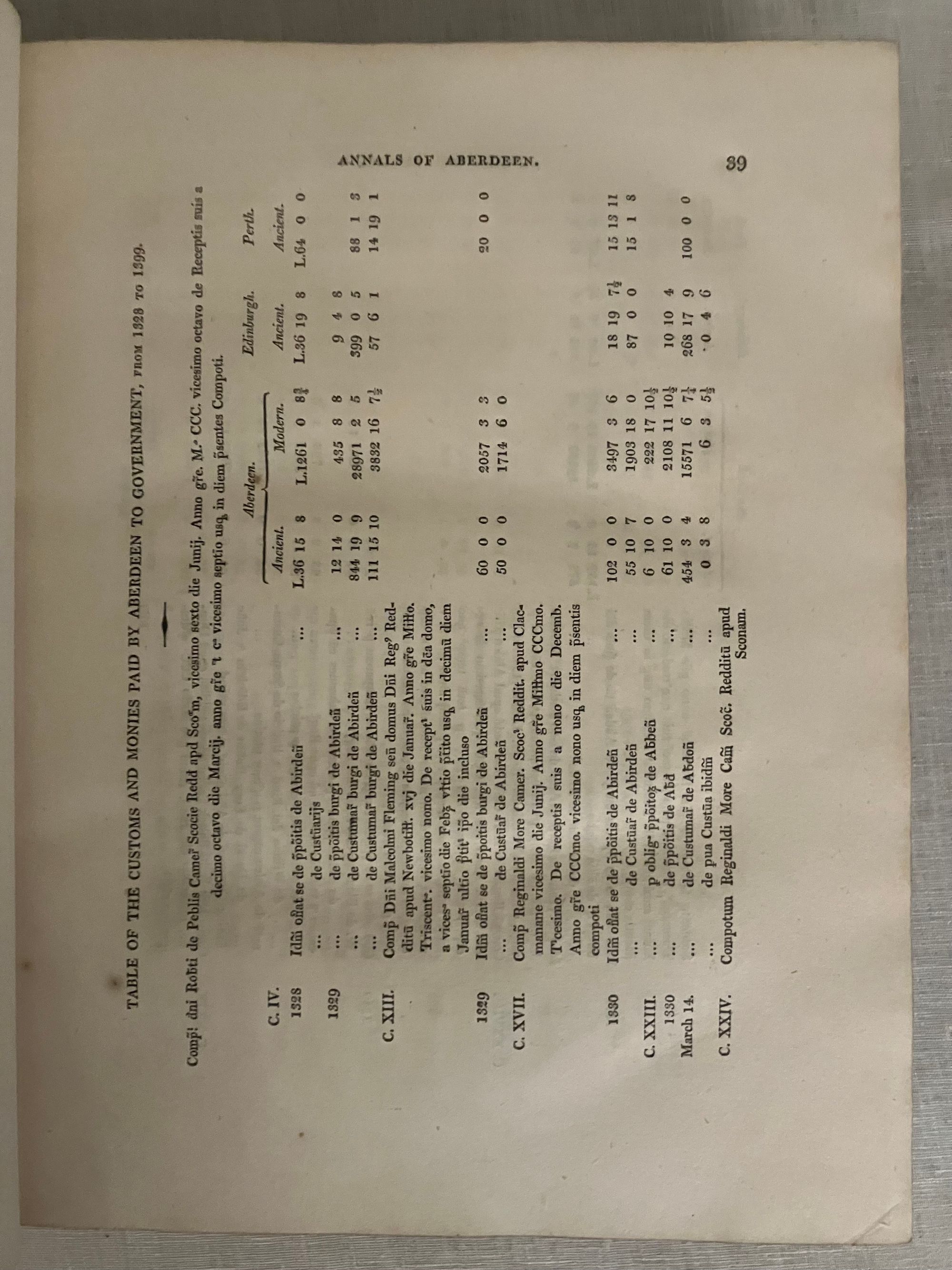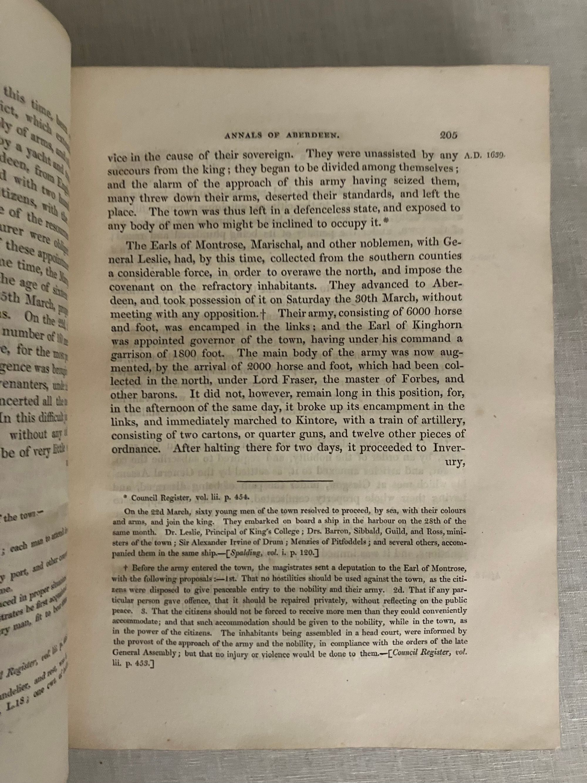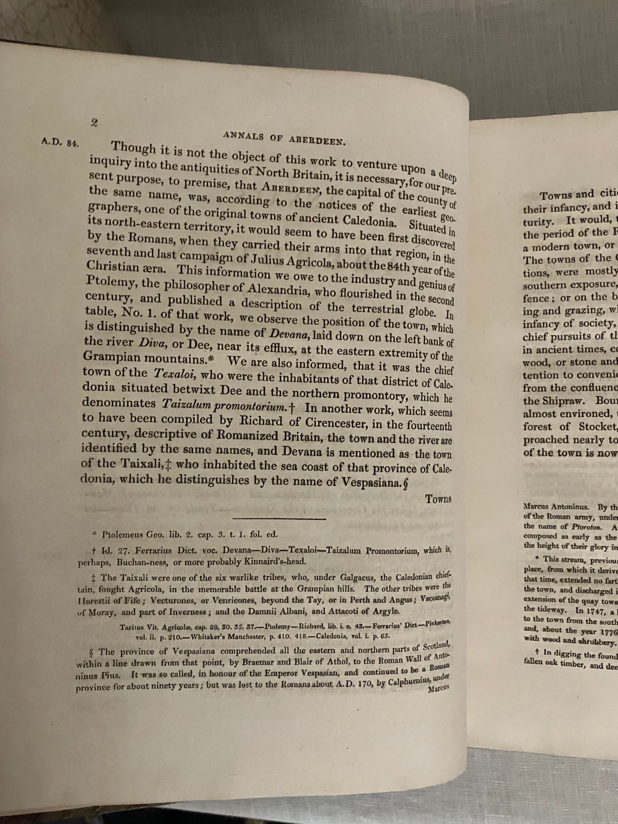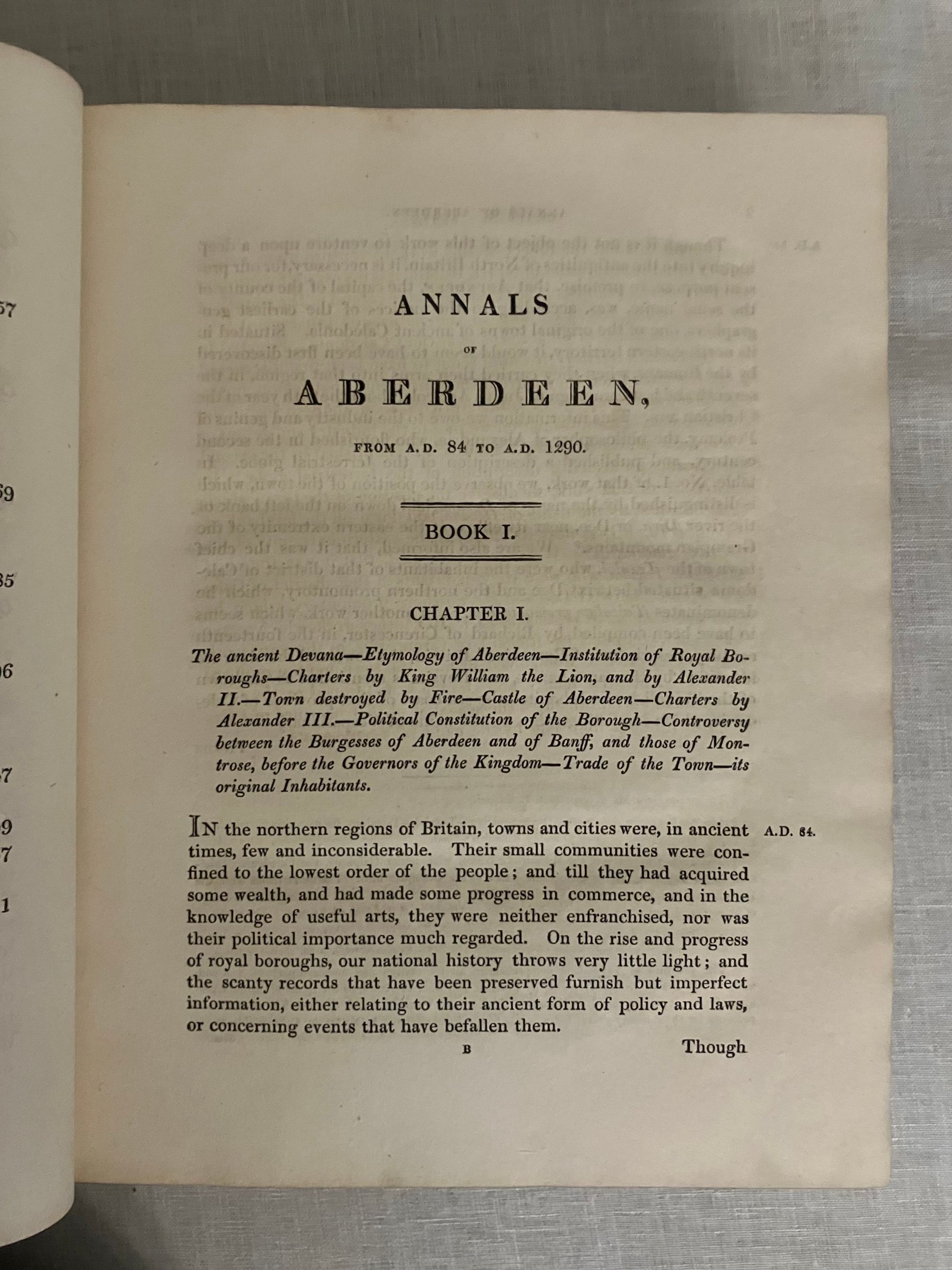 First Edition: two volumes bound in one. Hard cover, quarto. [4] (title & dedication), xviii (preface & contents of vol I), iv (contents of vol II), 1-482 (with addition of 37*, 38*), 1-496, 483-490 (index to vol I), 497-500 (index to vol II), [2]. In three-quarter leather binding with five raised bands and gold lettering to spine. **CONDITION: Very Good. Some wear to corners of covers, and some scattered foxing or other marks to text. Hinges cracked but holding firm. ** A comprehensive history of the ancient city of Aberdeen, Scotland, including illustrative charts and original documents. With subjects including: "The Ancient Devana", "Grants from King Gregory", "King William's Charters", "Charters from King Alexander III", "Trading town - reputed for curing Fish", "Edward I takes the Castle of Aberdeen - Sir William Wallace - Robert Bruce - Battle of Barra", "Storming of the Castle of Aberdeen by the Citizens", "John Barbour, the Metrical Historian", "Of Saint Nicholas Church and Quire", "Of Marischal College and University", "Ancient Music School", "Of the Progress of Printing", "Of the Butcher Market - Fish Market - Meal, Poultry and other Markets - Weigh-house - and Weights and Measures", "Ancient Hospital of Saint Peter", "Of the institution of the University, and foundation of King's College, by Bishop Elphinston". ** Notes: The subject of one of these chapters, John Barbour (c.1320-1395) was a Scottish poet, known for his historical romance written in Scots, "The Brus" (The Bruce) (c.1375). This poem tells of the Battle of Bannockburn in 1314, where Robert the Bruce defeated the English army of Edward II. One of its most famous lines is "A! Fredome is a noble thing!" ** According to the University of Aberdeen archives website, author William Kennedy (1759-1836) attended Marischal College, Aberdeen, from 1774 to 1775/6, and was an advocate in Aberdeen. (AJ) Note:Heavy Book (over 6 lbs.) may require extra postage if going overseas or priority.