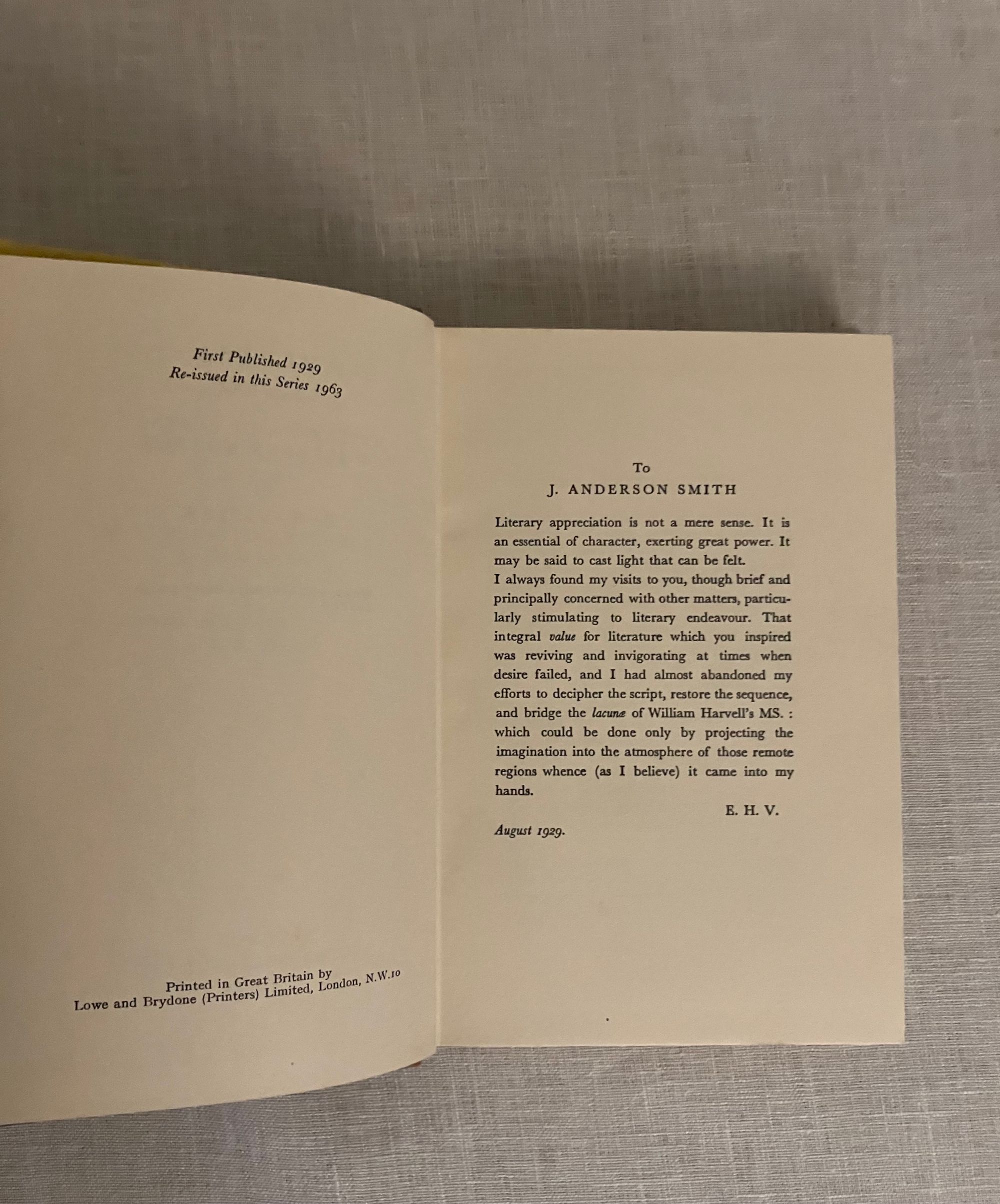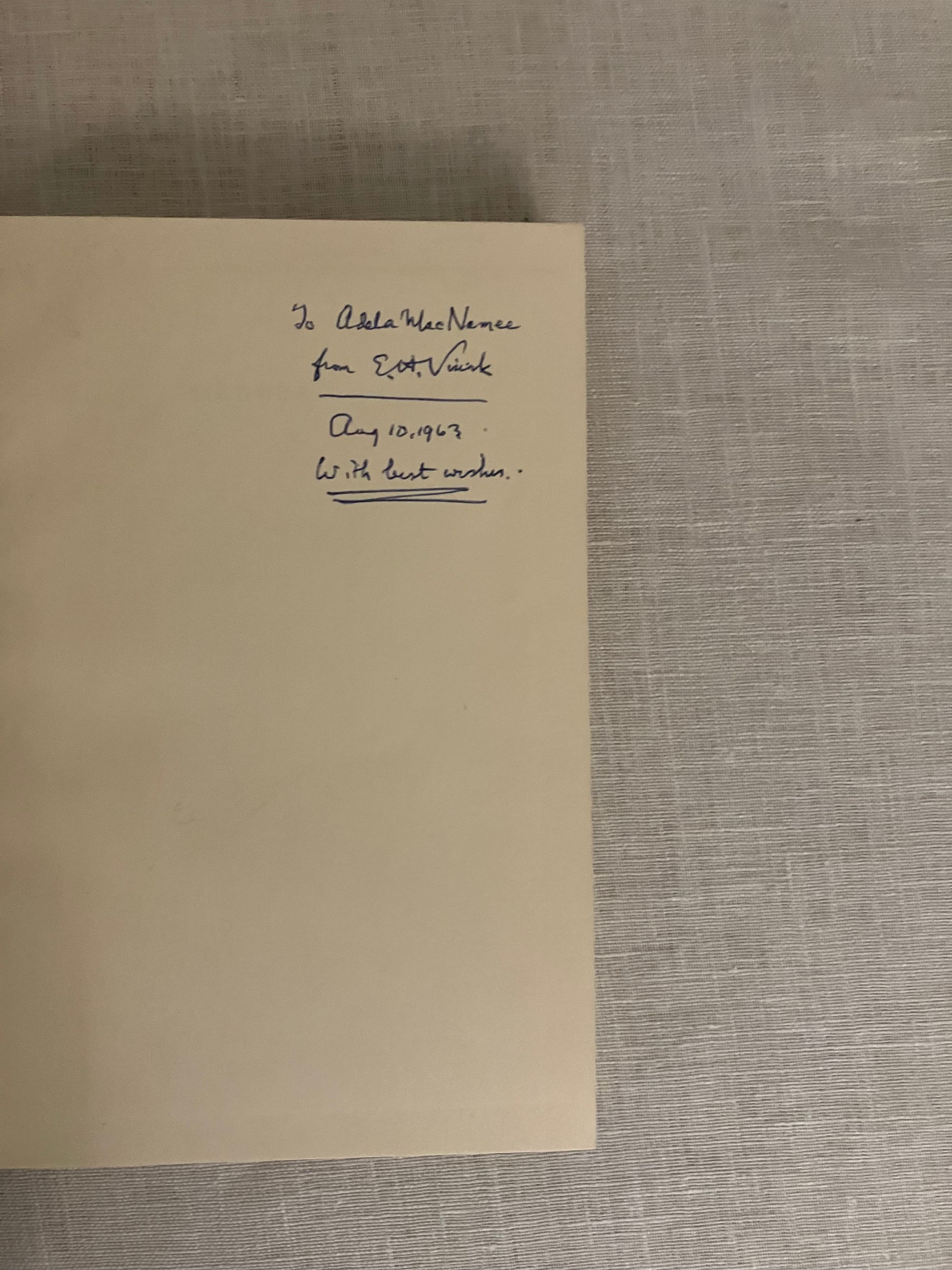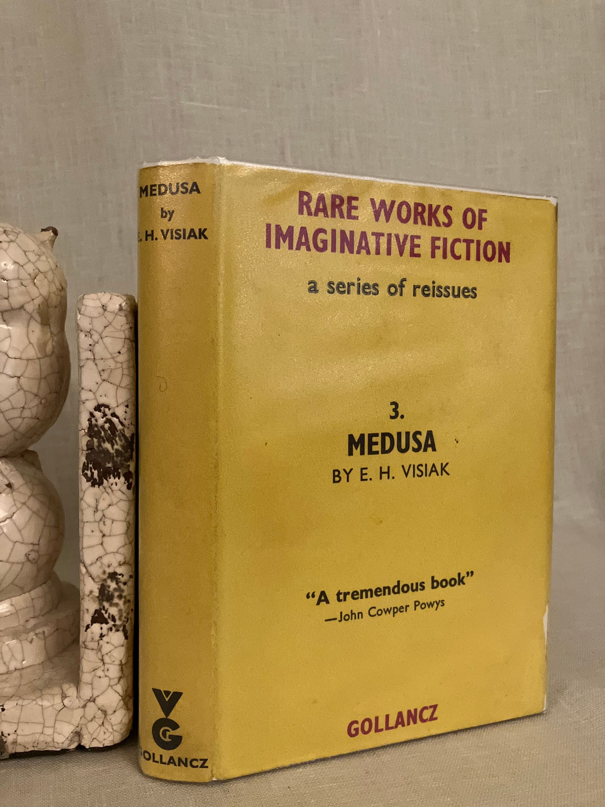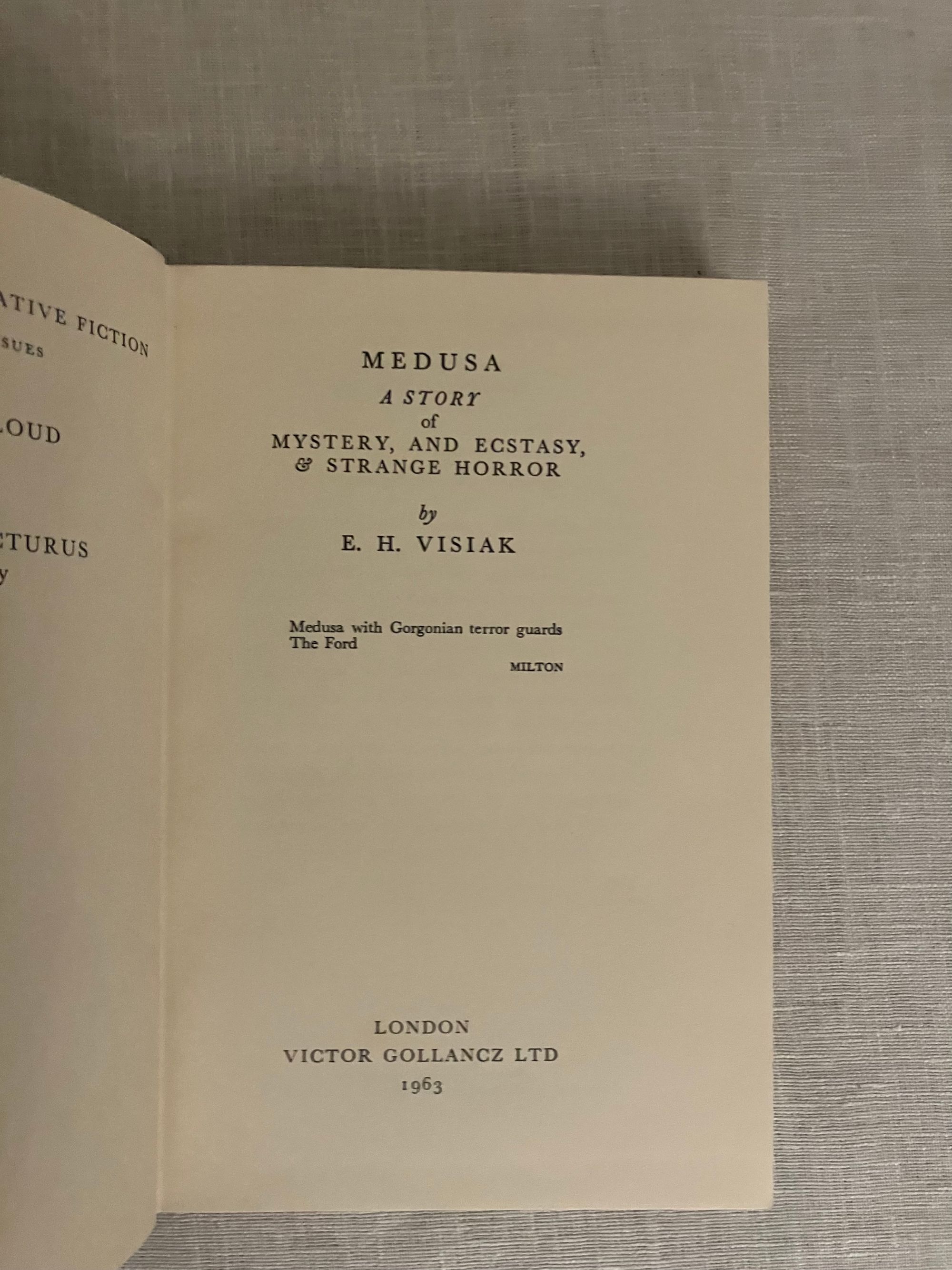SIGNED COPY. Hard cover, 8vo, 286pp. In publisher's brown cloth binding with gold lettering to spine. In the distinctive yellow Gollancz dust jacket with black and red lettering. Reissue of E. H. Visiak's 1929 masterpiece, inscribed and signed by him on front free endpaper and dated Aug 10, 1963. CONDITION: Near Fine in a Very Good, unclipped dust jacket which has some light marks and wear at the edges, now protected in mylar. Foxing to fore-edge of text-block visible when book closed. ** E.H. Visiak, born Edward Harold Physick (1878-1972) was an English writer and critic. His main area of study was John Milton, whose "Paradise Lost" contains many themes of morality and allegory. Visiak was a friend and champion of the Scottish writer David Lindsay, and wrote a piece comparing Lindsay's novel "A Voyage to Arcturus" (1920) to the works of Milton. He wrote four novels, and published works of criticism as well as collections of poetry. ** "Medusa" start out as a seafaring tale (H.E. Bates compared it to works by Robert Louis Stevenson). However, like a story by H.P. Lovecraft, the adventurers encounter other-worldly creatures, and the tale becomes one of horror, and escape from an unknowable doom. Bleiler "The Guide to Supernatural Fiction" #1636 (the original 1929 Gollancz edition).