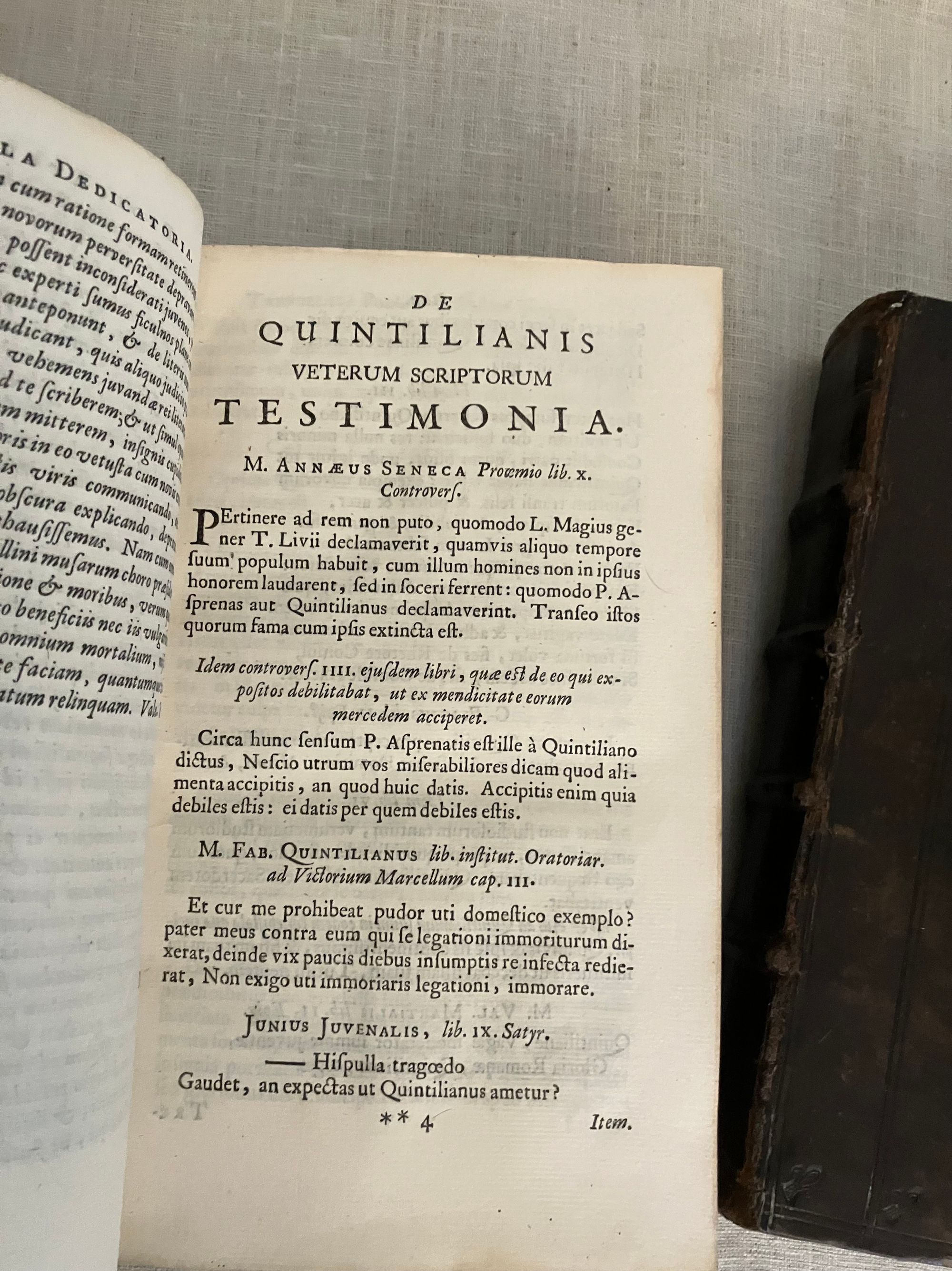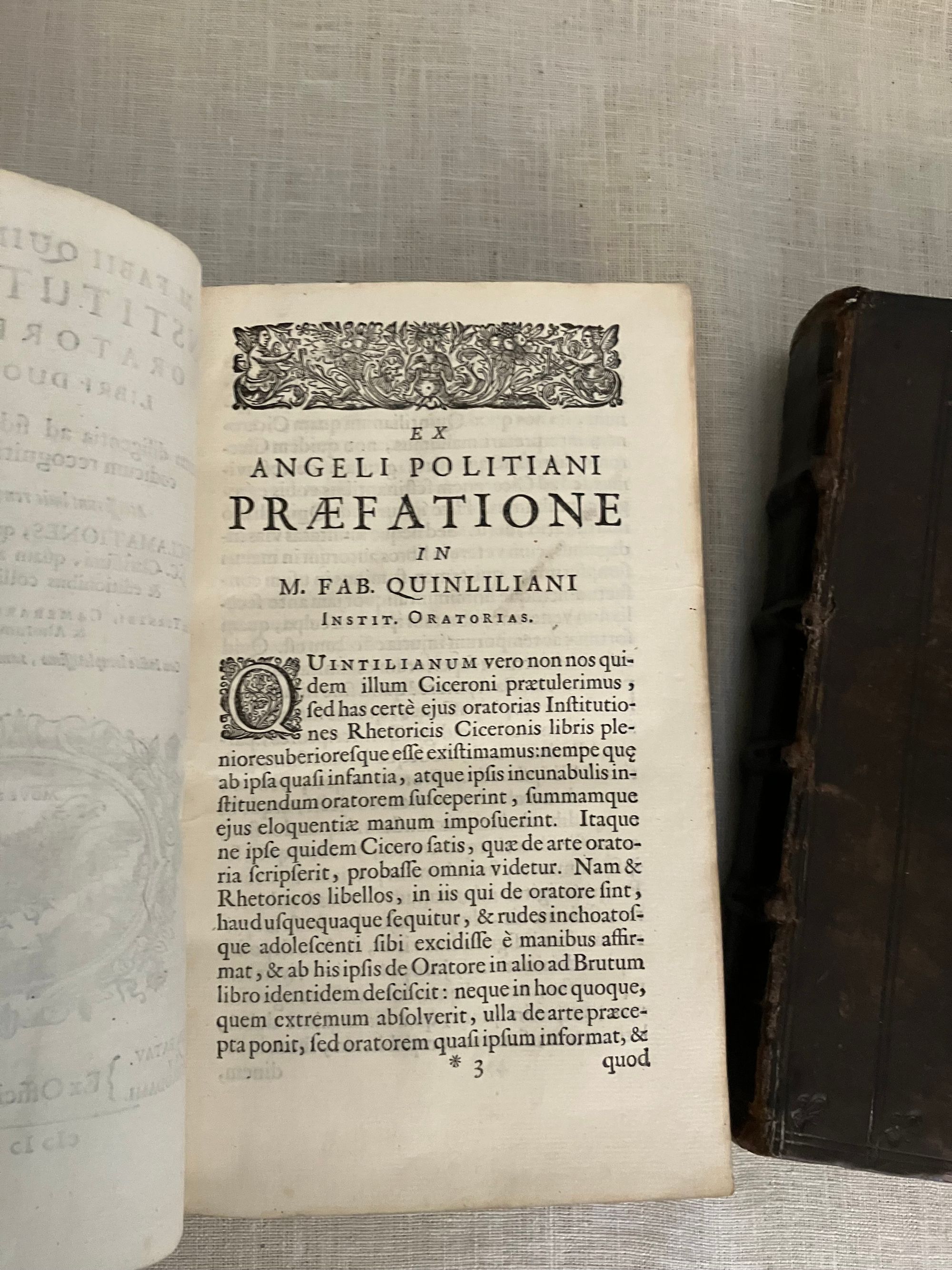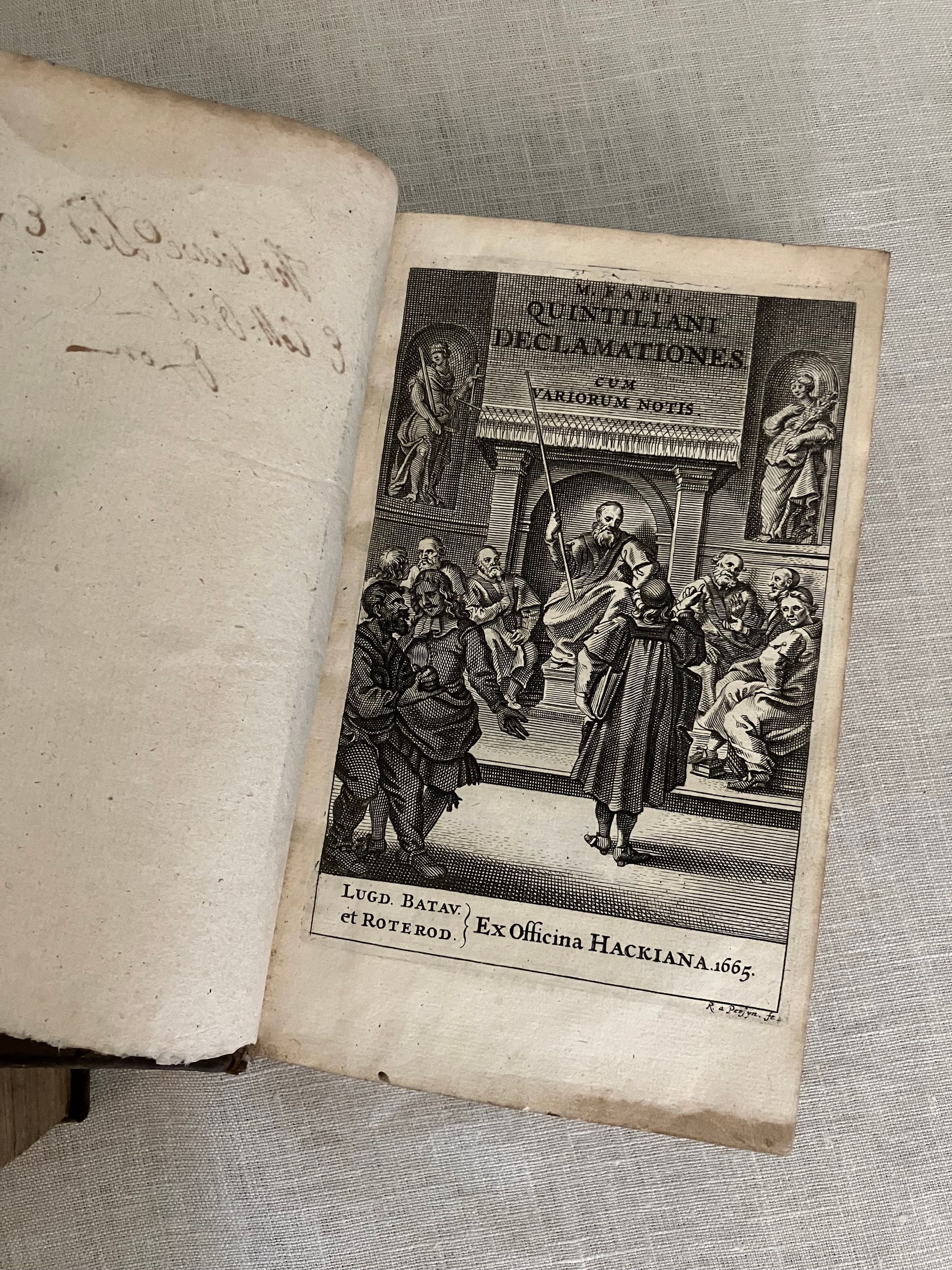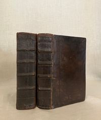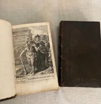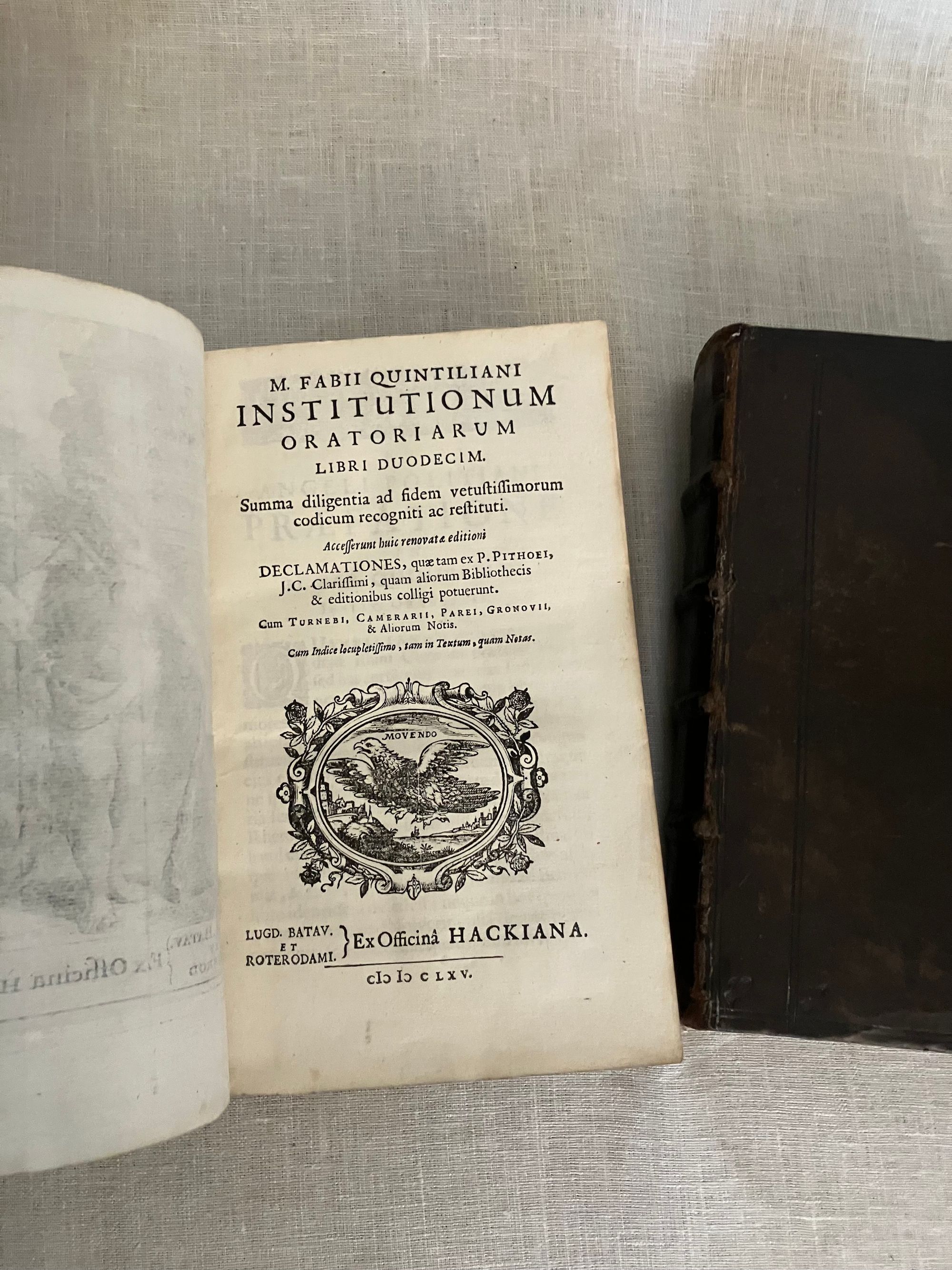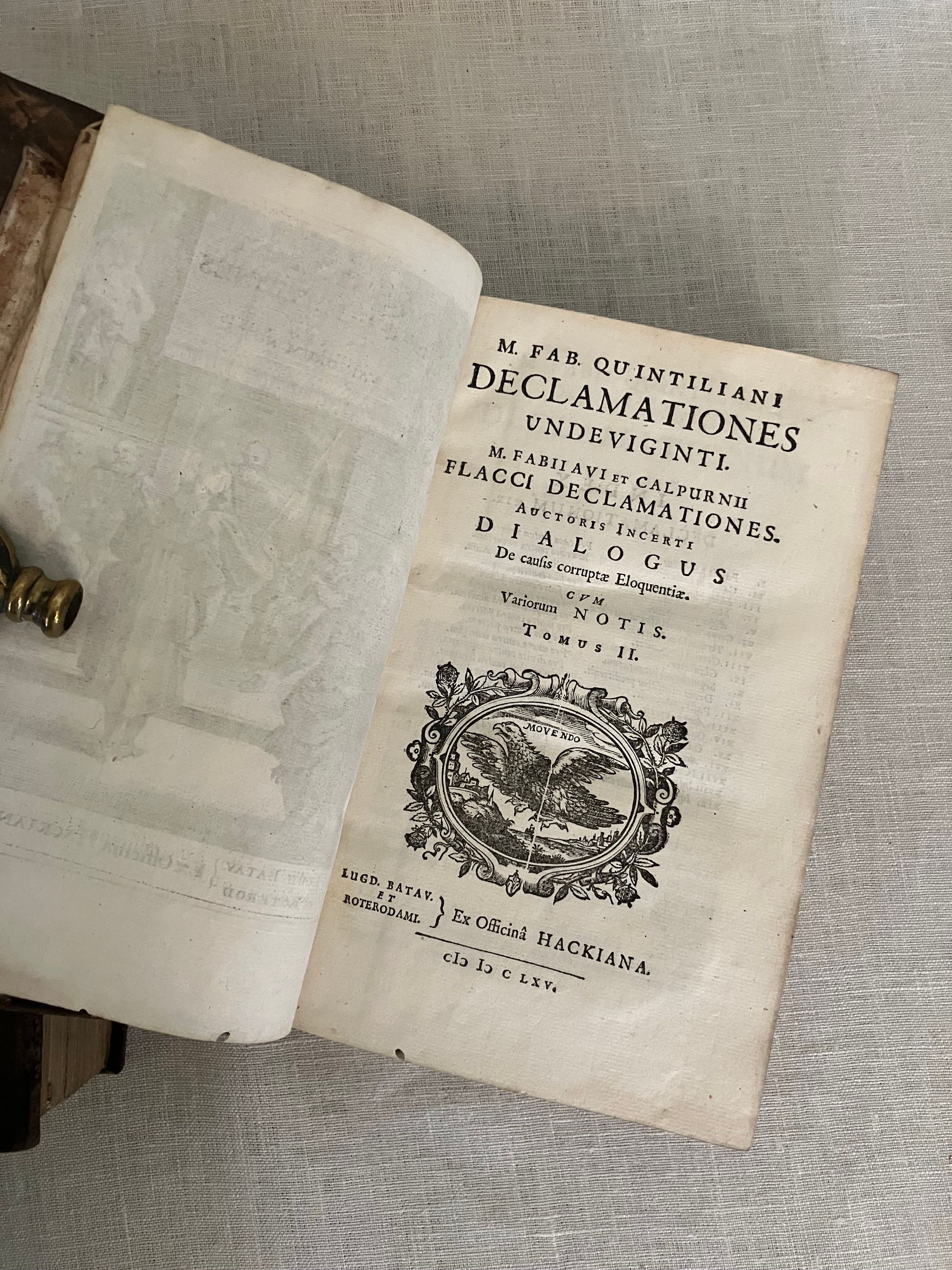 Hard cover, two volume set, complete, 8vo., in full calf binding, the boards framed in blind with double rules and small fleur-de-lis motifs stamped to the corners, the spines with four raised bands, double rules, including diagonal scoring at lowest compartment, all tooled in blind. Board edges rolled in small blind dots. Each volume has a separate full page illustrated engraved title page, with the motto "Ludg. Batav./Et/Roterod."Ex Officiana Hackiana. 1665. Vol. I's engraved illustrated title page shows a half man/half lion loosely chained through the tongue to a group of five men: a cardinal, perhaps, a scholar, a king or other coroneted figure, a soldier and a printer or other workman carrying a measuring tool, all in front of a carved monument statue bearing the title of the book. The chain through the tongue has been interpreted as referring to this glorification of oratory, which literally is seen holding the Dutch Republic together, where the "lion rampant" is a symbol of the Republic. The engraved title page in Vol. II likewise illustrates a Roman school of oratory, with Quintilian teaching. (ref. Simon Schama) The secondary title pages of both volumes feature the Officiana Hackiana printer's device of an eagle in flight over water with the motto "MOVENDO" (moving) in Latin, set within an architectural cartouche with Tudor style roses and other flowers. **Dutch PRINTERS Officiana Hackiana, refers to publisher, printer and bookseller Jacobus Hackius (active 1663-1698),who along with two brothers operated locations in both Leiden and Rotterdam. The engraved notation on the bottom left of the two pictorial title pages refers to this: "Ludg. Batav. et Roterod" being an abbreviated motto for "Lugdunam Bavorum;" Latin for Leiden, and Rotorrod for Rotterdam. (Royal Library of Belgium, General Catalogue). **CONDITION: Very Good antiquarian condition. Rubbing to edges and corners with some small cracks/loss to head of spines. Slight wear to joints, but holding firm. Endpapers have some wear and creasing, with two original owners' names in old ink, dated 1673 and later (undated--see below) Prelims show some wear and minor losses. Interior text is quite clean.***Roman Author QUINTILIAN (c.35 AD - c.100 AD) was a rhetorician whose most famous work is this book, the "Institutio Oratoria" (c. 95 AD). In this twelve-book guide to rhetoric, Quintilian harks back to the glory days of Cicero, and tries to establish a means by which those high standards could be regained. He describes the ideal education of an orator, and explores the different kinds of oratory. There is an entire book given over to laughter, and another to the career of an orator. COLLATION: Vol I: [34], 916, [34] pp; [], *8, **8, A-I8, K-T8, V8, X-Z8, Aa-Ii8, Kk-Tt8, Vv8, Xx-Zz8, Aaa-Iii8, Kkk-Nnn8, Ooo2, []. Vol II: [6], 784, [8] pp.; []3, A-I8, K-T8, V8, X-Z8, Aaa-Ii8, Kk-Tt8, Vv8, Xx-Zz8, Aaa-Ccc8, Ddd4. PROVENANCE: The books bear two signatures in old ink. The earliest is of Guliemi Dod, Oxon. 1673, probably William, a forefather of the second signatory: Thomas Crewe Dod (1754-1827)., Dod the younger was a Cheshire, England -born cavalry officer of the 16th Army Light Dragoons who first served in America under Gen. John Burgoyne in 1776. After returning to England, he then departed for service in India, serving thirty years with the first group of British cavalry, the 23rd Light Dragoon, to do so in that country. After 1785 he returned to England to run his estate from Edge Hall, and served other roles in Cheshire yeomanry. (L.E. Buckell) **REFS: Rijksmuseum OCLC 644683242. Appears to be the 1665 edition "Variorum" p. 368 of Dibdin Vol. II, with notes for the "Declamations" by Frederick Gronovius. See L.E. Buckell, "The 23rd Light Dragoons and Col. Thomas Crewe Dod," in Journal of the Soc. for Army Historical Research, Vol. 26, No. 107 (Autumn, 1948). Also, S. Schama, "The Embarrassment of Riches: An Interpretation of Dutch Culture in the Golden Age," (New York: Random House, 1988). (AJ and AMJ)