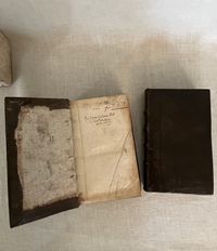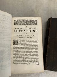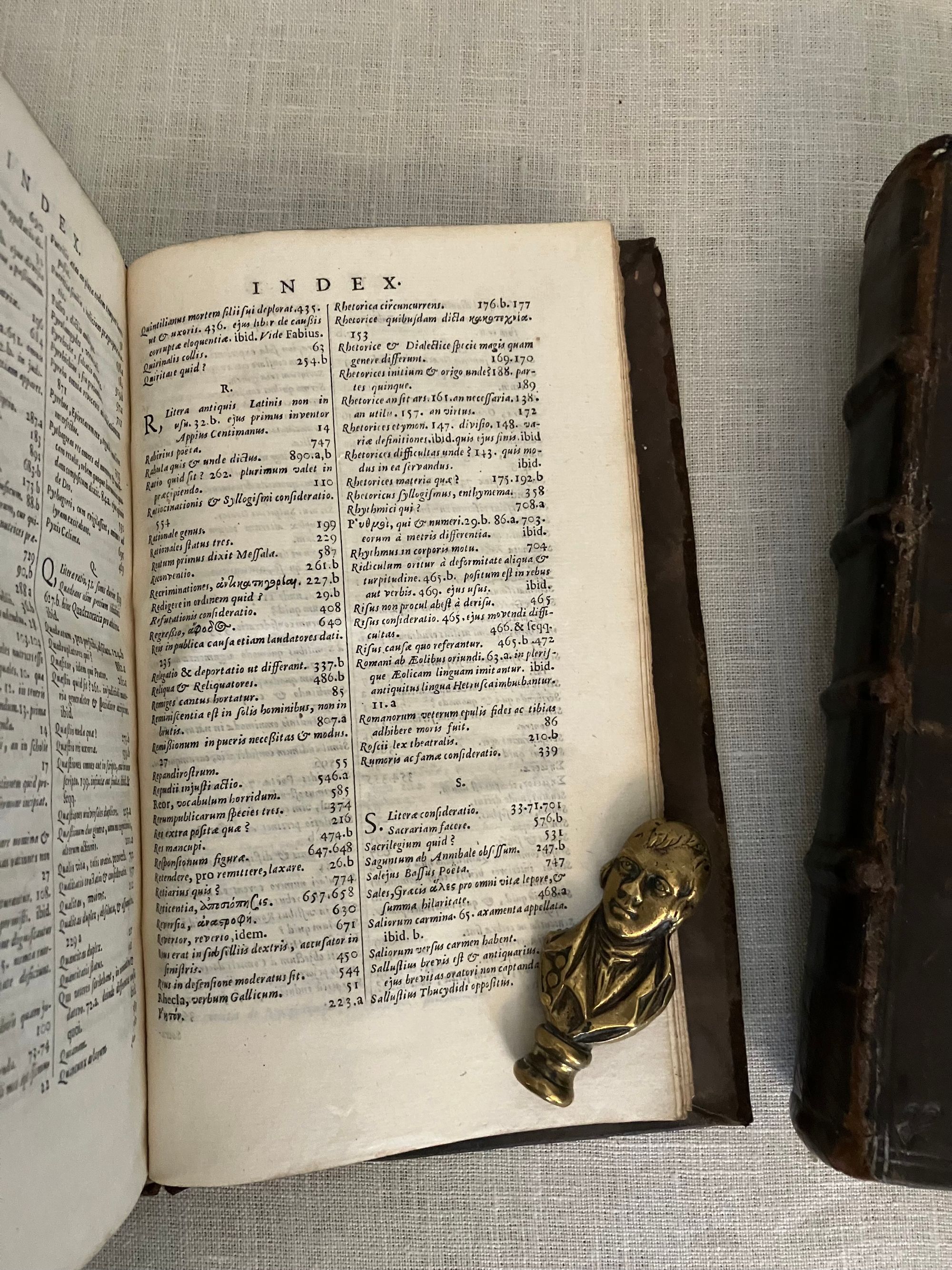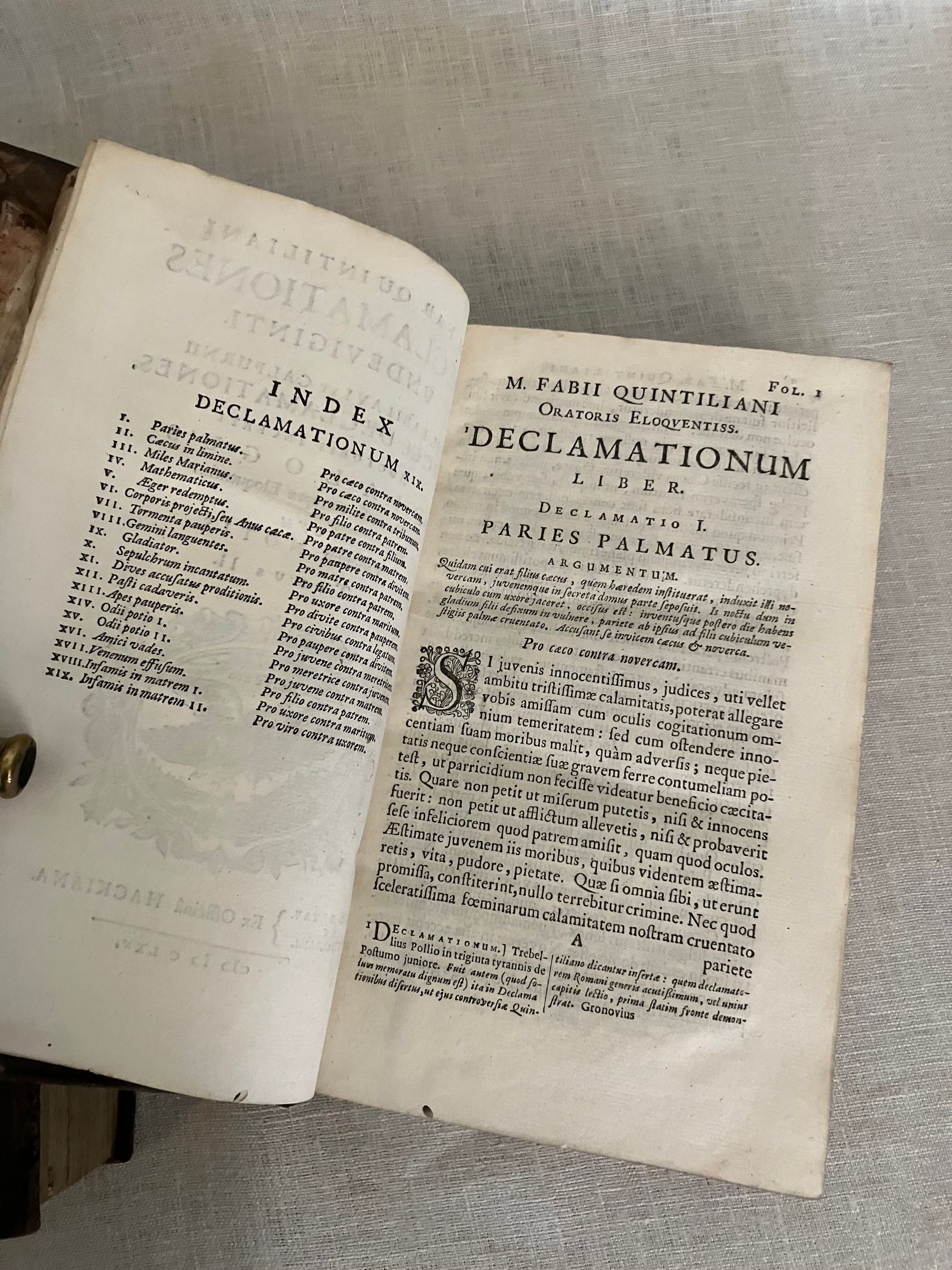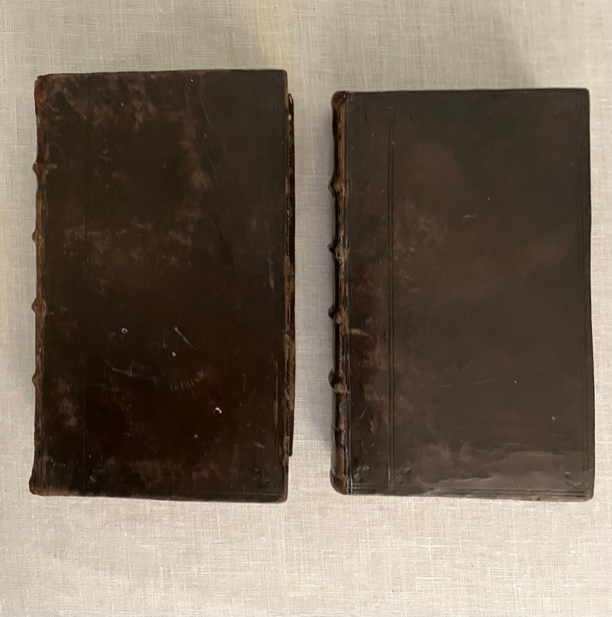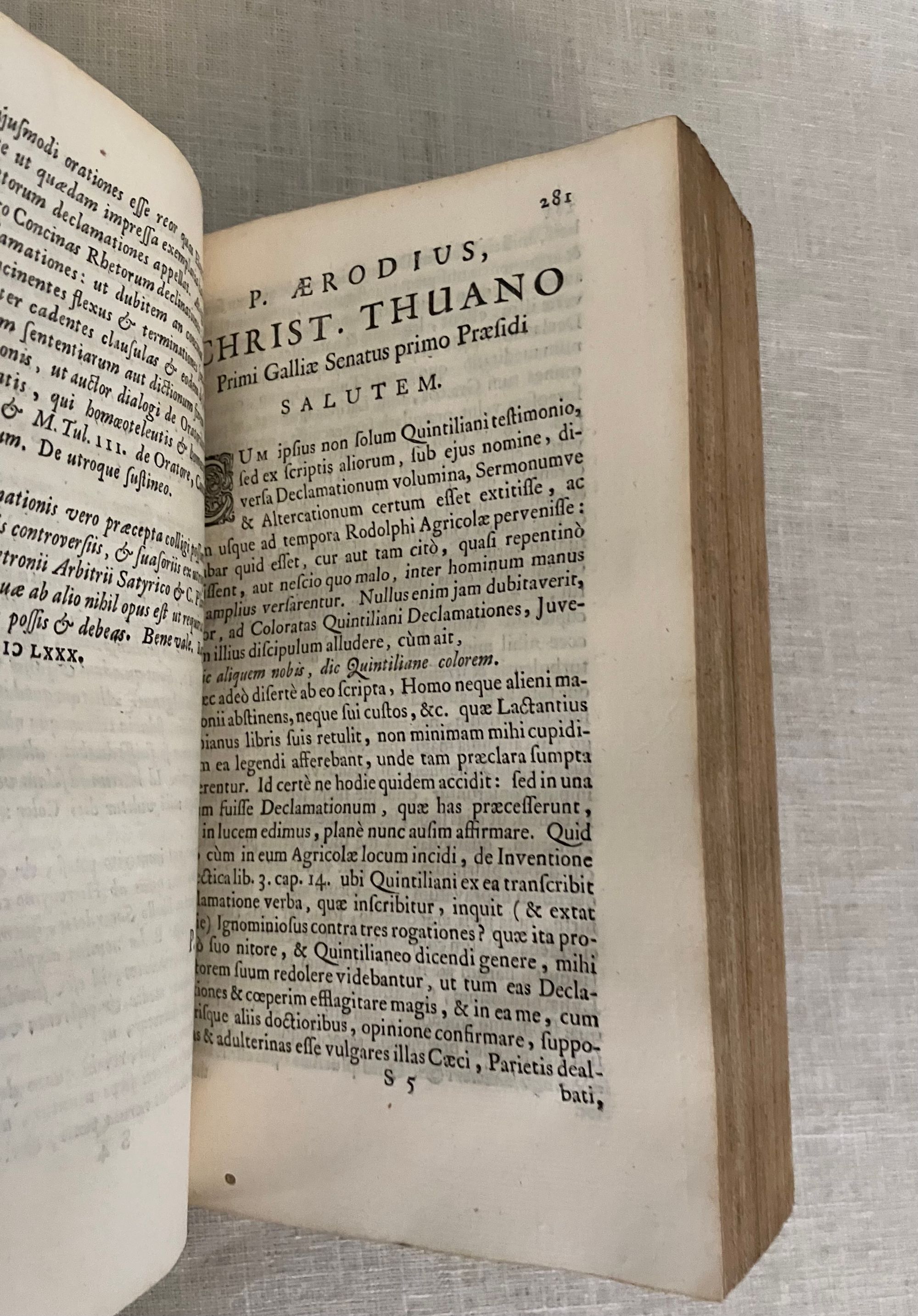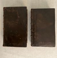 Hard cover, two volume set, complete, 8vo., in full calf binding, the boards framed in blind with double rules and small fleur-de-lis motifs stamped to the corners, the spines with four raised bands, double rules, including diagonal scoring at lowest compartment, all tooled in blind. Board edges rolled in small blind dots. Each volume has a separate full page illustrated engraved title page, with the motto "Ludg. Batav./Et/Roterod."Ex Officiana Hackiana. 1665. Vol. I's engraved illustrated title page shows a half man/half lion loosely chained through the tongue to a group of five men: a cardinal, perhaps, a scholar, a king or other coroneted figure, a soldier and a printer or other workman carrying a measuring tool, all in front of a carved monument statue bearing the title of the book. The chain through the tongue has been interpreted as referring to this glorification of oratory, which literally is seen holding the Dutch Republic together, where the "lion rampant" is a symbol of the Republic. The engraved title page in Vol. II likewise illustrates a Roman school of oratory, with Quintilian teaching. (ref. Simon Schama) The secondary title pages of both volumes feature the Officiana Hackiana printer's device of an eagle in flight over water with the motto "MOVENDO" (moving) in Latin, set within an architectural cartouche with Tudor style roses and other flowers. **Dutch PRINTERS Officiana Hackiana, refers to publisher, printer and bookseller Jacobus Hackius (active 1663-1698),who along with two brothers operated locations in both Leiden and Rotterdam. The engraved notation on the bottom left of the two pictorial title pages refers to this: "Ludg. Batav. et Roterod" being an abbreviated motto for "Lugdunam Bavorum;" Latin for Leiden, and Rotorrod for Rotterdam. (Royal Library of Belgium, General Catalogue). **CONDITION: Very Good antiquarian condition. Rubbing to edges and corners with some small cracks/loss to head of spines. Slight wear to joints, but holding firm. Endpapers have some wear and creasing, with two original owners' names in old ink, dated 1673 and later (undated--see below) Prelims show some wear and minor losses. Interior text is quite clean.***Roman Author QUINTILIAN (c.35 AD - c.100 AD) was a rhetorician whose most famous work is this book, the "Institutio Oratoria" (c. 95 AD). In this twelve-book guide to rhetoric, Quintilian harks back to the glory days of Cicero, and tries to establish a means by which those high standards could be regained. He describes the ideal education of an orator, and explores the different kinds of oratory. There is an entire book given over to laughter, and another to the career of an orator. COLLATION: Vol I: [34], 916, [34] pp; [], *8, **8, A-I8, K-T8, V8, X-Z8, Aa-Ii8, Kk-Tt8, Vv8, Xx-Zz8, Aaa-Iii8, Kkk-Nnn8, Ooo2, []. Vol II: [6], 784, [8] pp.; []3, A-I8, K-T8, V8, X-Z8, Aaa-Ii8, Kk-Tt8, Vv8, Xx-Zz8, Aaa-Ccc8, Ddd4. PROVENANCE: The books bear two signatures in old ink. The earliest is of Guliemi Dod, Oxon. 1673, probably William, a forefather of the second signatory: Thomas Crewe Dod (1754-1827)., Dod the younger was a Cheshire, England -born cavalry officer of the 16th Army Light Dragoons who first served in America under Gen. John Burgoyne in 1776. After returning to England, he then departed for service in India, serving thirty years with the first group of British cavalry, the 23rd Light Dragoon, to do so in that country. After 1785 he returned to England to run his estate from Edge Hall, and served other roles in Cheshire yeomanry. (L.E. Buckell) **REFS: Rijksmuseum OCLC 644683242. Appears to be the 1665 edition "Variorum" p. 368 of Dibdin Vol. II, with notes for the "Declamations" by Frederick Gronovius. See L.E. Buckell, "The 23rd Light Dragoons and Col. Thomas Crewe Dod," in Journal of the Soc. for Army Historical Research, Vol. 26, No. 107 (Autumn, 1948). Also, S. Schama, "The Embarrassment of Riches: An Interpretation of Dutch Culture in the Golden Age," (New York: Random House, 1988). (AJ and AMJ)