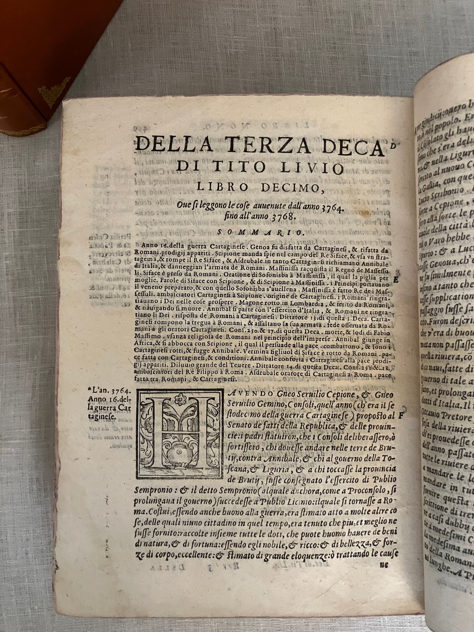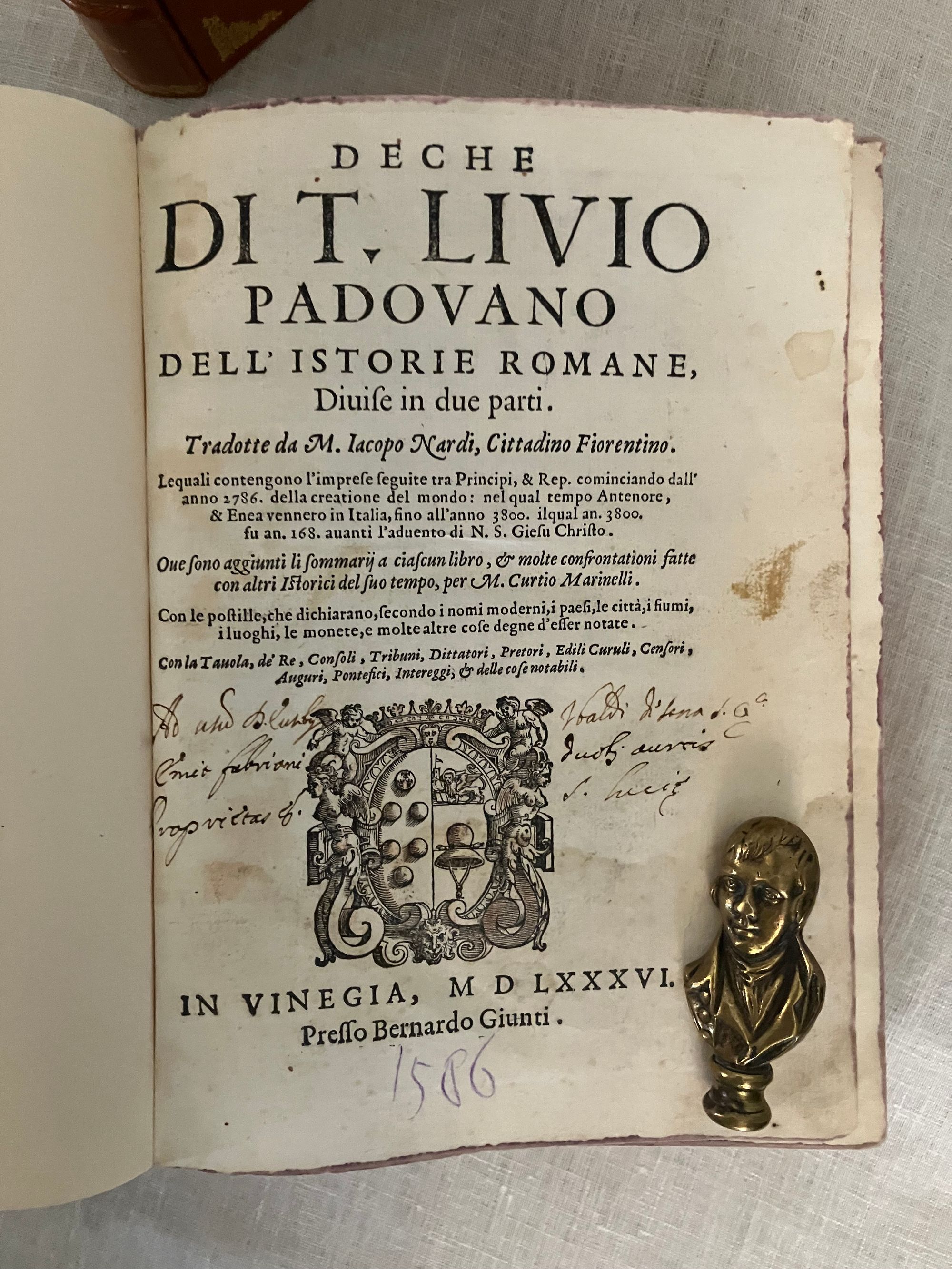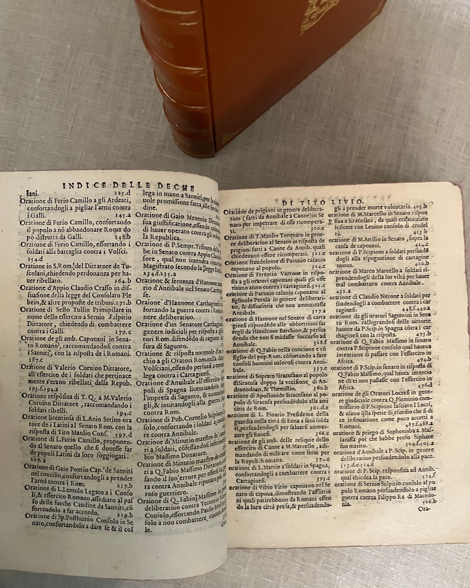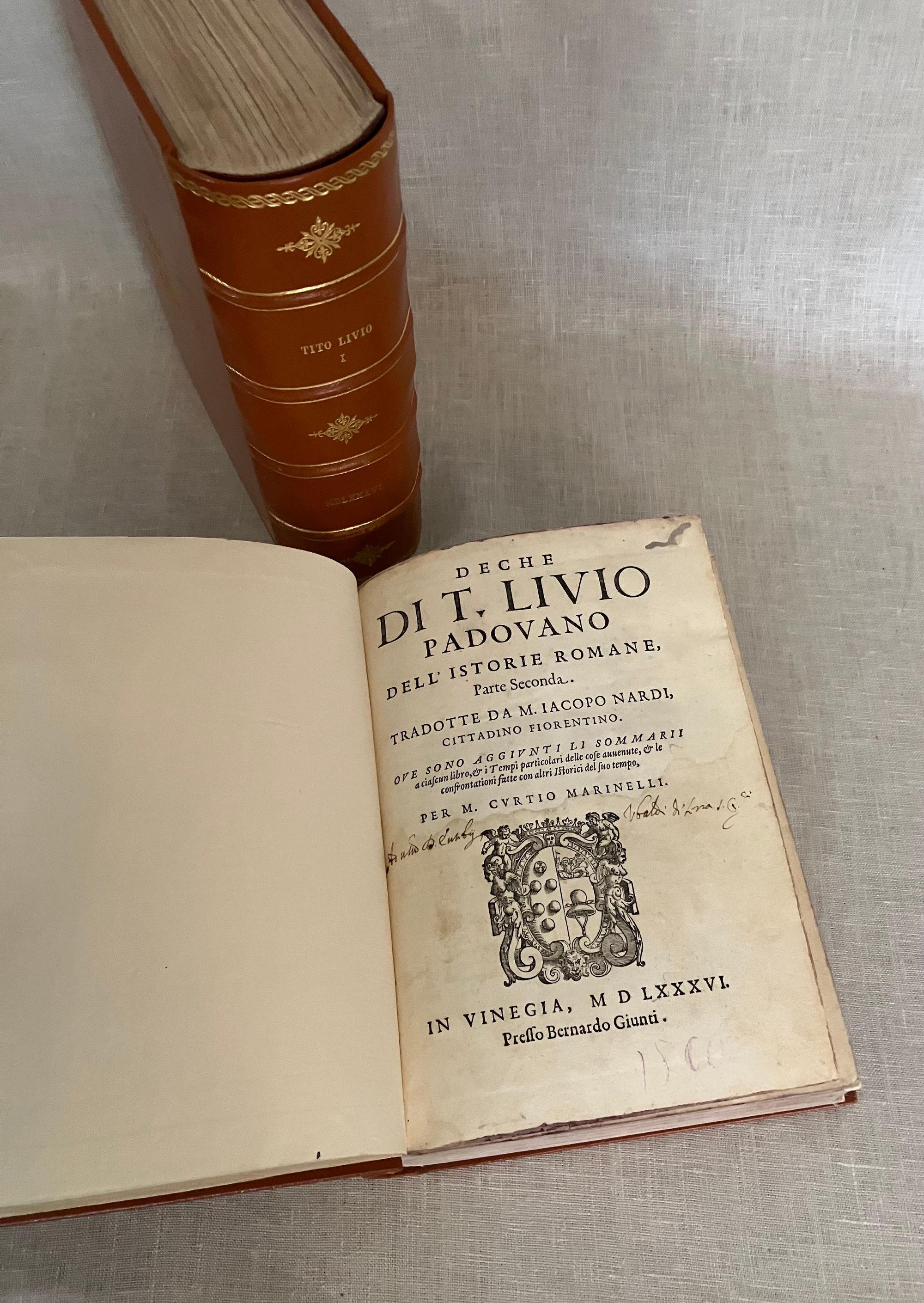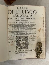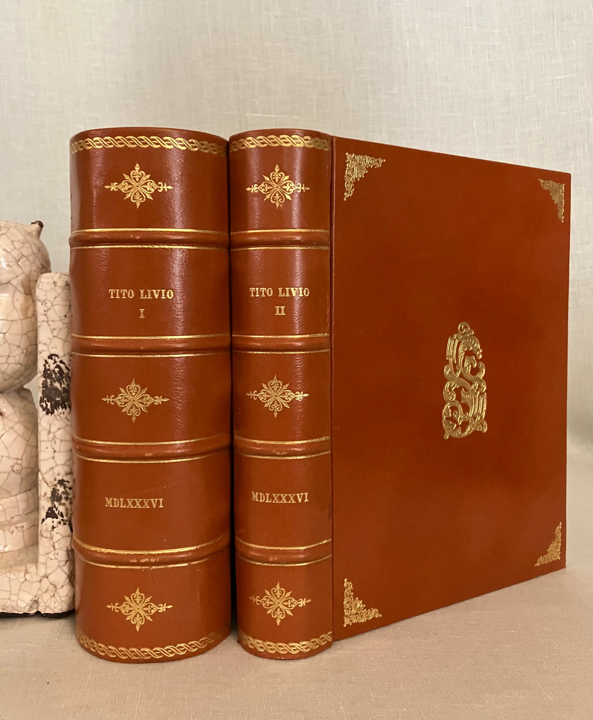 Hard cover, two volume set, (complete) 8vo., rebound in a twentieth-century case binding of full calf, new endpapers, with gold neoclassical cartouche tooled to center of front boards, similar triangular corner decorations, the rounded spine with four raised bands ruled in gilt, the head and tail rolled with a rope pattern, titles to 2nd and 4th compartments and others tooled with neoclassical motif. Renaissance Italian text.**CONDITION: Very Good antiquarian condition overall. Binding is fine and sound with a couple of very minor scuffs to boards. Text pages have remnants of light coloring at fore edges. Very faint tidemark to lower portion of text of both volumes, inviting speculation that an "acqua alta" event was perhaps in the book's Venetian past. Old marginal worm trail seen Volume II, affecting about 40 pp., not obscuring text.**THIS RARE 1586 BERNARDO GIUNTI restampo (largely a reprint) of Livy's "Decades", based on the 1581 Venice edition produced by Camillo Franceschini. Both of these editions revised Jacopo Nardi's 1540 translation of the original Latin into the still-developing Tuscan Italian vernacular, as printed first by the Giunti forebear Luc Antonio (LA) Giunti. Both the Franceschini and B. Giunti editions added extra features, such as the Index of years, facts and lists of Roman consuls and military tribunes etc., new wood carved and historiated capitals, revised side notes, and informative chapter summaries penned by humanist editor Curzio Marinelli. Using most of the 1581 typeset formes, then, this 1565 edition is minimally revised with a few new things: the Bernardo Giunti and brothers printer's device--the "Giunti Capello," or Doctor's hat--upon the title pages at the beginning of each volume, as well as a new 8-page dedication letter to Nicolò da Mula signed Bernardo Giunti . The restampo is also noted, on the final page of Vol. II, (p. 829) alongside the type specimen. **PROVENANCE: Original ownership inscriptions in renaissance hand to title pages of both volumes, in late sixteenth century Italian humanistic cursive. Vol. I : Left: "Ad uso di Luigi /Cini fiorentini/proprieta di" (For the use of Luigi Cini, Florentine. Property of the same.) Right side: "Ubaldi d' Sena d. Ca/Iud. curiae/S. Lucae (Ubaldi of Siena, Judge of the Court of Saint Lucia). Vol. II title inscription says: "Ad usum D. Lenatii" (for the use of Master Lenatii.) Right side: "Ubaldi d' Sena d. Ca." (Ubaldi of Siena).**AUTHOR TITUS LIVIUS (59 BC - 17 AD), better known as "Livy", was an important Roman historian. His magnum opus was "Ab Urbe Condita" ("From the Founding of the City") - telling the sweeping history of Rome from the city's semi-mythical founding in 753 BC, to the death of the general Drusus, in 9 AD (during the reign of the Emperor Augustus). The "Deche", or decades referred to in this and other editions identified the work as divided neatly into twelve packets, mainly groups of ten books, hence "decades." Livy came from a wealthy family in Padua and was well-connected in Augustus's Rome. In his writings, he was careful to praise the innovations brought about by the Emperor Augustus, and his patronage is thought to have helped establish Livy's fame. Not only was he widely read during the Roman Empire, but during the Renaissance there was a scramble to search out the manuscripts that would be pieced together to form what remains of Livy's History. Machiavelli wrote "Discourses on Livy" (c.1517) using the first ten chapters of Livy's "History of Rome" to illustrate how a city and a republic should be governed. Modern scholars praise the quality of Livy's Latin, ensuring their place in classical Latin curricula.**Florence-born TRANSLATOR JACOPO NARDI (1476-1563) spent much of his working life in Venice, having been banished from Florence by the Medicis after supporting the wrong side during the violence attending Dominican friar Savonarola's attack on the humanist values of the Florentine Republic (The original bonfires of the vanities were Savonarola's work, burning art and books by the Signoria.) **COLLATION: Complete. Note that leaves are numbered, not pages. VOL. I: +8, A-I8, K-T8, V8, X-Z8, Aa-Ii8, Kk-Tt8, Vv8, Xx-Zz8, Aaa-Iii8, Kkk-Ttt8, []2. Pages: [68], 1-522. Bottom corner of p.256 has chip missing not affecting text.-- p.393 has no page number, p.401 is misnumbered as 394. VOL. II: a-i8, k-u8, x-z8, aa-ii8, kk-pp8, qq4. Pages [] 524-829 [1].-- p.554 misnumbered as 552, p.555 misnumbered as 550, p.706 misnumbered as 606. Pages 574 and 784 have small pieces missing from bottom corner not affecting text. Page 699 has closed tear to fore-edge, as has p. 757 (which has been repaired). **REFS: EDIT16 CNCE 28516. B. Gamba da Bassano, Serie dei Testi di Lingua, (4th edit., 1839) No. 1479, p. 436. (Note). (AMJ and AJ)