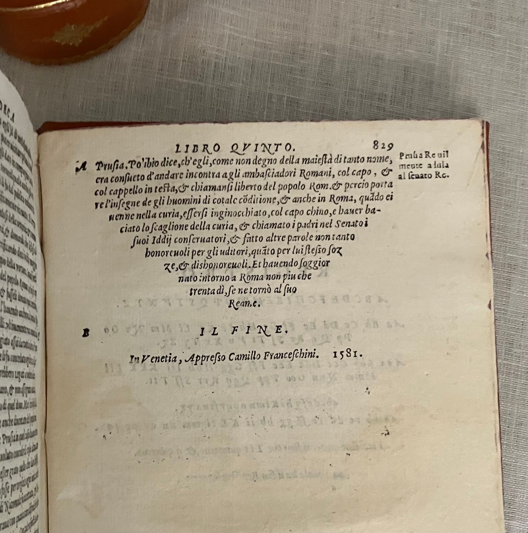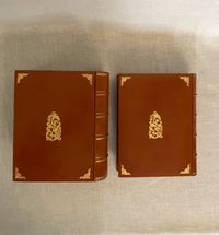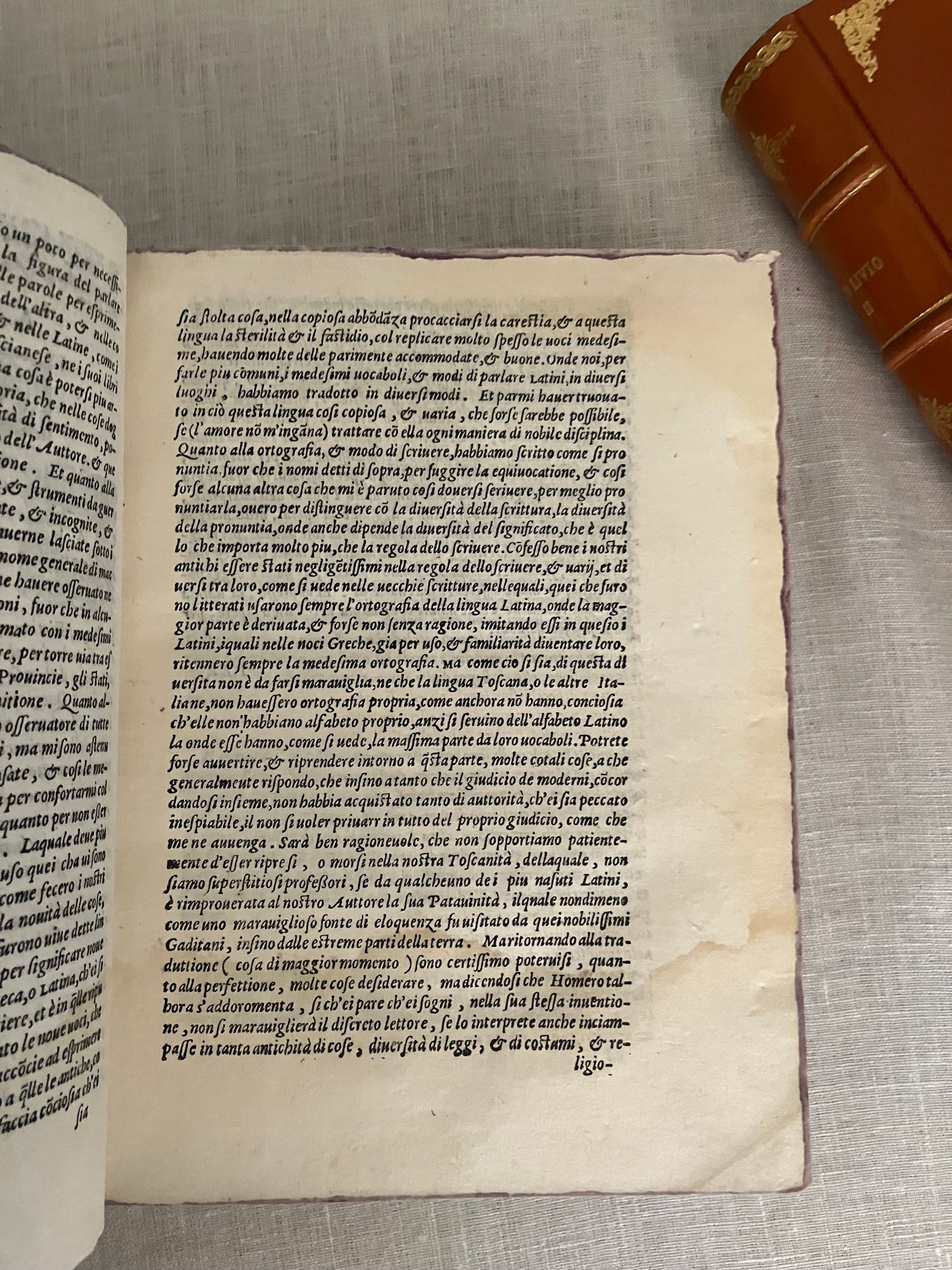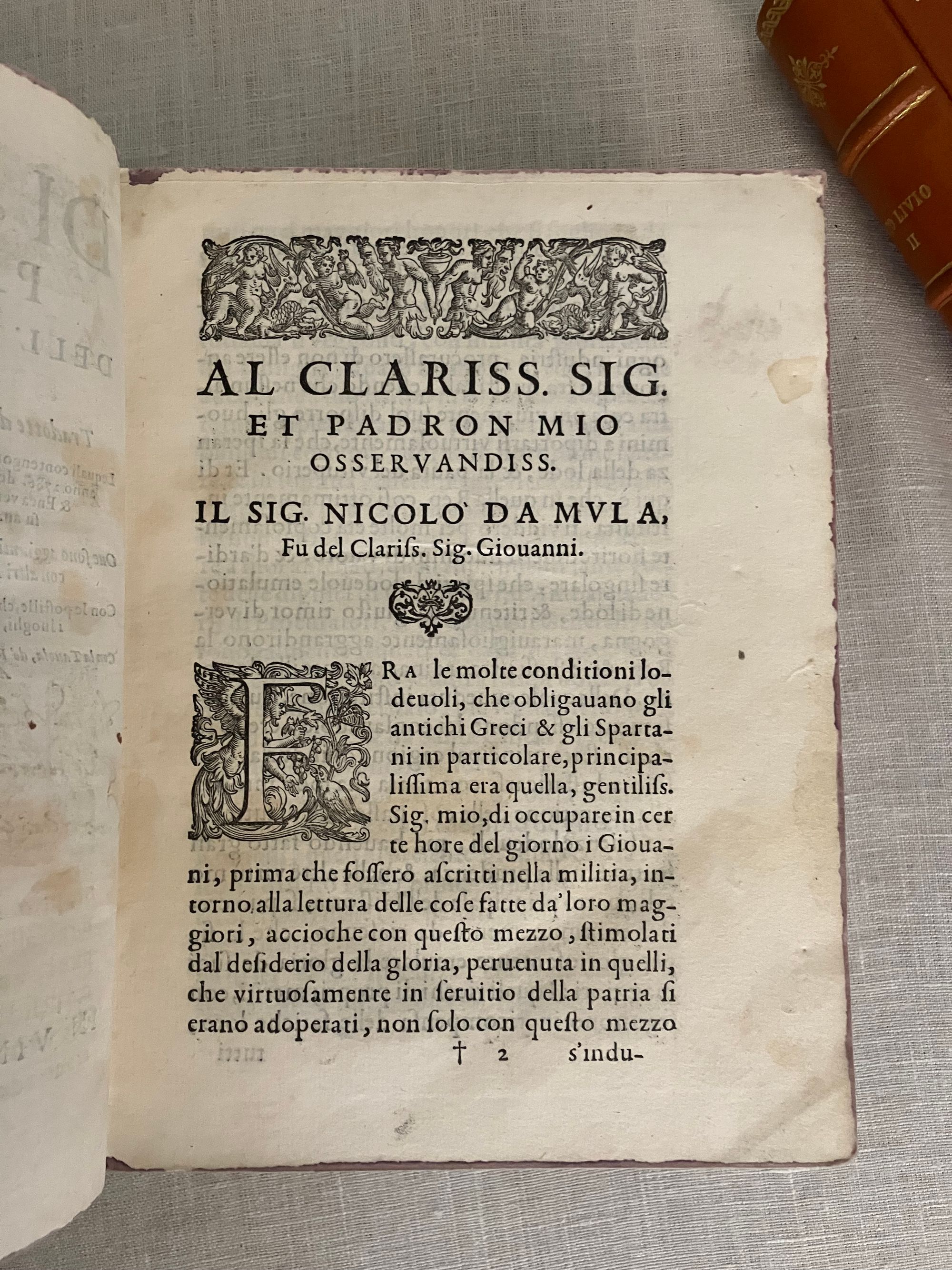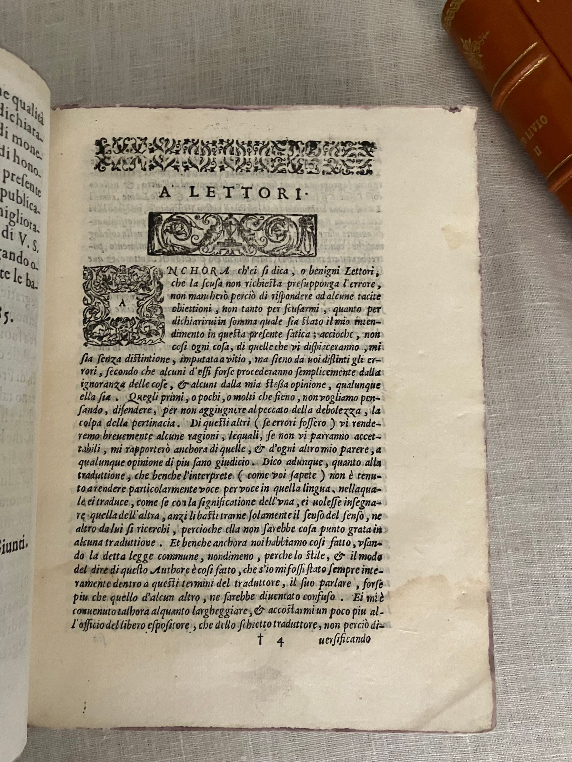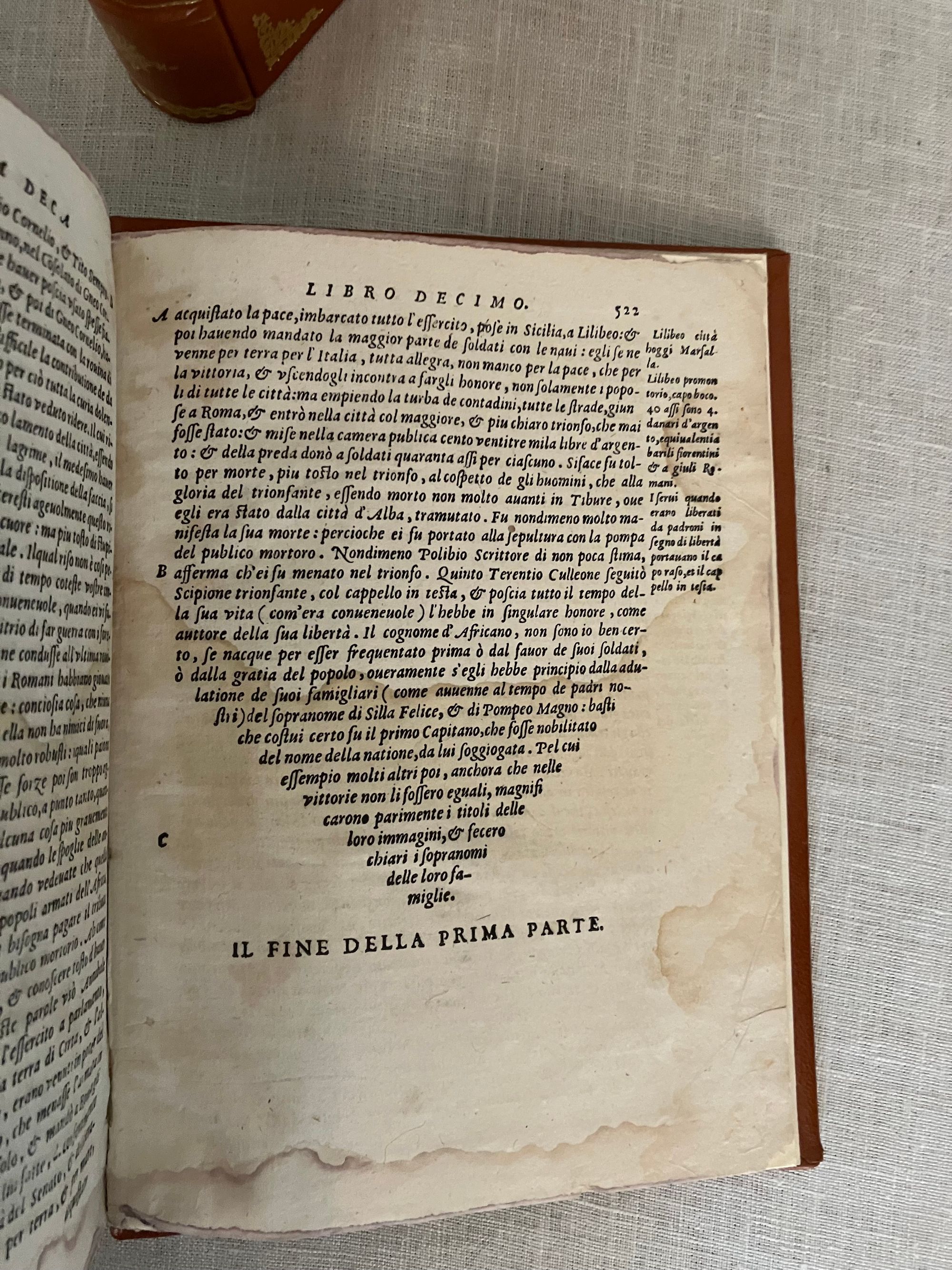Hard cover, two volume set, (complete) 8vo., rebound in a twentieth-century case binding of full calf, new endpapers, with gold neoclassical cartouche tooled to center of front boards, similar triangular corner decorations, the rounded spine with four raised bands ruled in gilt, the head and tail rolled with a rope pattern, titles to 2nd and 4th compartments and others tooled with neoclassical motif. Renaissance Italian text.**CONDITION: Very Good antiquarian condition overall. Binding is fine and sound with a couple of very minor scuffs to boards. Text pages have remnants of light coloring at fore edges. Very faint tidemark to lower portion of text of both volumes, inviting speculation that an "acqua alta" event was perhaps in the book's Venetian past. Old marginal worm trail seen Volume II, affecting about 40 pp., not obscuring text.**THIS RARE 1586 BERNARDO GIUNTI restampo (largely a reprint) of Livy's "Decades", based on the 1581 Venice edition produced by Camillo Franceschini. Both of these editions revised Jacopo Nardi's 1540 translation of the original Latin into the still-developing Tuscan Italian vernacular, as printed first by the Giunti forebear Luc Antonio (LA) Giunti. Both the Franceschini and B. Giunti editions added extra features, such as the Index of years, facts and lists of Roman consuls and military tribunes etc., new wood carved and historiated capitals, revised side notes, and informative chapter summaries penned by humanist editor Curzio Marinelli. Using most of the 1581 typeset formes, then, this 1565 edition is minimally revised with a few new things: the Bernardo Giunti and brothers printer's device--the "Giunti Capello," or Doctor's hat--upon the title pages at the beginning of each volume, as well as a new 8-page dedication letter to Nicolò da Mula signed Bernardo Giunti . The restampo is also noted, on the final page of Vol. II, (p. 829) alongside the type specimen. **PROVENANCE: Original ownership inscriptions in renaissance hand to title pages of both volumes, in late sixteenth century Italian humanistic cursive. Vol. I : Left: "Ad uso di Luigi /Cini fiorentini/proprieta di" (For the use of Luigi Cini, Florentine. Property of the same.) Right side: "Ubaldi d' Sena d. Ca/Iud. curiae/S. Lucae (Ubaldi of Siena, Judge of the Court of Saint Lucia). Vol. II title inscription says: "Ad usum D. Lenatii" (for the use of Master Lenatii.) Right side: "Ubaldi d' Sena d. Ca." (Ubaldi of Siena).**AUTHOR TITUS LIVIUS (59 BC - 17 AD), better known as "Livy", was an important Roman historian. His magnum opus was "Ab Urbe Condita" ("From the Founding of the City") - telling the sweeping history of Rome from the city's semi-mythical founding in 753 BC, to the death of the general Drusus, in 9 AD (during the reign of the Emperor Augustus). The "Deche", or decades referred to in this and other editions identified the work as divided neatly into twelve packets, mainly groups of ten books, hence "decades." Livy came from a wealthy family in Padua and was well-connected in Augustus's Rome. In his writings, he was careful to praise the innovations brought about by the Emperor Augustus, and his patronage is thought to have helped establish Livy's fame. Not only was he widely read during the Roman Empire, but during the Renaissance there was a scramble to search out the manuscripts that would be pieced together to form what remains of Livy's History. Machiavelli wrote "Discourses on Livy" (c.1517) using the first ten chapters of Livy's "History of Rome" to illustrate how a city and a republic should be governed. Modern scholars praise the quality of Livy's Latin, ensuring their place in classical Latin curricula.**Florence-born TRANSLATOR JACOPO NARDI (1476-1563) spent much of his working life in Venice, having been banished from Florence by the Medicis after supporting the wrong side during the violence attending Dominican friar Savonarola's attack on the humanist values of the Florentine Republic (The original bonfires of the vanities were Savonarola's work, burning art and books by the Signoria.) **COLLATION: Complete. Note that leaves are numbered, not pages. VOL. I: +8, A-I8, K-T8, V8, X-Z8, Aa-Ii8, Kk-Tt8, Vv8, Xx-Zz8, Aaa-Iii8, Kkk-Ttt8, []2. Pages: [68], 1-522. Bottom corner of p.256 has chip missing not affecting text.-- p.393 has no page number, p.401 is misnumbered as 394. VOL. II: a-i8, k-u8, x-z8, aa-ii8, kk-pp8, qq4. Pages [] 524-829 [1].-- p.554 misnumbered as 552, p.555 misnumbered as 550, p.706 misnumbered as 606. Pages 574 and 784 have small pieces missing from bottom corner not affecting text. Page 699 has closed tear to fore-edge, as has p. 757 (which has been repaired). **REFS: EDIT16 CNCE 28516. B. Gamba da Bassano, Serie dei Testi di Lingua, (4th edit., 1839) No. 1479, p. 436. (Note). (AMJ and AJ)