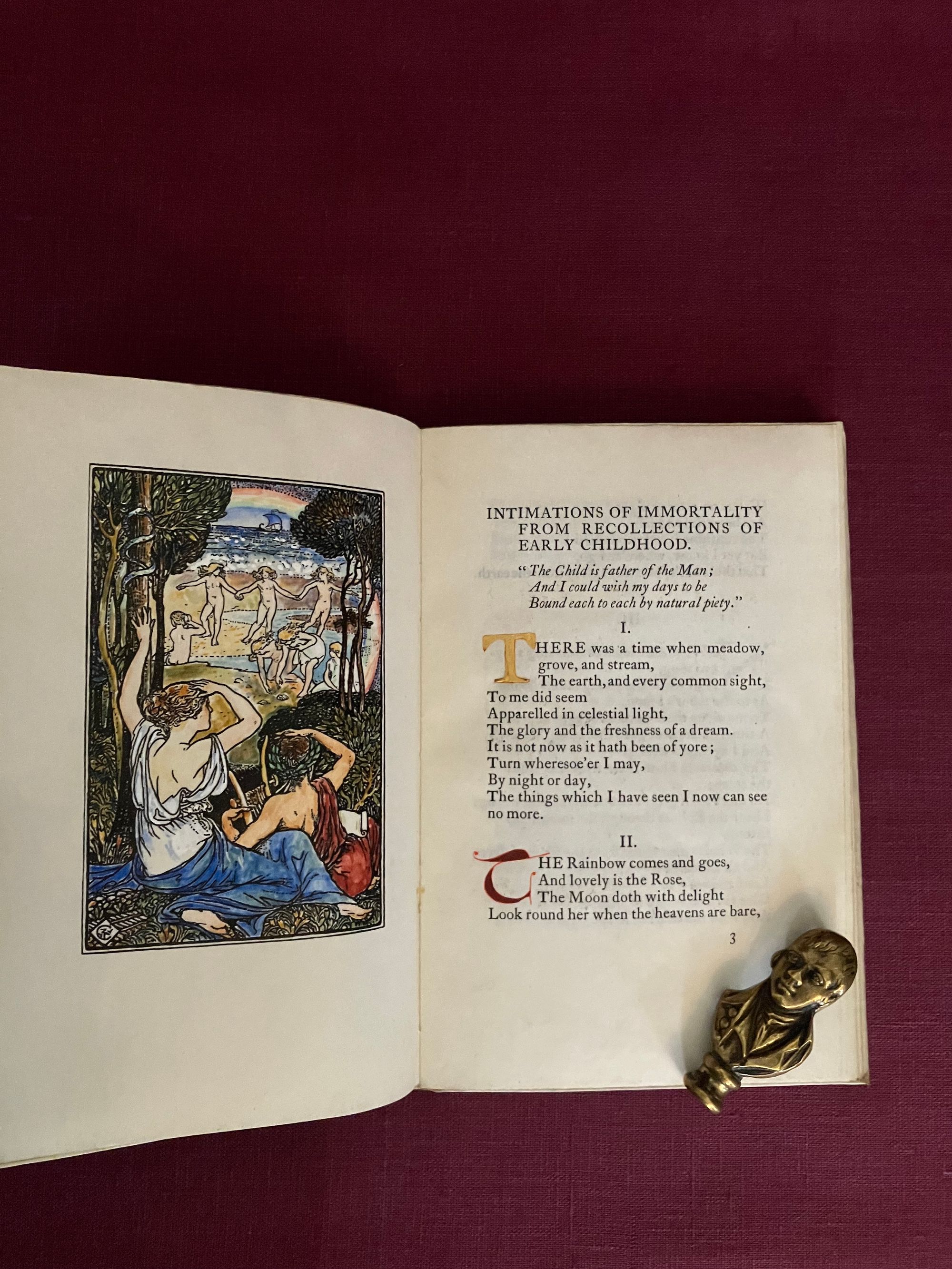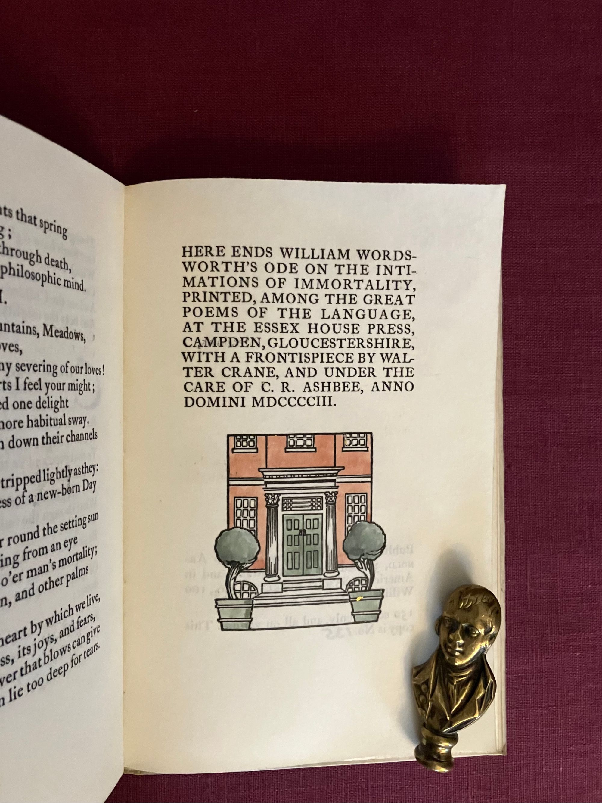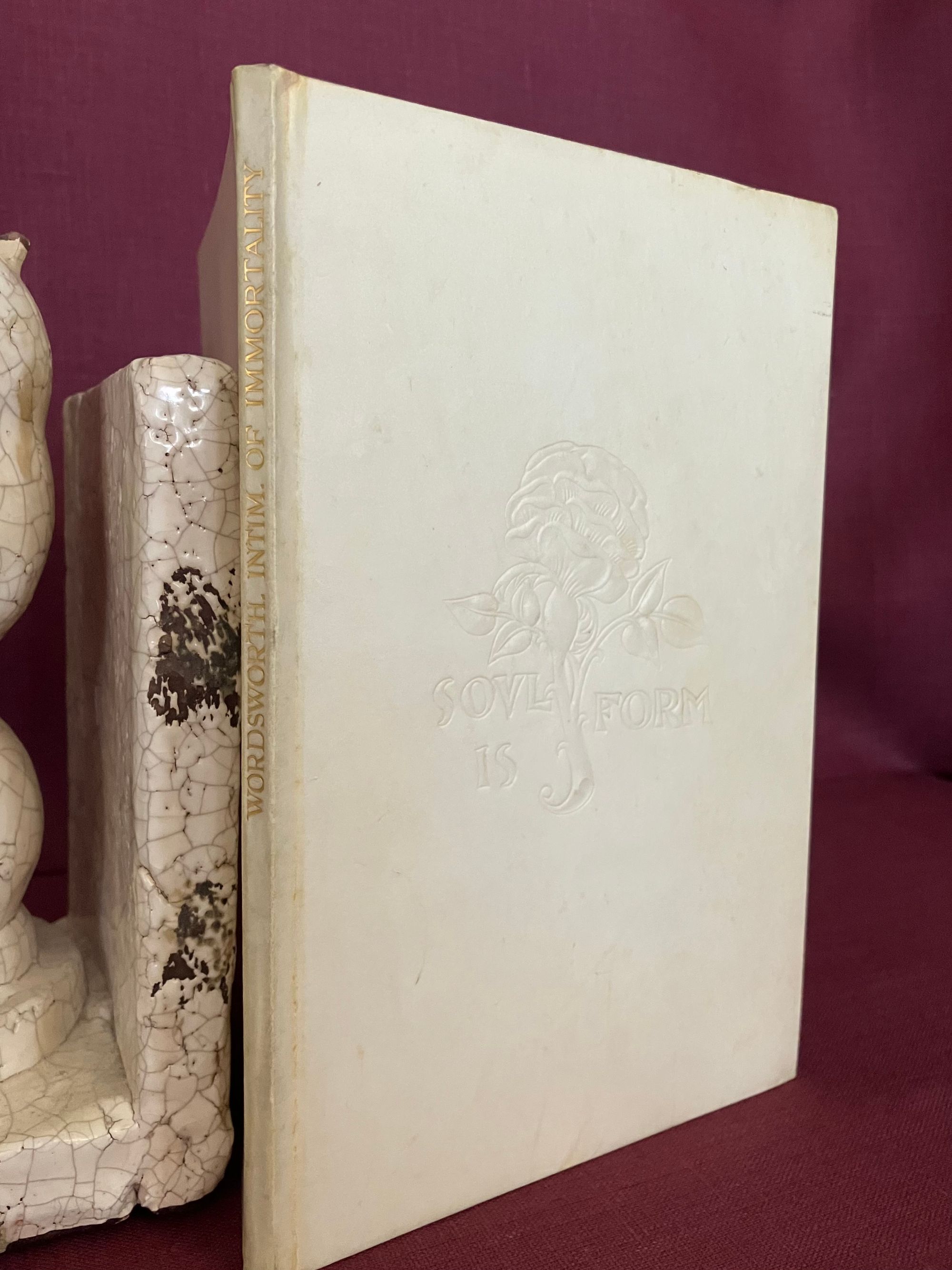 Hard cover, crown 8vo, finely bound in in full vellum, with vignette decoration of an Arts & Crafts style rose in blind to the front board, with a motto from Aristotle, "Soul is Form." Titles in gilt are tooled to the spine. Printed on vellum, this was a limited edition of 150 copies, numbered 135 on the limitation statement of the last leaf. 12 [14pp.] Within is the single poem of the title, as this series of 14 small books produced between 1900 and 1905 was designed. The frontispiece illustration is by the celebrated book illustrator, ceramicist and the founder of the British Arts & Crafts Exhibition Society, WALTER CRANE, with his signature monogram at lower left of the illustration. Gilding and hand-coloring of the frontispiece and initials, are attributed by Will Ransom to MISS ANASTATIA, or "STATIA" POWER, and consist of three hand painted gold initial capitals, one red, four blue, and three orange. The printer's colophon at rear features a drawing presumed to be of Woolstapler's Hall, the headquarters of the C.R. Ashbee's Guild of Handicraft in Sheep Street, Chipping Campden in the English Cotswolds from about 1902. The building entrance, flanked by topiary in pots (also hand-colored) matches a photograph seen in A. Crawford, p.109) Colophon text reads: " Here ends William Wordsworth's Ode on the Intimations of Immortality, Printed, Among the Great Poems of the Language, at the Essex House Press, Campden, Gloucestershire, with a Frontispiece by Walter Crane, and Under the Care of C.R. Ashbee, Anno Domini MDCCCCIII." **CONDITION: Near Fine. A few light marks and a bit of soiling to exterior boards, as seen in photos. Front end papers only are lightly foxed, but the rest of text pages, and rear endpapers, are pristine. Nice, clean hand stitched detail. Some of the hand-painted initial capitals slightly show through the translucency of the vellum, as would be expected.**CONTENTS: WILLIAM WORDSWORTH's great poem of the Romantic era needs, perhaps, no introduction. Beginning with the lines "Our birth is but an sleep and a forgetting," the Ode was written in two parts, with the initial stanzas about the innocent joys and connection with nature seen in childhood enabled by a pre-existing "memory of the divine." This part was completed in 1804. After consultation with S. T. Coleridge, additional stanzas were added addressing the adult memory of the divine which enables us to have empathy for others. The first book version was published in 1807 as part of Wordsworth's "Poems in Two Volumes" of that year. (A later revision of the poem came in 1815.) **The Colorist, Miss ANASTATIA, or "STATIA" POWER is documented as joining the Chipping Campden location's Guild of Handicraft in 1902, where she ESTABLISHED THE GUILD's BOOK BINDERY (Crawford, p. 113) The binding does not bear a signature on the rear turn in, however, so we are not claiming it to have been personally bound by her. Power had been part of an early wave of women (circa 1898) included in vocational training by a master of the book binding craft, Douglas Cockerell, (himself once the pupil of Thomas Cobden-Sanderson.) This tutorial heritage is important, according to critic M. Tidcombe, because the basic bookbinding techniques she learned were "according to Arts & Crafts principles which demanded not only high quality materials but the soundest of techniques." (p. 129) The dedication to sound technique was not said to have been the case at her next employer, Frank Karslake, whose enterprises, the Guild of Women Binders, and the Hampstead Bindery, eventually went bankrupt by 1903. It was there, however, where where Miss Power, under the tutelage of Martha Karslake, may have been taught the skills of painting on vellum and the illumination of vellum seen, as seen in this present work. (Tidcombe, p. 126). Much of the legacy of Anastasia Power is seen through her (signed) artistic bookbinding designs, which were lovely, elaborately gilt affairs usually featuring Tudor roses and other foliate stamps, sometimes with contrasting colored onlaid morocco circles within ruled geometric borders, several of which we have sold in the past. The overall effect of THIS lovely volume, however, is of a medieval manuscript, which aside from the printed text, would have been produced with many of the similar materials with vibrantly hued hand-colored decoration. The reference to the medieval was not by chance, as many artists and designers and "Romantic Socialists" of the British Arts and Crafts period looked upon this time as one in which the dignity of labor by hand was to be revalued. REFS: W. Ransom, "Private Presses," Essex House Press list No. 34, p. 267 (1929) lists "Miss Power" as colorist. A. Crawford, "C.R. Ashbee, Architect, Designer & Romantic Socialist " (Yale University Press, New Haven and London, 1985). M. Tidcome, Women Bookbinders in Britain 1880-1920, (Oak Knoll, British Library, 1996). (AMJ)