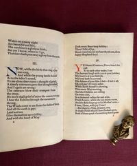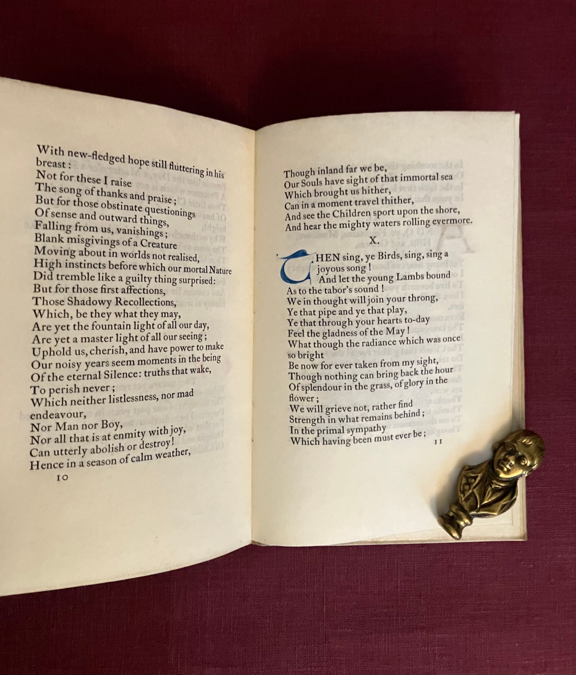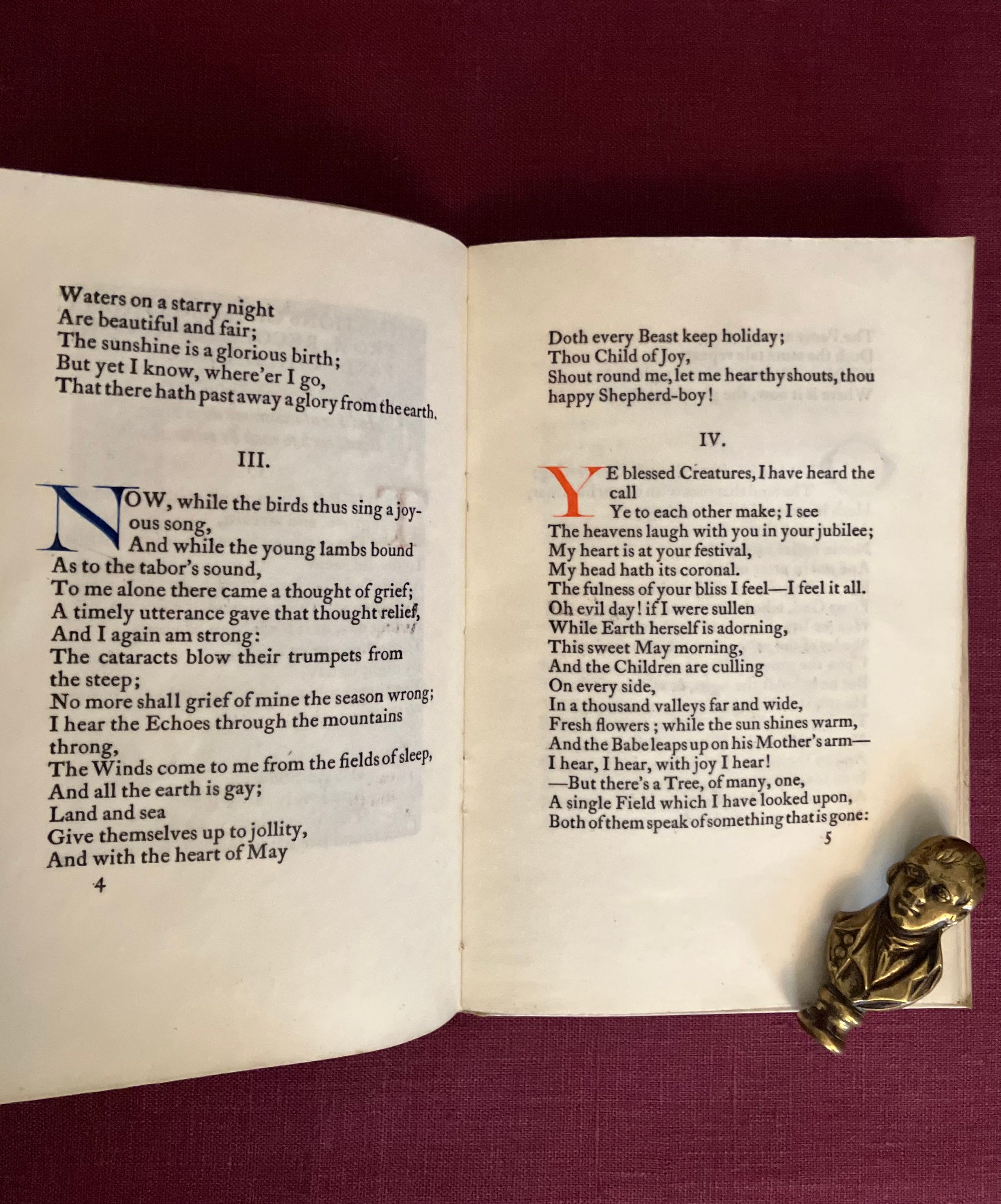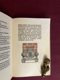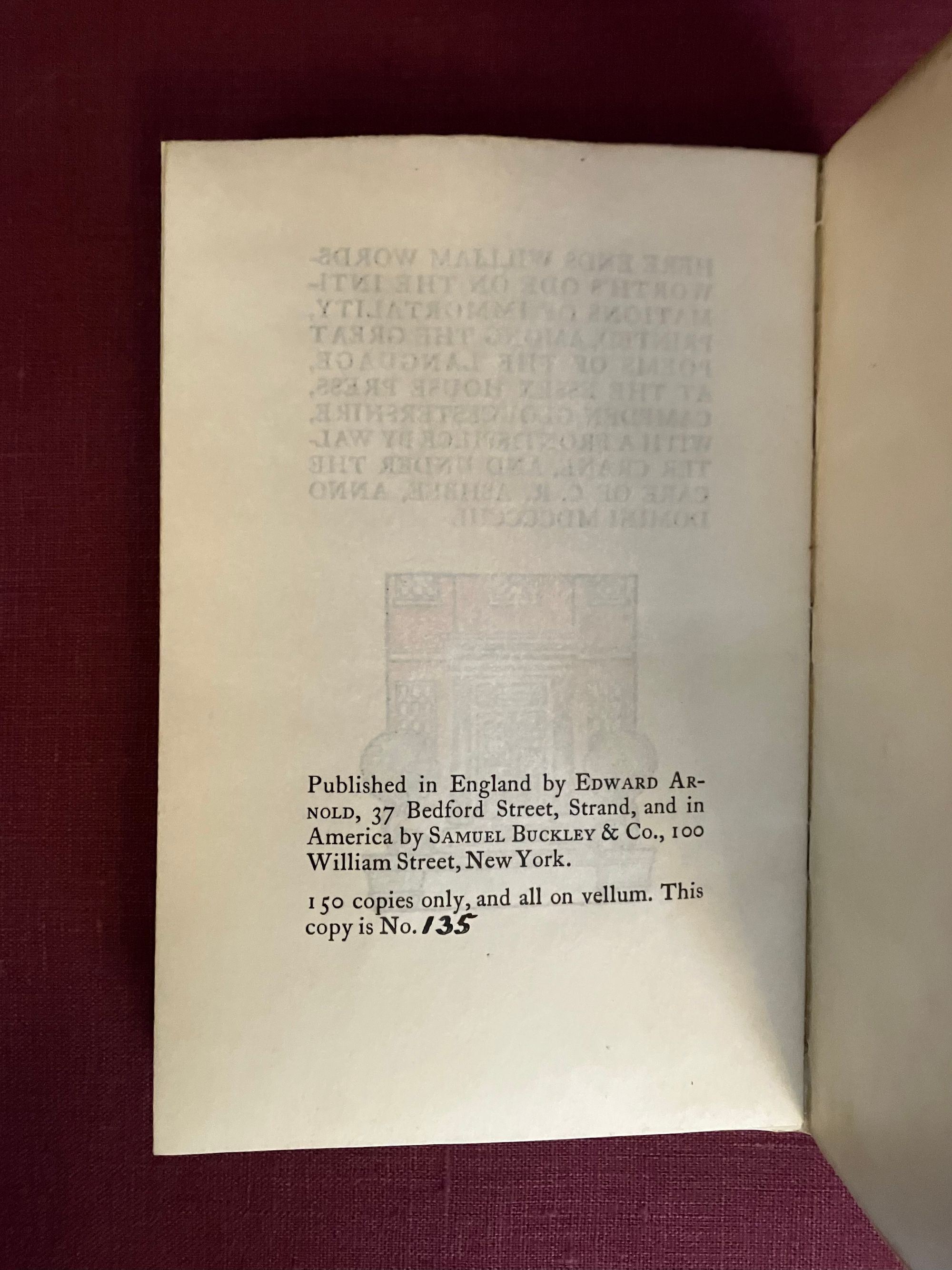 Hard cover, crown 8vo, finely bound in in full vellum, with vignette decoration of an Arts & Crafts style rose in blind to the front board, with a motto from Aristotle, "Soul is Form." Titles in gilt are tooled to the spine. Printed on vellum, this was a limited edition of 150 copies, numbered 135 on the limitation statement of the last leaf. 12 [14pp.] Within is the single poem of the title, as this series of 14 small books produced between 1900 and 1905 was designed. The frontispiece illustration is by the celebrated book illustrator, ceramicist and the founder of the British Arts & Crafts Exhibition Society, WALTER CRANE, with his signature monogram at lower left of the illustration. Gilding and hand-coloring of the frontispiece and initials, are attributed by Will Ransom to MISS ANASTATIA, or "STATIA" POWER, and consist of three hand painted gold initial capitals, one red, four blue, and three orange. The printer's colophon at rear features a drawing presumed to be of Woolstapler's Hall, the headquarters of the C.R. Ashbee's Guild of Handicraft in Sheep Street, Chipping Campden in the English Cotswolds from about 1902. The building entrance, flanked by topiary in pots (also hand-colored) matches a photograph seen in A. Crawford, p.109) Colophon text reads: " Here ends William Wordsworth's Ode on the Intimations of Immortality, Printed, Among the Great Poems of the Language, at the Essex House Press, Campden, Gloucestershire, with a Frontispiece by Walter Crane, and Under the Care of C.R. Ashbee, Anno Domini MDCCCCIII." **CONDITION: Near Fine. A few light marks and a bit of soiling to exterior boards, as seen in photos. Front end papers only are lightly foxed, but the rest of text pages, and rear endpapers, are pristine. Nice, clean hand stitched detail. Some of the hand-painted initial capitals slightly show through the translucency of the vellum, as would be expected.**CONTENTS: WILLIAM WORDSWORTH's great poem of the Romantic era needs, perhaps, no introduction. Beginning with the lines "Our birth is but an sleep and a forgetting," the Ode was written in two parts, with the initial stanzas about the innocent joys and connection with nature seen in childhood enabled by a pre-existing "memory of the divine." This part was completed in 1804. After consultation with S. T. Coleridge, additional stanzas were added addressing the adult memory of the divine which enables us to have empathy for others. The first book version was published in 1807 as part of Wordsworth's "Poems in Two Volumes" of that year. (A later revision of the poem came in 1815.) **The Colorist, Miss ANASTATIA, or "STATIA" POWER is documented as joining the Chipping Campden location's Guild of Handicraft in 1902, where she ESTABLISHED THE GUILD's BOOK BINDERY (Crawford, p. 113) The binding does not bear a signature on the rear turn in, however, so we are not claiming it to have been personally bound by her. Power had been part of an early wave of women (circa 1898) included in vocational training by a master of the book binding craft, Douglas Cockerell, (himself once the pupil of Thomas Cobden-Sanderson.) This tutorial heritage is important, according to critic M. Tidcombe, because the basic bookbinding techniques she learned were "according to Arts & Crafts principles which demanded not only high quality materials but the soundest of techniques." (p. 129) The dedication to sound technique was not said to have been the case at her next employer, Frank Karslake, whose enterprises, the Guild of Women Binders, and the Hampstead Bindery, eventually went bankrupt by 1903. It was there, however, where where Miss Power, under the tutelage of Martha Karslake, may have been taught the skills of painting on vellum and the illumination of vellum seen, as seen in this present work. (Tidcombe, p. 126). Much of the legacy of Anastasia Power is seen through her (signed) artistic bookbinding designs, which were lovely, elaborately gilt affairs usually featuring Tudor roses and other foliate stamps, sometimes with contrasting colored onlaid morocco circles within ruled geometric borders, several of which we have sold in the past. The overall effect of THIS lovely volume, however, is of a medieval manuscript, which aside from the printed text, would have been produced with many of the similar materials with vibrantly hued hand-colored decoration. The reference to the medieval was not by chance, as many artists and designers and "Romantic Socialists" of the British Arts and Crafts period looked upon this time as one in which the dignity of labor by hand was to be revalued. REFS: W. Ransom, "Private Presses," Essex House Press list No. 34, p. 267 (1929) lists "Miss Power" as colorist. A. Crawford, "C.R. Ashbee, Architect, Designer & Romantic Socialist " (Yale University Press, New Haven and London, 1985). M. Tidcome, Women Bookbinders in Britain 1880-1920, (Oak Knoll, British Library, 1996). (AMJ)