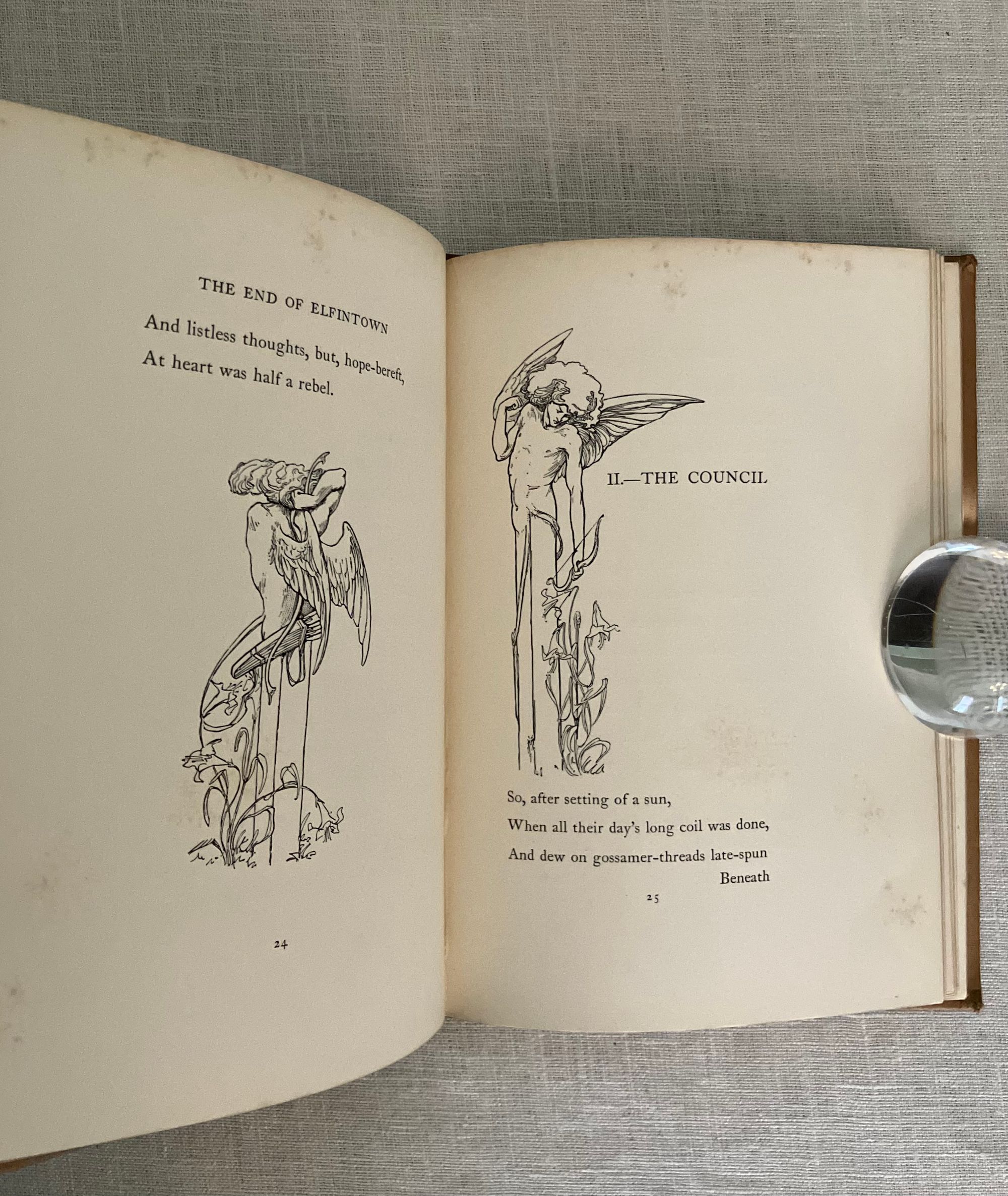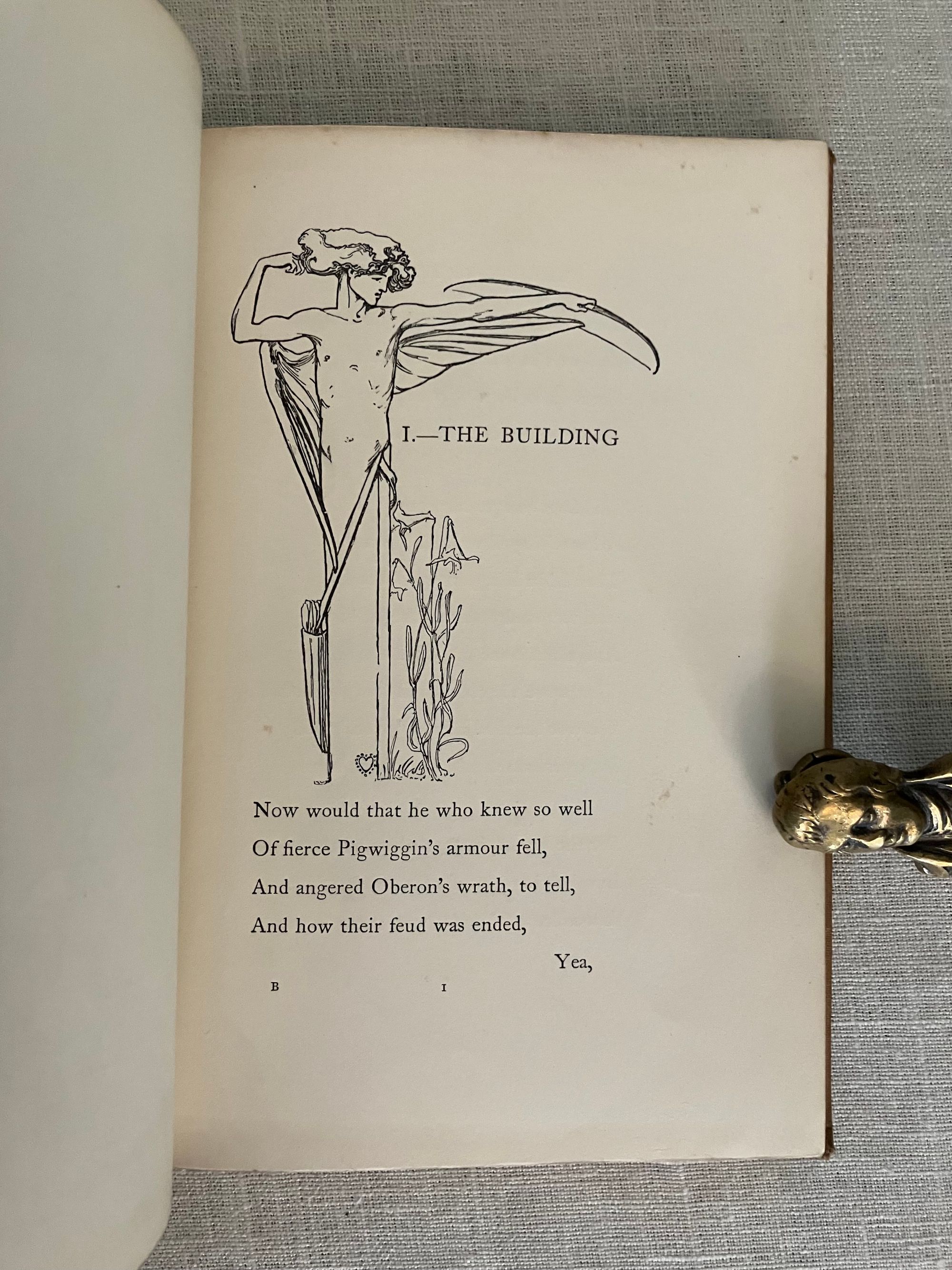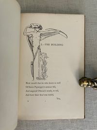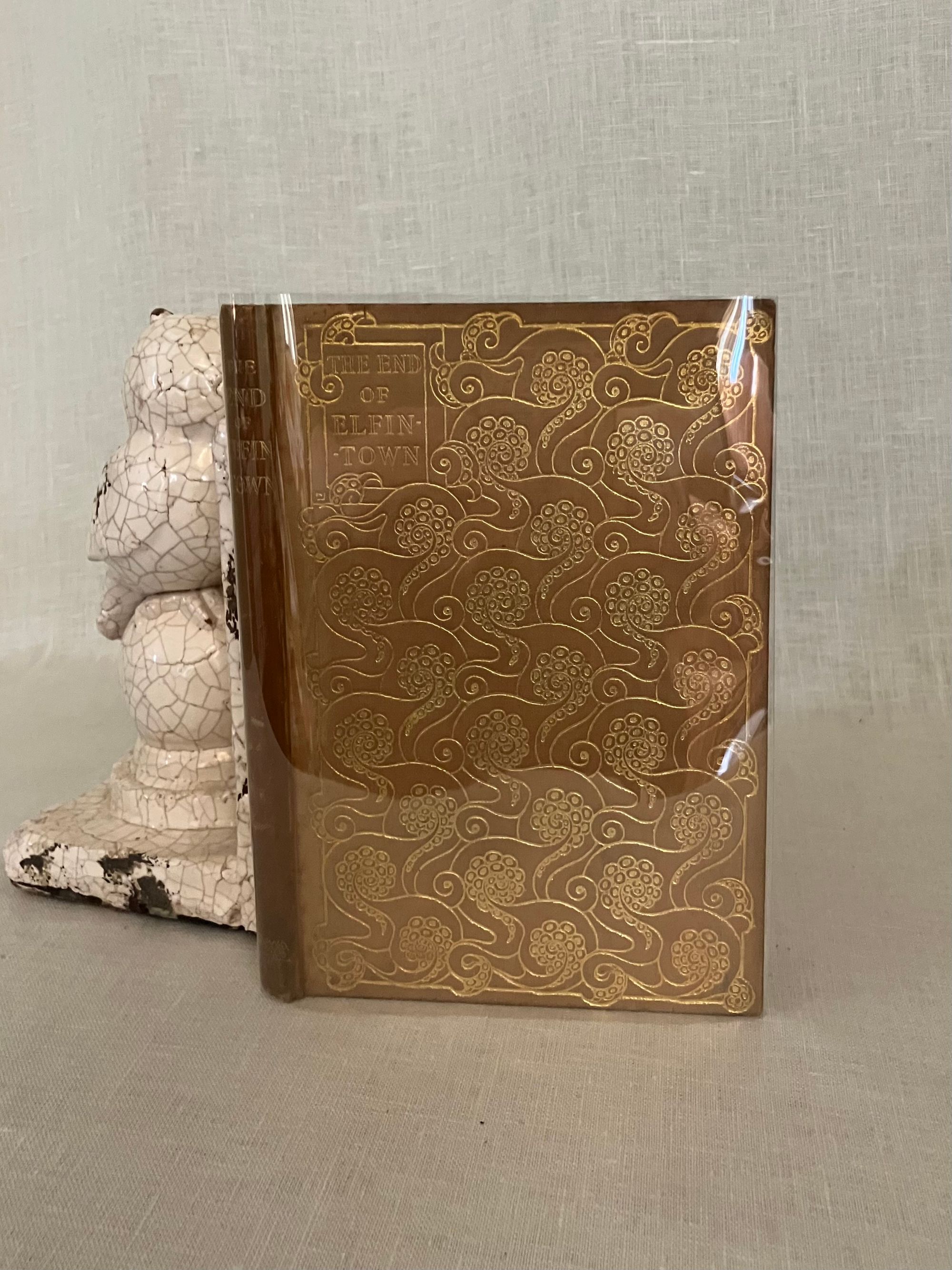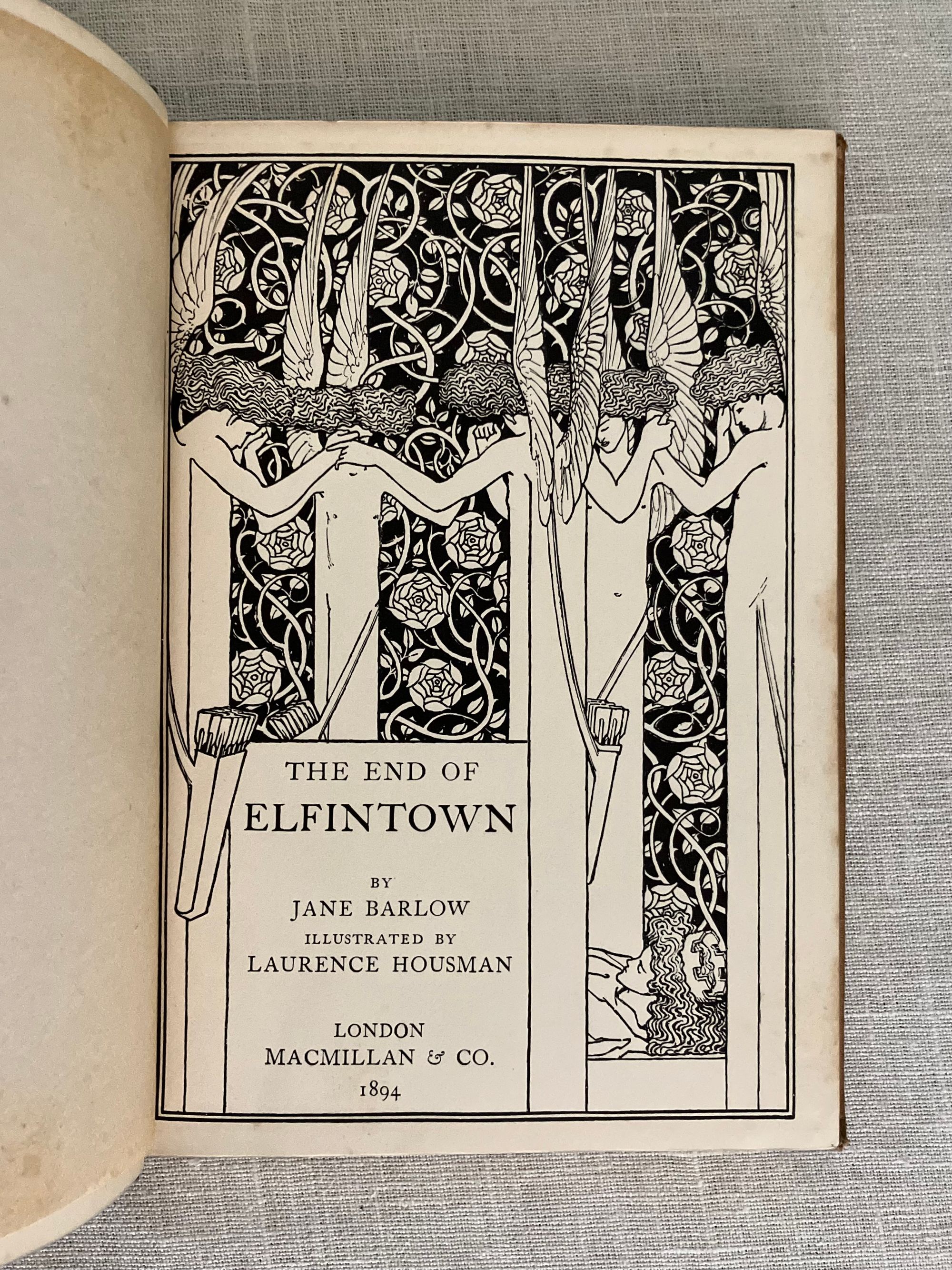 Hard cover, 8vo, blocked in sinuous octopus-like gilt pattern upon buff colored publisher's cloth with titles within a double ruled frame of gold to upper right of the design and with the cover design signed "LH" near title. Cover design spans both boards, with title in gold to spine. All edges gilt. Cream endpapers. Illustrated title page by Housman in a British Art Nouveau style with attenuated figures of fairies hovering over a sleeping prince, upon a field of Tudor roses. 8 full page and 6 chapter header or footer decorations. Printed by R. & R. Clark, Edinburgh, with their colophon rear page. [4, w. half title, blank, title, blank], 77, [78], [2]pp. CONDITION: Overall, at least Very Good Plus. Spine is darkened and with some moderate scuff marks. Boards are clean, with some light marks of manufacturing glue soak-through perhaps at the front joint. Tips are crisp. Head and tail of spine have light rubbing. Gilt remains bright. Light foxing to front and rear flies, and to some page margins (in the area near gilding.) Book over-opened in one place (p. 49). **Irish Author JANE BARLOW (1857-1917) creates a socialist fable in verse about worker-fairies being mistreated by the rather despotic King Oberon in construction of his masterpiece of modern fairy-world construction, Elfintown, (built with natural materials such as flower-stem plumbing) but also subject to the continual destructive powers of rain and wind. Strike actions and negotiations ensue. Notes of Jonathan Swift social satire might be found.**The intriguing black and white pen and ink illustrations (and cover design) of the LAURENCE HOUSMAN (1865 -1959) make this a very special book. Known latterly as primarily an author playwright and social reformer, Housman began his career in art, trained at the Lambeth School of Art and Royal College of Art in London. This work adopts an art nouveau style which pays some homage perhaps to the work of Aubrey Beardsley or Jessie M. King. It has been noted that his artistic output only spanned about ten years, after which he focused solely on his writing. His friendship and financial support of contemporary Oscar Wilde through the latter's legal troubles of the 1890's was noted in his autobiography: "... what I admired most was the quiet uncomplaining courage with which he accepted an ostracism against which, in his lifetime, there could be no appeal." (L. Housman, "The Unexpected Years," London: Jonathan Cape, 1936.) This compassion extended to other causes including feminism, women's suffrage, gay rights and secular humanism, all causes to which he actively organised. Barton: Watson, 1908, J. Sutherland, (1989), p. 44, 308. (AMJ)