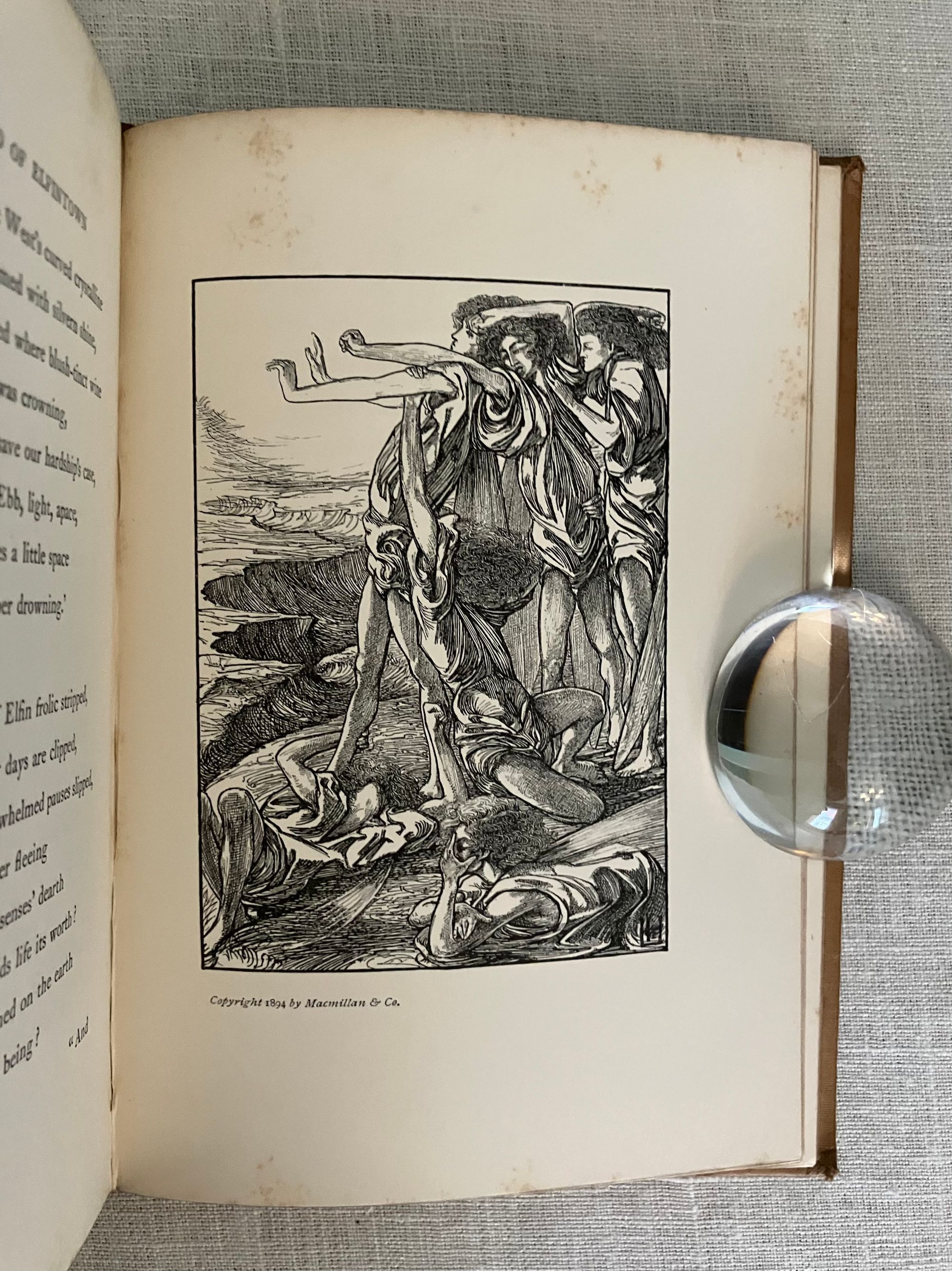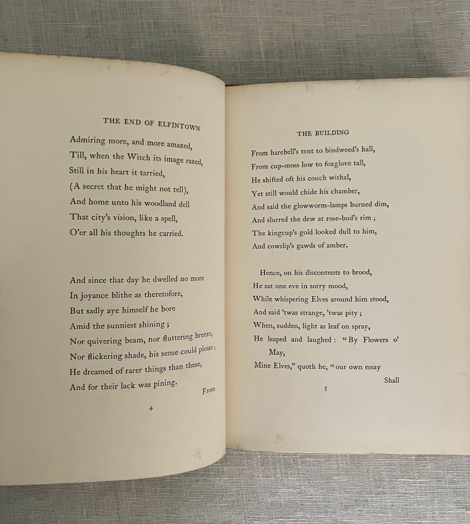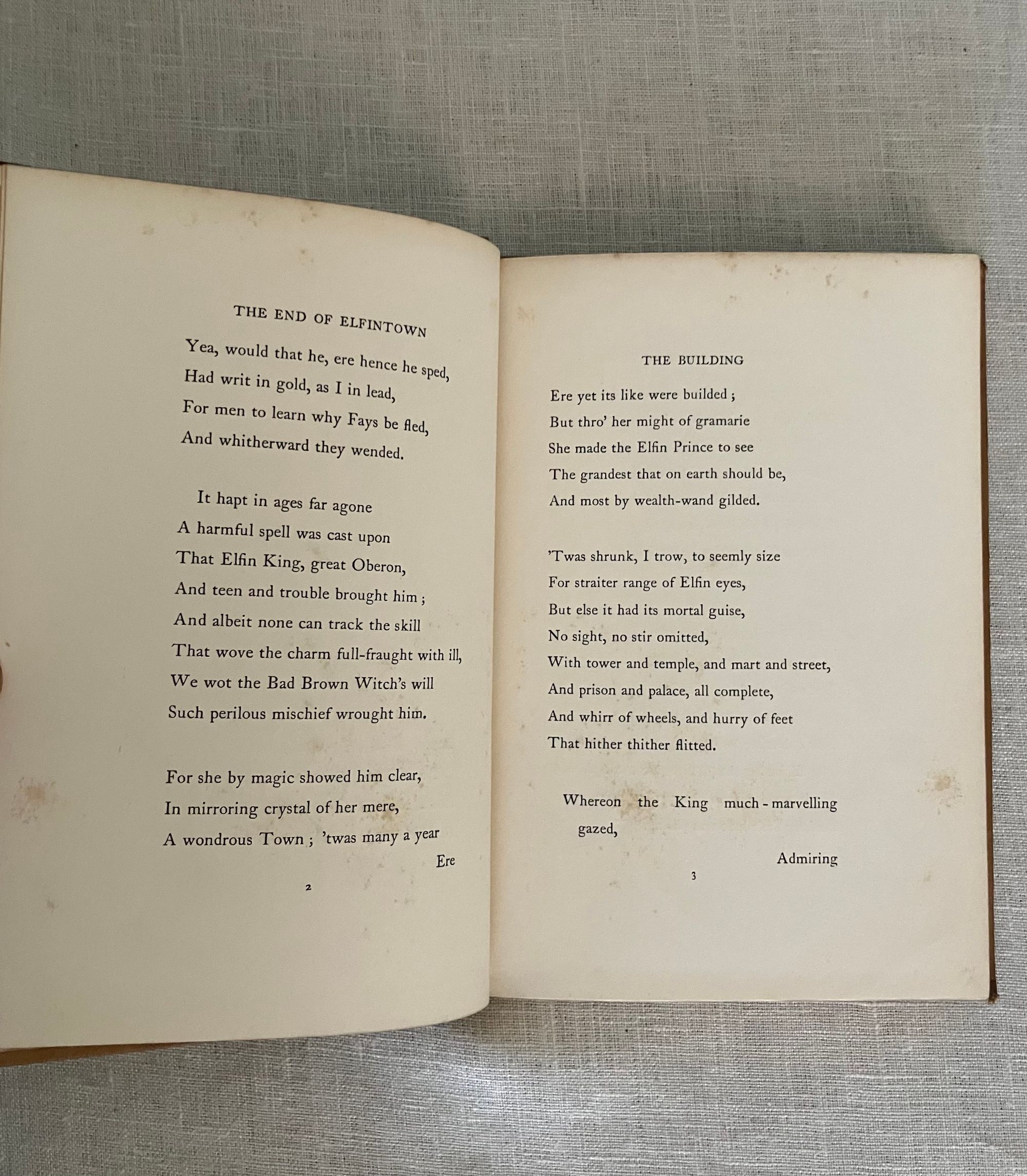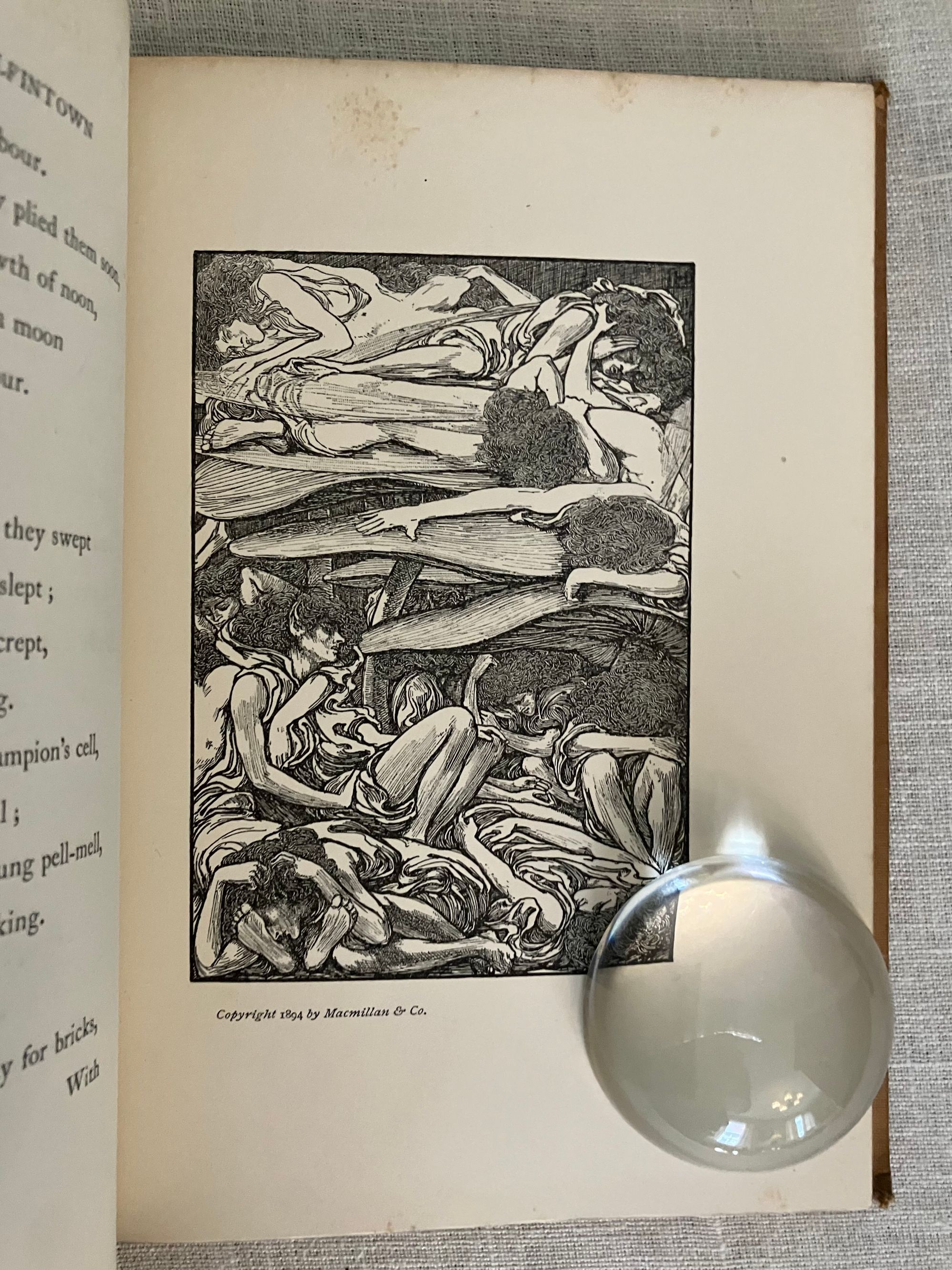 Hard cover, 8vo, blocked in sinuous octopus-like gilt pattern upon buff colored publisher's cloth with titles within a double ruled frame of gold to upper right of the design and with the cover design signed "LH" near title. Cover design spans both boards, with title in gold to spine. All edges gilt. Cream endpapers. Illustrated title page by Housman in a British Art Nouveau style with attenuated figures of fairies hovering over a sleeping prince, upon a field of Tudor roses. 8 full page and 6 chapter header or footer decorations. Printed by R. & R. Clark, Edinburgh, with their colophon rear page. [4, w. half title, blank, title, blank], 77, [78], [2]pp. CONDITION: Overall, at least Very Good Plus. Spine is darkened and with some moderate scuff marks. Boards are clean, with some light marks of manufacturing glue soak-through perhaps at the front joint. Tips are crisp. Head and tail of spine have light rubbing. Gilt remains bright. Light foxing to front and rear flies, and to some page margins (in the area near gilding.) Book over-opened in one place (p. 49). **Irish Author JANE BARLOW (1857-1917) creates a socialist fable in verse about worker-fairies being mistreated by the rather despotic King Oberon in construction of his masterpiece of modern fairy-world construction, Elfintown, (built with natural materials such as flower-stem plumbing) but also subject to the continual destructive powers of rain and wind. Strike actions and negotiations ensue. Notes of Jonathan Swift social satire might be found.**The intriguing black and white pen and ink illustrations (and cover design) of the LAURENCE HOUSMAN (1865 -1959) make this a very special book. Known latterly as primarily an author playwright and social reformer, Housman began his career in art, trained at the Lambeth School of Art and Royal College of Art in London. This work adopts an art nouveau style which pays some homage perhaps to the work of Aubrey Beardsley or Jessie M. King. It has been noted that his artistic output only spanned about ten years, after which he focused solely on his writing. His friendship and financial support of contemporary Oscar Wilde through the latter's legal troubles of the 1890's was noted in his autobiography: "... what I admired most was the quiet uncomplaining courage with which he accepted an ostracism against which, in his lifetime, there could be no appeal." (L. Housman, "The Unexpected Years," London: Jonathan Cape, 1936.) This compassion extended to other causes including feminism, women's suffrage, gay rights and secular humanism, all causes to which he actively organised. Barton: Watson, 1908, J. Sutherland, (1989), p. 44, 308. (AMJ)