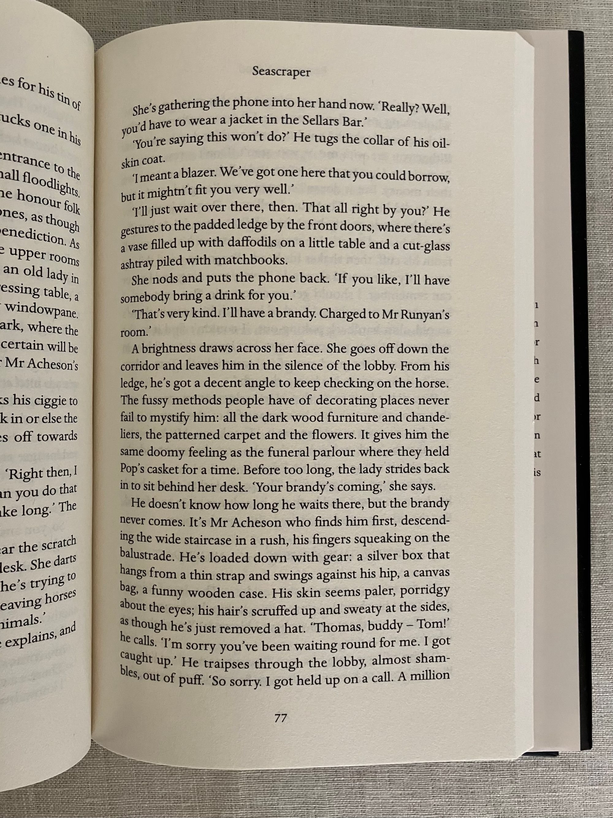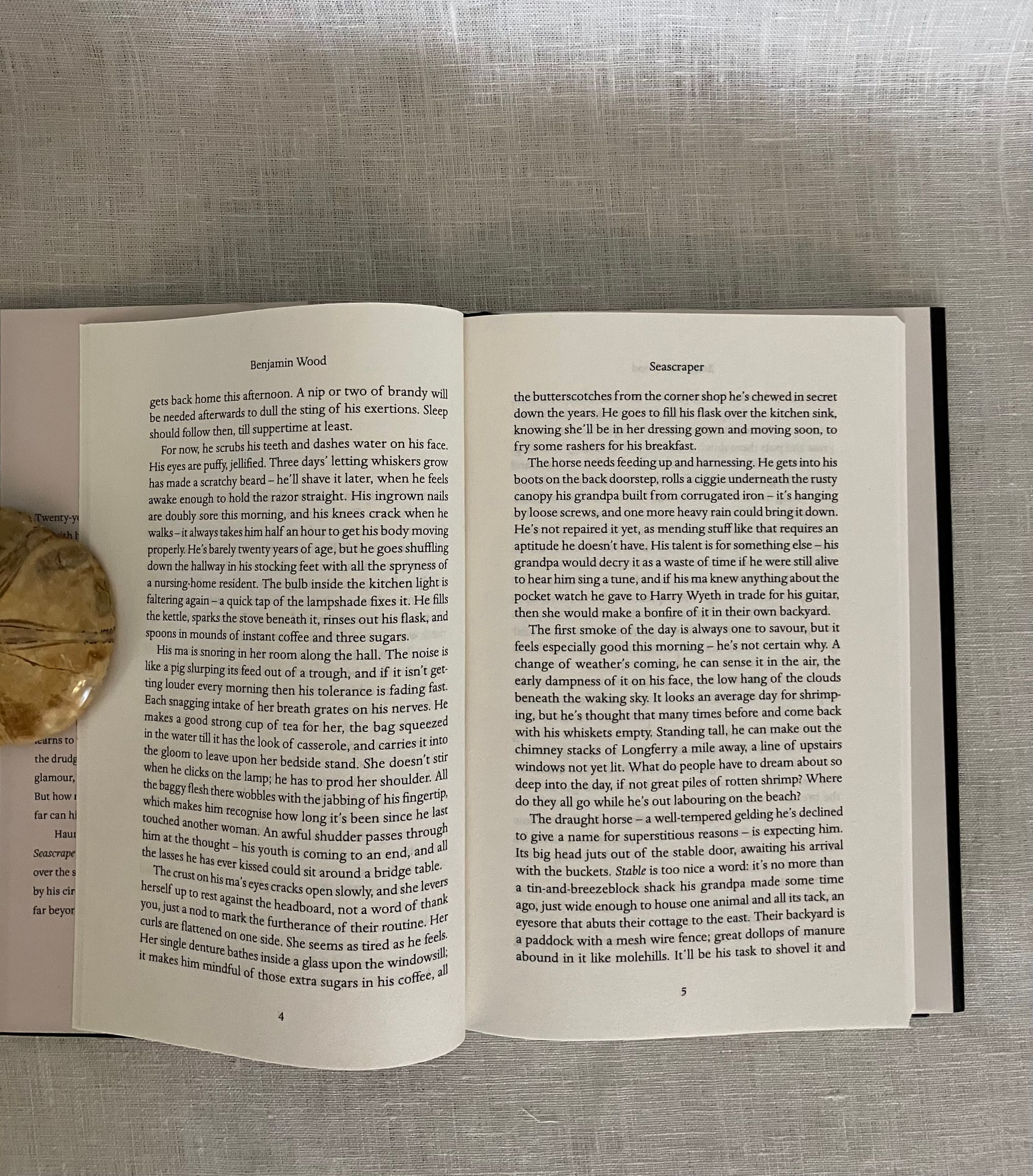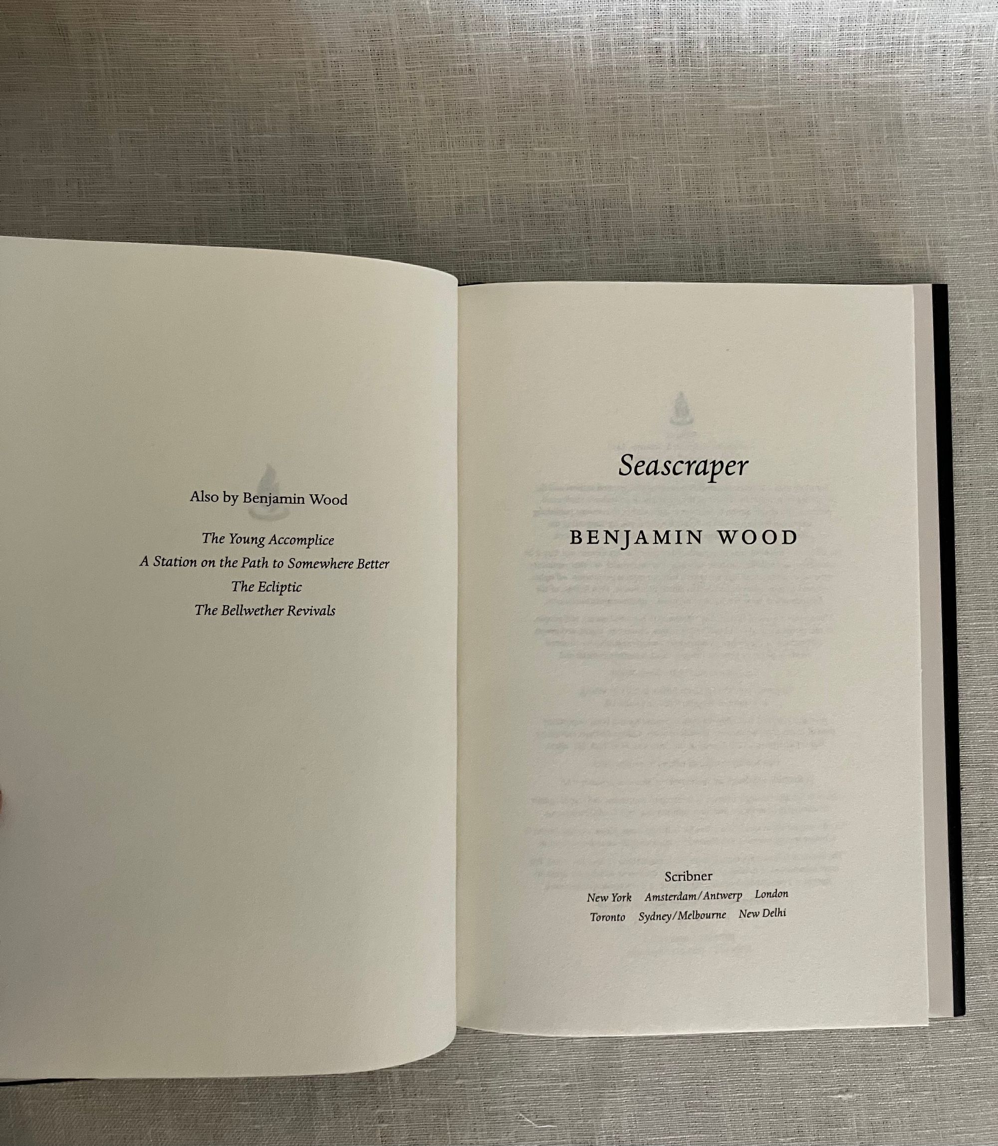 Hard cover, 8vo, in black paper covered boards, with gold titles to spine, in the original, unclipped pictorial dust jacket, 163pp. CONDITION: Fine, like new, in a Fine dust jacket, now in a mylar protector. "Twenty year old Thomas Flett lives a slow, deliberate life with his mother in Longferry, northern England, working his grandpa's trade as a shanker. He rises early to take his horse and cart to the drizzly shore to scrape for shrimp and spends the afternoon selling his wares, trying to wash away the salt and sea scum, pining for his neighbor Joan Wyeth, and playing songs on his guitar. At heart he is a folk musician, but this remains a private dream. Then a mysterious American arrives in town and enlists Thomas's help in finding a perfect location for his next movie..." "Haunting, timeless and stunningly atmospheric, Seascraper tells the story of a quiet existence upturned over the span of one day and a young man hemmed in by his circumstances, striving to achieve fulfillment far beyond the world he knows..." (blurb). **Merseyside Novelist Benjamin Wood (b. 1981) has written five previous award-winning novels. This title was long-listed for Britain's 2025 Booker Prize. ISBN 978 1-6682-3171-5. (AMJ)