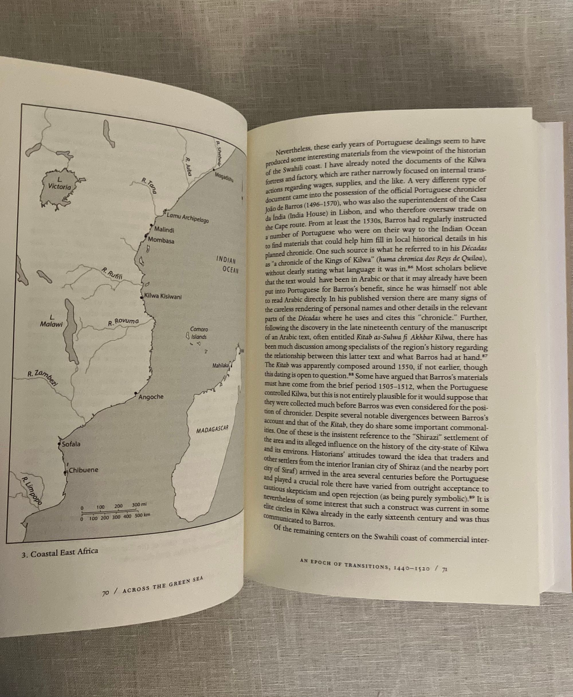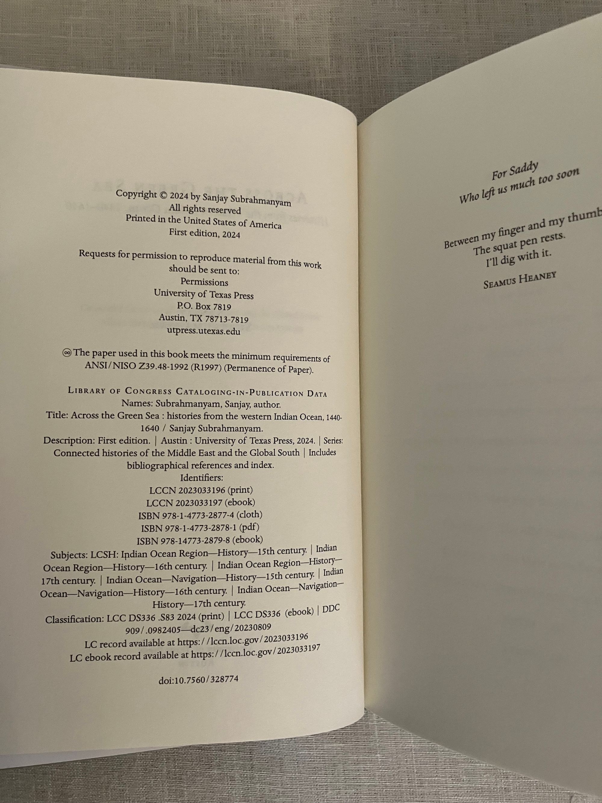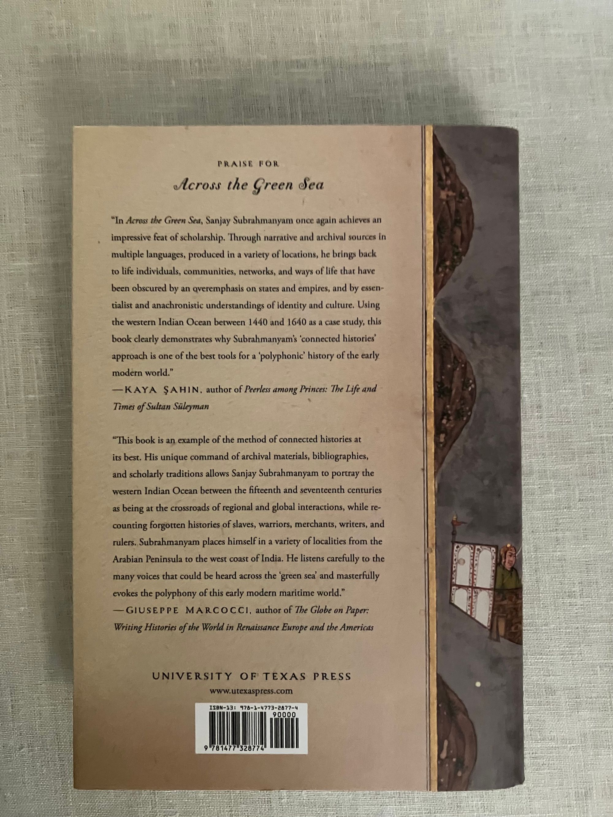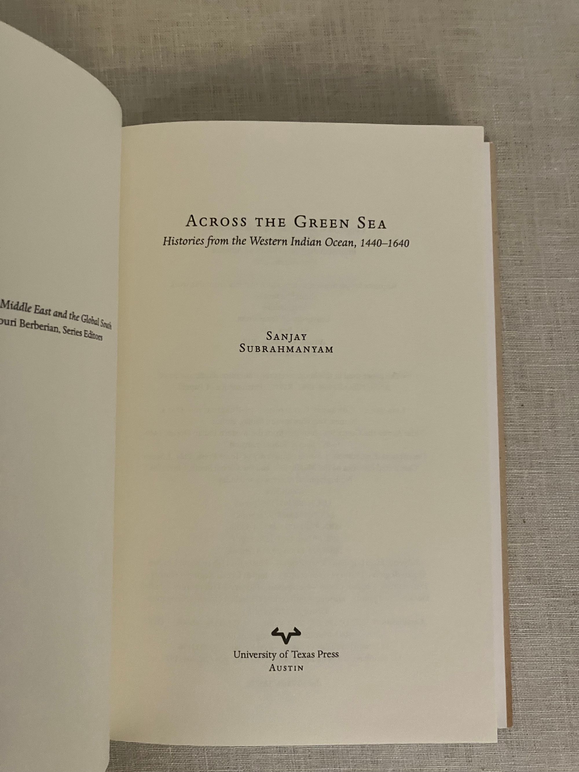 Hard cover, 8vo in green paper-covered boards with silver titles to the spine, in the original, unclipped pictorial dust jacket. First Edition. 274pp. ISBN 978-1-4773-2877-4 *CONDITION: Fine , as new, in a Fine dust jacket, now in a mylar protector. **"Beginning in the mid-fifteenth century, the regions bordering the western Indian Ocean--"the green sea," as it was known to Arabic speakers--had increasing contact through commerce, including a slave trade, and underwent cultural exchange and transformation. Using a variety of texts and documents in multiple Asian and European languages, "Across the Green Sea" looks at the history of the ocean from a variety of shifting viewpoints: western India, the Red Sea and Mecca, the Persian Gulf, East Africa, and Kerala. Sanjay Subrahmanyam sets the scene for this region starting with the withdrawal of China's Ming Dynasty and explores how the western Indian Ocean was transformed by the growth and increasing prominence of the Ottoman Empire and the continued spread of Islam into East Africa. He examines how several cities, including Mecca and the vital Indian port of Surat, grew and changed during these centuries, when various powers interacted until famines and other disturbances upended the region in the seventeenth century. Rather than proposing an artificial model of a dominant center and its dominated peripheries, "Across the Green Sea" demonstrates the complexity of a truly dynamic and polycentric system through the use of connected histories, a method pioneered by Subrahmanyam himself." (blurb) **Author Sanjay Subrahmanyam is Distinguished Professor of History and the Irving & Jean Stone Chair in Social Sciences at UCLA. A really interesting exegesis on historiography itself, and how the cultural biases of earlier (western European) historians have reflected emphasis of western values. (AMJ)