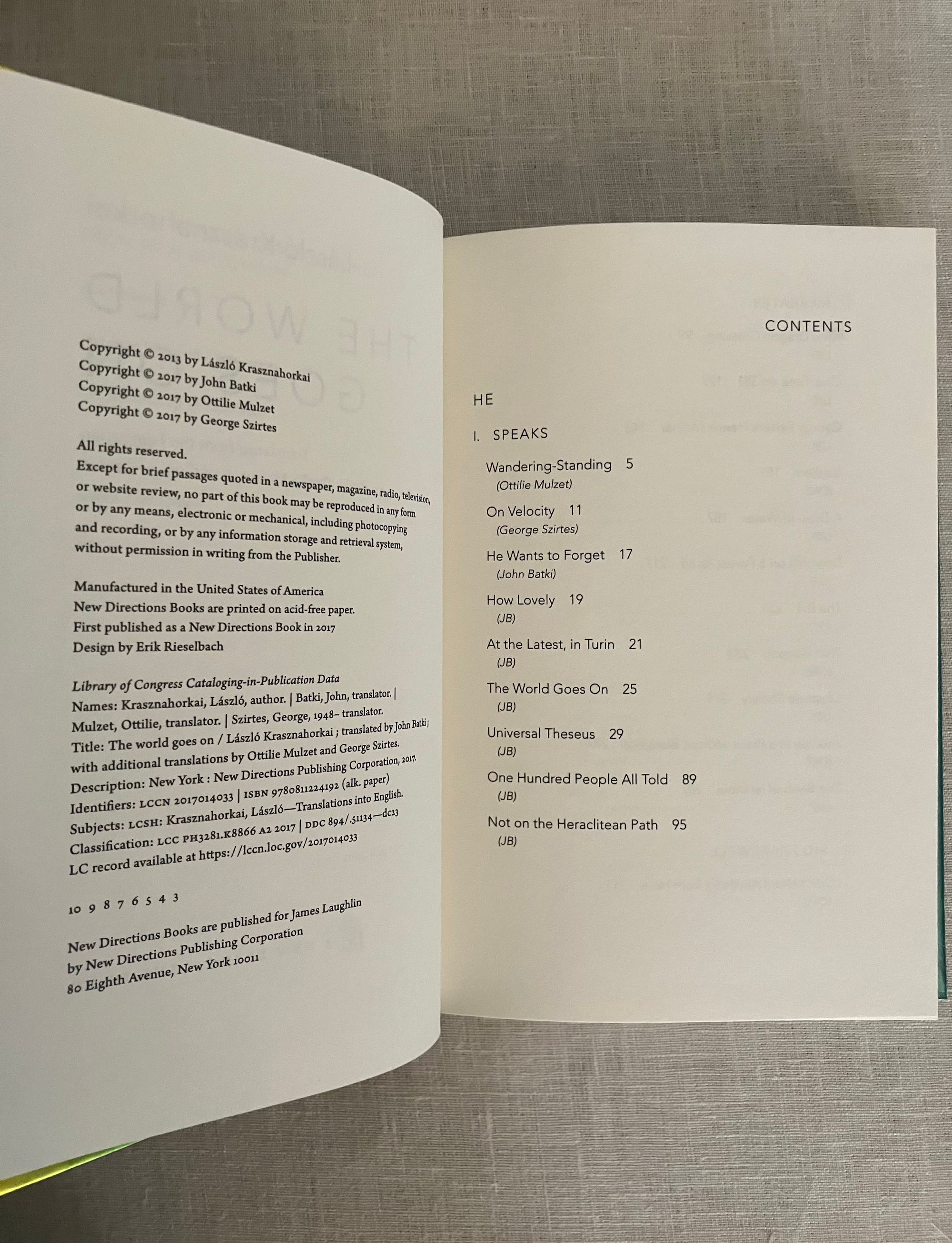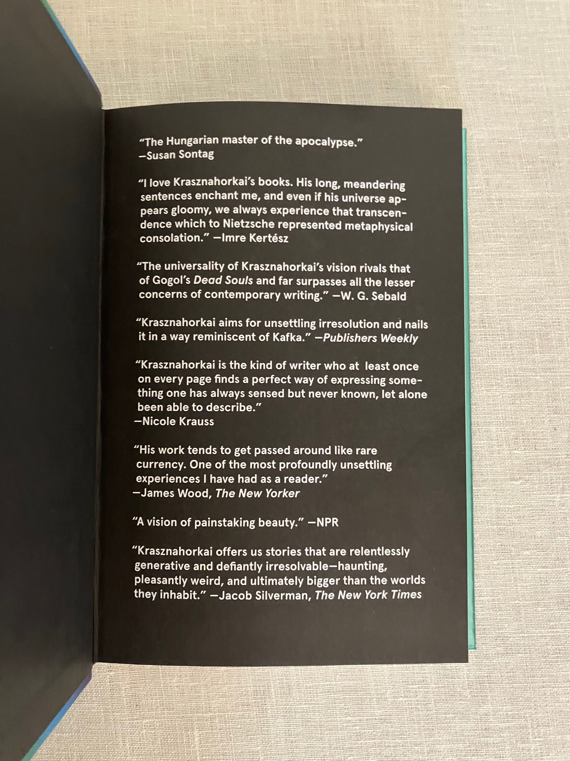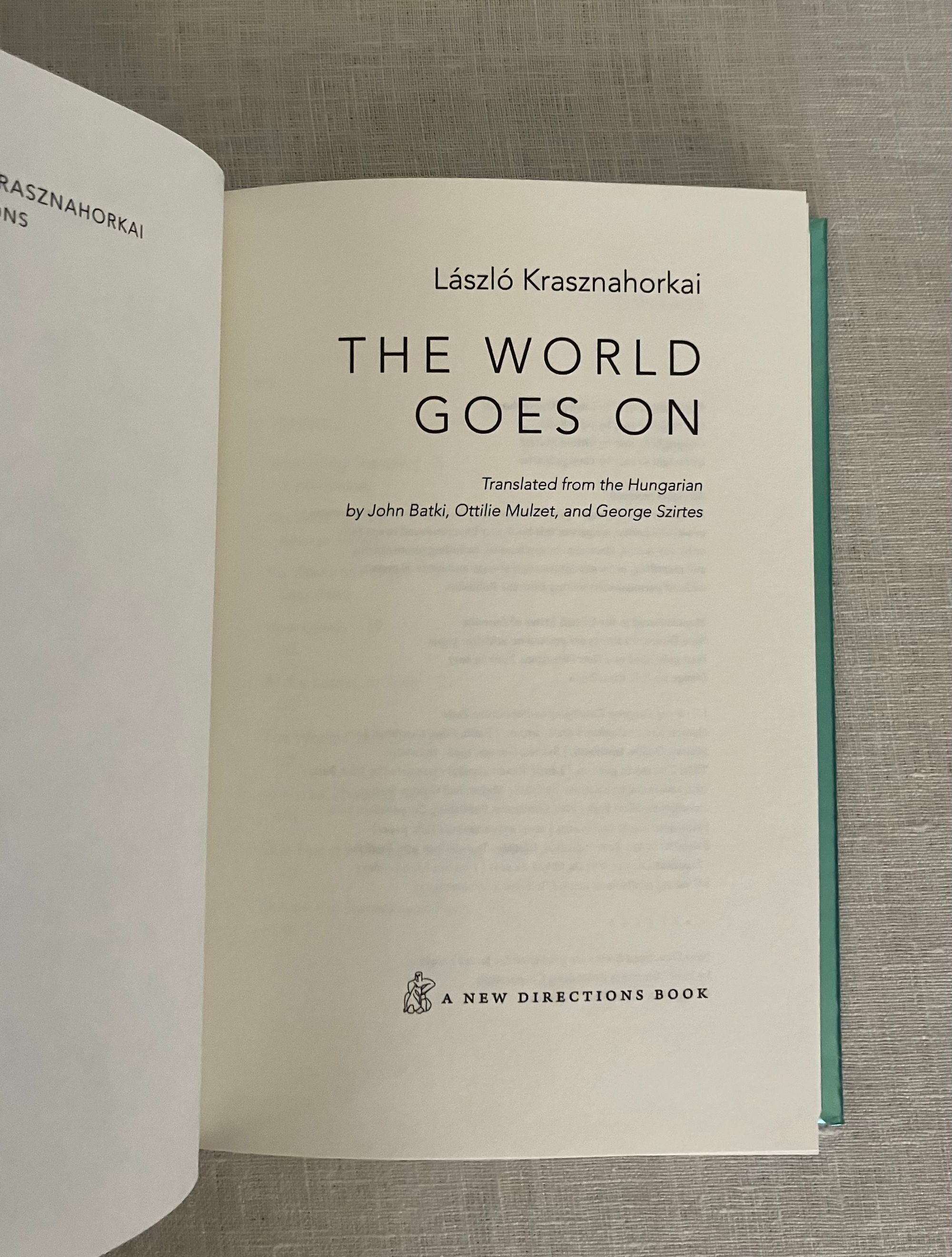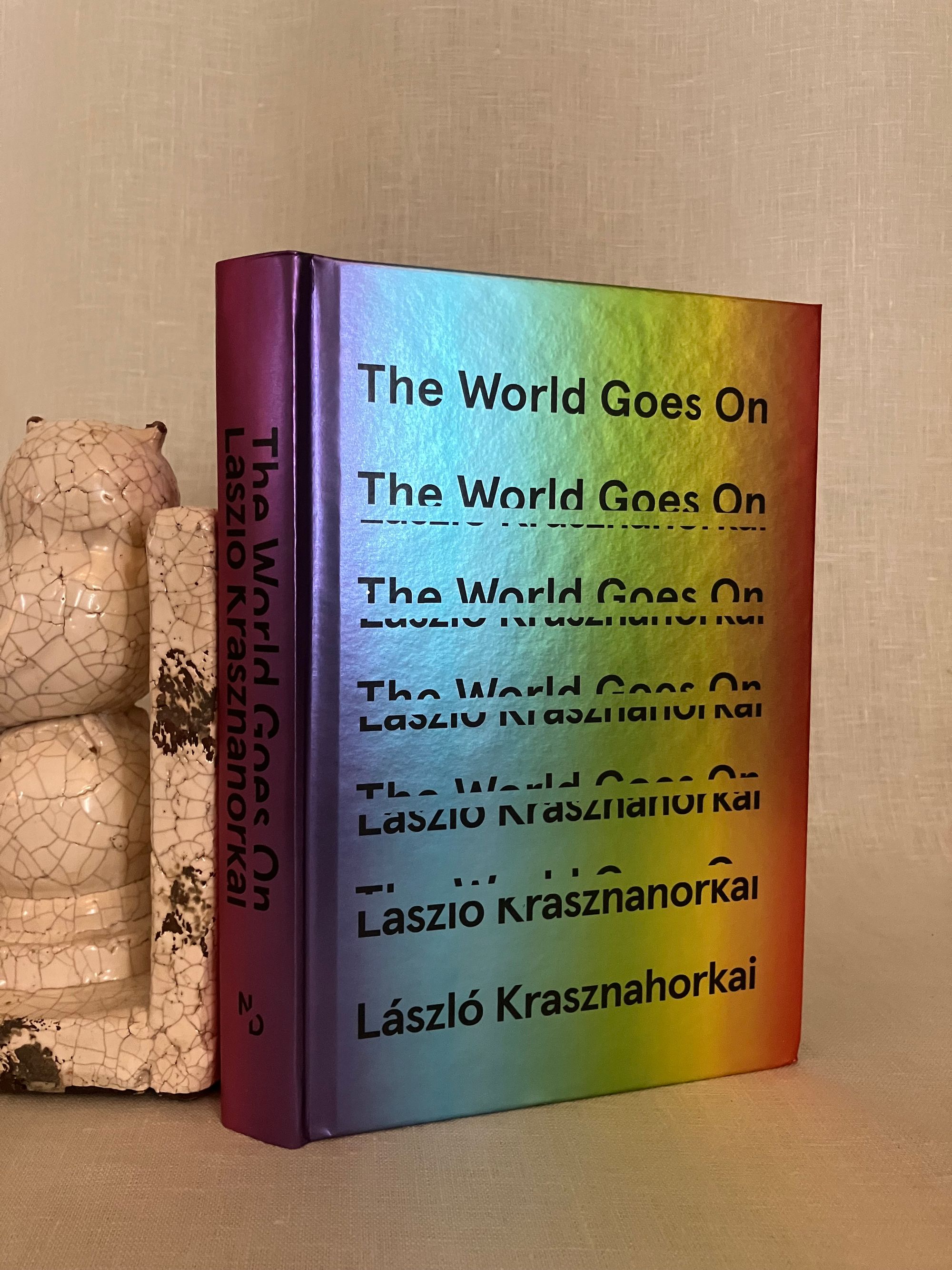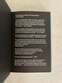 Hard cover, 8vo, in rainbow colored foil covered boards, 308 pp. CONDITION: Fine, as new. Issued without dust jacket, now in a mylar protector. A collection of twenty-one interconnected short stories (vignettes, really,) by the Hungarian author Krasnahorkai, also 2025 Winner of the Nobel Prize for Literature. This book was short-listed for the Mann Booker International Prize in 2018. Many of the stories had been published individually. ** An unnamed traveler, a modern Everyman, perhaps, such as created in the medieval morality plays, is catapulted from the modern world, (situated initially somewhere in Germany,) through time and space in these prose poems. The narrator explores the limits of his philosophical malaise, literally propelling him from West to East, on a philosophical journey. Nietzsche's breakdown in Turin, for instance, is dramatically interpreted through the oracular presence of figures such as Thomas Mann, Dr. Mobius, and Immanuel Kant in one scene. [See our items numbers 9005 and 8347 for versions of "Everyman."] While later, an "ascetic prince of philosophers," (sounding like Bouddha,) is explored for 2500 years of the promise of enlightenment through the negation of desire and suffering. Later still, the author riffs on trying to research the first Russian astronauts in space of the 1940's and 50's, in the author's home country of Hungary, meeting with impenetrable obstacles of understanding as to his seemingly obsessive desire to research this particular topic of Cold War history, which he explains as prerequisite to leaving earth...all time being perceived as the preparation for the next stage and as consequence of the past. The narrator's state of mind, being treated in the Budapest Institute by Dr. Hyem, in "That Gagarin" circles us back somehow to Nietzsche's philosophical sensitivities and mental distress. How do you adequately describe this except as art? (AMJ)