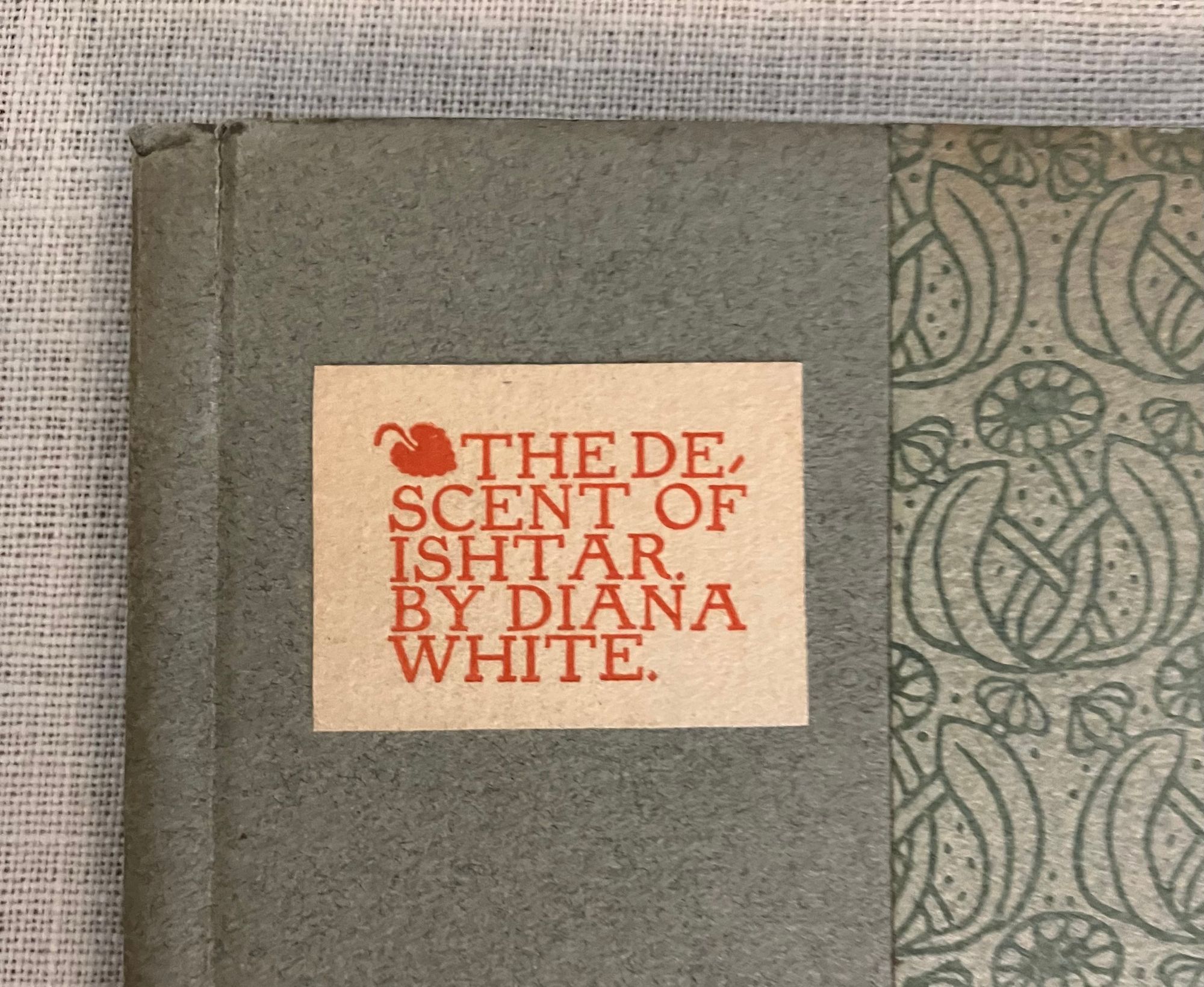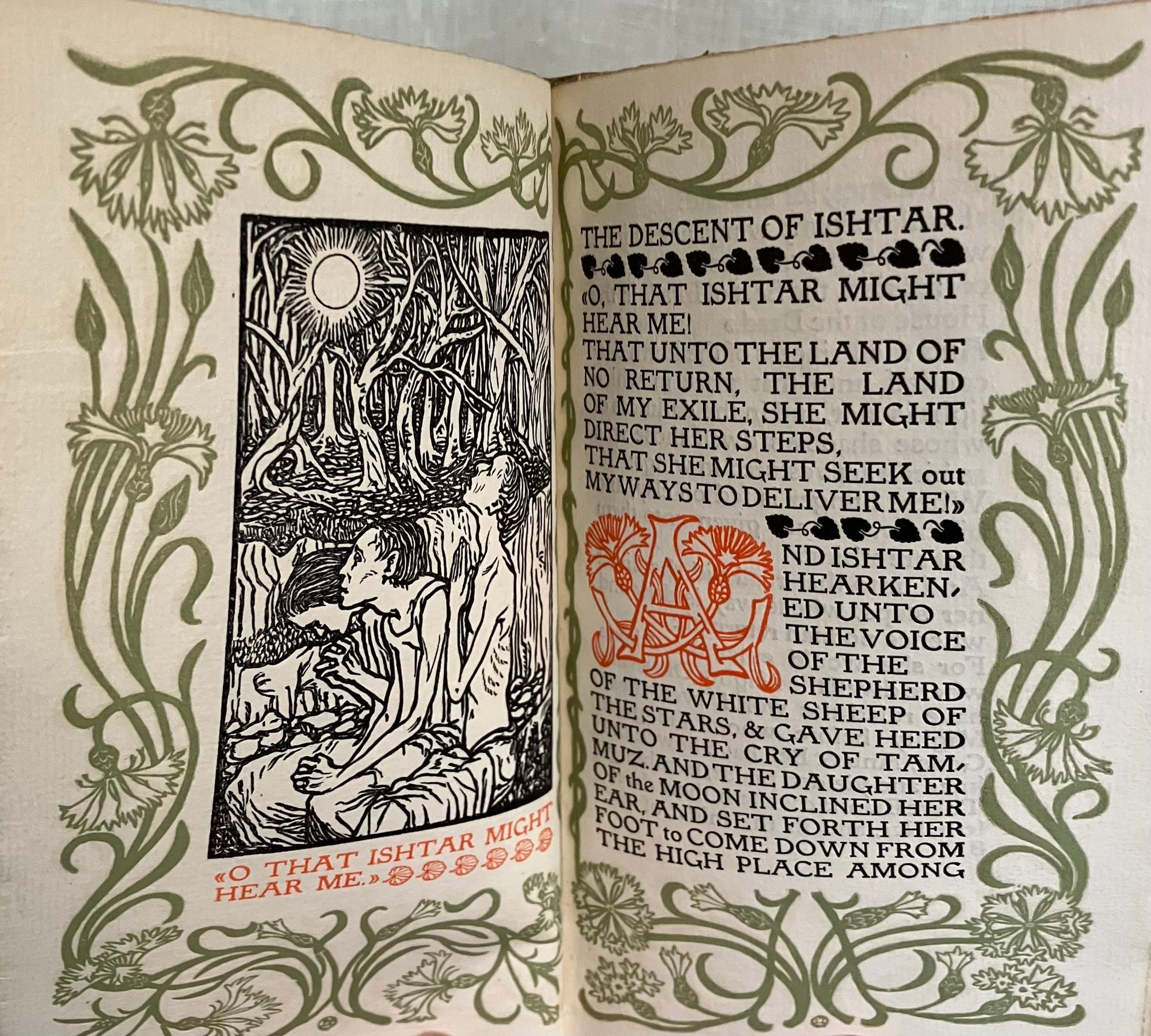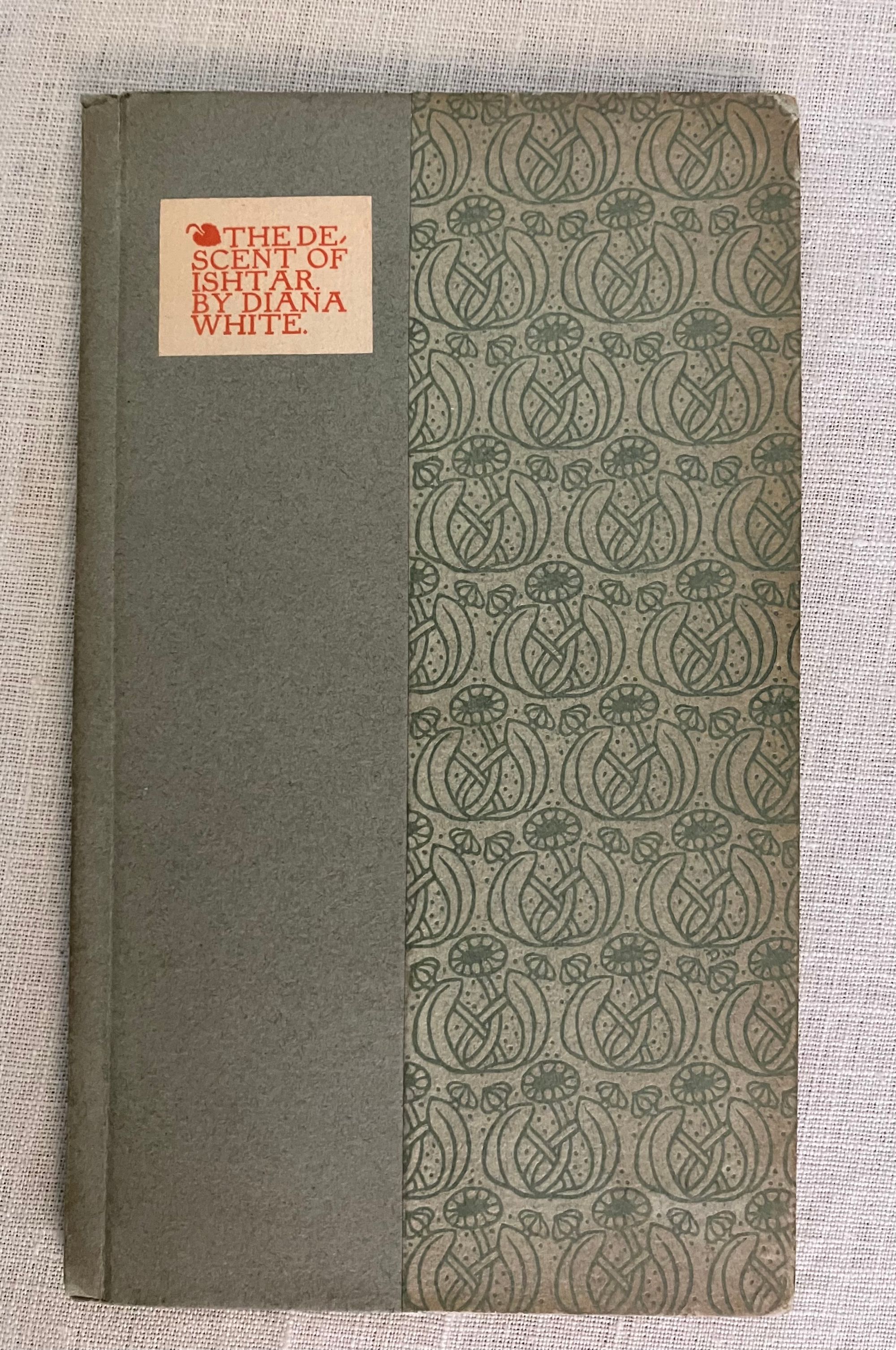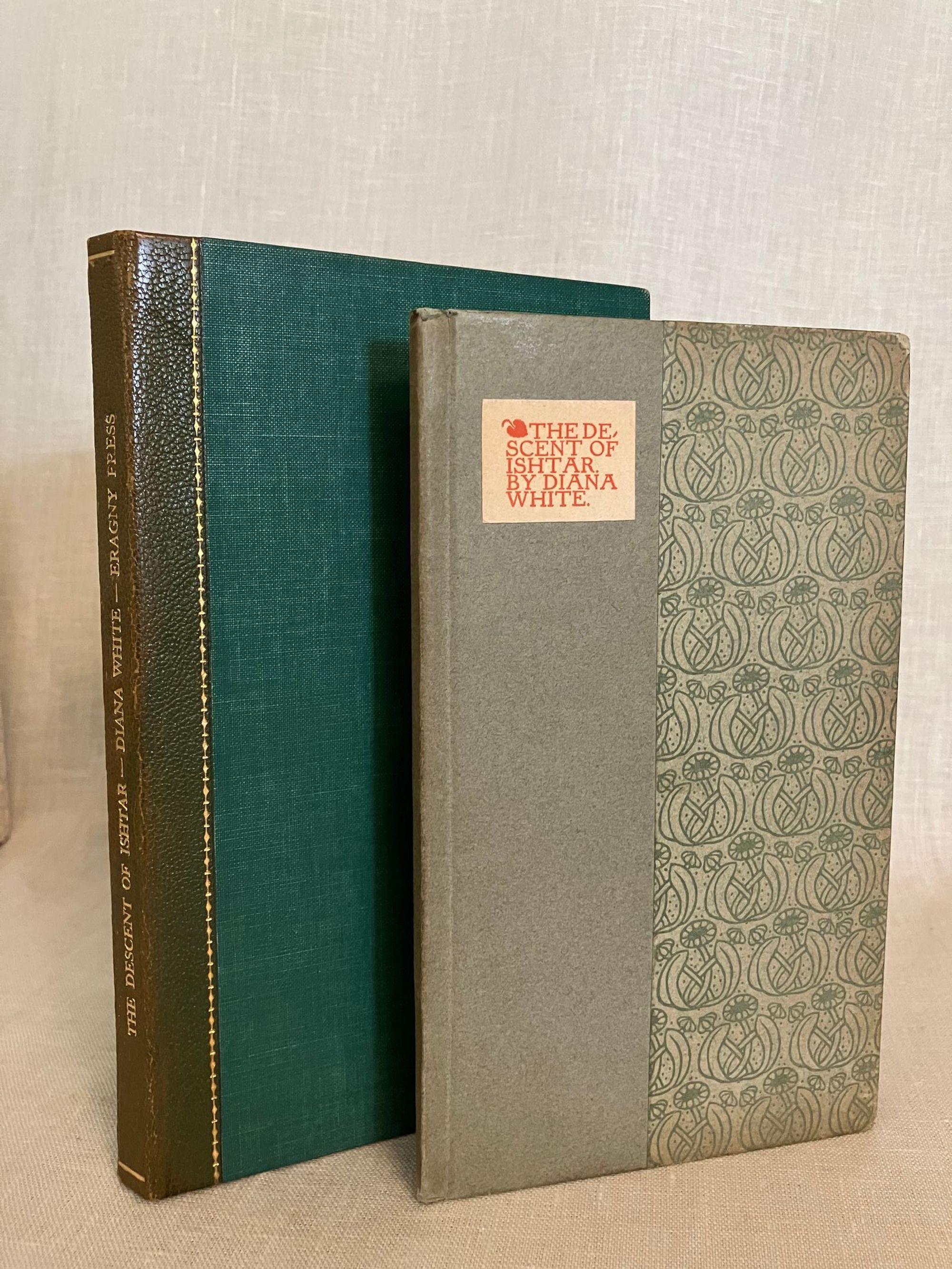 Hard cover, 12 mo (4 1/4 x 7 1/4 inches) in quarter blue green Michallet paper-covered boards over decorative "daisy" design paper, the title label in red applied to the left side of front board. Inside, are cream laid endpapers. The watermarked Arches paper also carries the Eragny Press watermark (best seen to the ffep.): a roughly circular monogram made up of an Art Nouveau initials "E "and "P" intersected by images of two vertically-oriented acanthus leaves. Top edge trimmed, others untrimmed. 30, [2] pp., First (and only) Edition. Letterpress, hand printed in Black, red and green, using woodblock designs created by Lucien and Esther Pissarro, with the frontispiece illustration by Author and artist Diana White, entitled "Oh that Ishtar Might Hear Me." Text is printed in Lucien Pissarro's own Brook font, created after the use of type from the Vale Press, with whom Pissarro was also engaged upon his arrival in London in 1893, was famously destroyed (i.e.,thrown in the Thames) by Charles Ricketts in 1903. Limitation page states: "This edition is strictly limited to 226 copies, of which 200 are for sale." Additional to the colophon information: "The Frontispiece has been designed by Diana White & engraved on the wood by Esther Pissarro. The double border and initial letters were designed by Lucien Pissarro and engraved by Esther Pissarro. The book has been printed by them at their Eragny Press, The Brook, Hammersmith. Finished in December 1903." **CONDITION: Near Fine. Slight browning, toward the outer edge of daisy paper (only) on boards. Corners, foot of spine very lightly rubbed. Front paste downs show ghost of tanning from an insert, and ffep. bears brief pencil notation of a former owner. A few original small printer's smudges not affecting text or designs, as expected; the Pissarros were self-trained printers, purchasing their own Albion presses in order to trim the costs of production; the challenges of printing the pages with a series of colored woodblocks led to a high degree of "spoilage" during the production, apparently, so a few random ink marks seems acceptable. A few single spots of foxing to some prelims, explained by Gentz (p. 56) as a result of the Leighton Brothers binders using acidic boards and sometimes too much glue. One end paper unopened. Else, very clean, bright , beautiful and binding is firm. Comes in a handsome custom clamshell box, in quarter olive green morocco over kelley green cloth, gilt, title to spine. Box: Near Fine.**BRITISH ARTIST and AUTHOR, DIANA WHITE (1868-1950), was at the Crystal Palace Art School in London with a young Esther (nee Bensusan) Pissarro. White played a multi-tasking role in the making of this book; as translator/"preparer" of the text, she was also responsible for creating and engraving the woodblock frontispiece illustration, (printed in black,) entitled "Oh, that Ishtar Might Hear Me." Only three Eragny Press books used illustrations by artists other than the Pissarros themselves, so this was unusual. White is said to have relied on the initial translation of the tablets by others from the original Akkadian, or cuniform; the original blocks are part of the collections of the British Museum. White continued working as a translator, as well as an artist and illustrator, but this was her most famous work. **Gentz relates that the final production of the book was left in the hands of the two women, as Lucien Pissarro was called away to France to attend the death of his father, renowned Impressionist painter Camille Pissarro, between November and March, 1903. Further, correspondence between Lucien and his wife encouraged her to print fewer numbers than stated in order to "juice" the rarity resale value, thus helping the perennially precarious family bottom line. (Gentz p. 195.) In the end it was the agreement with their sales agent, John Lane, which seems to have led to a scrupulous adherence to the truth in this matter. **Refs: Amin, Osama Shukir Muhammed, World History Encyclopedia: "Goddess Ishtar Descent to the Underworld Tablet" (online), 2014. Marcella C. Gentz, A History of the Eragny Press 1894-1914 (2004). Lora Urbanelli, The Book Art of Lucien Pissarro (1997). Will Ransom, Private Presses and Their Books, (1929).**LOC 16013456. Gentz, EP19, p. 194. Ransom, Eragny Press checklist No. 17, p. 263.**Provenance: F. Zara (1961) Will Ransom, (1942) J.C. Howgate. [Ransom's printed library label to rear pastedown with additional owners names.] Scarce.