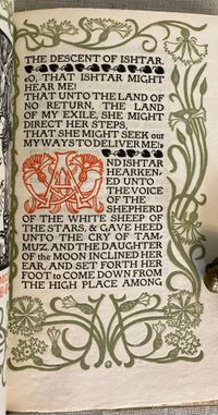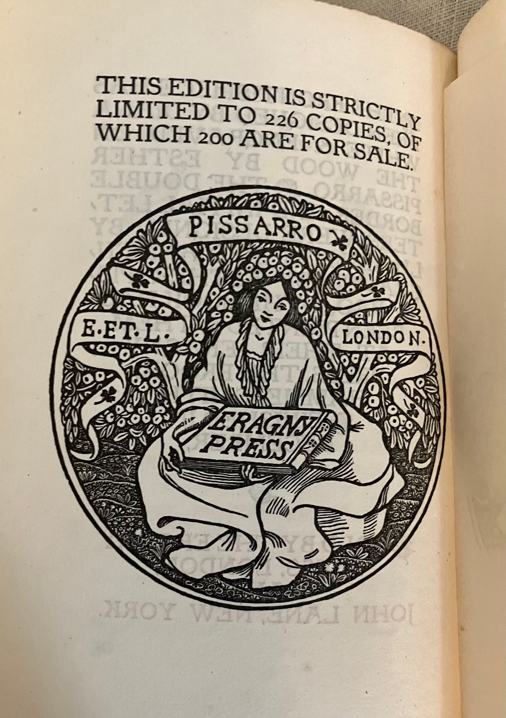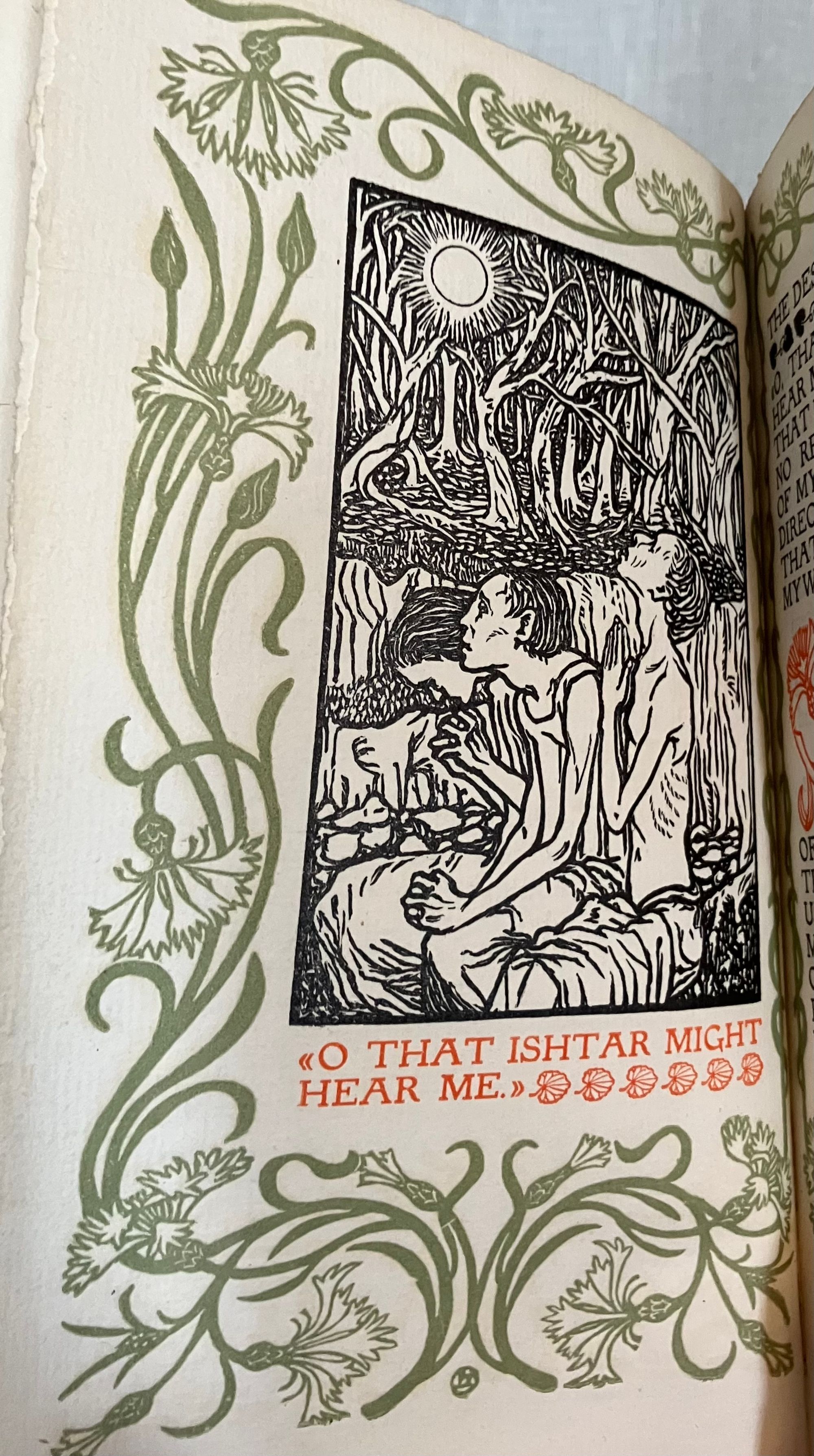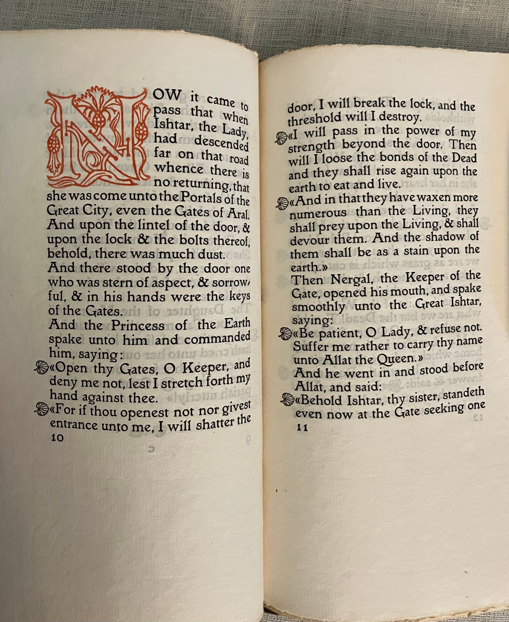 Hard cover, 12 mo (4 1/4 x 7 1/4 inches) in quarter blue green Michallet paper-covered boards over decorative "daisy" design paper, the title label in red applied to the left side of front board. Inside, are cream laid endpapers. The watermarked Arches paper also carries the Eragny Press watermark (best seen to the ffep.): a roughly circular monogram made up of an Art Nouveau initials "E "and "P" intersected by images of two vertically-oriented acanthus leaves. Top edge trimmed, others untrimmed. 30, [2] pp., First (and only) Edition. Letterpress, hand printed in Black, red and green, using woodblock designs created by Lucien and Esther Pissarro, with the frontispiece illustration by Author and artist Diana White, entitled "Oh that Ishtar Might Hear Me." Text is printed in Lucien Pissarro's own Brook font, created after the use of type from the Vale Press, with whom Pissarro was also engaged upon his arrival in London in 1893, was famously destroyed (i.e.,thrown in the Thames) by Charles Ricketts in 1903. Limitation page states: "This edition is strictly limited to 226 copies, of which 200 are for sale." Additional to the colophon information: "The Frontispiece has been designed by Diana White & engraved on the wood by Esther Pissarro. The double border and initial letters were designed by Lucien Pissarro and engraved by Esther Pissarro. The book has been printed by them at their Eragny Press, The Brook, Hammersmith. Finished in December 1903." **CONDITION: Near Fine. Slight browning, toward the outer edge of daisy paper (only) on boards. Corners, foot of spine very lightly rubbed. Front paste downs show ghost of tanning from an insert, and ffep. bears brief pencil notation of a former owner. A few original small printer's smudges not affecting text or designs, as expected; the Pissarros were self-trained printers, purchasing their own Albion presses in order to trim the costs of production; the challenges of printing the pages with a series of colored woodblocks led to a high degree of "spoilage" during the production, apparently, so a few random ink marks seems acceptable. A few single spots of foxing to some prelims, explained by Gentz (p. 56) as a result of the Leighton Brothers binders using acidic boards and sometimes too much glue. One end paper unopened. Else, very clean, bright , beautiful and binding is firm. Comes in a handsome custom clamshell box, in quarter olive green morocco over kelley green cloth, gilt, title to spine. Box: Near Fine.**BRITISH ARTIST and AUTHOR, DIANA WHITE (1868-1950), was at the Crystal Palace Art School in London with a young Esther (nee Bensusan) Pissarro. White played a multi-tasking role in the making of this book; as translator/"preparer" of the text, she was also responsible for creating and engraving the woodblock frontispiece illustration, (printed in black,) entitled "Oh, that Ishtar Might Hear Me." Only three Eragny Press books used illustrations by artists other than the Pissarros themselves, so this was unusual. White is said to have relied on the initial translation of the tablets by others from the original Akkadian, or cuniform; the original blocks are part of the collections of the British Museum. White continued working as a translator, as well as an artist and illustrator, but this was her most famous work. **Gentz relates that the final production of the book was left in the hands of the two women, as Lucien Pissarro was called away to France to attend the death of his father, renowned Impressionist painter Camille Pissarro, between November and March, 1903. Further, correspondence between Lucien and his wife encouraged her to print fewer numbers than stated in order to "juice" the rarity resale value, thus helping the perennially precarious family bottom line. (Gentz p. 195.) In the end it was the agreement with their sales agent, John Lane, which seems to have led to a scrupulous adherence to the truth in this matter. **Refs: Amin, Osama Shukir Muhammed, World History Encyclopedia: "Goddess Ishtar Descent to the Underworld Tablet" (online), 2014. Marcella C. Gentz, A History of the Eragny Press 1894-1914 (2004). Lora Urbanelli, The Book Art of Lucien Pissarro (1997). Will Ransom, Private Presses and Their Books, (1929).**LOC 16013456. Gentz, EP19, p. 194. Ransom, Eragny Press checklist No. 17, p. 263.**Provenance: F. Zara (1961) Will Ransom, (1942) J.C. Howgate. [Ransom's printed library label to rear pastedown with additional owners names.] Scarce.
