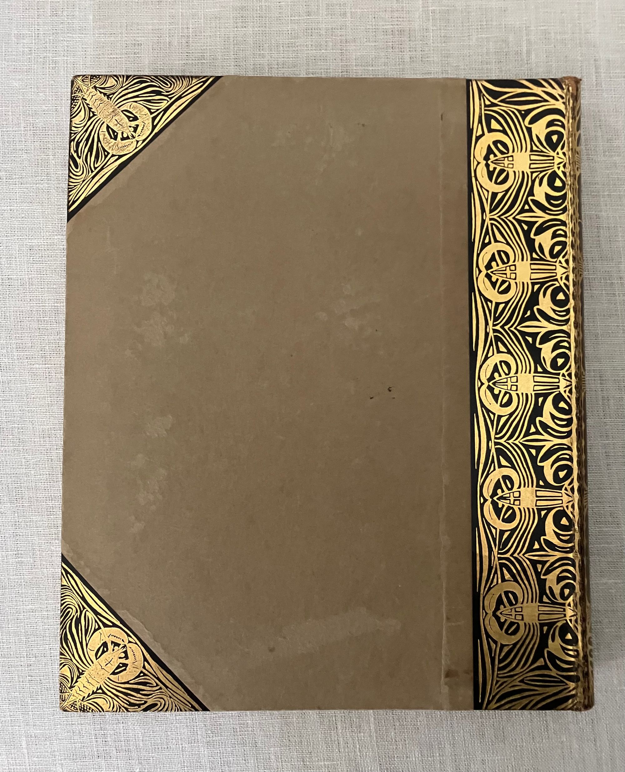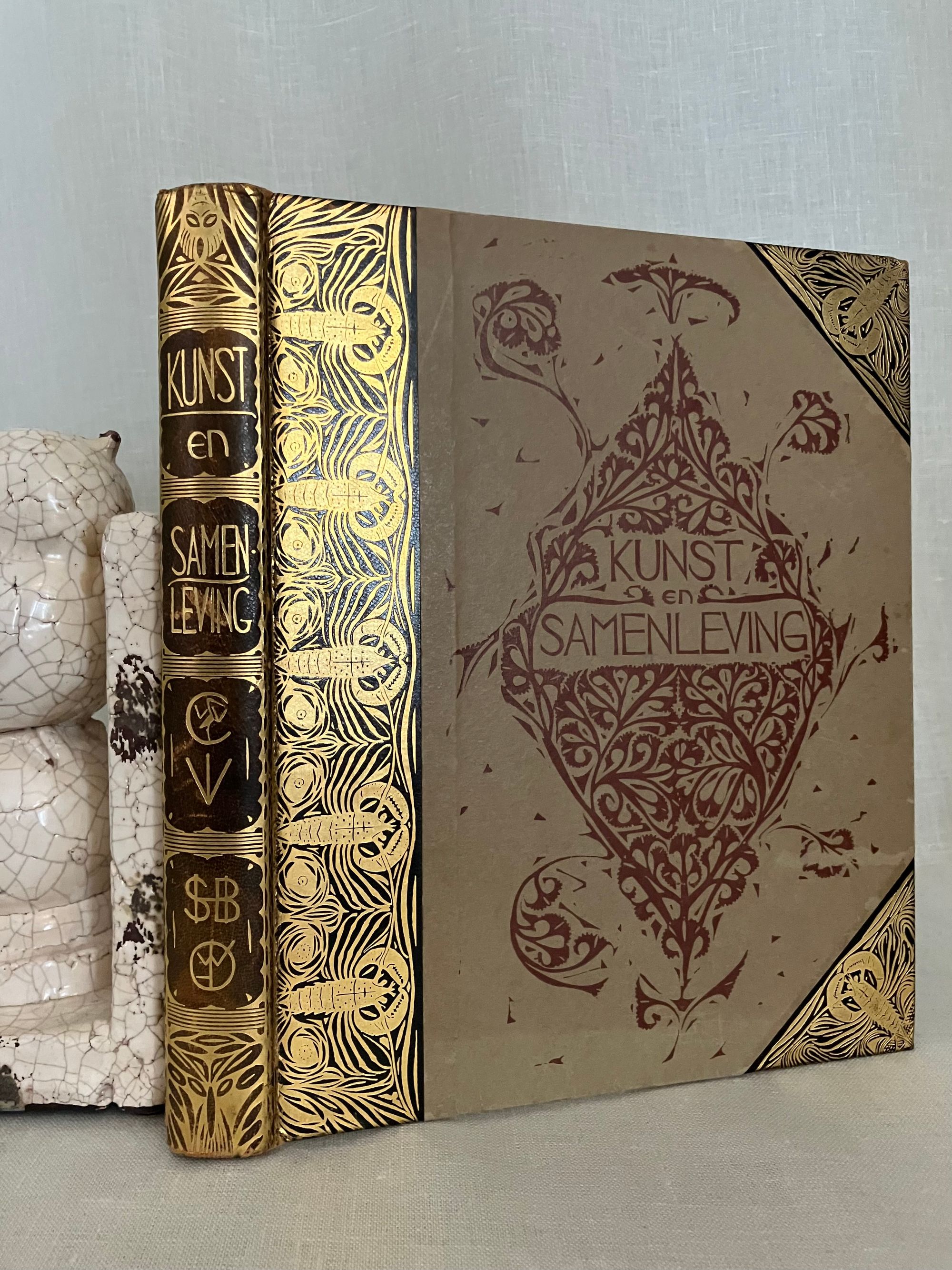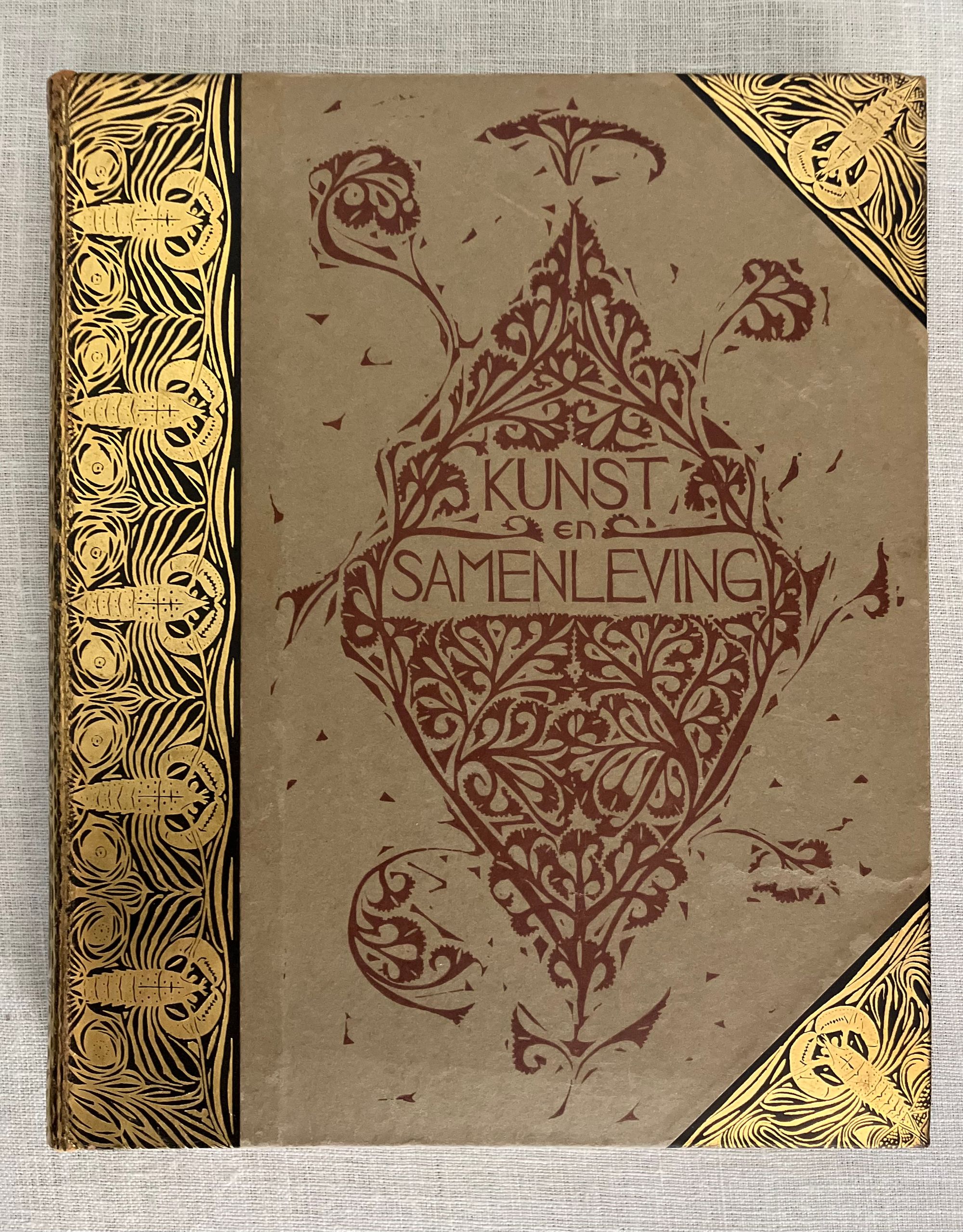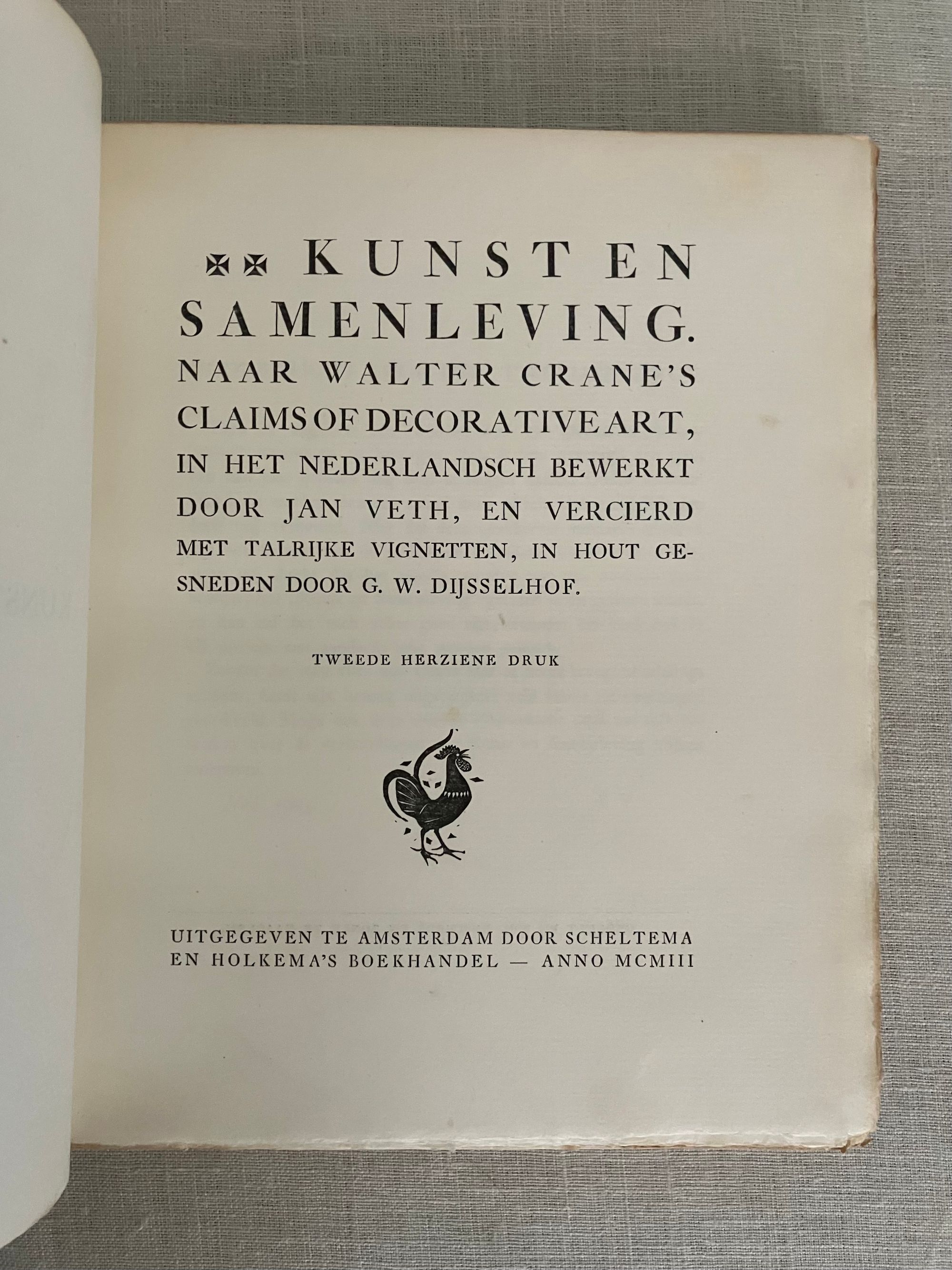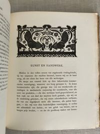 Hard cover, 8vo, in three-quarter leather binding over buff colored boards decoratively blocked in gilt with stunning Nieuwe Kunst Dutch art nouveau style pictorial bands along the joints and at the large triangular corner pieces of lobsters and perhaps abstracted oysters?, the legs of the shellfish intertwined with some sort of sea wrack. This gilt design carries neatly across the spine, where five sets of horizontal lines appear through small gaps in imitation of the cords which would sew a hard cover book together. The spine design continues across the hinges with the title and various runic-like colophons within gaps in the design. These refer to (from the top): the original English author Walter Crane; translator JV; publisher SHB, and artist GWD. The rear hinge area features the lobster motifs in a more simplified form. The title vignette to the front board is printed in red, and forms part of a diamond shaped carved woodblock Javanese batik design, which is said to also inform the triangular and other geometric aspects of the design (See Purvis, p. 128 on Javanese design influence; also Elliot, p. 86.) Dijsselhoff also designed distinctive the batik-like endpapers printed in gold. This well-made book has been recognized for using only the best of materials, including "real" gold for the gilt and printed on heavy rag paper. **CONDITION: Very Good or better. Lacking original decorated dust jacket. A few scuffs to the paper covered boards. Light wear at outer joints. A few scuffs to the spine. Slight offset browning to corners of endpapers. The gold remains bright. **"A "masterpiece of Nieuwe Kunst book design and Dijsselhof's most significant contribution to the movement." (Purvis, p. 127)**Dutch ARTIST and book cover designer GERITT WILLEM DIJSSELHOFF 's 1886-1924) contribution to this work is particularly noteworthy with its unusual lobster and seaweed themed bands of gilt illustration on the binding, his woodblock illustrated endpapers and thirty-five wood carved block printed headers and footers in the art nouveau style, many of which feature animals, fish and birds. Dijsselhoff was an accomplished painter, who produced naturalistic color studies of fish (and lobsters) observed from visits to the Natura Artis Magistra, the famous zoological gardens and aquarium in central Amsterdam, of which he was a member. The firsrt edition was published in 1893. TRANSLATOR Jan Veth (1864-1925) was Professor Extraordinary in the History of Art and Aesthetics (1906) associated with the Rijksakademie voor Beeldende Kunsten in Amsterdam, in addition to being a talented portraitist, art critic and designer of at least one book. This particularly innovative book design has been extolled by such art historical luminaries as Nikolaus Pevsner, Ernst Braches and Alston W. Purvis as exemplary of the Dutch expression of "Nieuwe Kunst;" or the art nouveau in Holland as applied to architecture, paintings, crafts, posters, vases, furniture, ornament and book design from roughly 1892- 1906. (See Purvis, p. 127-28.) Walter Crane's essays in the Claims of Decorative Art, part of the larger work, "Art and Society" first published in London in 1892, were influential with his Dutch counterparts, with principles for good design, and the argument that moral good in society came from the social democracy promoted by support of the craftsperson. Conversely, that mass industrialization had destroyed the traditional links of fellowship which had in the past bound craftsmen and artists together. **REFS: I.M. Elliot," Batik Fabled Cloth of Java," (New York: Clarkson N. Potter and Crown Publishing, 1984--our number 7953). Braches, Ernst, Dutch Art Nouveau... ( Amsterdam: De Buitenkant, 2009) pp. 28-32. A.W. Purvis, "Feast of Dutch Diversity: Nieuwe Kunst Book Design" from The Journal of Decorative and Propaganda Arts 2002, Vol. 24 Designm Culture, Identity: The Wolfsonian Collection (2002)pp. 118-139. Scarce to market. (AMJ)