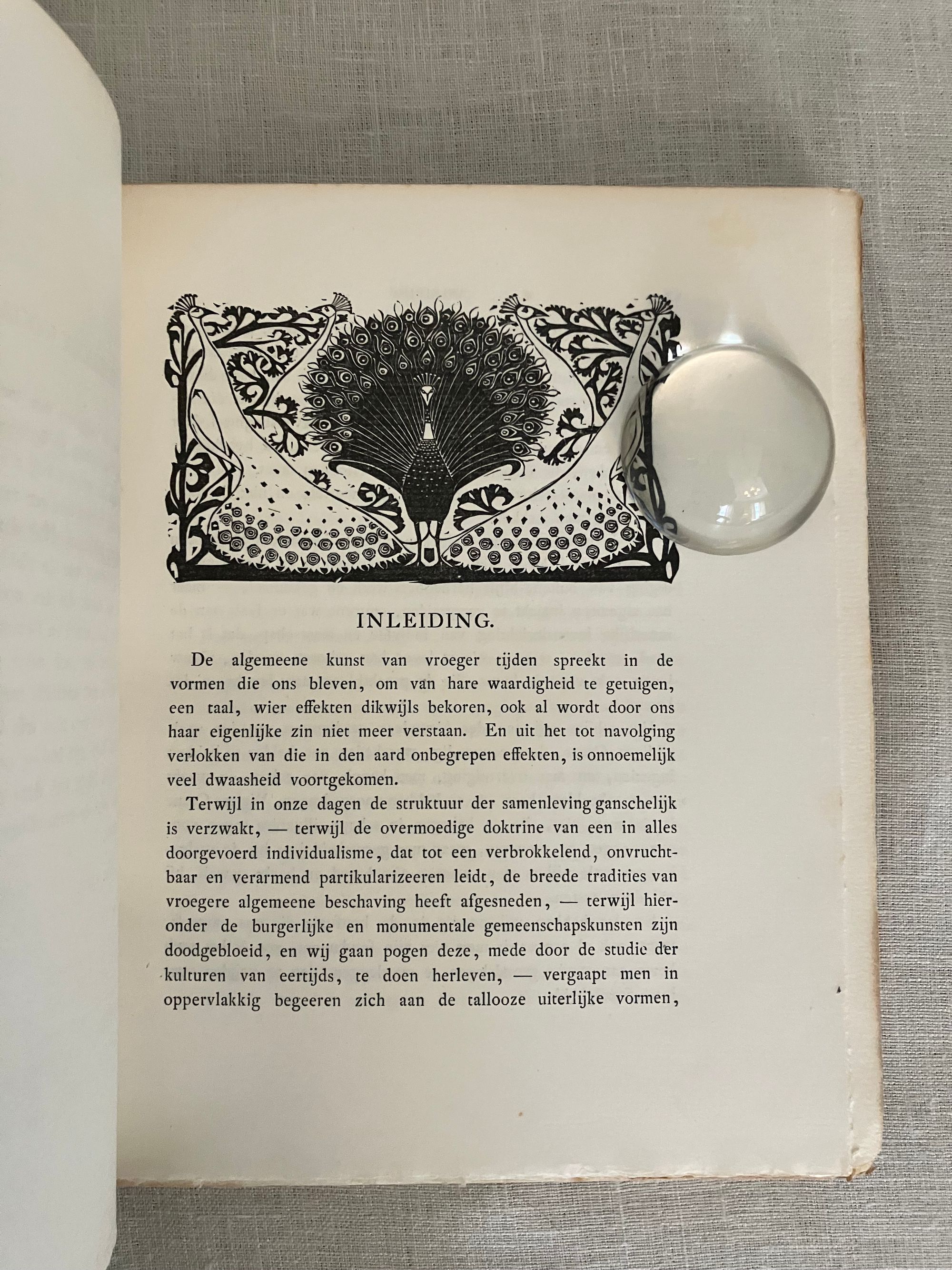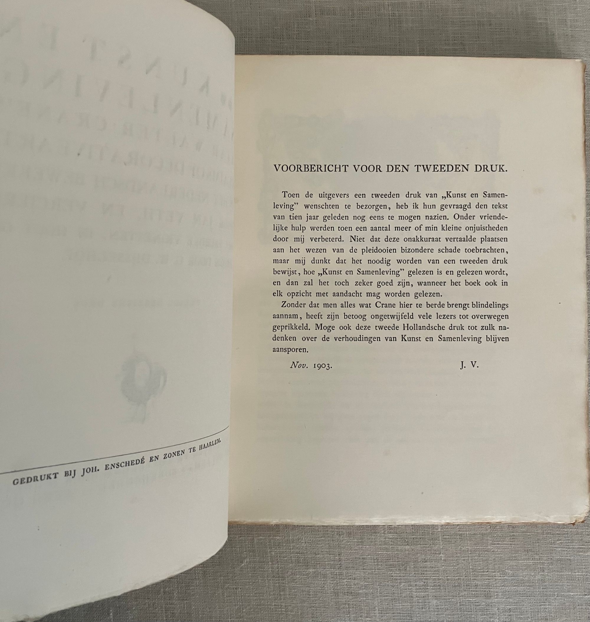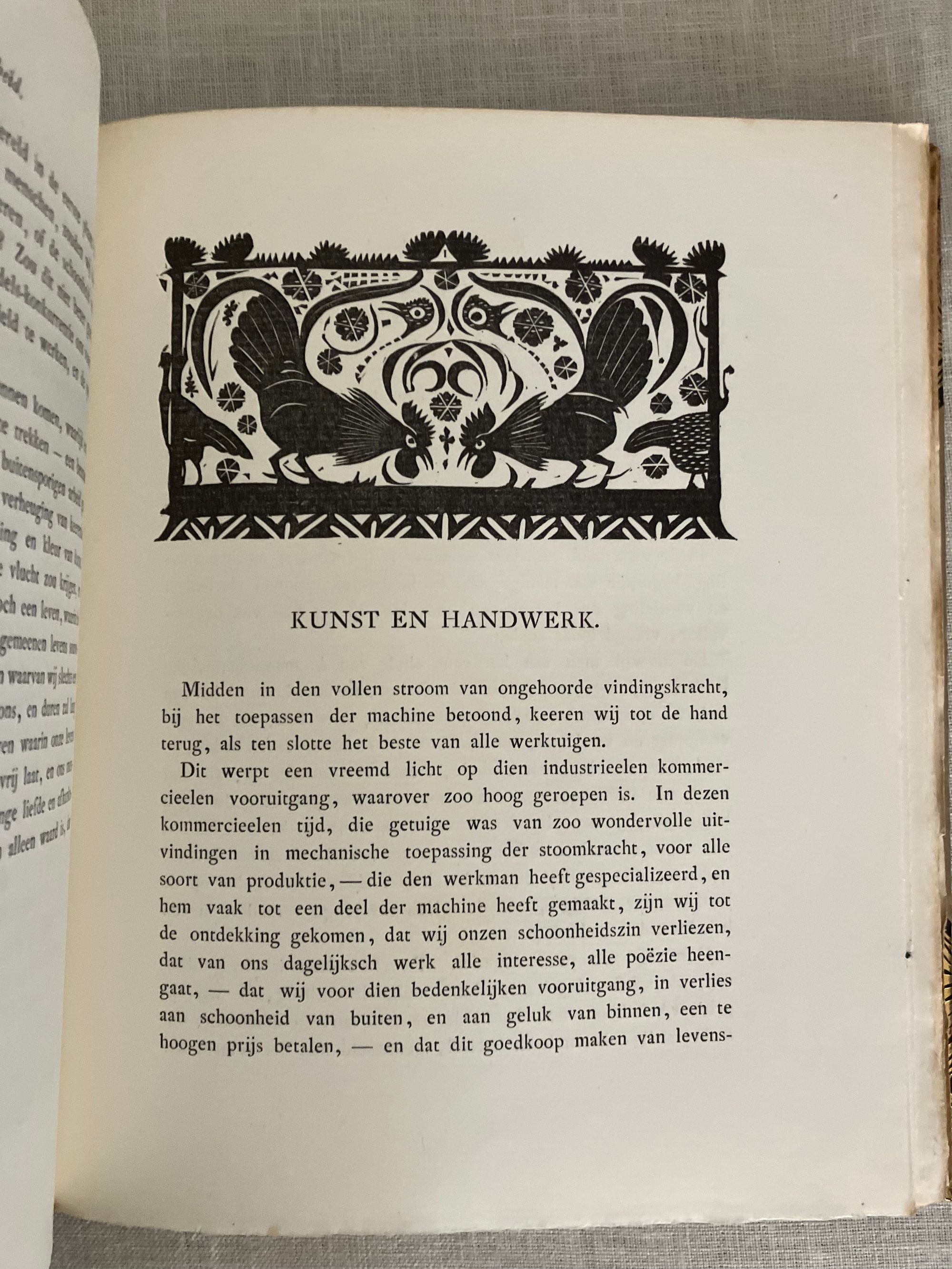 Hard cover, 8vo, in three-quarter leather binding over buff colored boards decoratively blocked in gilt with stunning Nieuwe Kunst Dutch art nouveau style pictorial bands along the joints and at the large triangular corner pieces of lobsters and perhaps abstracted oysters?, the legs of the shellfish intertwined with some sort of sea wrack. This gilt design carries neatly across the spine, where five sets of horizontal lines appear through small gaps in imitation of the cords which would sew a hard cover book together. The spine design continues across the hinges with the title and various runic-like colophons within gaps in the design. These refer to (from the top): the original English author Walter Crane; translator JV; publisher SHB, and artist GWD. The rear hinge area features the lobster motifs in a more simplified form. The title vignette to the front board is printed in red, and forms part of a diamond shaped carved woodblock Javanese batik design, which is said to also inform the triangular and other geometric aspects of the design (See Purvis, p. 128 on Javanese design influence; also Elliot, p. 86.) Dijsselhoff also designed distinctive the batik-like endpapers printed in gold. This well-made book has been recognized for using only the best of materials, including "real" gold for the gilt and printed on heavy rag paper. **CONDITION: Very Good or better. Lacking original decorated dust jacket. A few scuffs to the paper covered boards. Light wear at outer joints. A few scuffs to the spine. Slight offset browning to corners of endpapers. The gold remains bright. **"A "masterpiece of Nieuwe Kunst book design and Dijsselhof's most significant contribution to the movement." (Purvis, p. 127)**Dutch ARTIST and book cover designer GERITT WILLEM DIJSSELHOFF 's 1886-1924) contribution to this work is particularly noteworthy with its unusual lobster and seaweed themed bands of gilt illustration on the binding, his woodblock illustrated endpapers and thirty-five wood carved block printed headers and footers in the art nouveau style, many of which feature animals, fish and birds. Dijsselhoff was an accomplished painter, who produced naturalistic color studies of fish (and lobsters) observed from visits to the Natura Artis Magistra, the famous zoological gardens and aquarium in central Amsterdam, of which he was a member. The firsrt edition was published in 1893. TRANSLATOR Jan Veth (1864-1925) was Professor Extraordinary in the History of Art and Aesthetics (1906) associated with the Rijksakademie voor Beeldende Kunsten in Amsterdam, in addition to being a talented portraitist, art critic and designer of at least one book. This particularly innovative book design has been extolled by such art historical luminaries as Nikolaus Pevsner, Ernst Braches and Alston W. Purvis as exemplary of the Dutch expression of "Nieuwe Kunst;" or the art nouveau in Holland as applied to architecture, paintings, crafts, posters, vases, furniture, ornament and book design from roughly 1892- 1906. (See Purvis, p. 127-28.) Walter Crane's essays in the Claims of Decorative Art, part of the larger work, "Art and Society" first published in London in 1892, were influential with his Dutch counterparts, with principles for good design, and the argument that moral good in society came from the social democracy promoted by support of the craftsperson. Conversely, that mass industrialization had destroyed the traditional links of fellowship which had in the past bound craftsmen and artists together. **REFS: I.M. Elliot," Batik Fabled Cloth of Java," (New York: Clarkson N. Potter and Crown Publishing, 1984--our number 7953). Braches, Ernst, Dutch Art Nouveau... ( Amsterdam: De Buitenkant, 2009) pp. 28-32. A.W. Purvis, "Feast of Dutch Diversity: Nieuwe Kunst Book Design" from The Journal of Decorative and Propaganda Arts 2002, Vol. 24 Designm Culture, Identity: The Wolfsonian Collection (2002)pp. 118-139. Scarce to market. (AMJ)