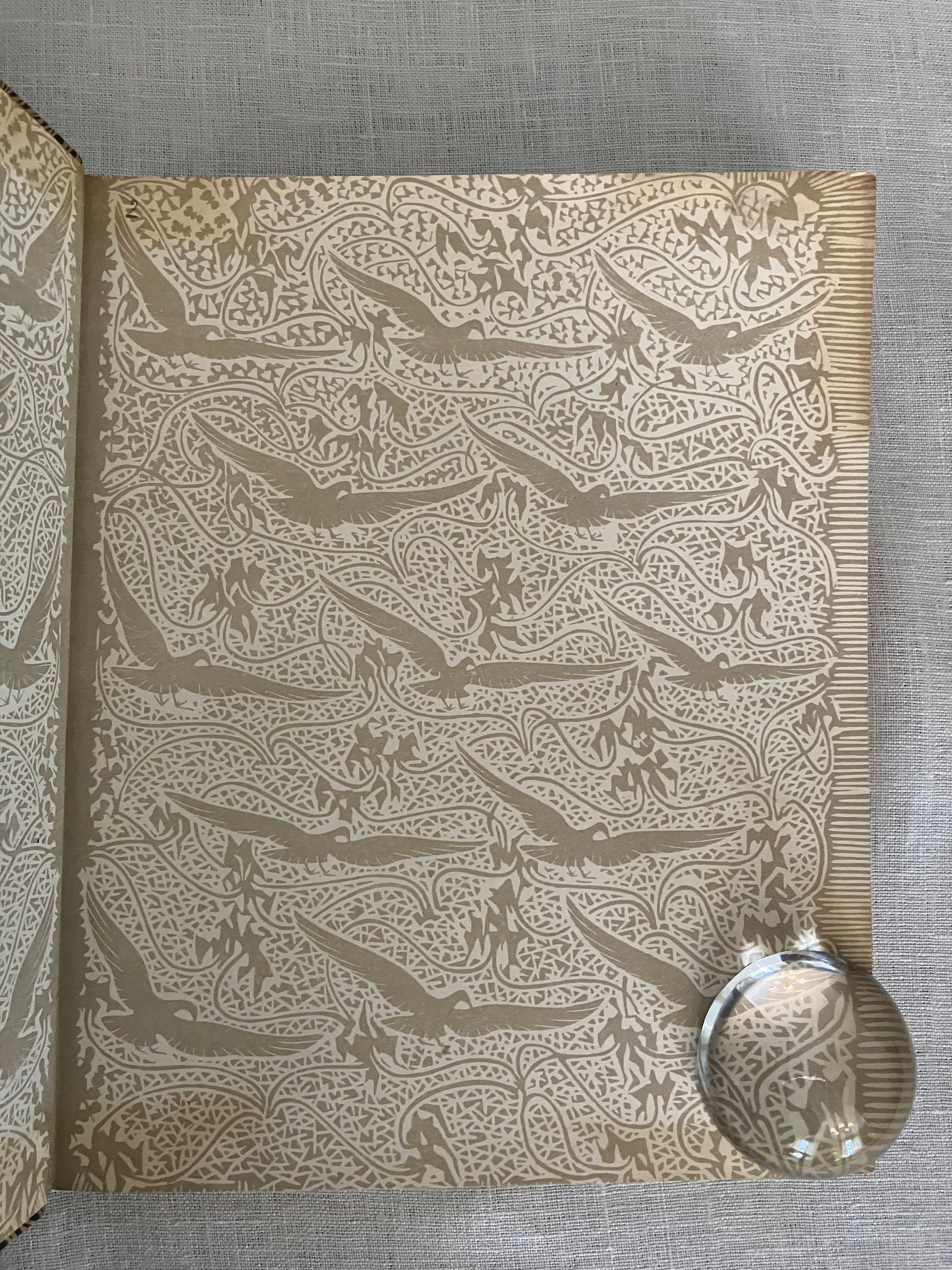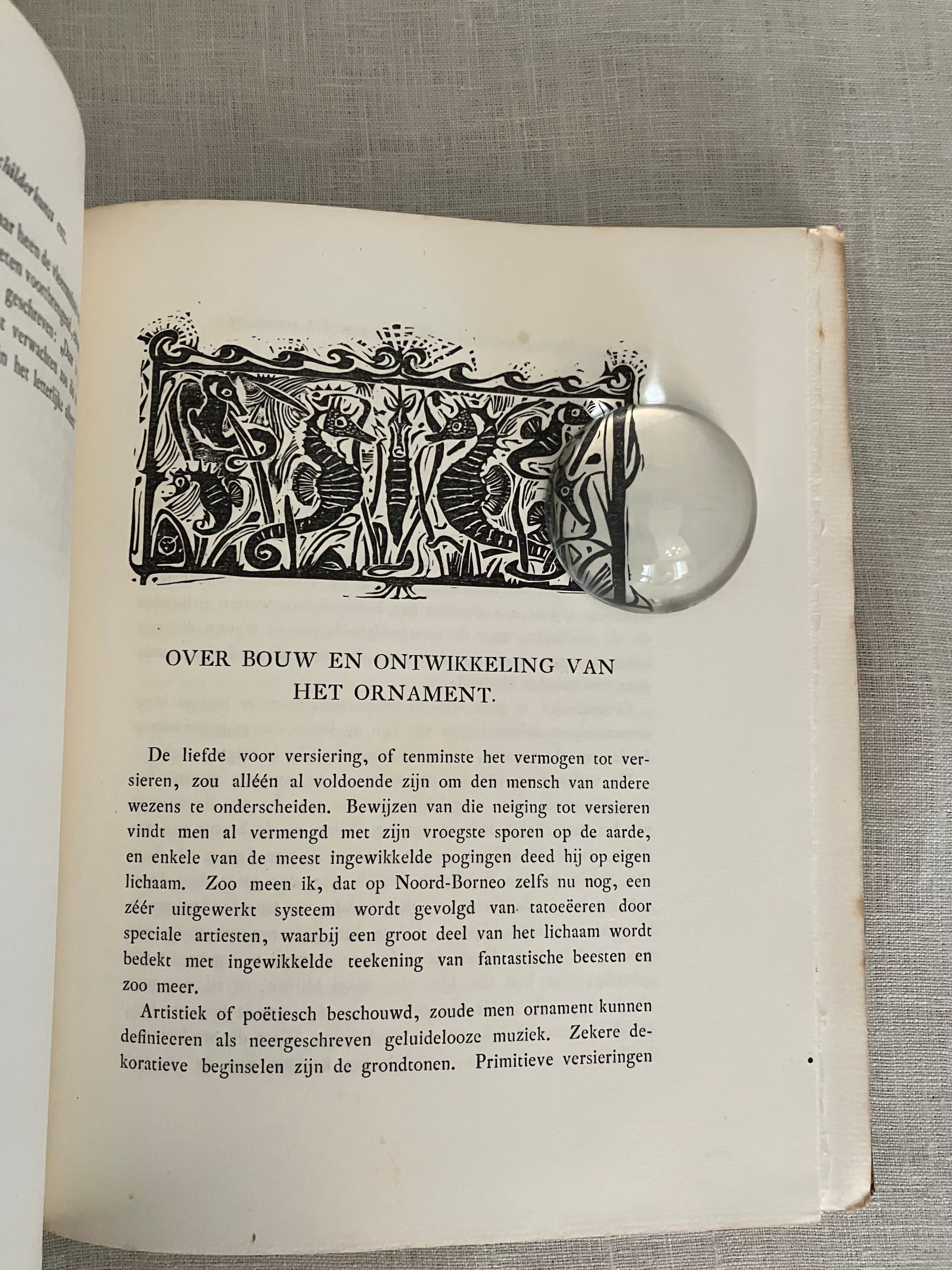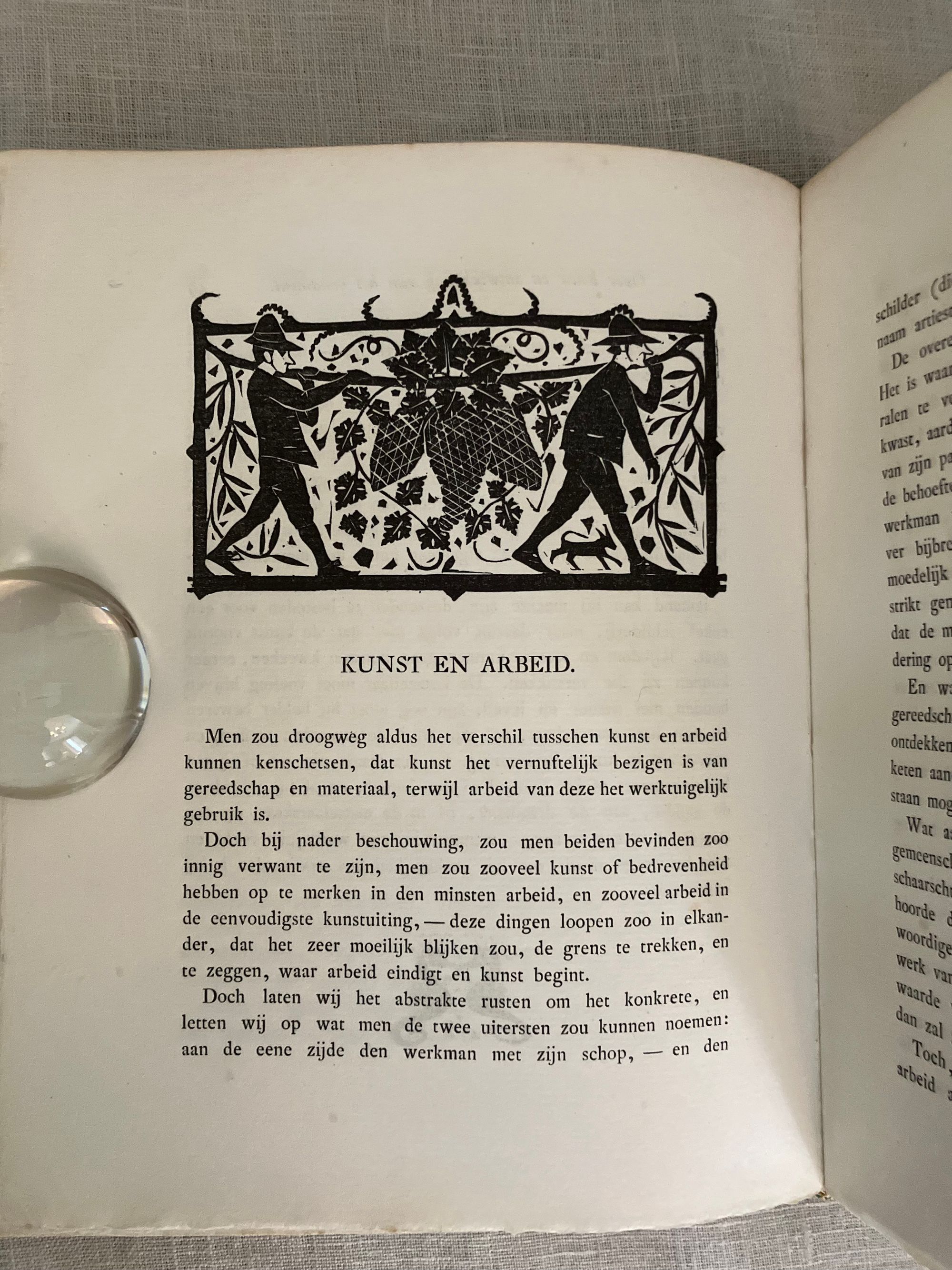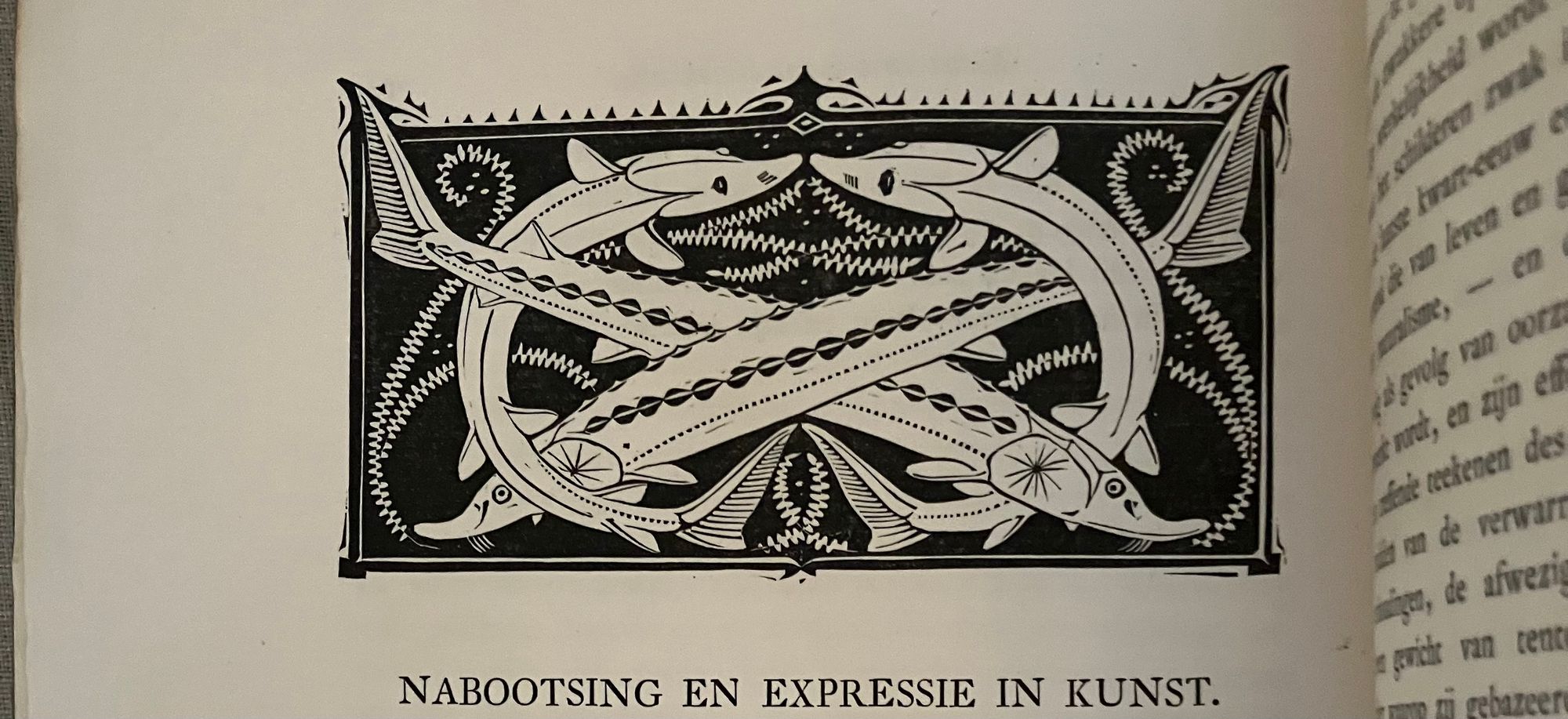 Hard cover, 8vo, in three-quarter leather binding over buff colored boards decoratively blocked in gilt with stunning Nieuwe Kunst Dutch art nouveau style pictorial bands along the joints and at the large triangular corner pieces of lobsters and perhaps abstracted oysters?, the legs of the shellfish intertwined with some sort of sea wrack. This gilt design carries neatly across the spine, where five sets of horizontal lines appear through small gaps in imitation of the cords which would sew a hard cover book together. The spine design continues across the hinges with the title and various runic-like colophons within gaps in the design. These refer to (from the top): the original English author Walter Crane; translator JV; publisher SHB, and artist GWD. The rear hinge area features the lobster motifs in a more simplified form. The title vignette to the front board is printed in red, and forms part of a diamond shaped carved woodblock Javanese batik design, which is said to also inform the triangular and other geometric aspects of the design (See Purvis, p. 128 on Javanese design influence; also Elliot, p. 86.) Dijsselhoff also designed distinctive the batik-like endpapers printed in gold. This well-made book has been recognized for using only the best of materials, including "real" gold for the gilt and printed on heavy rag paper. **CONDITION: Very Good or better. Lacking original decorated dust jacket. A few scuffs to the paper covered boards. Light wear at outer joints. A few scuffs to the spine. Slight offset browning to corners of endpapers. The gold remains bright. **"A "masterpiece of Nieuwe Kunst book design and Dijsselhof's most significant contribution to the movement." (Purvis, p. 127)**Dutch ARTIST and book cover designer GERITT WILLEM DIJSSELHOFF 's 1886-1924) contribution to this work is particularly noteworthy with its unusual lobster and seaweed themed bands of gilt illustration on the binding, his woodblock illustrated endpapers and thirty-five wood carved block printed headers and footers in the art nouveau style, many of which feature animals, fish and birds. Dijsselhoff was an accomplished painter, who produced naturalistic color studies of fish (and lobsters) observed from visits to the Natura Artis Magistra, the famous zoological gardens and aquarium in central Amsterdam, of which he was a member. The firsrt edition was published in 1893. TRANSLATOR Jan Veth (1864-1925) was Professor Extraordinary in the History of Art and Aesthetics (1906) associated with the Rijksakademie voor Beeldende Kunsten in Amsterdam, in addition to being a talented portraitist, art critic and designer of at least one book. This particularly innovative book design has been extolled by such art historical luminaries as Nikolaus Pevsner, Ernst Braches and Alston W. Purvis as exemplary of the Dutch expression of "Nieuwe Kunst;" or the art nouveau in Holland as applied to architecture, paintings, crafts, posters, vases, furniture, ornament and book design from roughly 1892- 1906. (See Purvis, p. 127-28.) Walter Crane's essays in the Claims of Decorative Art, part of the larger work, "Art and Society" first published in London in 1892, were influential with his Dutch counterparts, with principles for good design, and the argument that moral good in society came from the social democracy promoted by support of the craftsperson. Conversely, that mass industrialization had destroyed the traditional links of fellowship which had in the past bound craftsmen and artists together. **REFS: I.M. Elliot," Batik Fabled Cloth of Java," (New York: Clarkson N. Potter and Crown Publishing, 1984--our number 7953). Braches, Ernst, Dutch Art Nouveau... ( Amsterdam: De Buitenkant, 2009) pp. 28-32. A.W. Purvis, "Feast of Dutch Diversity: Nieuwe Kunst Book Design" from The Journal of Decorative and Propaganda Arts 2002, Vol. 24 Designm Culture, Identity: The Wolfsonian Collection (2002)pp. 118-139. Scarce to market. (AMJ)