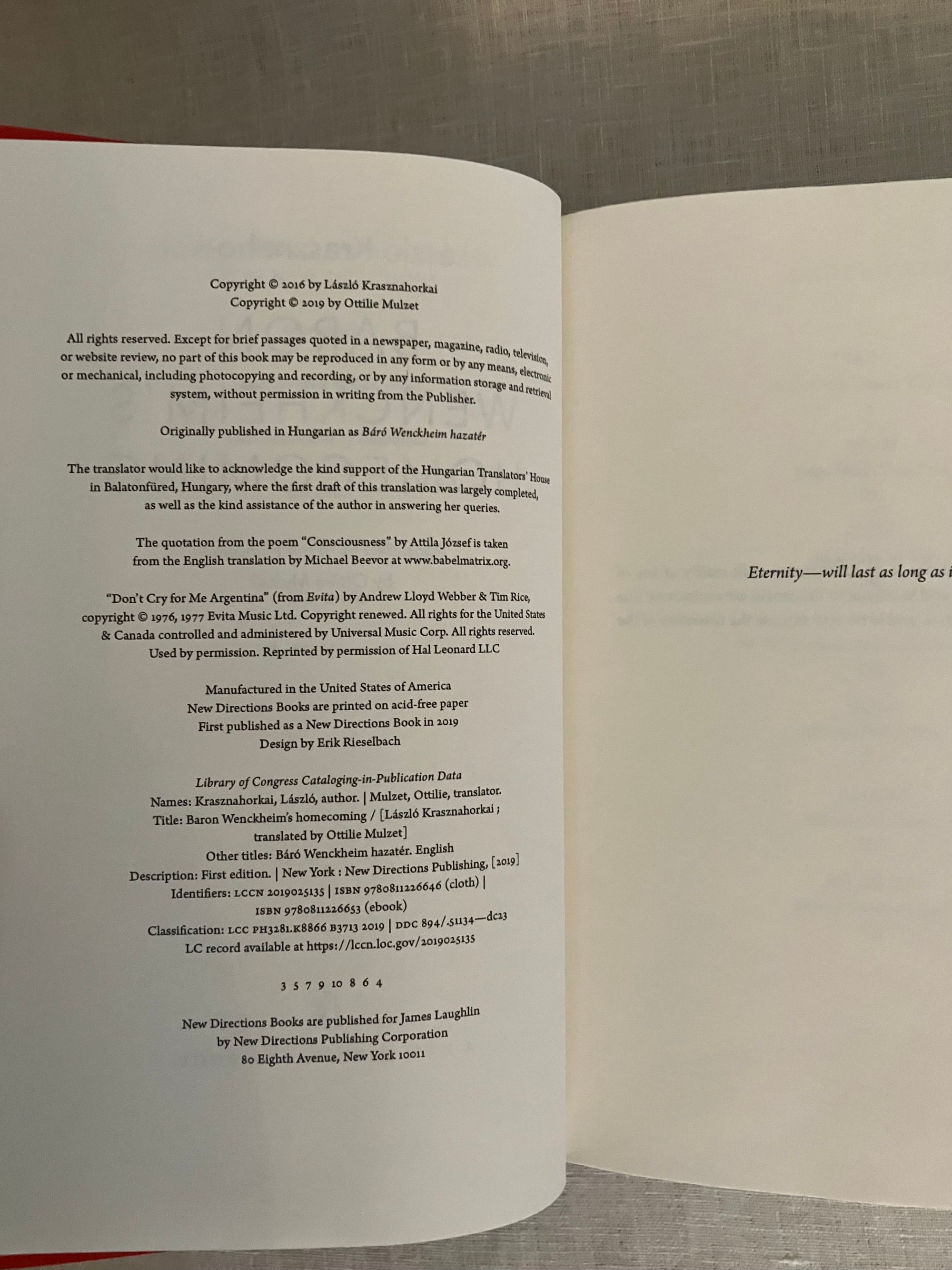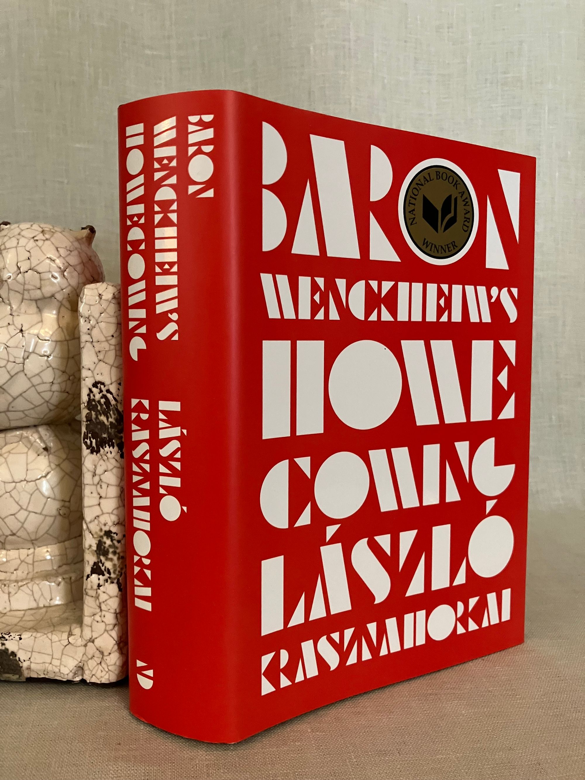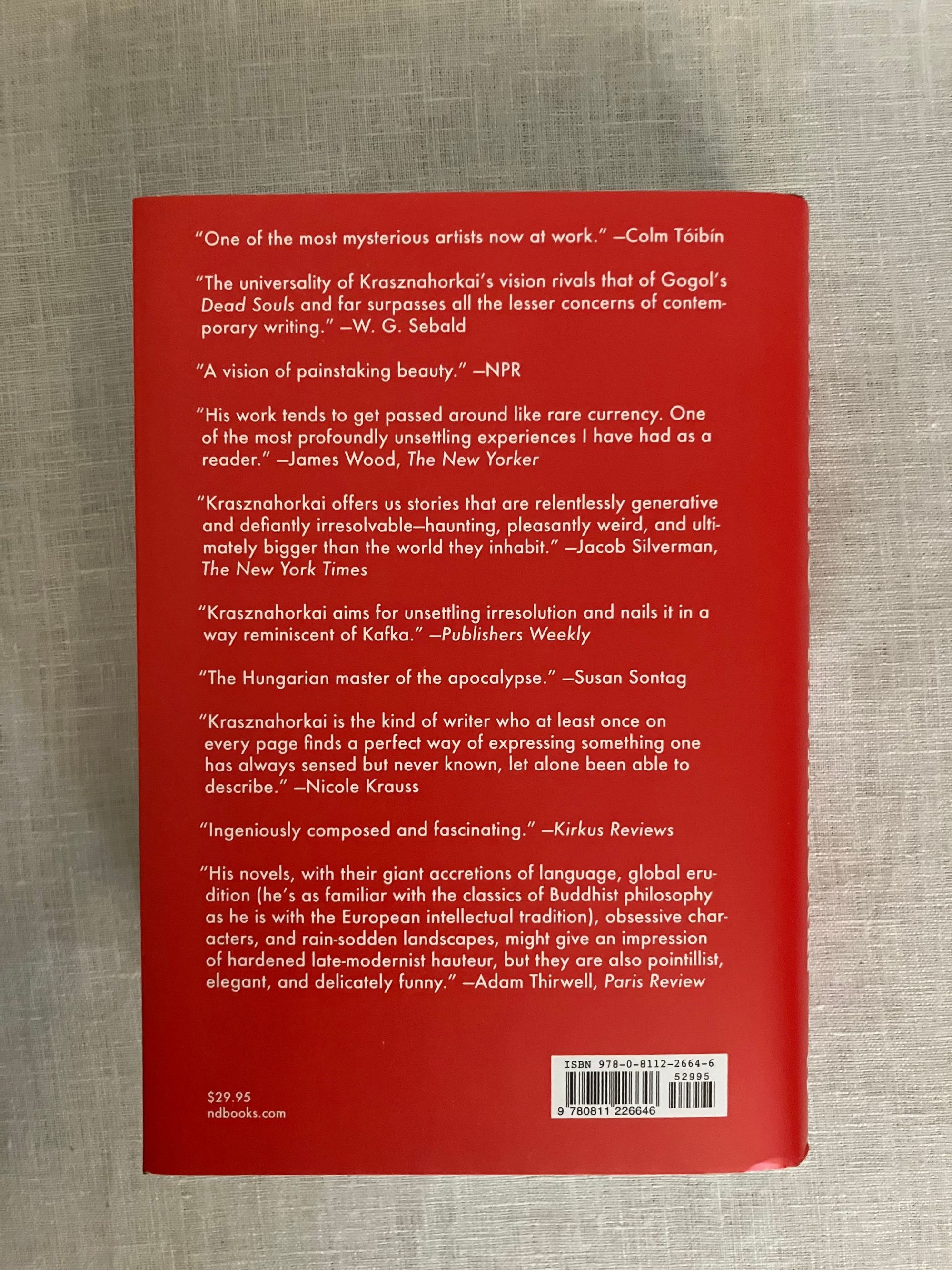 Hard cover, 8vo, in black cloth, titles in white to spine, in the original red and white dust jacket printed with the gold seal of the "National Book Award Winner" (won for translated literature, 2019) with red endpapers, 558pp. Third printing, 2019. CONDITION: Fine in a Fine unclipped dust jacket.**"Set in contemporary times, [the book] tells the story of a Prince Myshkin-like figure who decides to return to the provincial Hungarian town of his birth. Having escaped from his many casino debts in Buenos Aries, where he was living in exile, he wishes to be reunited with with his high school sweetheart, Marika. What follows is an endless storm of gossip, con men, and local politicians, vividly evoking the small city's alternatively drab and absurd existence. All along the Professor,--a world famous natural scientist who studies mosses and inhabits a bizarre shack in a desolate area outside of town--offers long rants and disquisitions on his own attempts to immunize himself from thought. Spectacular actions are staged, death and the abyss loom, and doom is brought down on the unsuspecting residents of the town." (blurb) ISBN 9780811226646. Hungarian Winner of the 2025 Nobel Prize for Literature.