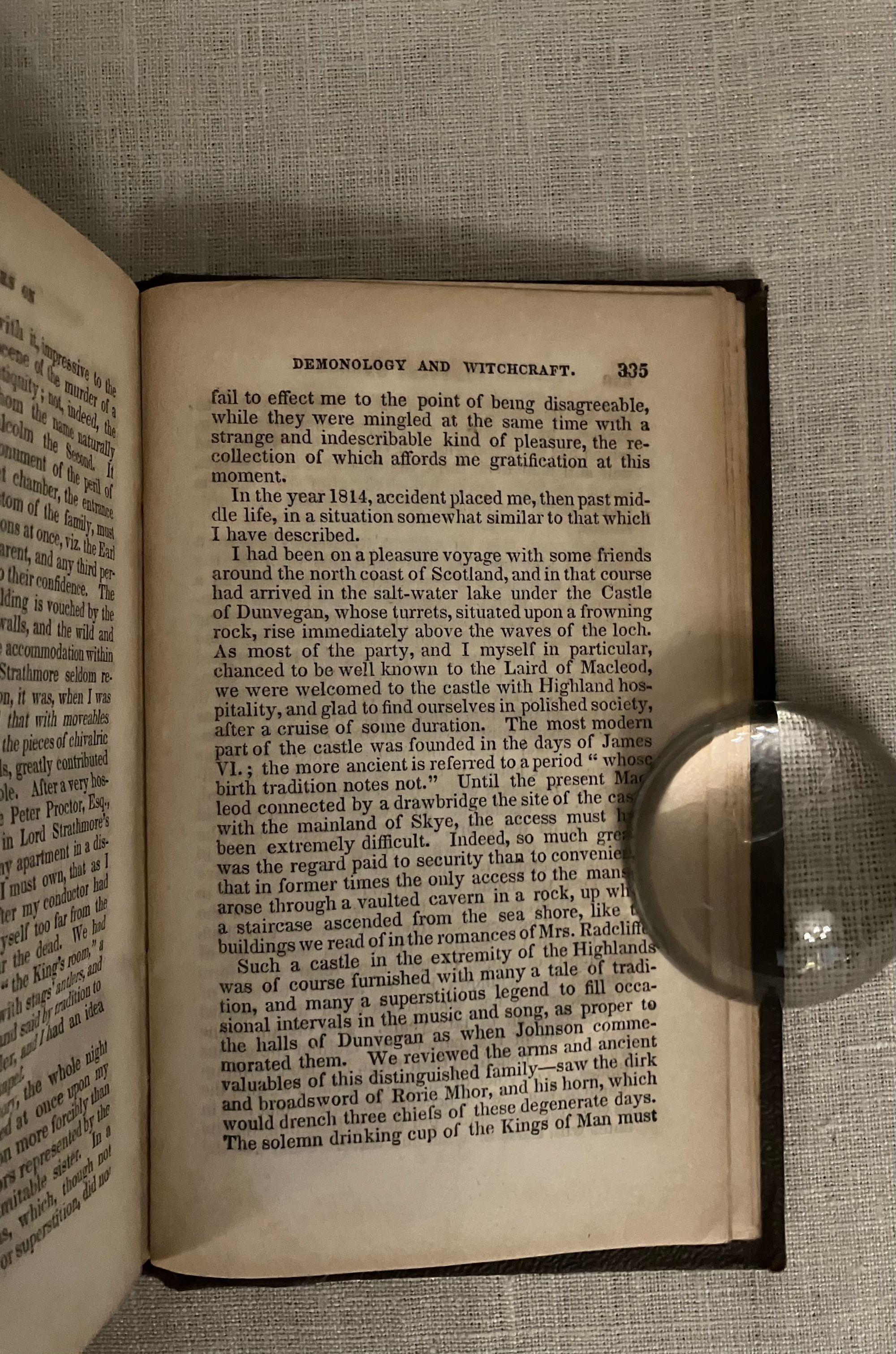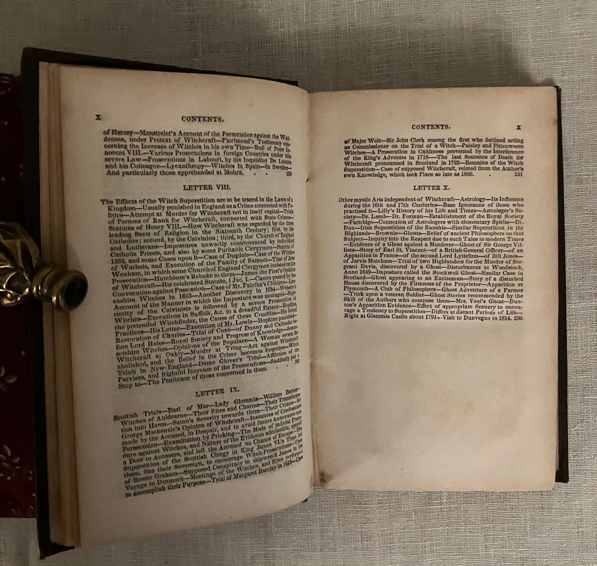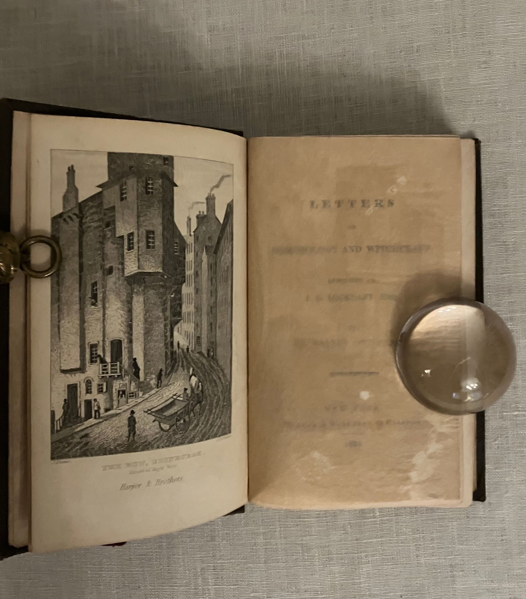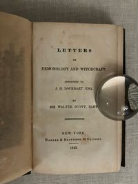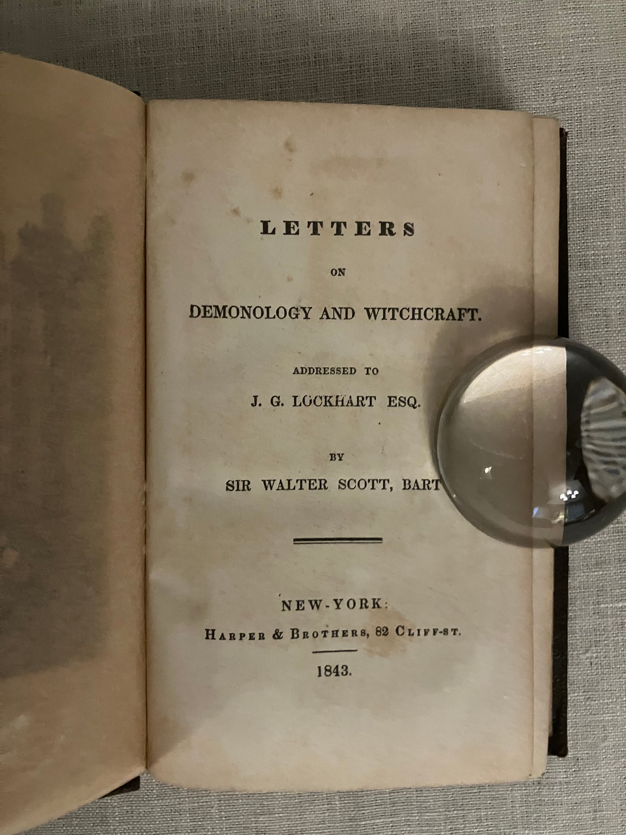 Reprint. (First published London: John Murray, 1830; first American editn. New York: Harper's 1830.) Hard cover, 24mo in publisher's original coarse black cloth, the boards plain, with Gothic architectural vignette in gilt to the spine with the series title; THE FAMILY LIBRARY/ No. 11" within, and the title "LETTERS ON/DEMONOLOGY/AND/WITCHCRAFT" near foot of spine. Tissue-guarded frontispiece engraving titled "The Bow, Edinburgh, Home of Major Weir," identified artist, "J. Skene" and engraver "S.H. Gimber." Frontispiece appears to be a copy of the John Murray original (that was engraved by Edinburgh's William Lizars,) although noticeably altered to not be a nighttime scene. Perhaps the original was thought too spooky for the Family Library? Bow Street, remnants of the original medieval quarter of the city, still exists in the Edinburgh city center. It is illustrated here in relation to Scott's recounting of the ghostly tale of "The Wizard of the West Bow, Major Thomas Weir (1599-1670), "presumed occultist and the last man executed for witchcraft in Scotland, " as detailed in Letter IX. The contents are a good anthology of stories spanning pre-Roman Celtic and Norse traditions, Irish and Celtic folklore of fairies and banshies, ghosts, witches, warlocks, charm-casters and fortune tellers. The Salem witchcraft trials are mentioned, as well as traditions in Spain, Finland and France. The connection between persecution of witches and political, personal and religious expediency is drawn. Stories about Scottish castles feature widely. Astrology of William Lilly is mentioned. In all, "belief in the crime" of witchcraft "becomes forgotten."CONDITION: Very Good Plus, or better. Exterior is very clean and sharp with one small dent lower rear board. Inside, some browning to endpapers, ownership signature in pencil dated 1830, tissue guard and pages are lightly age toned. Hinges and joints in order. Edges a bit dusty. Slight lean. Overall, in nice condition. COLLATION: [2], un-numbered frontis. illus., title,[blank], [vii]-xi (misnumbered,) [13]-338, plus 1p. publisher's series advertising, [3]pp.**This popular title was not only reprinted in America, but also translated into French and Italian within a decade of its first appearance. Written by the Scottish "Waverley" novelist, SIR WALTER SCOTT (1771-1832) as a series of letters to his son-in-law, J.G. LOCKHART (1794-1854). Lockhart was editor of the Murray's Family Library Series, a series of 80 titles published in London between 1829 and 1847. (These were inexpensive editions at the affordable price of 5 shillings.) Lockhart had married Sophia, eldest daughter of Sir Walter Scott, and resided with her in a small house on the Waverley novelist's Abbotsford estate in the Scottish borders while Scott was still alive. ** Proposed as a "popular miscellany" by the Author, rather than an exhaustive scholarly tome, the book is organized by a series of letters, or chapters, on a variety of associated topics. These include a general introduction to tales of the spiritual realm, such as the ghost tales found onboard ships and the fields of battle, somnambulism and the like. This book was actually one of the last published by Sir Walter Scott, during a time when he had suffered a number of seemingly insurmountable personal and financial setbacks. A "mistake of a trade connection" with the publishers at Ballantyne of Edinburgh (in 1826) had threatened the Author with the shame of bankruptcy; instead, he took on 130,000 British Pounds of debt. As memoirist Henry Morley said," no tale of physical strife could be as heroic as the story of the close of Scott's life, with five years of a death-struggle against adversity, animated by the truest sense of honour." (p. 7) The recent death of his wife of thirty years deeply affected him and perhaps brought on a morbid spiritualism. But Scott also foresaw the nearing of his own demise at this period; an attack of apolexy (or a stroke) in 1830 would lead to his death on 21st Sept., 1832 "The slight softening of the brain found after death had then begun...it gave to Scott's "Letters on Demonology" (written within a month of the seizure) what is for us now a pathetic charm." ( ibid.,p.6). H. Morley," Introduction" to "Letters on Witchcraft and Demonology..." ( London. G. Routledge and Sons, 1887.) Watson 677. (AMJ)