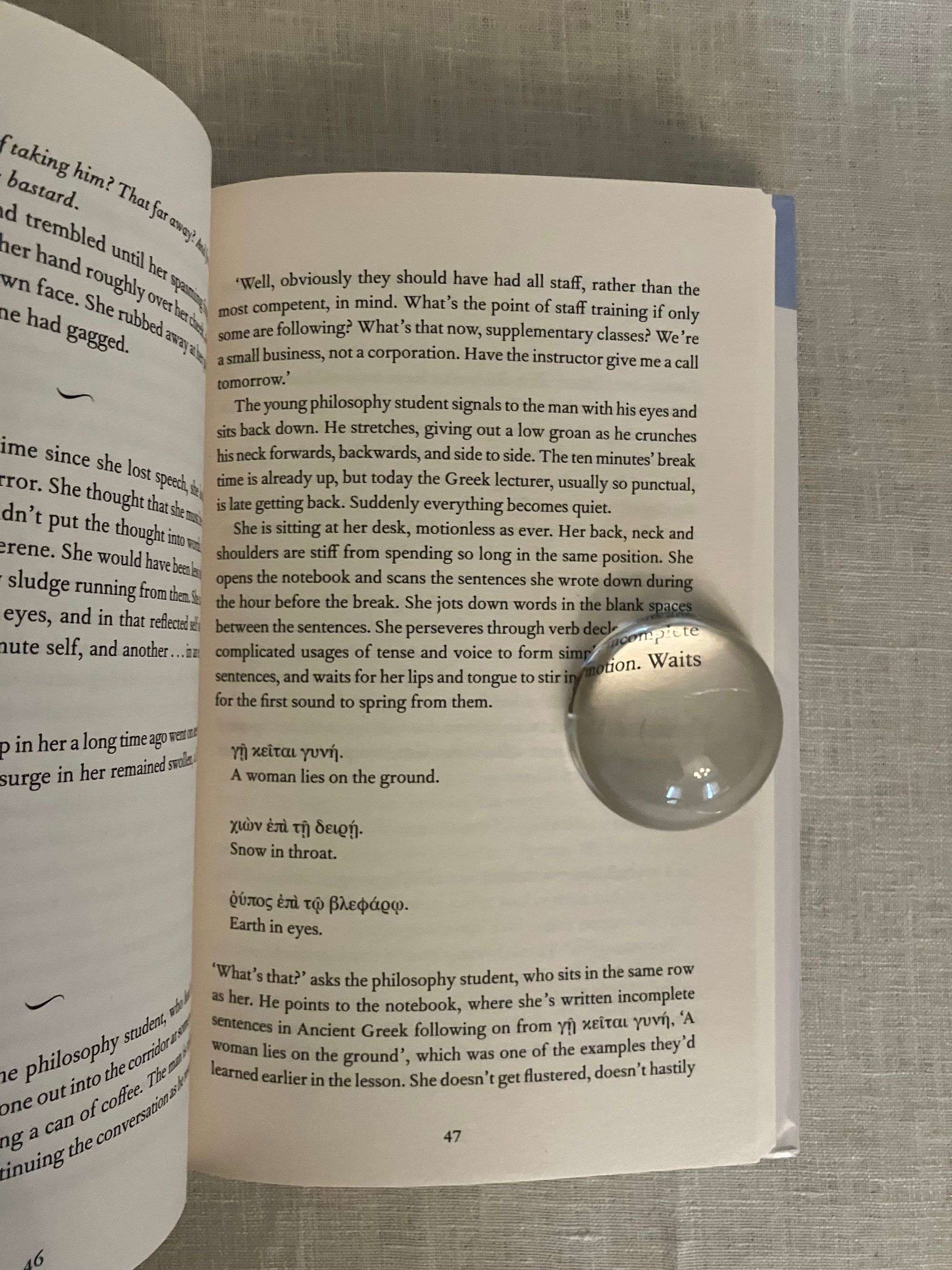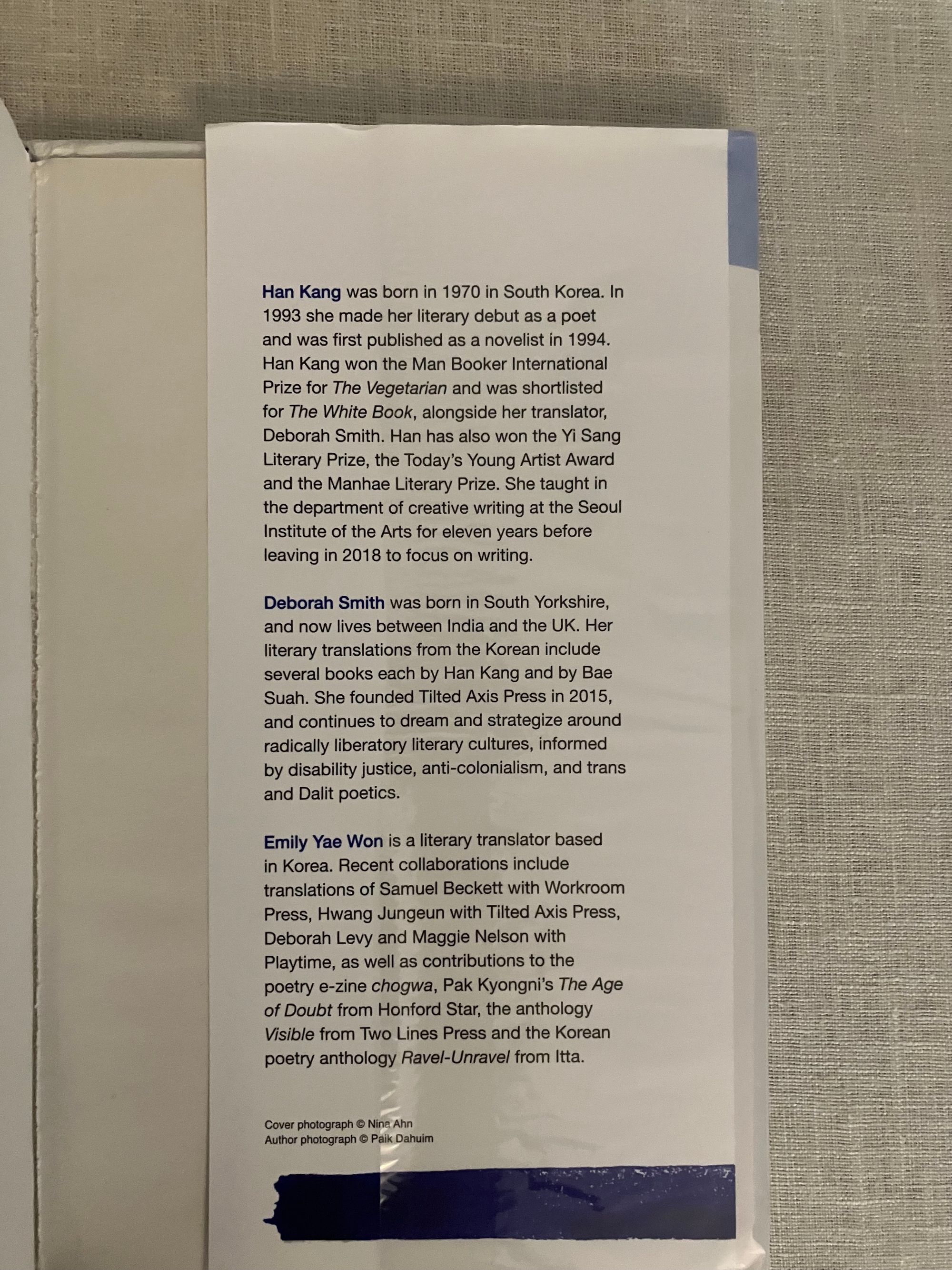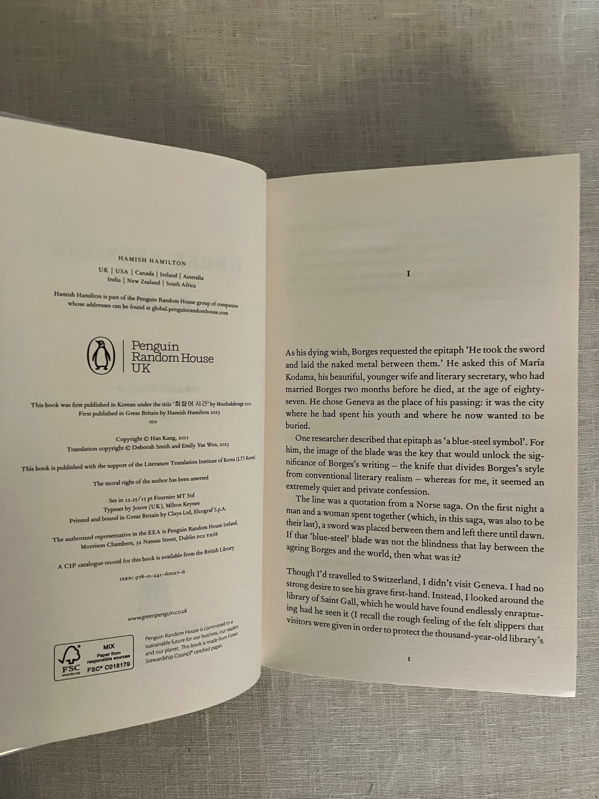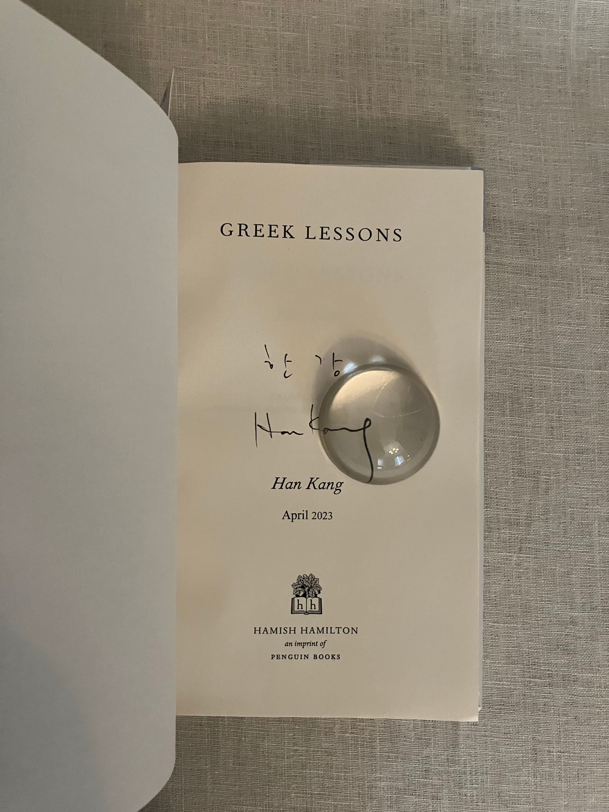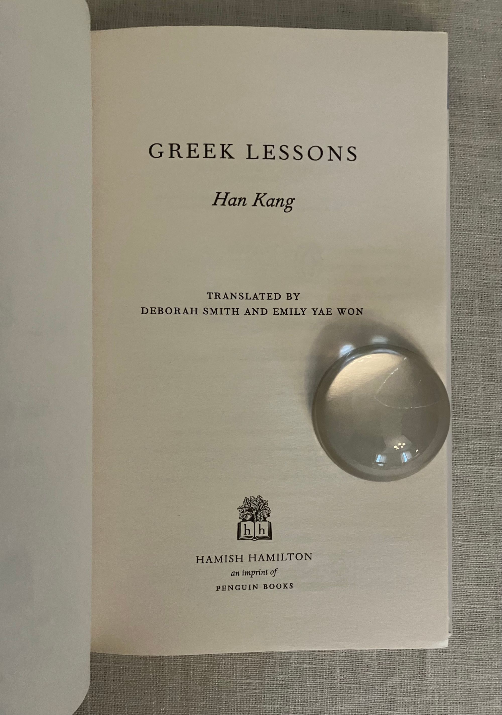 Hard cover, 8vo, in white paper covered boards, titles and greek key design to spine in blue foil, in the original unclipped dust jacket, 147pp. Signed on half title in Korean and English. CONDITION: Fine, in a Fine dust jacket, in mylar protector. **A spare, yet most moving prose poetic work of great insight in which culture, time, and language are shown to be at once infinitely fragile, and yet enduringly strong. From the blurb: "In a classroom in Seoul, a young woman watches her Greek language teacher at the blackboard. She tries to speak but has lost her voice. Her teacher finds himself drawn to the silent woman, for day by day he is losing his sight. Soon they discover a deeper pain binds them together. For her, in the space of just a few months, she has lost both her mother and the custody battle for her nine year old son. While for him, it's the pain of growing up between Korea and Germany, being torn between two cultures and languages..." Winner of the 2024 Nobel Prize in Literature.