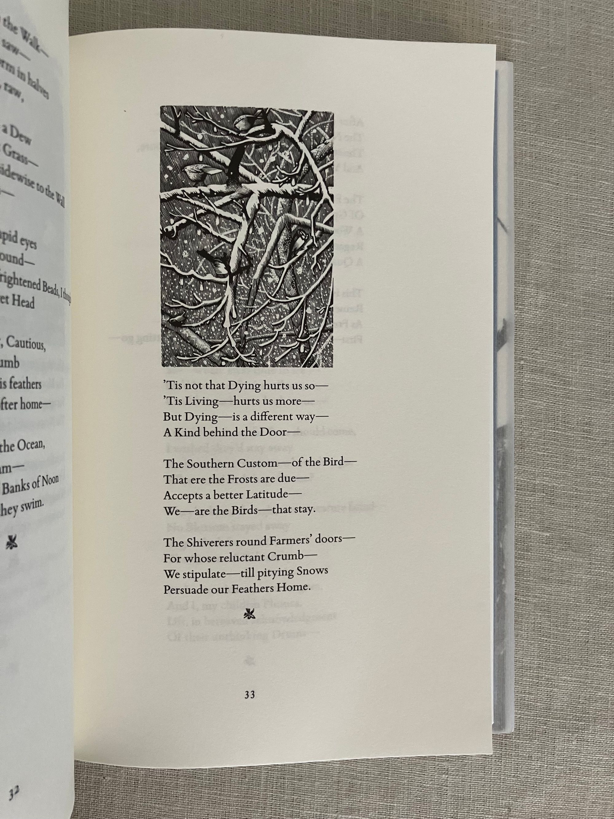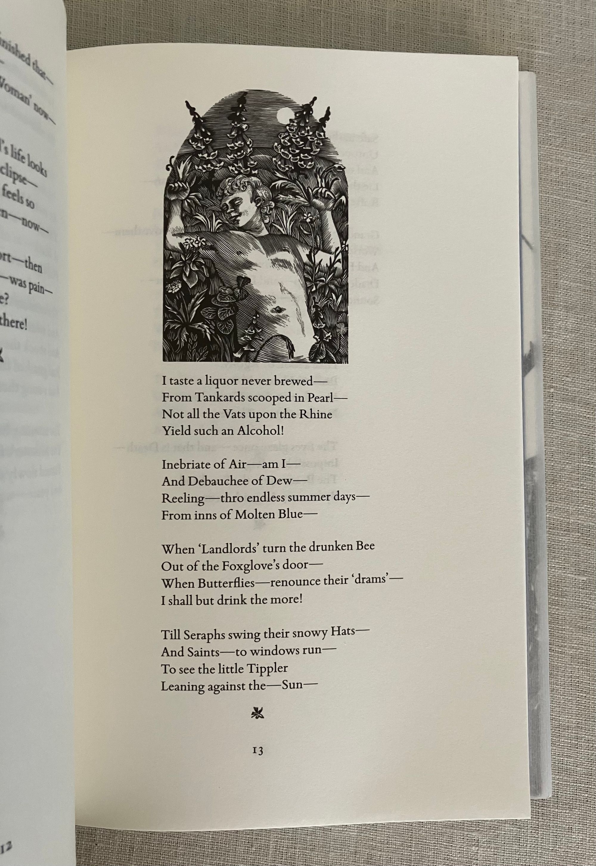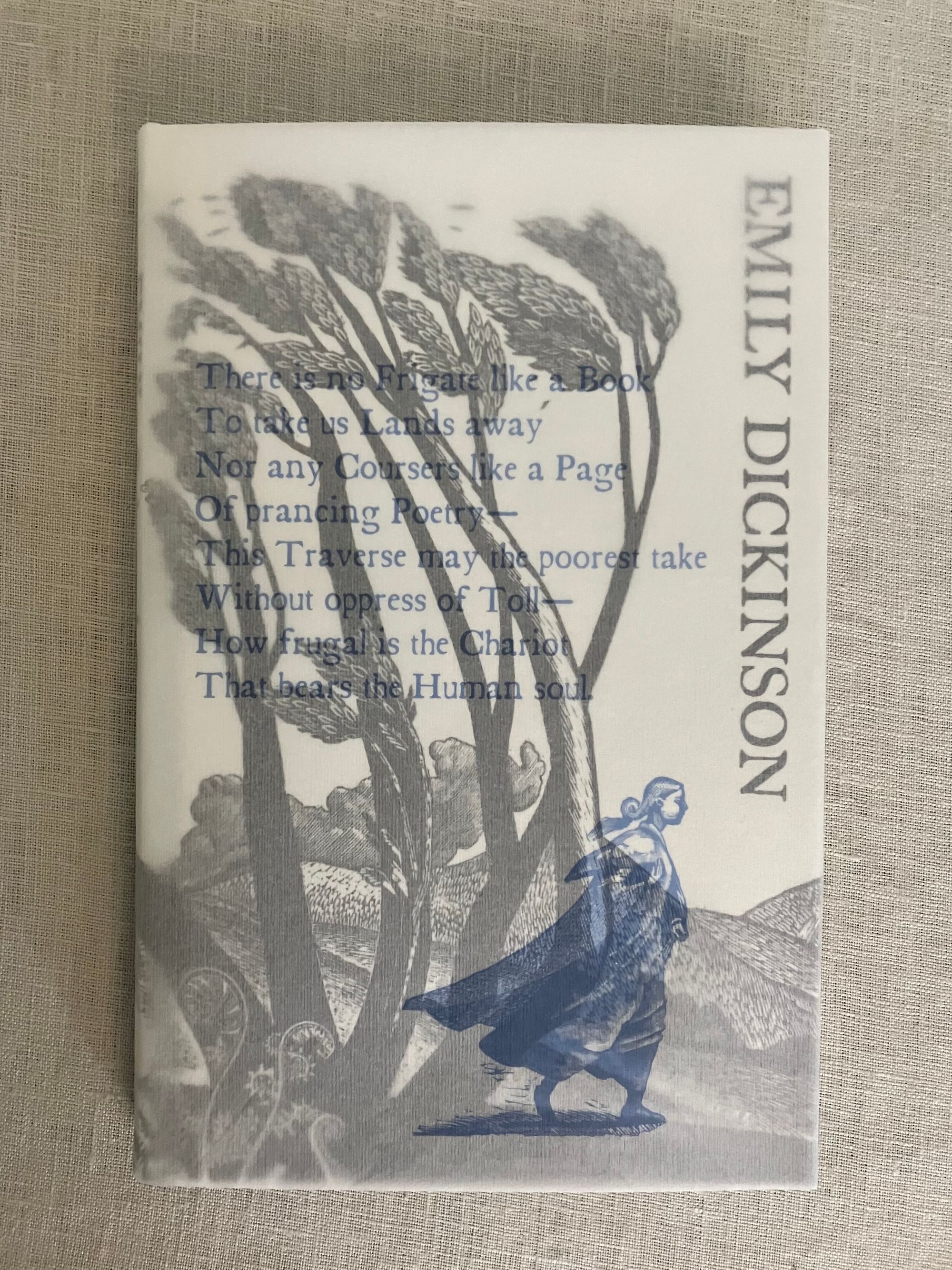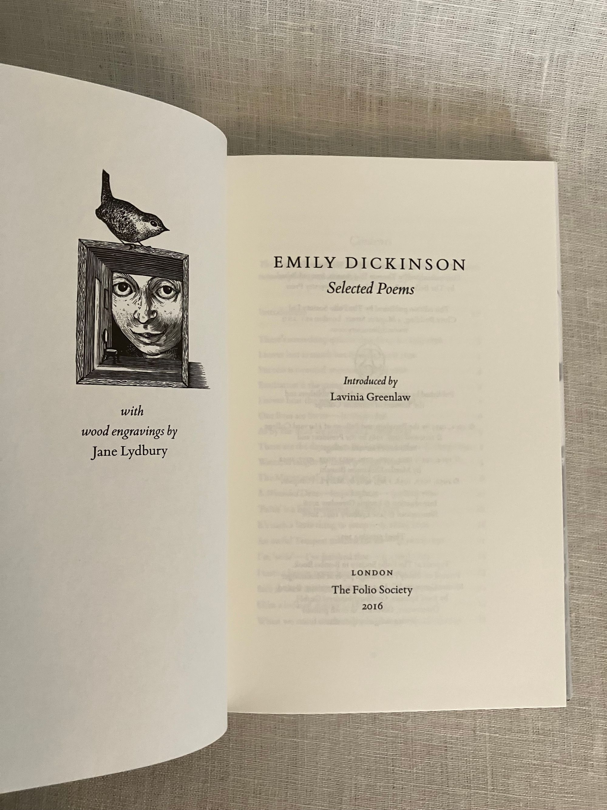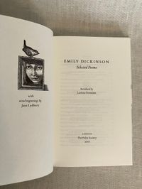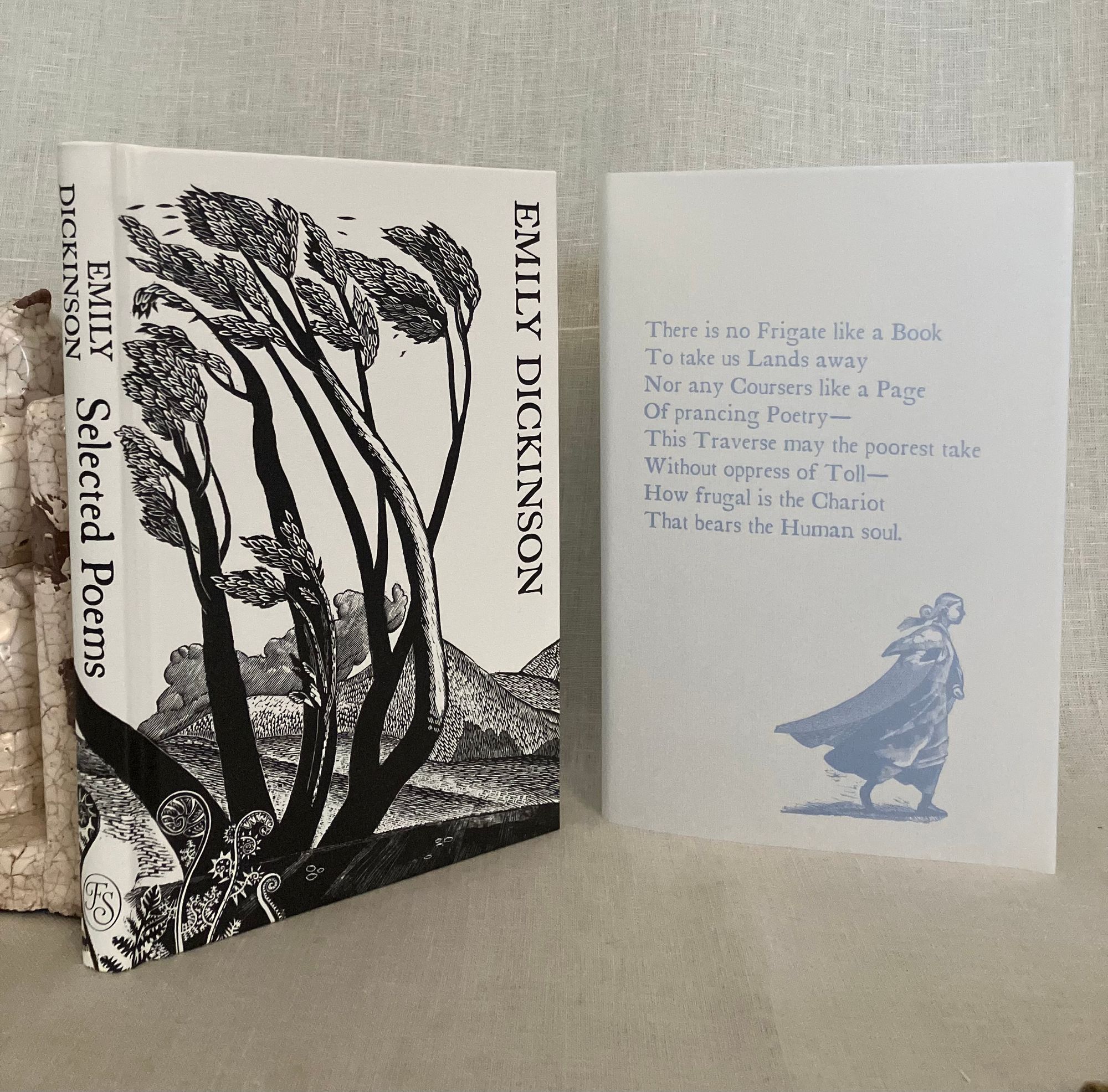 Reprint. (Third printing of the 2016 Folio Society edition.) Hard cover 8vo in white cloth printed in black with wood engraved landscape design by artist Jane Lydbury to all boards, and with a blue-printed semi-transparent parchment dust jacket printed with a female figure and quotation from the Author's verse. Patterned printed blue endpapers. CONDITION: Fine, like new. [xxiii], 136pp. including biographical introduction, and index of first lines. The famously reclusive Amherst, Massachusetts poet Emily Dickinson, (1830-1866) who had few of her verses published during her lifetime, is nonetheless regarded as a major American poet, whose spare words invite even the modern reader to ponder deeply on universal themes. " ...in a few words, her sharp imagistic perception can suggest deep meanings through unexpected turns and striking phrases." The poems in this edition follow "The Poems of Emily Dickinson". edited by Thomas H. Johnson, first published by the Belknap Press of Harvard University Press. REF: I. Haverstick et al, "Emerging Voices, American Women Writers 1650-1920" (New York: Grolier Club, 1998). A fresh, clean copy printed on Abbey rough paper, complementing the wood engravings of the London artist Jane Lydbury, whose illustrations, prints and engravings have appeared in various small press offerings as well as Folio Society editions.