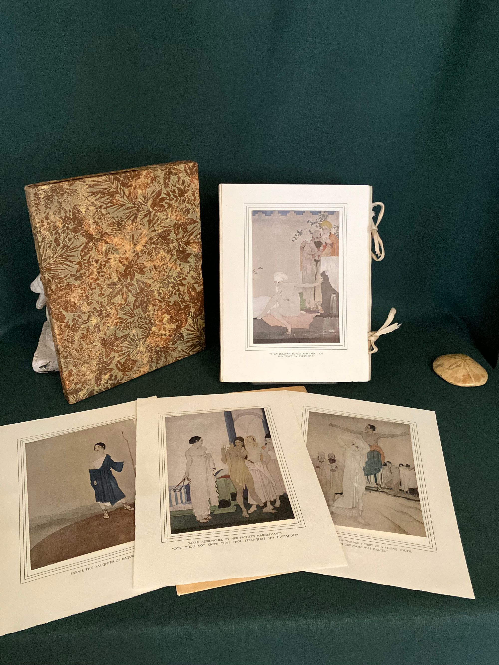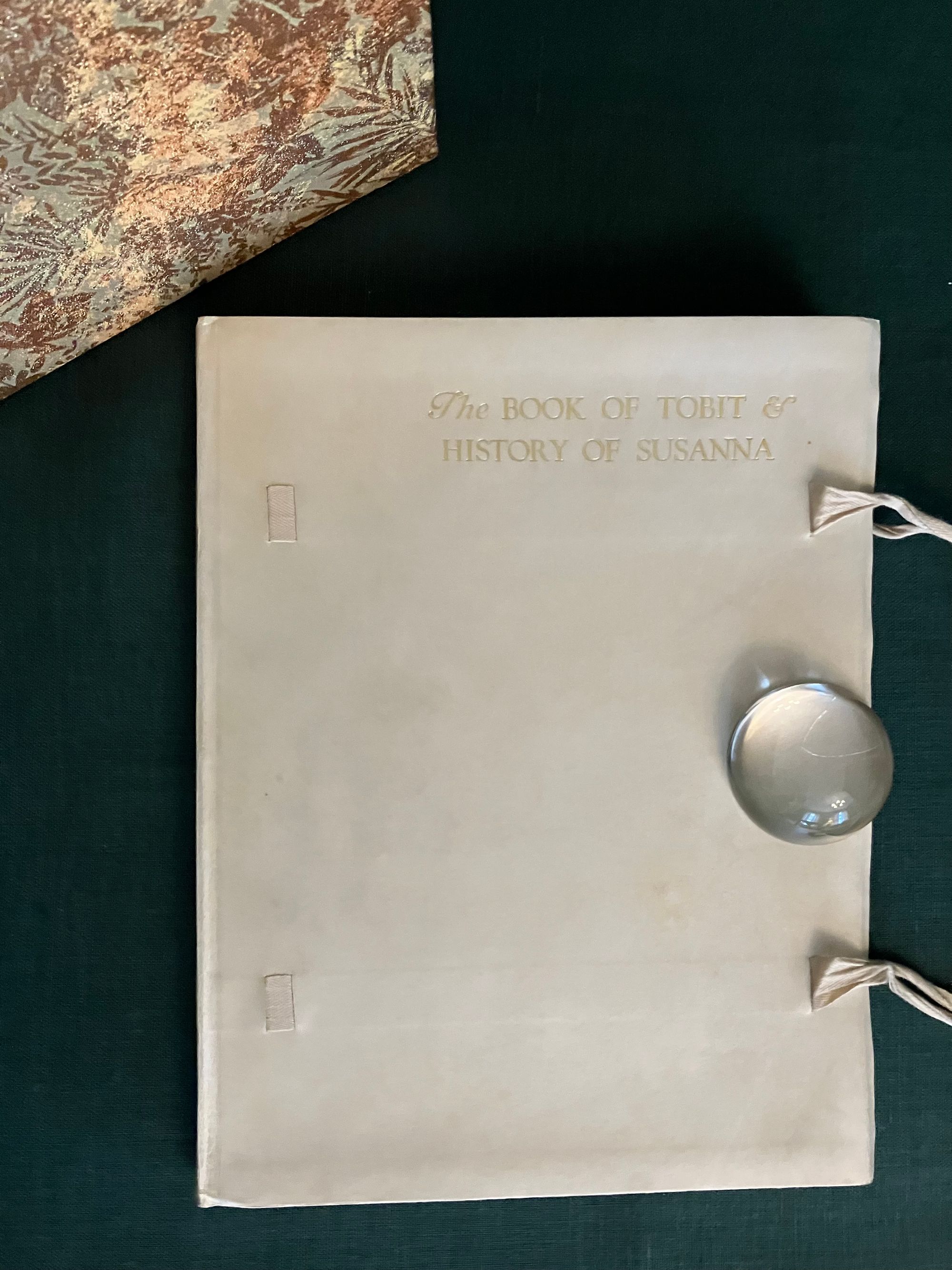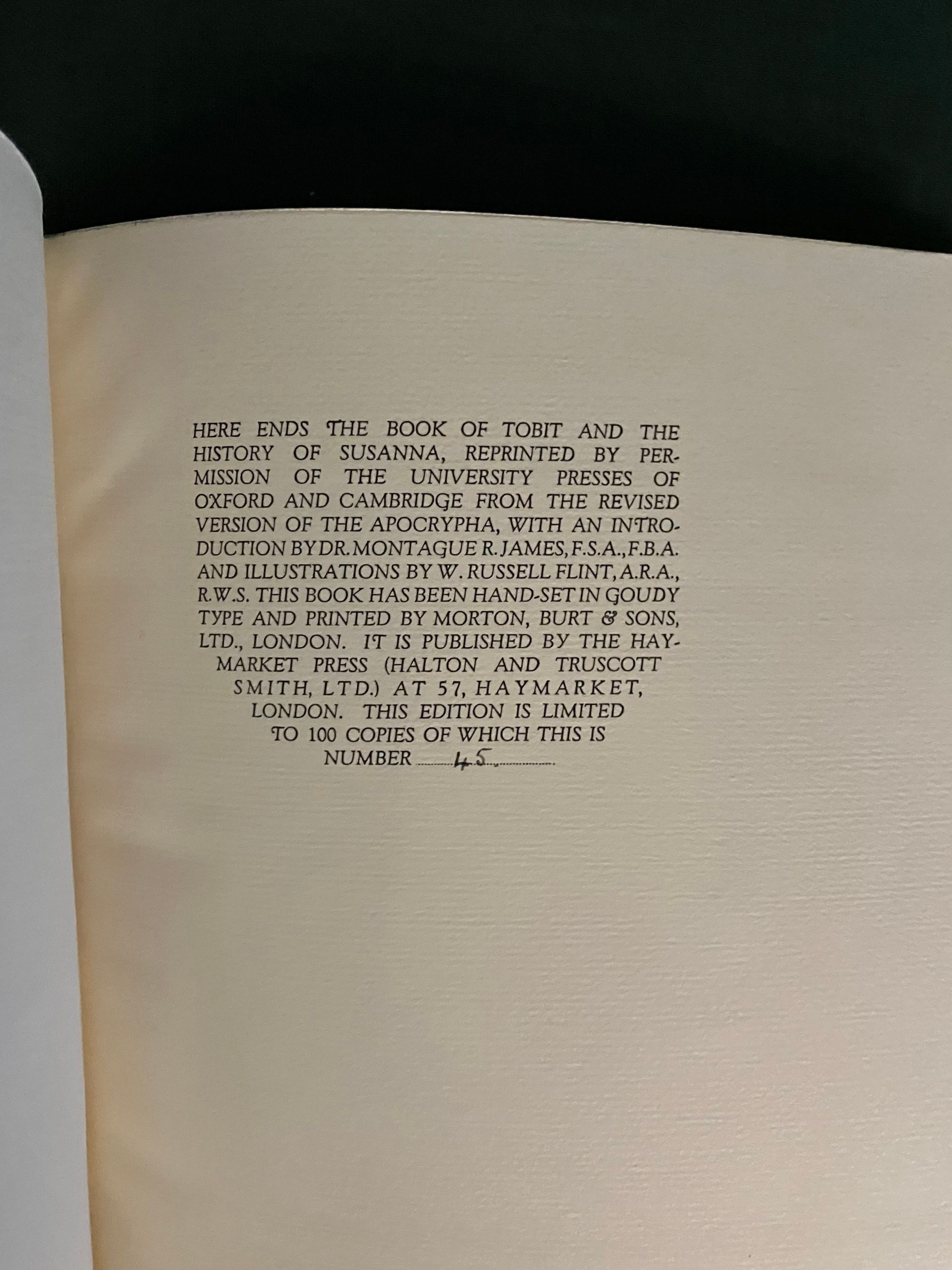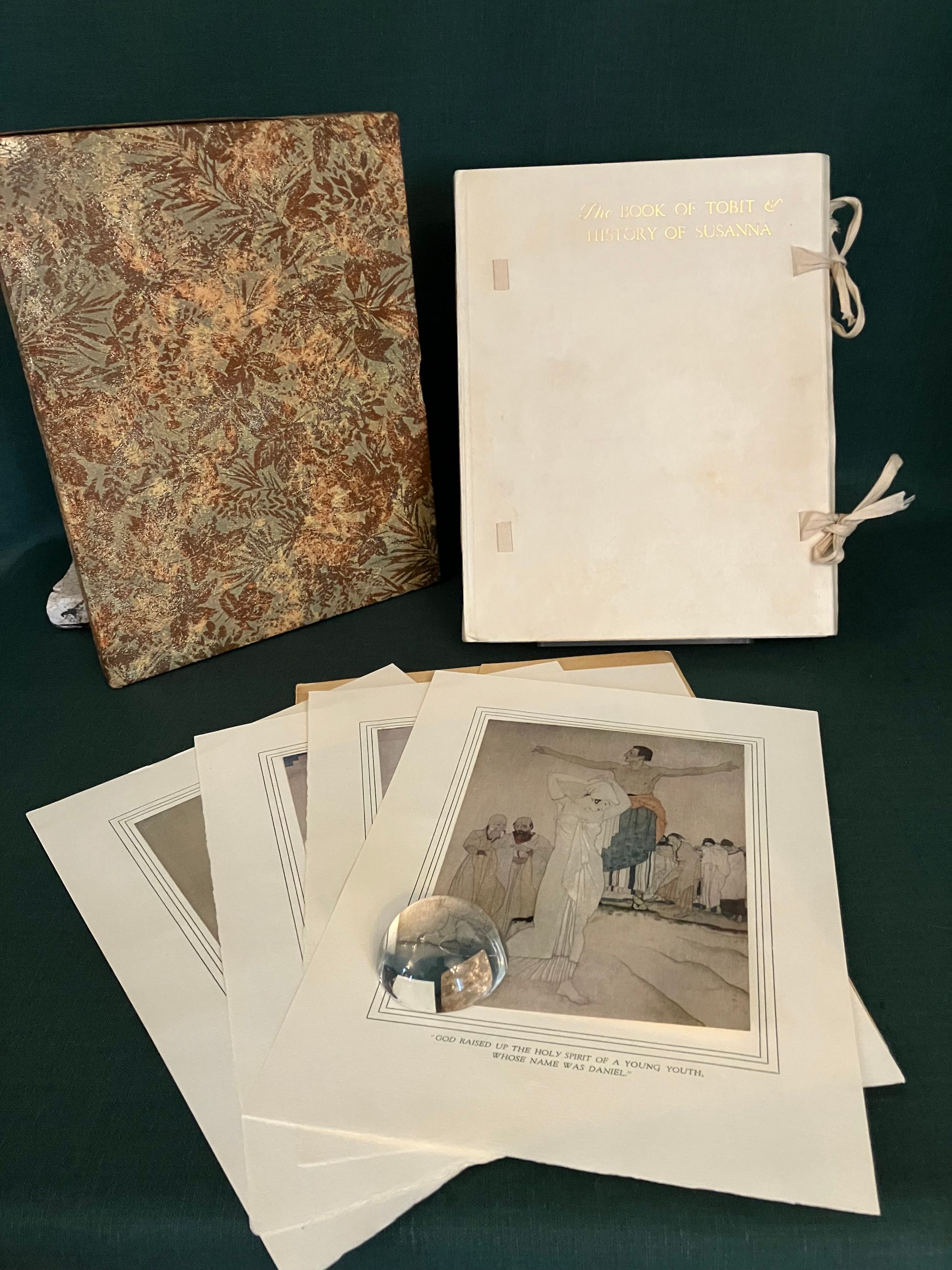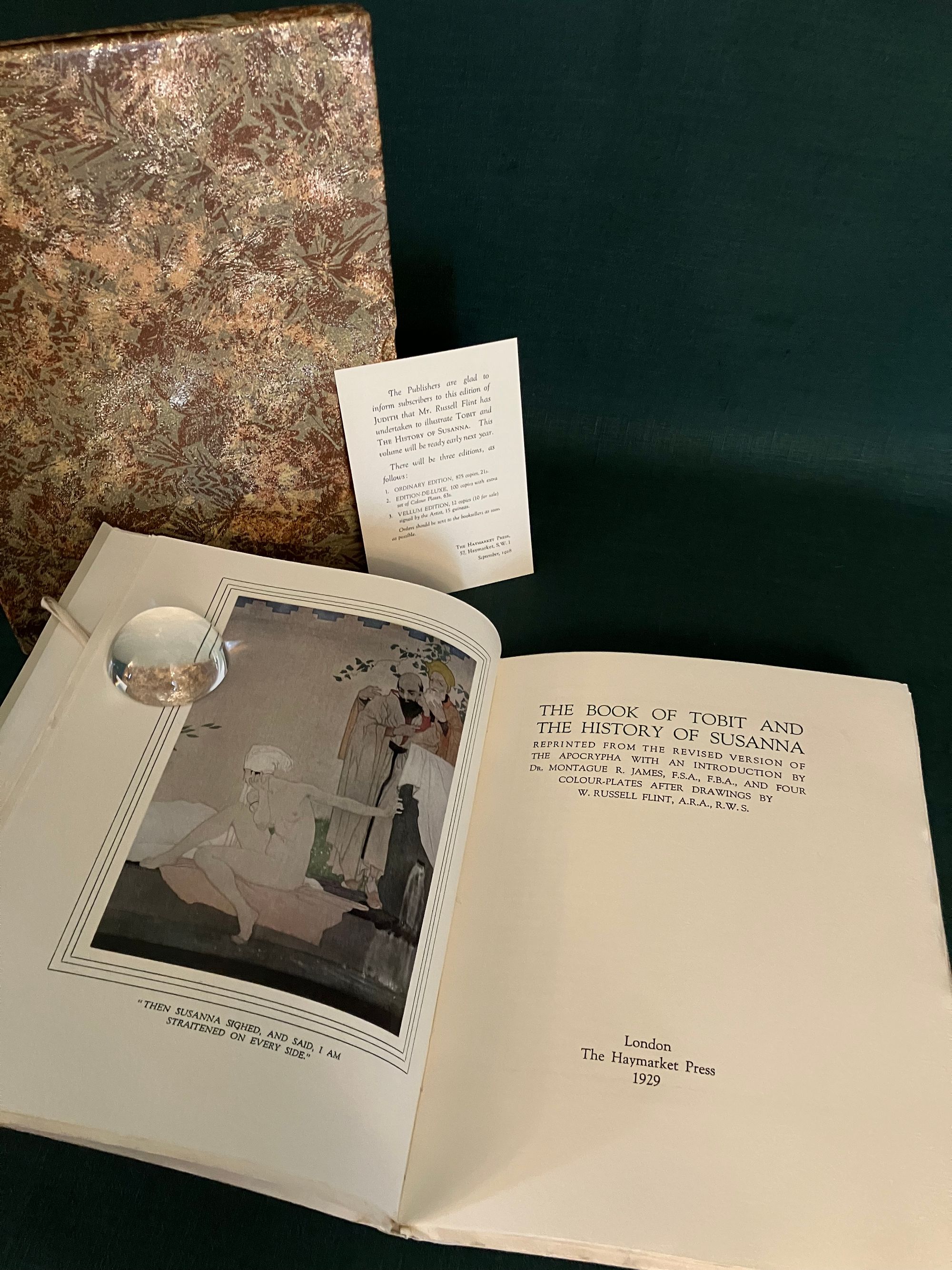 First Edition. Hard cover, 4to, bound vellum parchment over card, yapp edge, titles to front and spine in gilt, four intact natural woven silk ties, printed in black upon laid paper in Goudy typeface, within ruled borders, xvi, 47,[5]pp. Four full page chromolithographed plates of original watercolors by the Edinburgh, Scotland born Artist William Russell Flint (1880-1969) tipped in. Frontispiece entitled "Then Susanna Sighed, and said I am Straightened on Every Side." Also, an envelope with an extra suite of the plates, perhaps suitable for framing, is laid in. Original advertising card at the front identifies this as the Edition De Luxe, originally sold for 63s. Colophon: "Reprinted from the Revised Version of the Apocrypha," No. 45 of 100 copies for sale of this iteration. Original slipcase is restored with decorative foil paper-covering, the whole now protected with a mylar and velcro chemise.*CONDITION: Near Fine. The vellum parchment cover is lightly toned in places, as seen. One lightly bumped rear corner. Some pages are unopened. Previous bookseller notations in pencil to ffep. The plates are clean, and the extra set of plates are in similar, excellent condition. Envelope (containing extra plates) has one small closed tear. Slipcase is Fine. Cover is prone to a bit of warping, as is normal for this material. Overall, this is a really lovely book and definitely gift-worthy. **Scottish Illustrator, painter, engraver and designer Sir WILLIAM RUSSELL FLINT studied in Edinburgh at Stuart 's Melville College and later at the Heatherley School of Fine Art in London. His work as a commercial illustrator included pieces in the Illustrated London News, posters, and a number of books, including a famous version of Malory's Le Morte D'Arthur (1910). He became President of the Royal Society of Watercolorists in later life, and was knighted in 1947. **Here, the illustrations are composed of two scenes from the first story, "THE BOOK OF TOBIT" including the "Sarah Reproached by her Father's Maidservants: Dost Thou Know that Thou Stranglest Thy Husbands?" and "Sarah, the Daughter of Raguel." Aside from the frontispiece mentioned above, the fourth illustration is found within the separately half-title paged "History of Susanna," entitled " "God Raised up the Holy Spirit of a Young Youth Whose Name was Daniel." Tobit, partially unsighted by bird guano, loses sight completely when attended by a physician. He sends his son Tobias to recover monies owed at Nineveh (upper Mesopotamia). Tobias is helped by the Angel Raphael, in disguise, who aids him by instruction on a potion which promises to drive out demons, as well as cure blindness. Tobias's lady friend Sarah is possessed by the demon Asmodius, who destroys her potential suitors. Back in Nineveh, Tobit regains his sight. **THE HISTORY OF SUSANNA came from the biblical Book of Daniel, was also judged by various canonical gatekeepers as apocryphal. This did not stop the story from having longstanding cultural influence. In it, the young woman Susanna, is spied upon by two elders while at her bath, taken within the expected privacy of a locked, walled garden at her home. When she refuses their demands, they endeavor to shame her, accusing her of adultery with a fictitious young man. Daniel unravels the truth after her arrest and trial. The story was widely known within different religious and cultural traditions (Greek, Jewish, Catholic, and Eastern and Oriental Orthodox for instance,) and was represented through the centuries in the arts. The Susanna story is also recounted in the original One Thousand and One Nights of Arabic folklore. **Compiler M.R. JAMES (1862-1936) who introduces this volume, is perhaps better known as an author of ghost stories. He was, however, a scholar, Professor, and finally Provost at King's College, Cambridge, deploying a double first in classics and archeology, in the study of architecture, history, and becoming a leader in the field of palaeography. He published at least one work in on the "Apocrhypha of the New Testament" reviewed in the Times Literary Supplement, 1 May, 1924: J. Cox, (1969). See our related M.R.James titles, nos. 9640 AND 8200.) J. Sutherland (1989) p. 326. DNB. (AMJ)