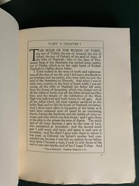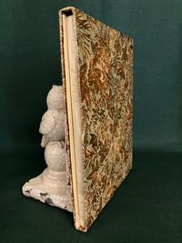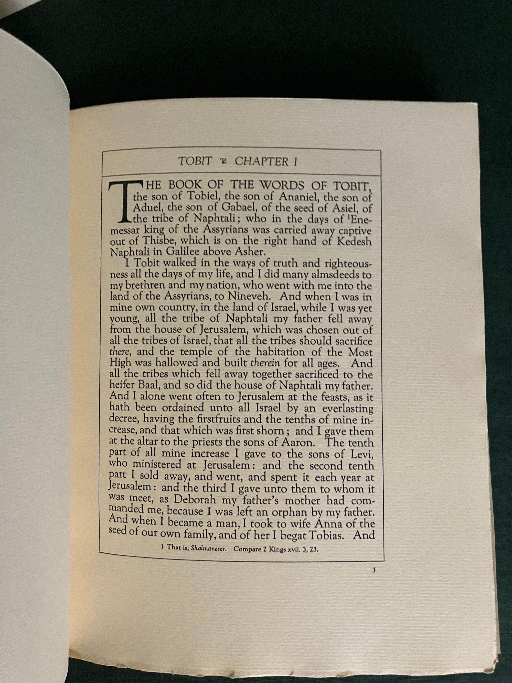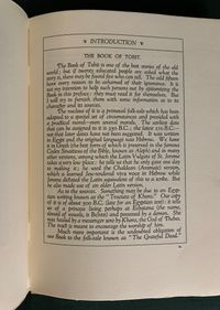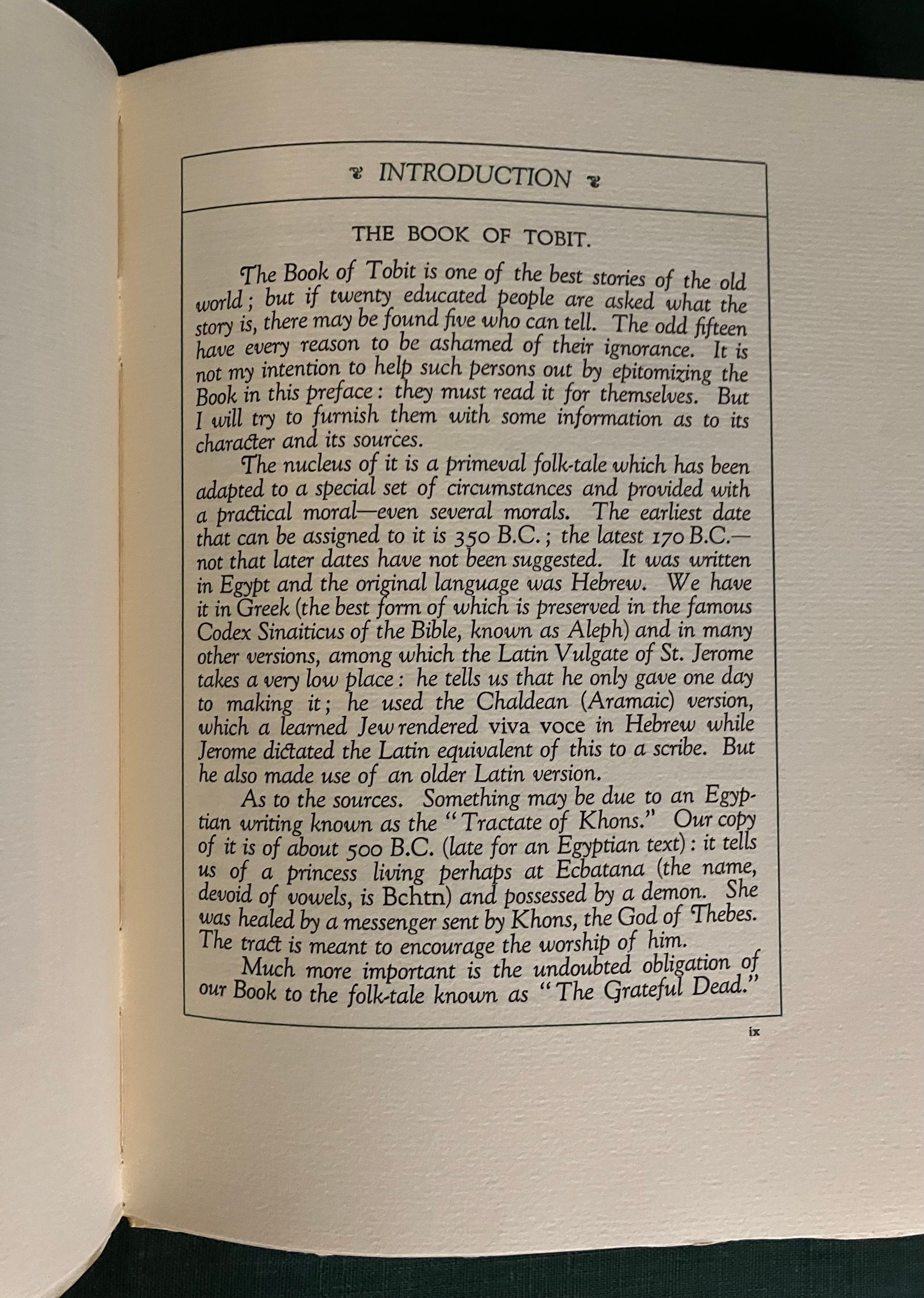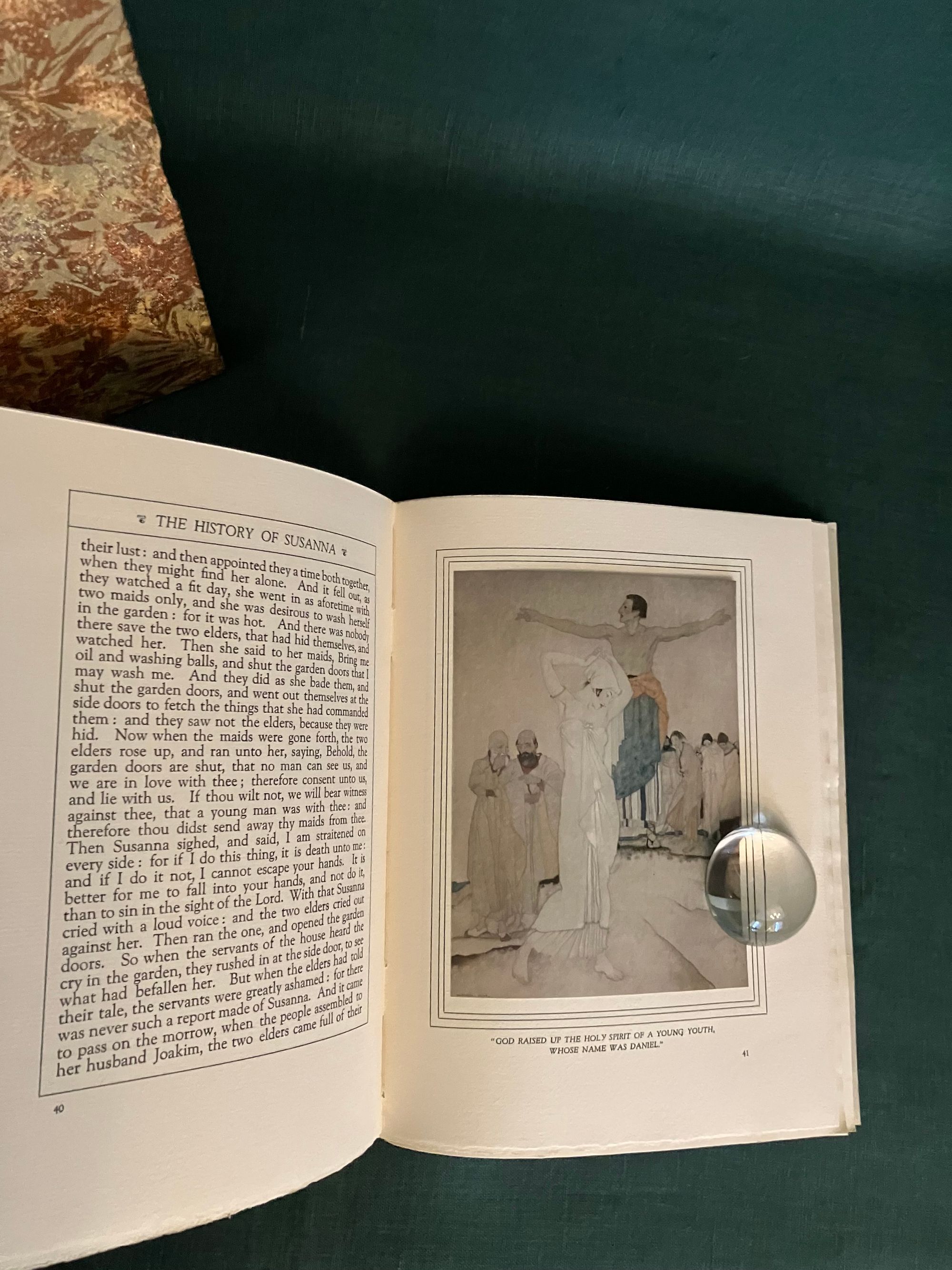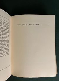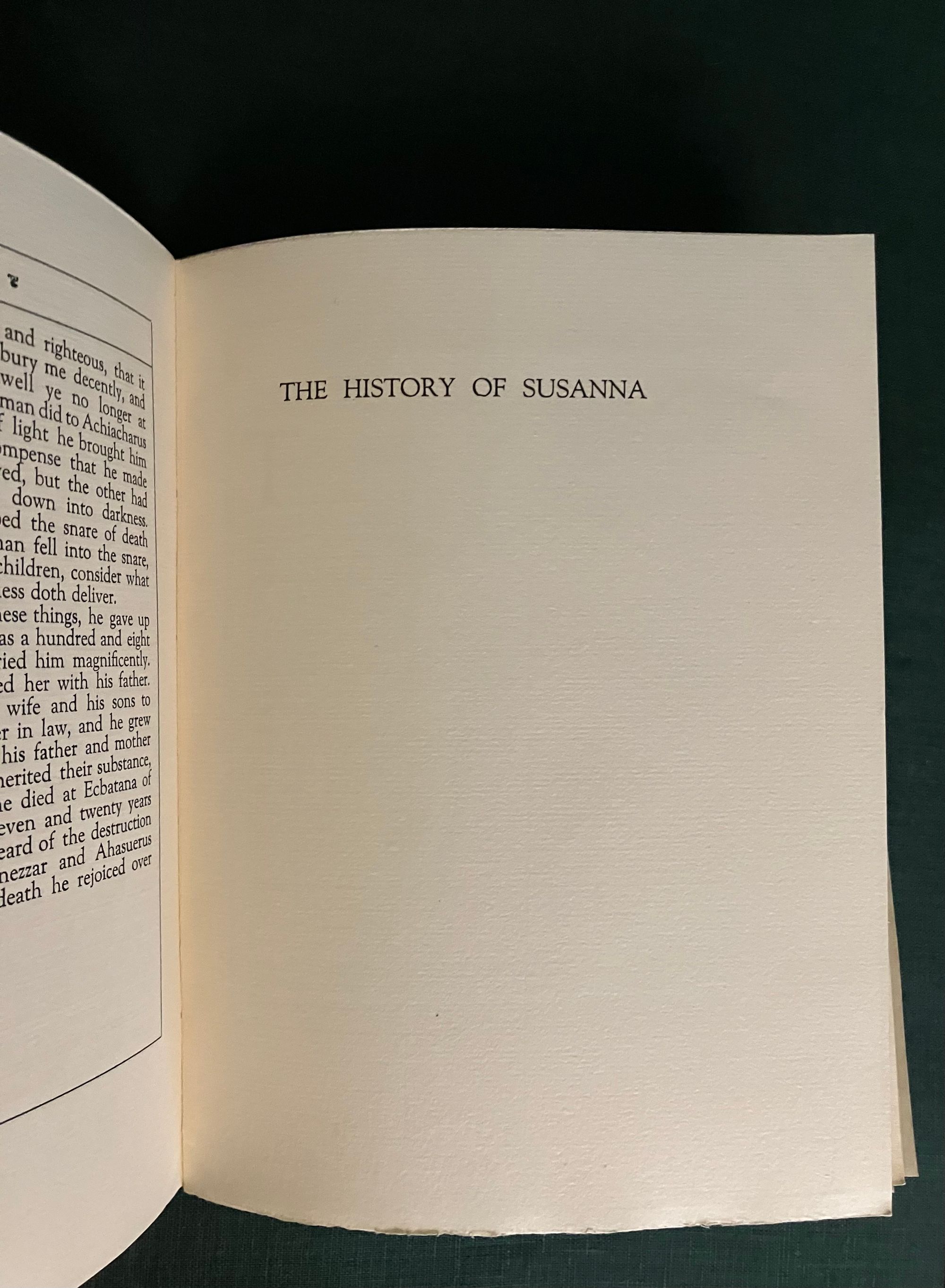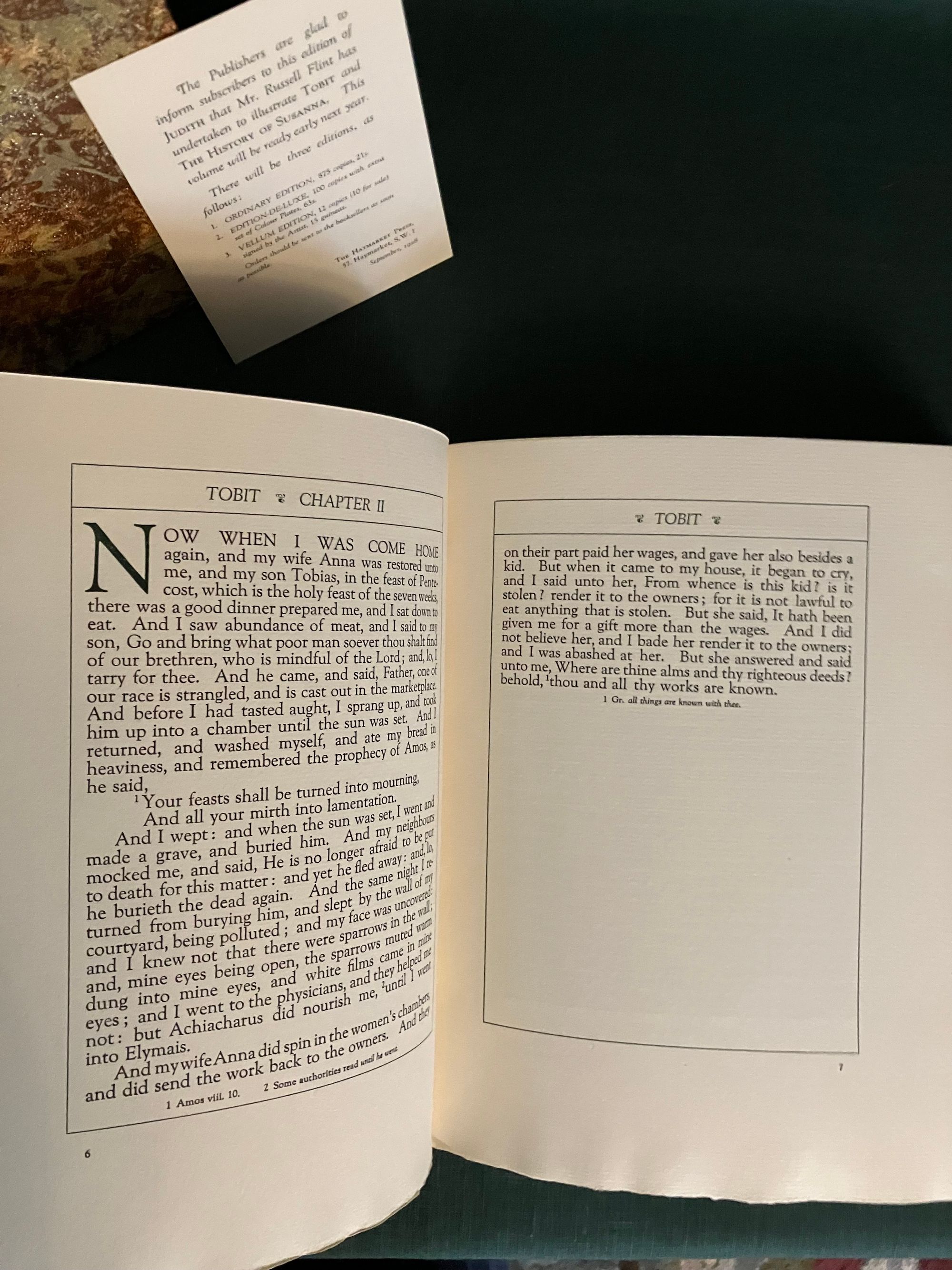 First Edition. Hard cover, 4to, bound vellum parchment over card, yapp edge, titles to front and spine in gilt, four intact natural woven silk ties, printed in black upon laid paper in Goudy typeface, within ruled borders, xvi, 47,[5]pp. Four full page chromolithographed plates of original watercolors by the Edinburgh, Scotland born Artist William Russell Flint (1880-1969) tipped in. Frontispiece entitled "Then Susanna Sighed, and said I am Straightened on Every Side." Also, an envelope with an extra suite of the plates, perhaps suitable for framing, is laid in. Original advertising card at the front identifies this as the Edition De Luxe, originally sold for 63s. Colophon: "Reprinted from the Revised Version of the Apocrypha," No. 45 of 100 copies for sale of this iteration. Original slipcase is restored with decorative foil paper-covering, the whole now protected with a mylar and velcro chemise.*CONDITION: Near Fine. The vellum parchment cover is lightly toned in places, as seen. One lightly bumped rear corner. Some pages are unopened. Previous bookseller notations in pencil to ffep. The plates are clean, and the extra set of plates are in similar, excellent condition. Envelope (containing extra plates) has one small closed tear. Slipcase is Fine. Cover is prone to a bit of warping, as is normal for this material. Overall, this is a really lovely book and definitely gift-worthy. **Scottish Illustrator, painter, engraver and designer Sir WILLIAM RUSSELL FLINT studied in Edinburgh at Stuart 's Melville College and later at the Heatherley School of Fine Art in London. His work as a commercial illustrator included pieces in the Illustrated London News, posters, and a number of books, including a famous version of Malory's Le Morte D'Arthur (1910). He became President of the Royal Society of Watercolorists in later life, and was knighted in 1947. **Here, the illustrations are composed of two scenes from the first story, "THE BOOK OF TOBIT" including the "Sarah Reproached by her Father's Maidservants: Dost Thou Know that Thou Stranglest Thy Husbands?" and "Sarah, the Daughter of Raguel." Aside from the frontispiece mentioned above, the fourth illustration is found within the separately half-title paged "History of Susanna," entitled " "God Raised up the Holy Spirit of a Young Youth Whose Name was Daniel." Tobit, partially unsighted by bird guano, loses sight completely when attended by a physician. He sends his son Tobias to recover monies owed at Nineveh (upper Mesopotamia). Tobias is helped by the Angel Raphael, in disguise, who aids him by instruction on a potion which promises to drive out demons, as well as cure blindness. Tobias's lady friend Sarah is possessed by the demon Asmodius, who destroys her potential suitors. Back in Nineveh, Tobit regains his sight. **THE HISTORY OF SUSANNA came from the biblical Book of Daniel, was also judged by various canonical gatekeepers as apocryphal. This did not stop the story from having longstanding cultural influence. In it, the young woman Susanna, is spied upon by two elders while at her bath, taken within the expected privacy of a locked, walled garden at her home. When she refuses their demands, they endeavor to shame her, accusing her of adultery with a fictitious young man. Daniel unravels the truth after her arrest and trial. The story was widely known within different religious and cultural traditions (Greek, Jewish, Catholic, and Eastern and Oriental Orthodox for instance,) and was represented through the centuries in the arts. The Susanna story is also recounted in the original One Thousand and One Nights of Arabic folklore. **Compiler M.R. JAMES (1862-1936) who introduces this volume, is perhaps better known as an author of ghost stories. He was, however, a scholar, Professor, and finally Provost at King's College, Cambridge, deploying a double first in classics and archeology, in the study of architecture, history, and becoming a leader in the field of palaeography. He published at least one work in on the "Apocrhypha of the New Testament" reviewed in the Times Literary Supplement, 1 May, 1924: J. Cox, (1969). See our related M.R.James titles, nos. 9640 AND 8200.) J. Sutherland (1989) p. 326. DNB. (AMJ)