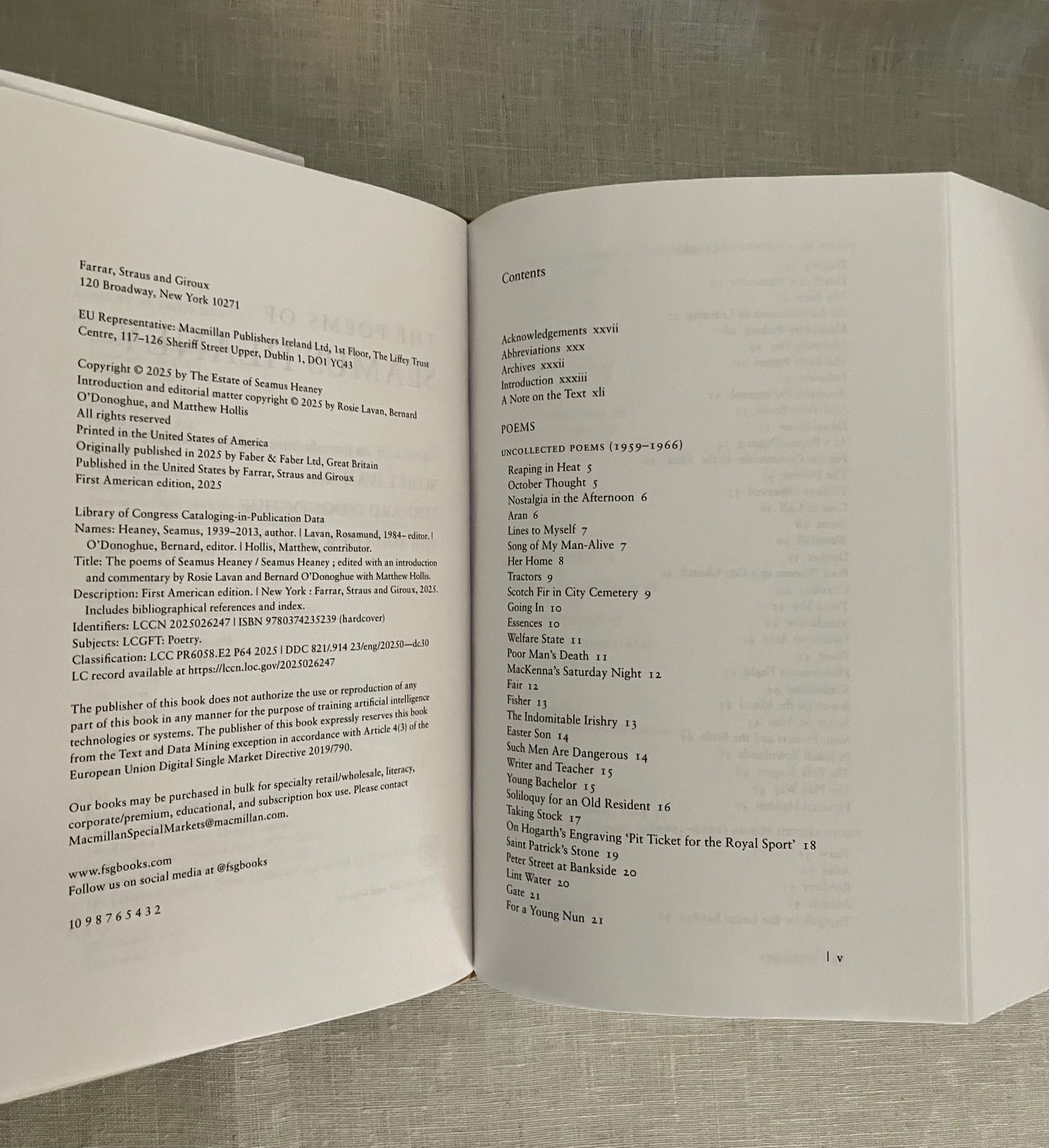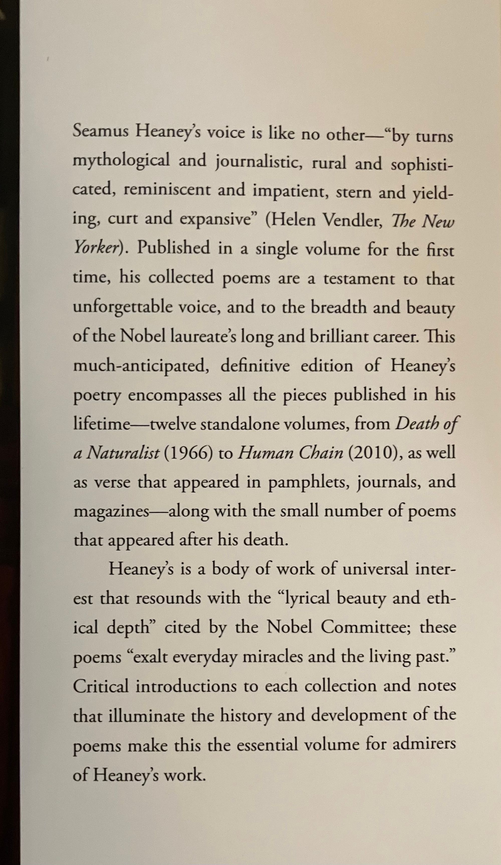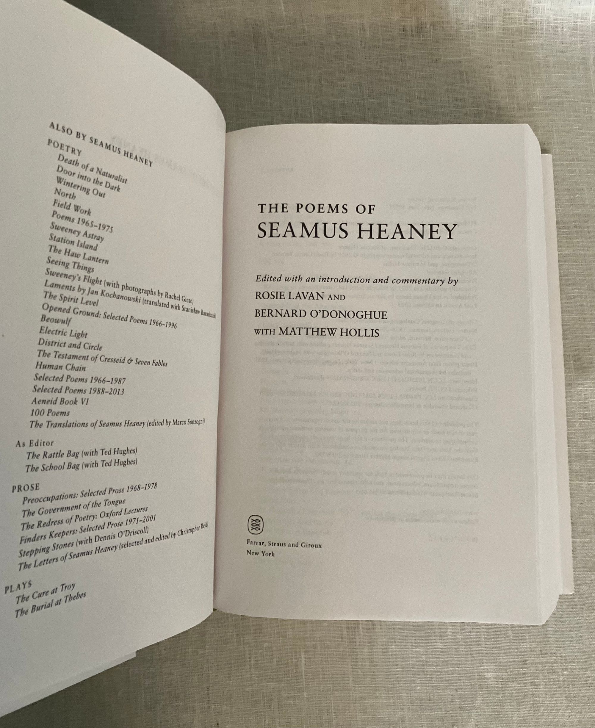 First Edition, Second Printing. Hard Cover, 8vo, xliv, 1252 pp. In publisher's tan cloth binding and pictorial dust jacket. CONDITION: Fine, like new, in Fine dust jacket. Now in a mylar protector.** Seamus Heaney (1939-2013) is widely recognized as one of the most important Irish poets since Yeats, and one of the most popular modern poets to write in the English language. He won the Nobel Prize in Literature in 1995.**Heaney's poetry went through several stages of winnowing, from the early manuscript, the annotated typescript, to the the first publication in magazine or anthology. Heaney hand-picked from these poems to create the poetry collections published by Faber & Faber. This landmark work includes all of Heaney's major collections of poetry, together with the uncollected poems he left behind (including a few which he recognized were noteworthy). In addition, the appendix contains a selection of previously unpublished poems. (AJ)