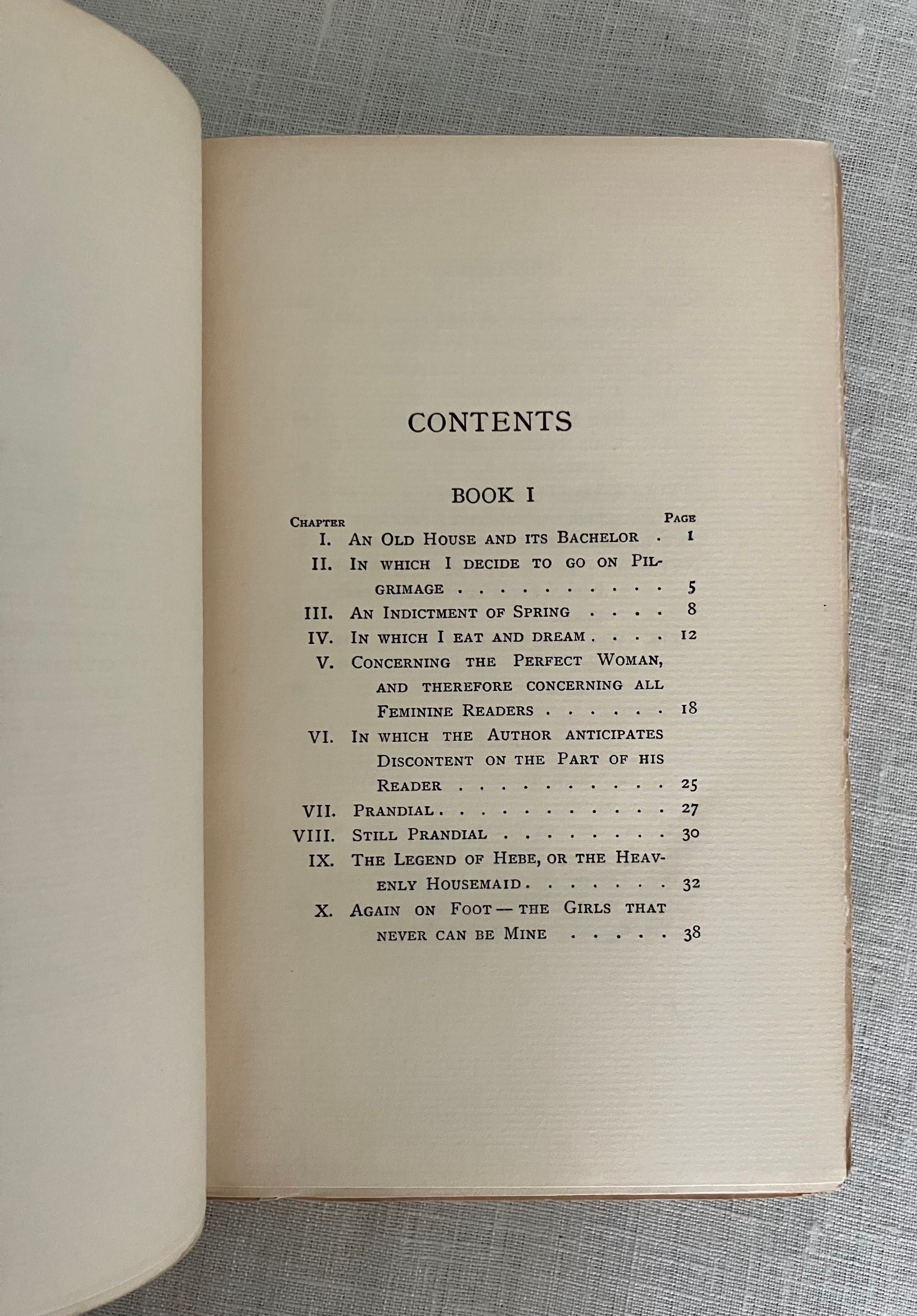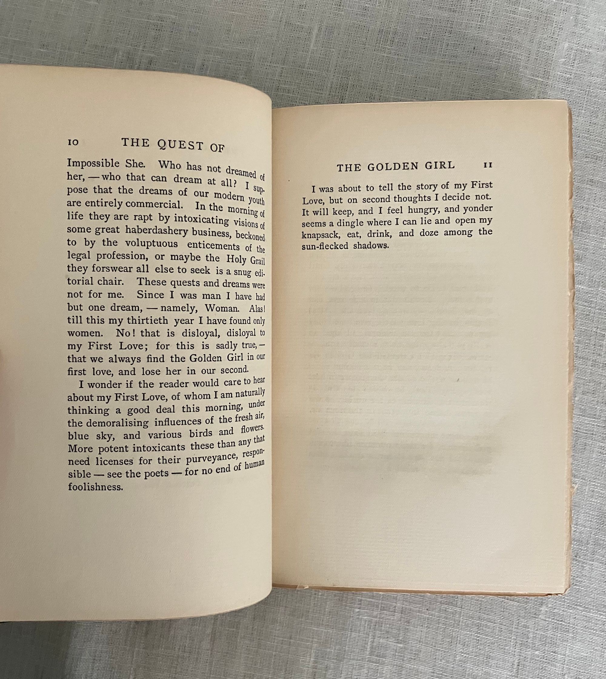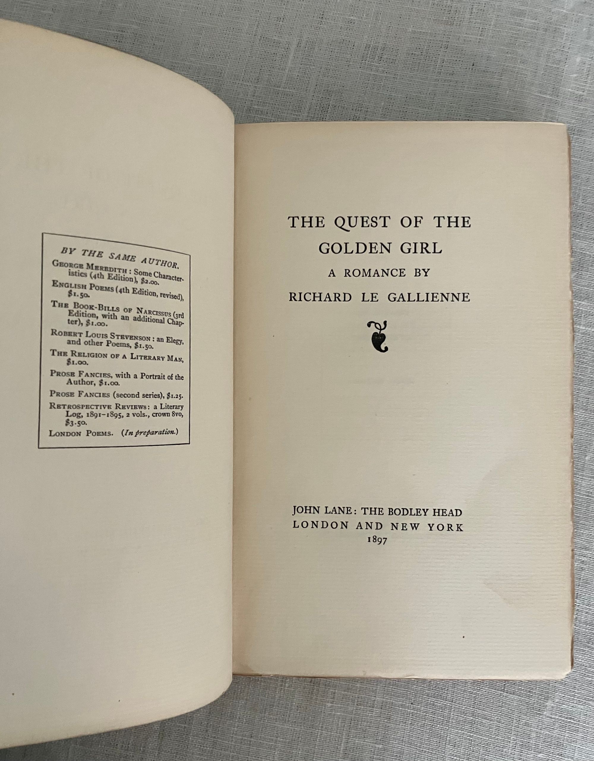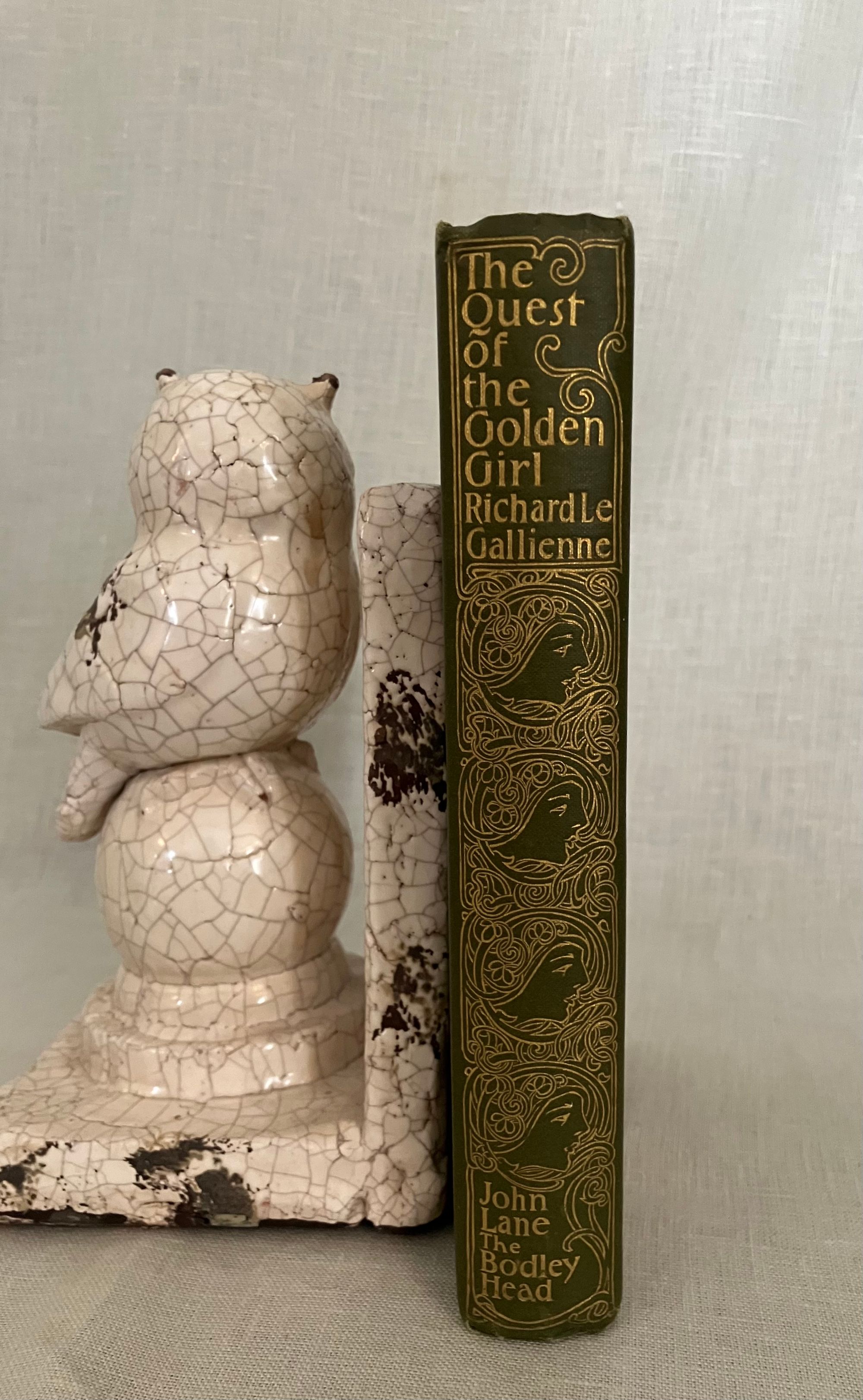 Fifth Edition, of 1896 original. Hard cover, 8vo, in green cloth , the boards blocked in gilt with design by Will H. Bradley in a twining, Art Nouveau depiction of a young woman's face in profile, repeated among twining organic flowering vines to front board and along spine. Rear board is plain. Printed on laid paper, top edge gilt, other page edges untrimmed. 307pp plus 1897 dated publisher's catalogue in 16pp. Printer's colophon of John Wilson and Son, University Press. **CONDITION: Very Good Plus, with one lightly bumped corner upper right board and one small dent at fore edge board. Head of spine lightly crimped, as seen. Otherwise very lightly age toned, gilt remaining bright. Some bookseller notations in pencil to paste downs. Joints and hinges in order. **This turn of the century "romantic novel" is actually a rather comic and modern satiric take on a thirty-year old English bachelor's belated quest for romantic fulfillment. Starting out with the highest of ideals and a poetic bent, he literally hits the road, rather in Don Quixote style, to wander along the byways of Sussex in search of this mystical dryad, the woman of his dreams. At an inn, he accumulates some personal remnants of a young lady named Sylvia Joy, around whom he builds a fantasy of perfection and devotes himself to finding her. Along the way, though, he happily partakes in some casual affairs, and encounters various couples who begin to temper his Romantic expectations of the perfection of the marital state, in a story with almost Shakespearean levels of coincidence and humor. He will, in the end, find his intended, after a few brushes with some radical modern thinking, and meeting several " New Women" liberated from traditional mores. (In this, the work has been described as a bridge between the Romantic and Decadent movements.) It is a wonderful read, all the more so because written by a "moonstruck" male.**Liverpool-born AUTHOR and poet RICHARD LE GALLIENNE(1866-1947), had a complex personal life, with several marriages as well as an early affair with the writer Oscar Wilde. He was associated with The Rhymers Club, Yeats and would publish books of poetry, biography as well as novels, and contributed to the Yellow Book. His travels took him to New York, France and Monaco. He was also father to celebrated actress Eva Le Gallienne. Massachusetts typographer and graphic designer WILL H. BRADLEY's (1868-1962) work is very collectible. He worked earliest in his career at the University Press, Boston, thereafter at his own Springfield, MA Wayside Press, and later at New York's William E. Rudge. Very reminiscent of the book cover design work of Laurence Housman: See our items Nos. 9729 and 9668 for these cover designs. Some of Bradley's original designs were sold on to be used by other publishers, such as tJohn Lane and The Bodley Head. Bambace p. vii). REF: A. Bambace, "Will H. Bradley: His Work, A Bibliographical Guide," (Oak Knoll, New Castle DE, 1995.) A14. Morris and Levin (2000) No. 70. (AMJ)