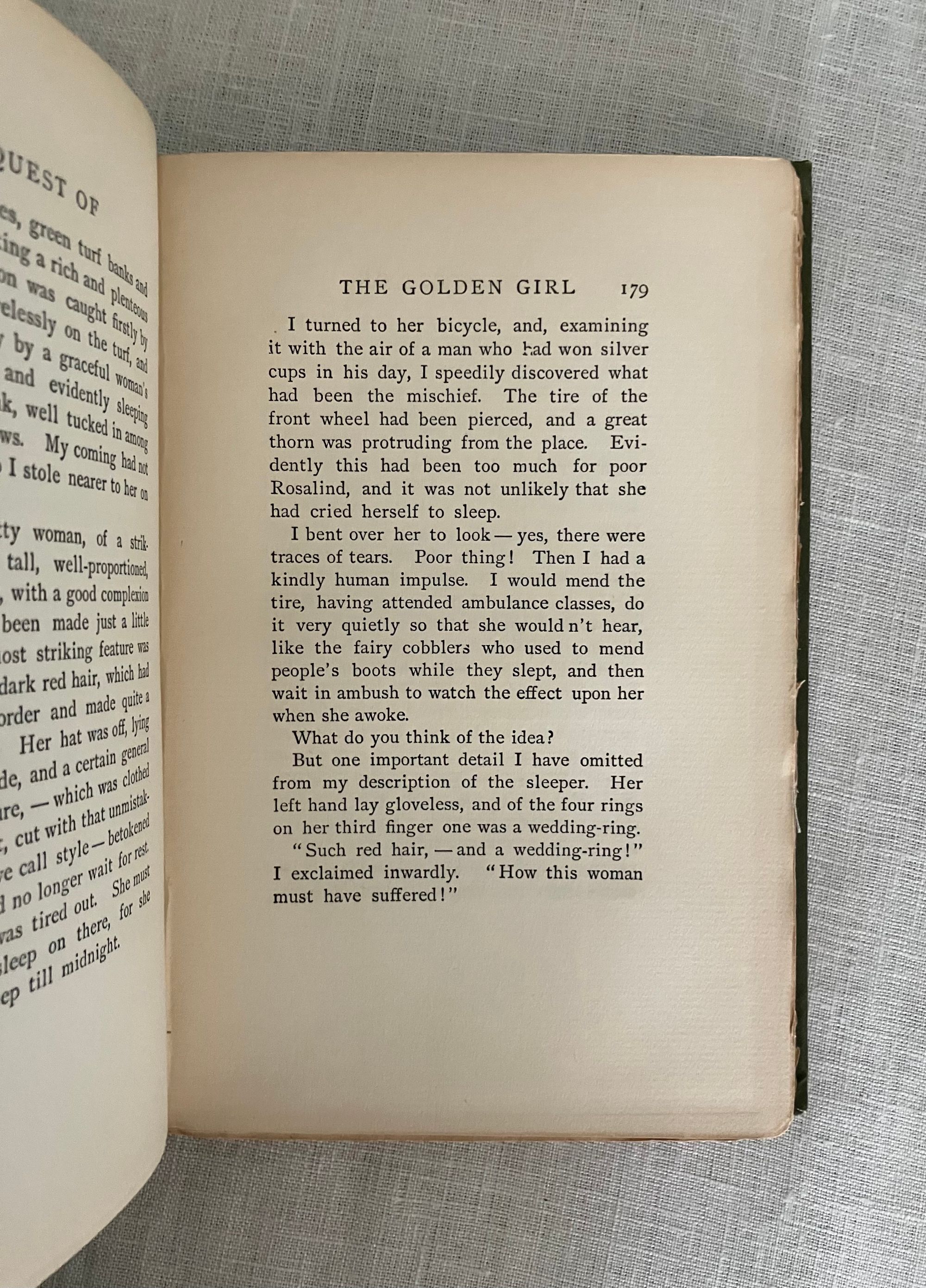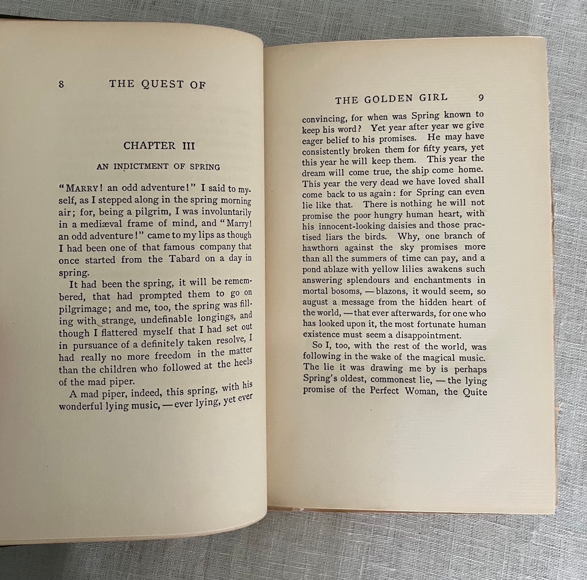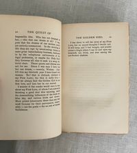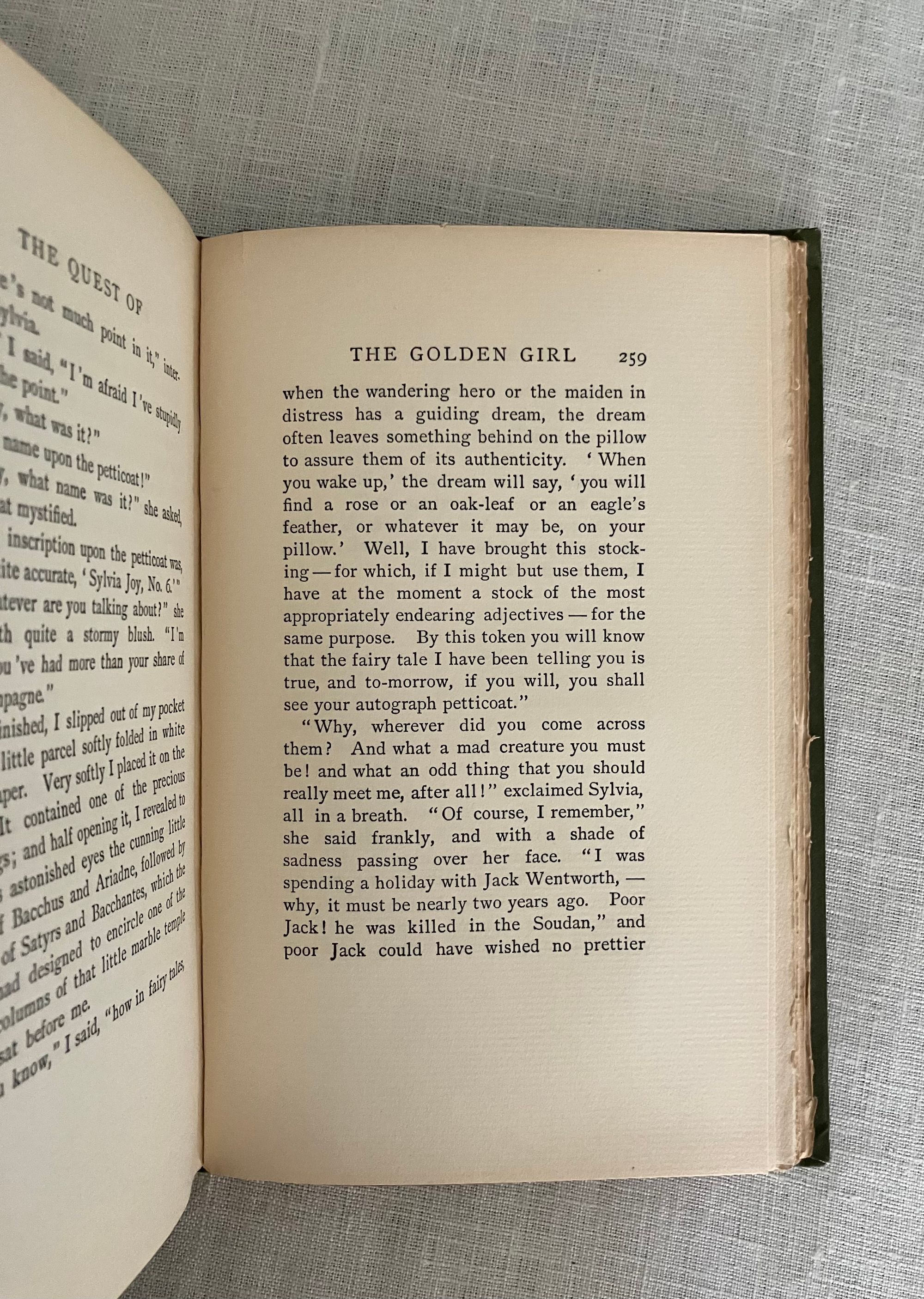 Fifth Edition, of 1896 original. Hard cover, 8vo, in green cloth , the boards blocked in gilt with design by Will H. Bradley in a twining, Art Nouveau depiction of a young woman's face in profile, repeated among twining organic flowering vines to front board and along spine. Rear board is plain. Printed on laid paper, top edge gilt, other page edges untrimmed. 307pp plus 1897 dated publisher's catalogue in 16pp. Printer's colophon of John Wilson and Son, University Press. **CONDITION: Very Good Plus, with one lightly bumped corner upper right board and one small dent at fore edge board. Head of spine lightly crimped, as seen. Otherwise very lightly age toned, gilt remaining bright. Some bookseller notations in pencil to paste downs. Joints and hinges in order. **This turn of the century "romantic novel" is actually a rather comic and modern satiric take on a thirty-year old English bachelor's belated quest for romantic fulfillment. Starting out with the highest of ideals and a poetic bent, he literally hits the road, rather in Don Quixote style, to wander along the byways of Sussex in search of this mystical dryad, the woman of his dreams. At an inn, he accumulates some personal remnants of a young lady named Sylvia Joy, around whom he builds a fantasy of perfection and devotes himself to finding her. Along the way, though, he happily partakes in some casual affairs, and encounters various couples who begin to temper his Romantic expectations of the perfection of the marital state, in a story with almost Shakespearean levels of coincidence and humor. He will, in the end, find his intended, after a few brushes with some radical modern thinking, and meeting several " New Women" liberated from traditional mores. (In this, the work has been described as a bridge between the Romantic and Decadent movements.) It is a wonderful read, all the more so because written by a "moonstruck" male.**Liverpool-born AUTHOR and poet RICHARD LE GALLIENNE(1866-1947), had a complex personal life, with several marriages as well as an early affair with the writer Oscar Wilde. He was associated with The Rhymers Club, Yeats and would publish books of poetry, biography as well as novels, and contributed to the Yellow Book. His travels took him to New York, France and Monaco. He was also father to celebrated actress Eva Le Gallienne. Massachusetts typographer and graphic designer WILL H. BRADLEY's (1868-1962) work is very collectible. He worked earliest in his career at the University Press, Boston, thereafter at his own Springfield, MA Wayside Press, and later at New York's William E. Rudge. Very reminiscent of the book cover design work of Laurence Housman: See our items Nos. 9729 and 9668 for these cover designs. Some of Bradley's original designs were sold on to be used by other publishers, such as tJohn Lane and The Bodley Head. Bambace p. vii). REF: A. Bambace, "Will H. Bradley: His Work, A Bibliographical Guide," (Oak Knoll, New Castle DE, 1995.) A14. Morris and Levin (2000) No. 70. (AMJ)
