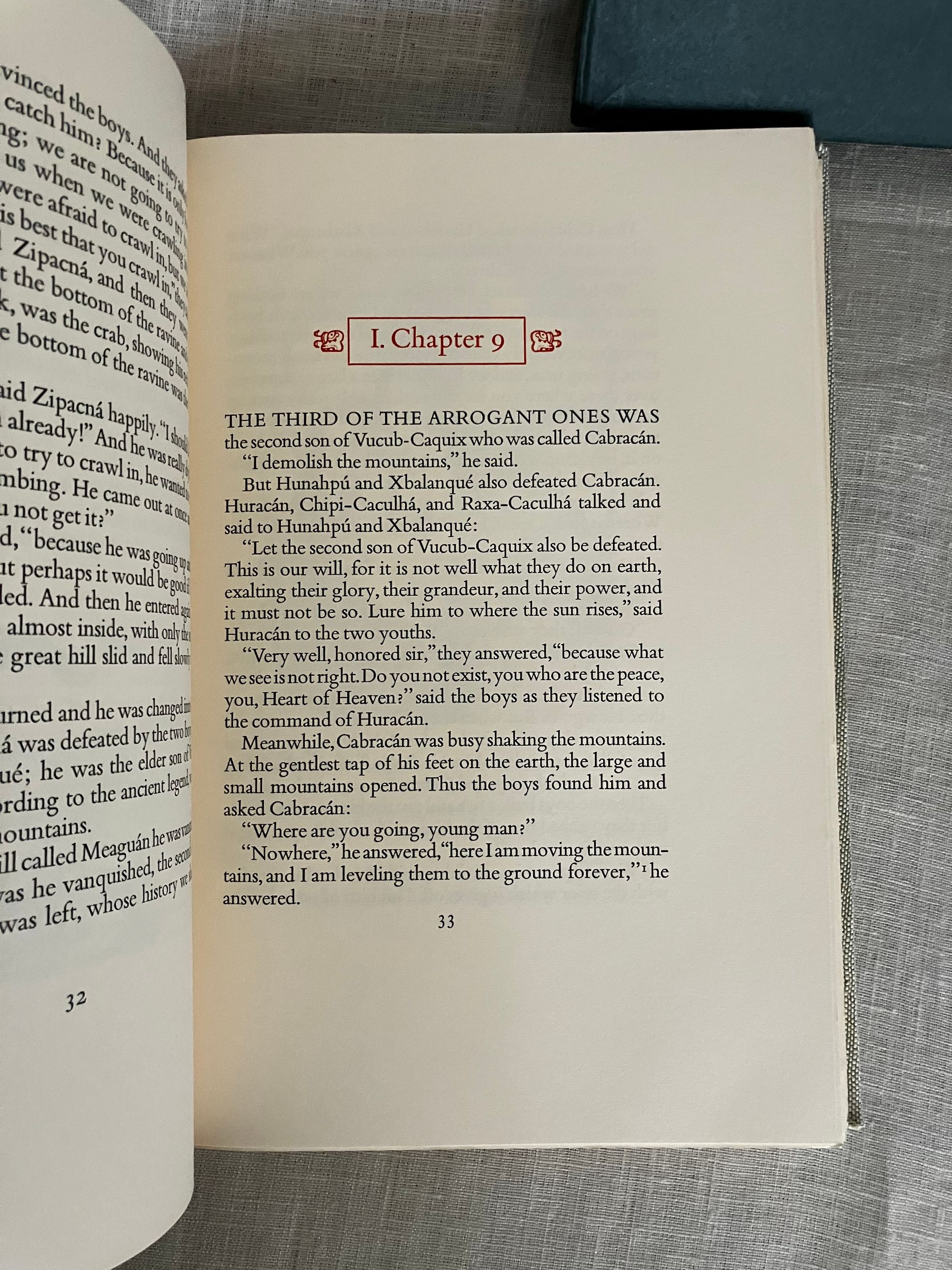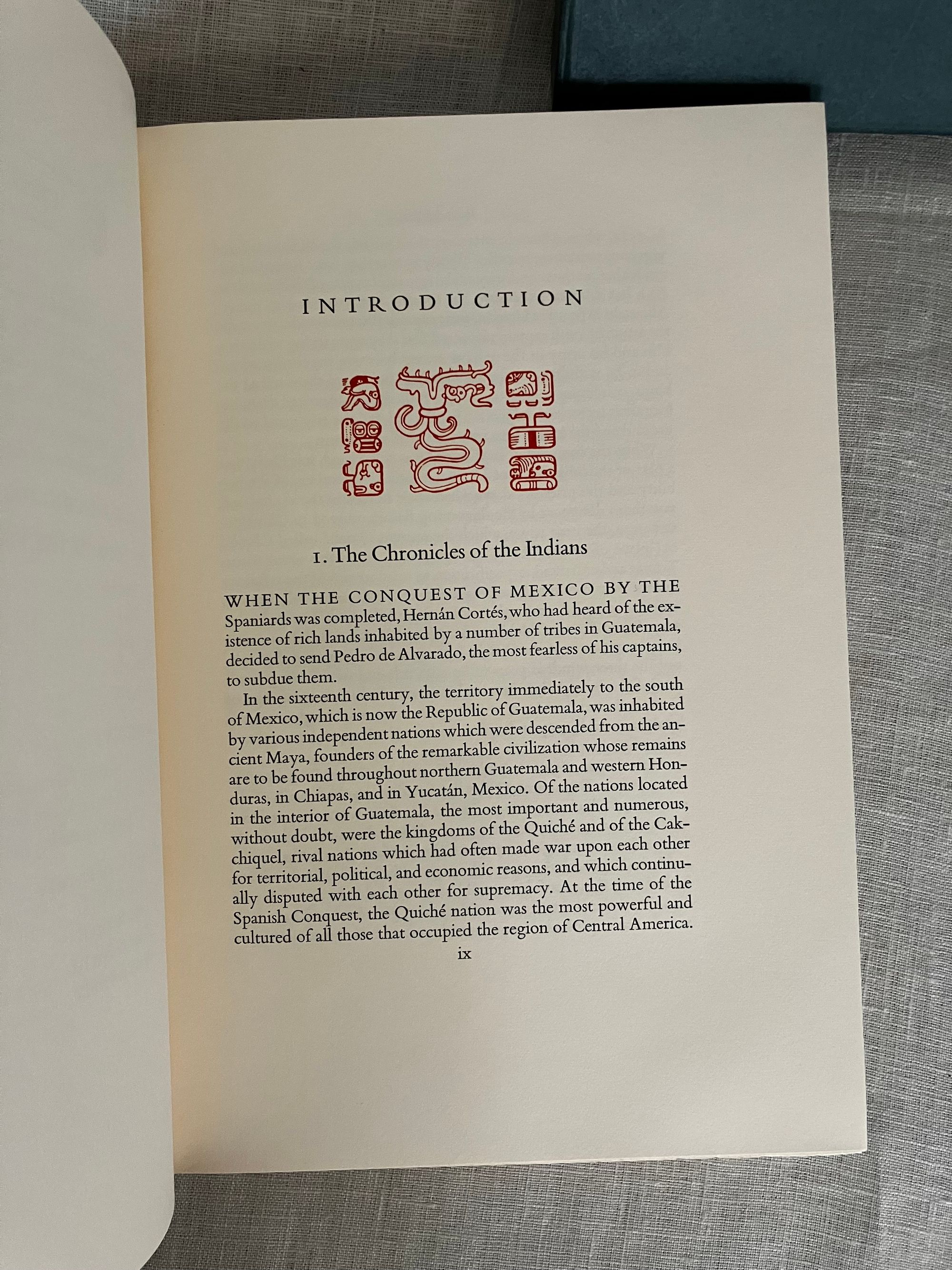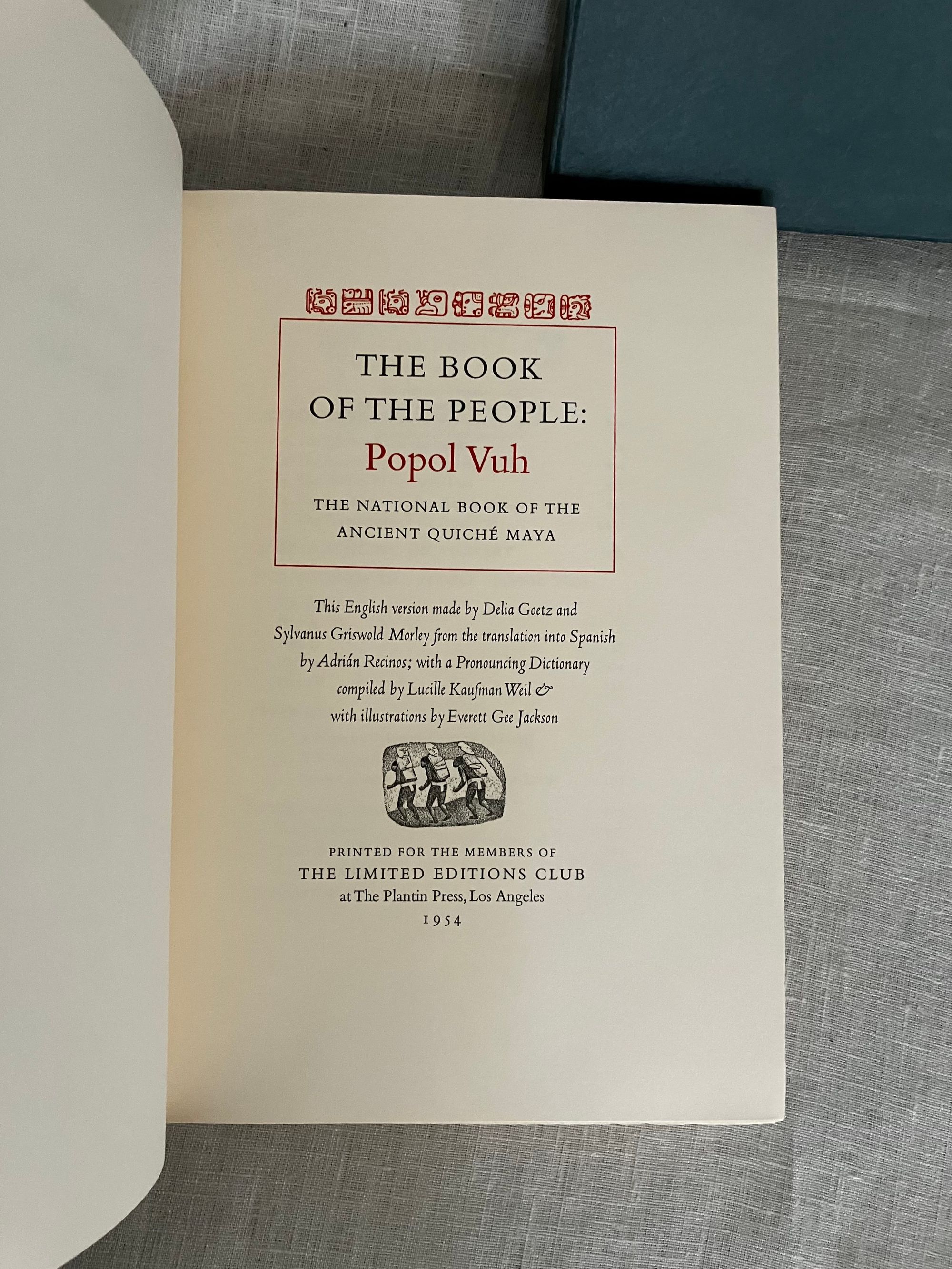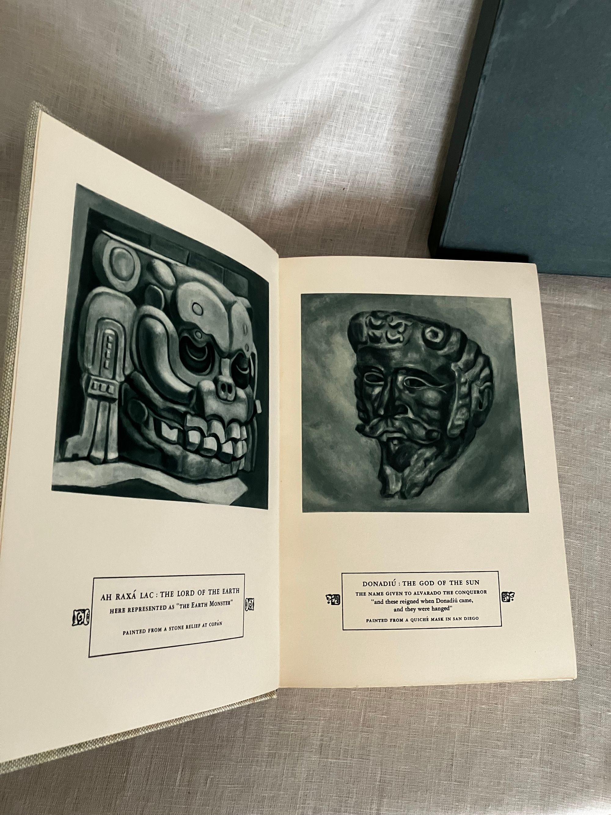 Hard cover, 4to in green cloth, witlh titles to spine blocked in darker green, in the original slipcase. Printed at The Plantin Press, San Francisco. 251pp. [253pp.] CONDITION: Very Good Plus in a Very Good Plus slipcase. Slight darkening to spine with three small spots of foxing to same. Otherwise clean, unwritten in and in a firm binding. Slipcase has two inconsequential small dings.** Tales of the ancient Mesoamerican Quiché Indian tribe, a branch of the Maya Empire once encompassing present day Yucatán, Mexico, the present Republic of Guatemala and Western Honduras. The work chronicles verbal traditions of the Quiché from antiquity, which were gathered into written form in the sixteenth century by Chichicastenango and thereafter into Spanish by Spanish priest Father Ximénez. Creator myths, and mythology. Called by the translator " the most distinguished example of native American literature that has survived the passing centuries." (p. 185). Some of the stories include: The coming of Spanish conquistadors, such as Pedro de Alvarado, renamed Donadiú, "The God of the Sun" and "The Death of Hunahpú and Xbalanqué." (AMJ)