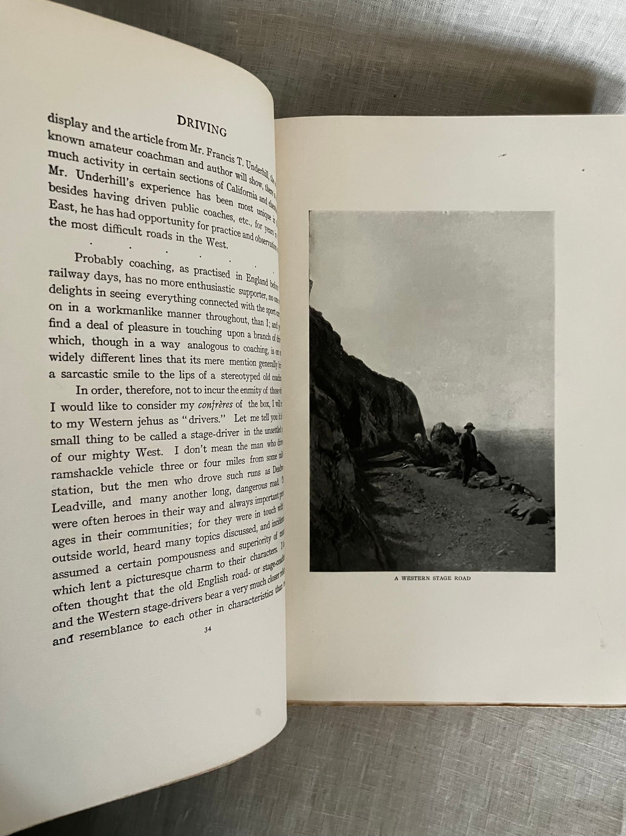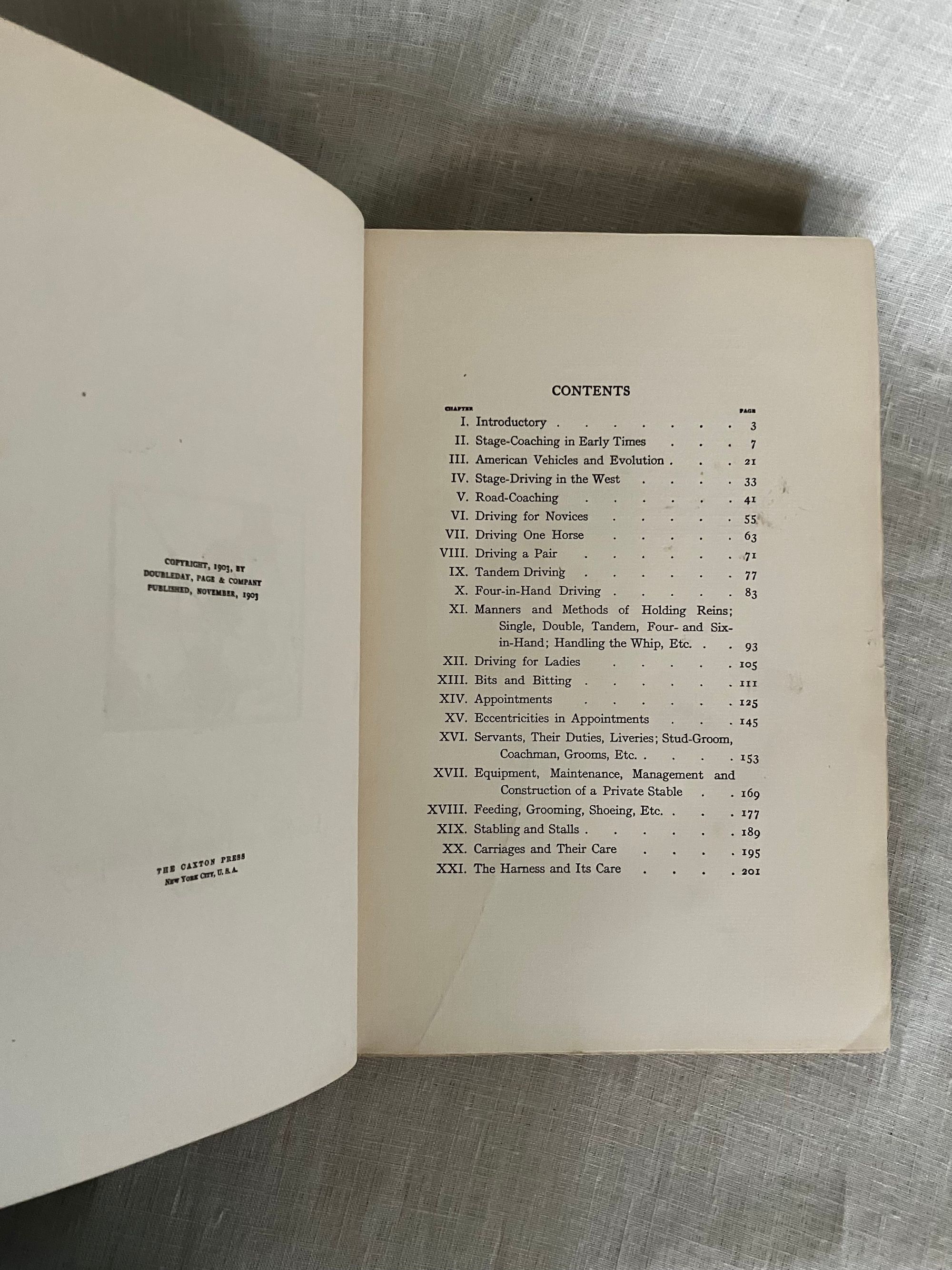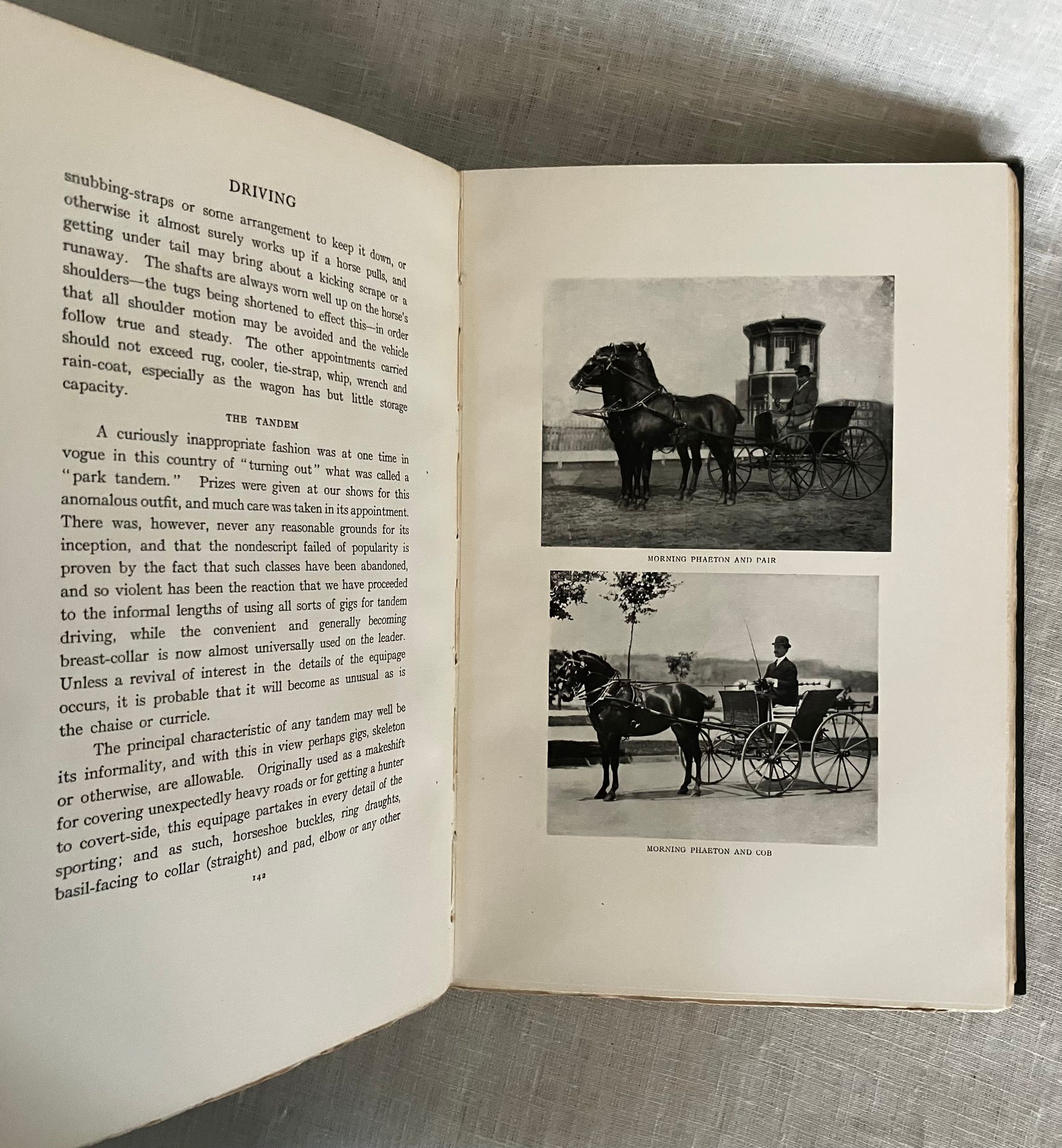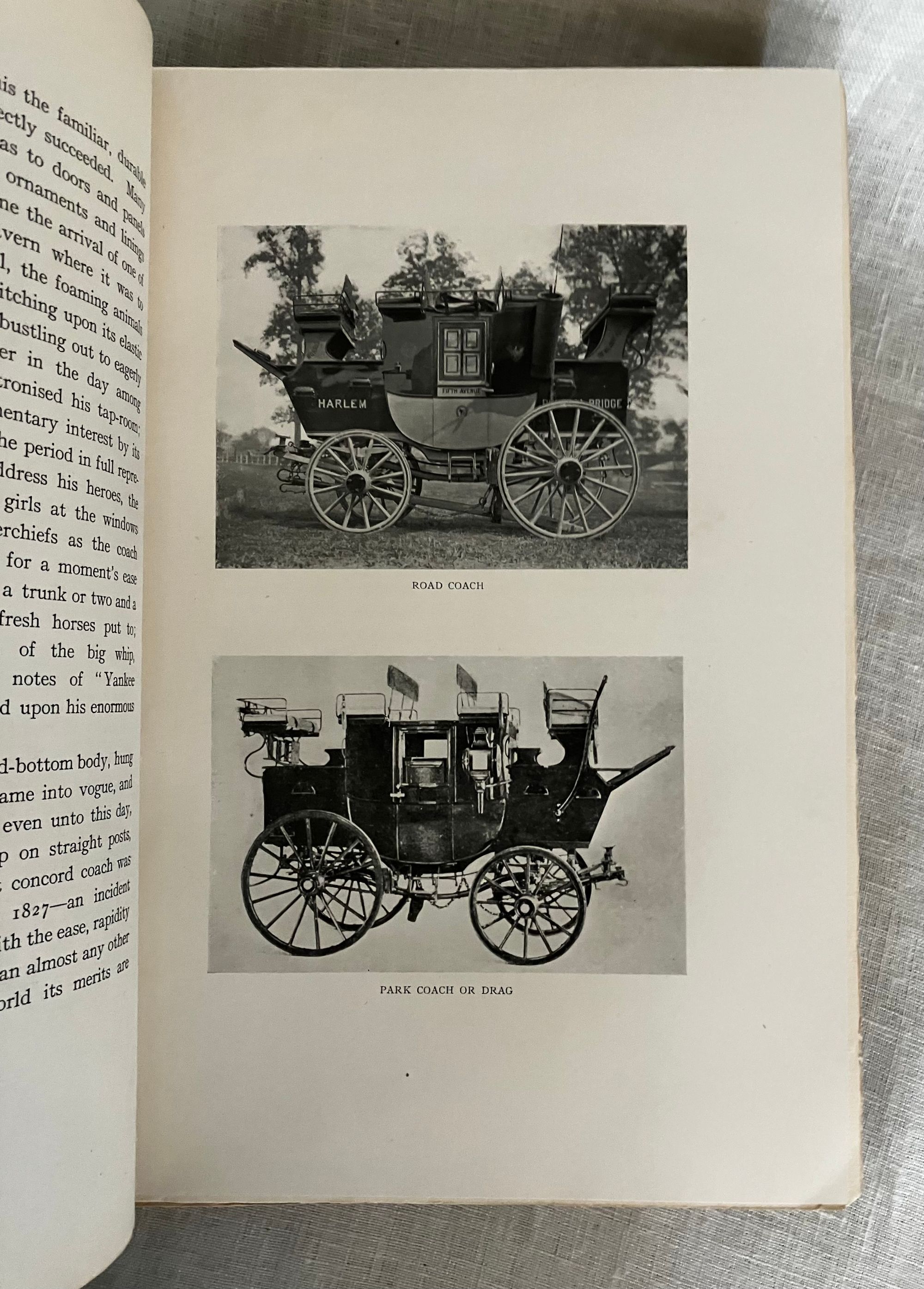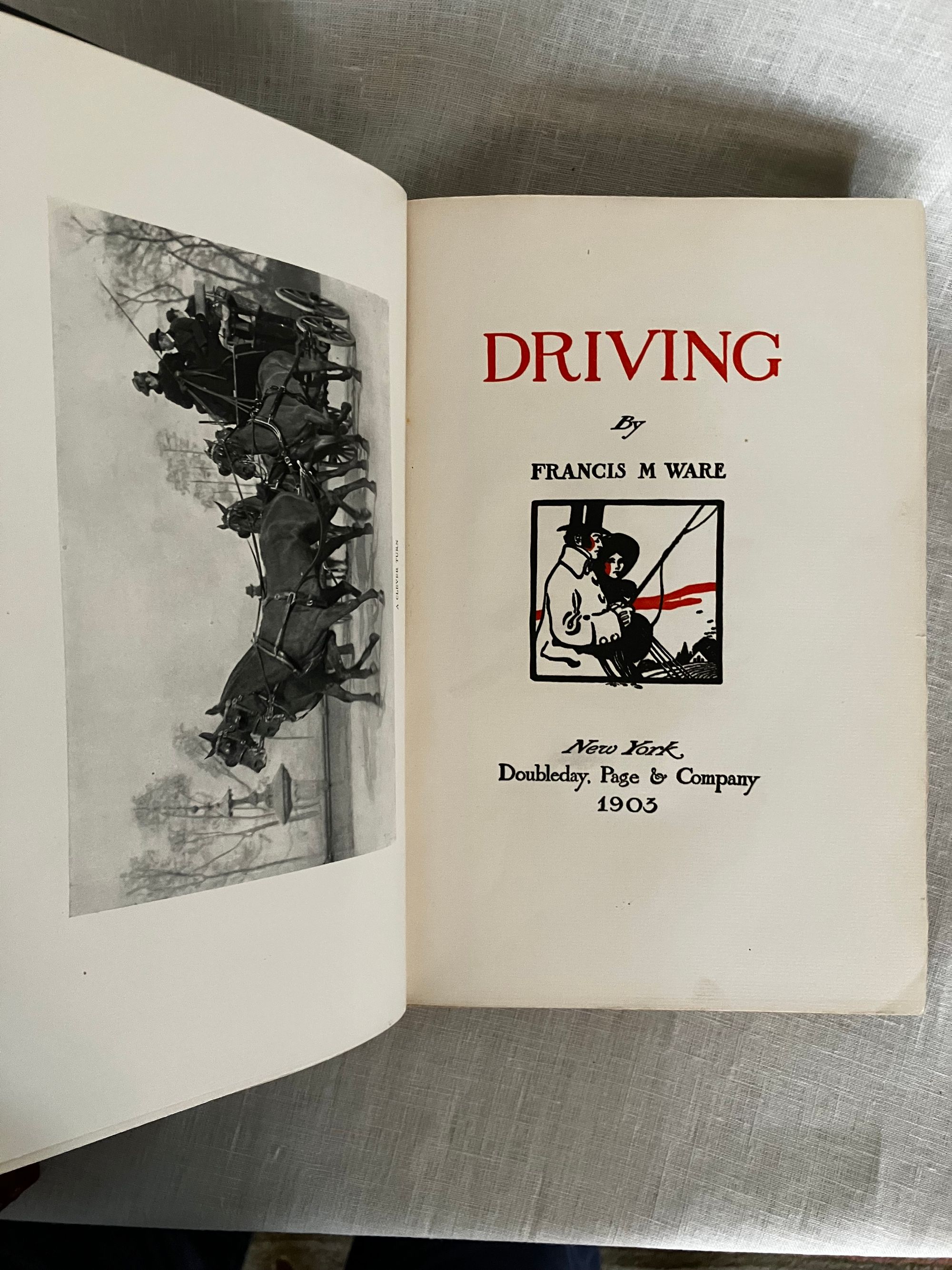 Hard cover, 4to., in green cloth blocked with elaborate gilt cover in an amalgam of celtic, grolier style banding with areas filled with neoclassical foliage, laurel crowns and a central vignette with publisher's logo. Design gilt to both boards, more simple design repeated to the spine in gold, top edge gilt, others untrimmed. Printed on heavy laid stock with halftone illustration from photographs as frontis and within. Titles in black and red. Printed at the Caxton Press, New York. x, 319 [1], 5pp. index. CONDITION: Very Good plus. Small rubbing to front board, very light wear to corners and very minor fraying at head of spine, crimping at foot. Front hinge with minor crack, rear is in order. Former owner name upon ffep. in fountain ink. Otherwise, some tanning at edges of text block but clean within. No shelf wear to lower edge.**Georgia-born Francis M. Ware (1824-1893) writes about the art of, and functional history of, carriage-driving and development of wheeled carriages, equestrian skills, stage coaches and sleighing in early America and England, and their importance to the development of trade and settlement. From buggies to broughams, cabriolets to country phaetons, four-in-hand to French chaises, and indeed everything you wanted to know about roadside rivalries. Indexed. (AMJ)