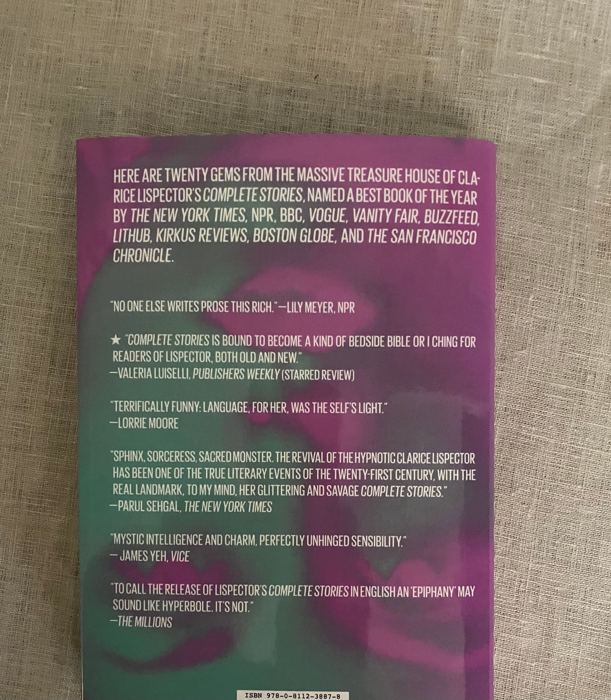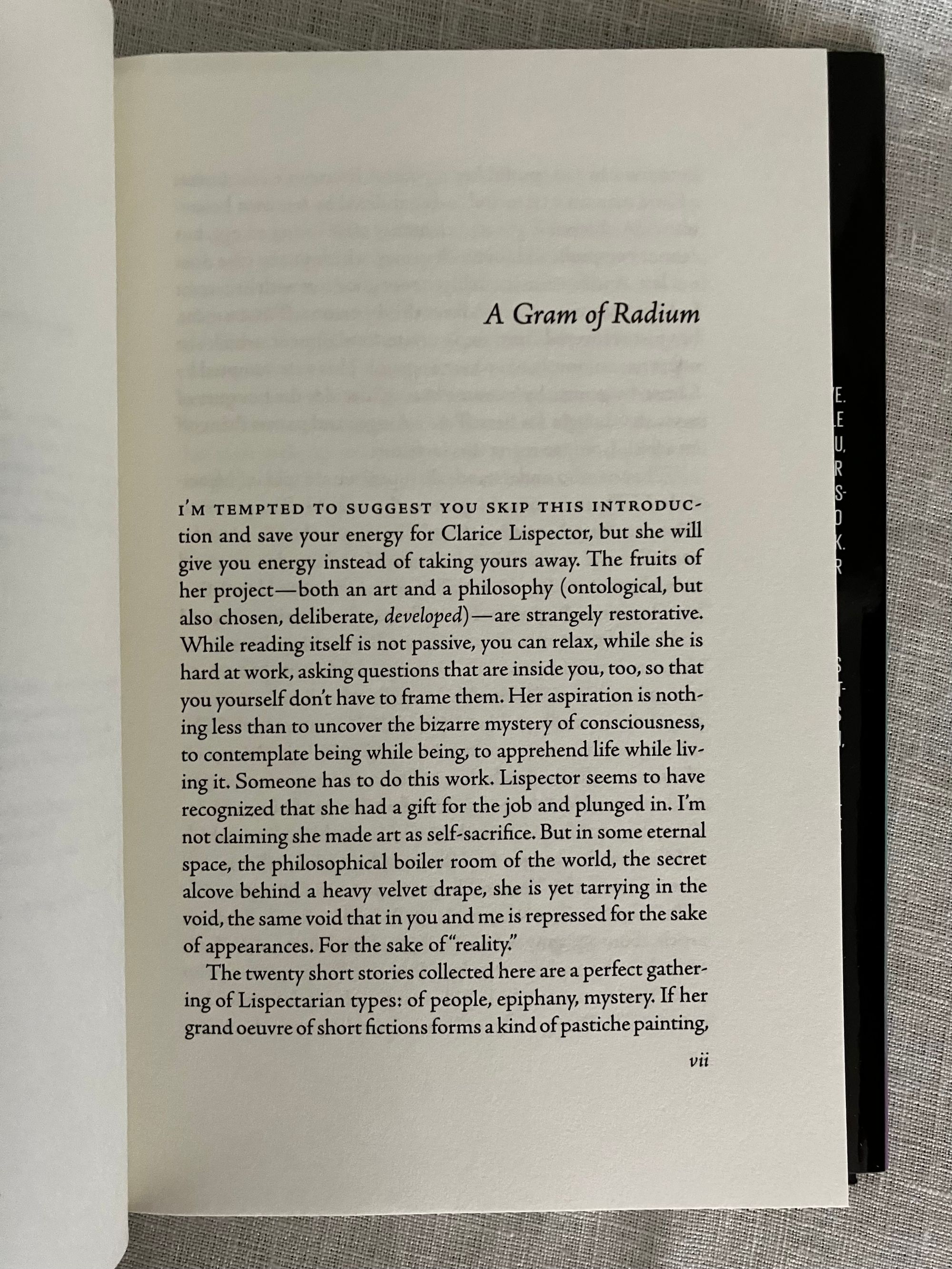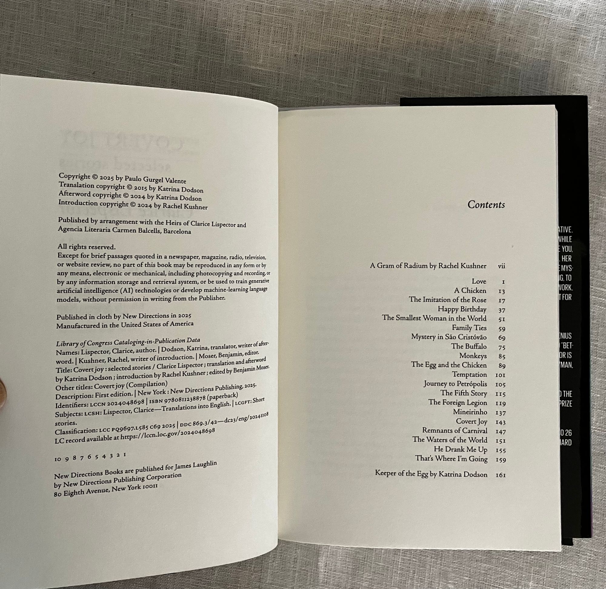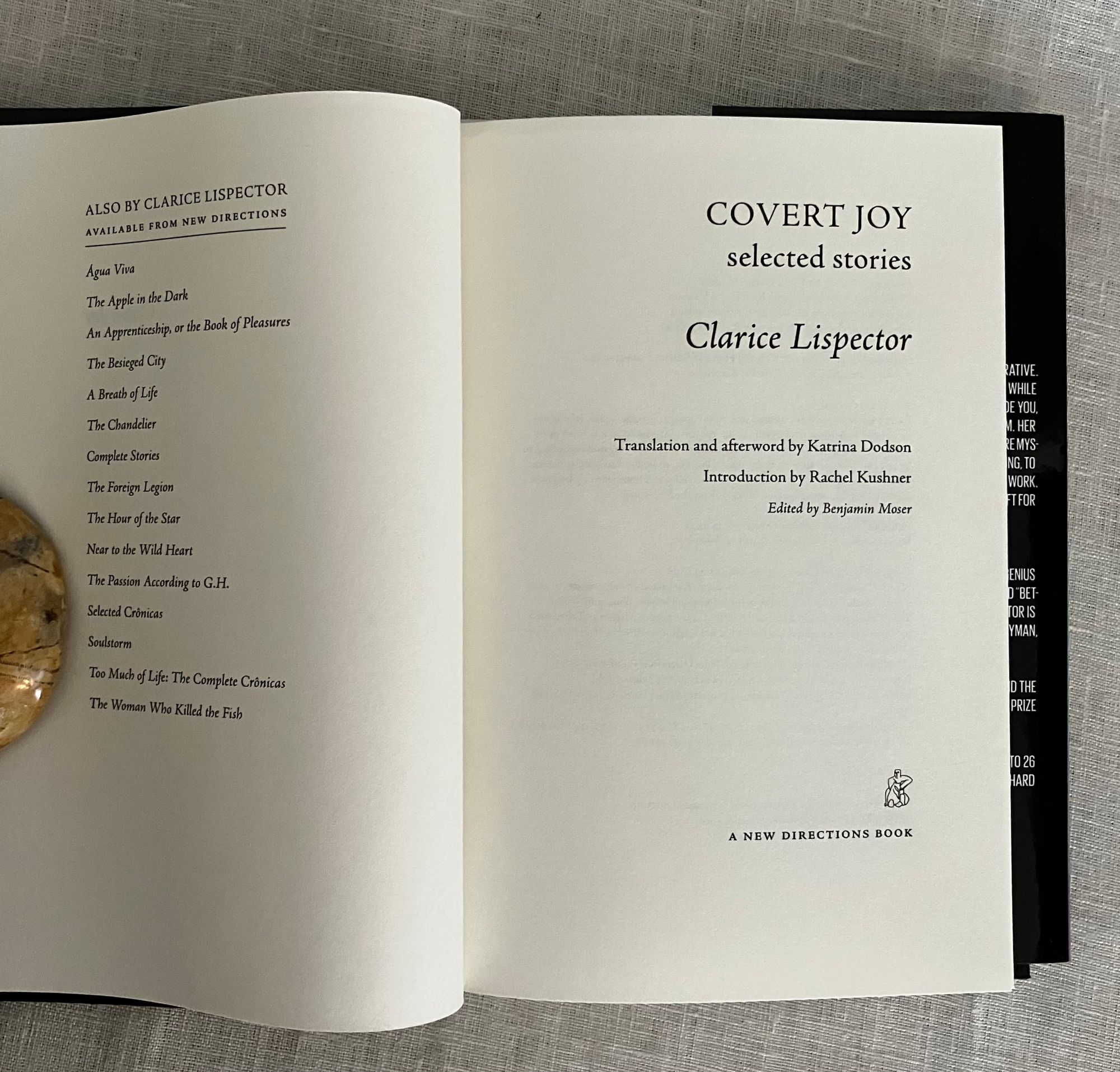First Edition, first printing. Hard cover 8vo in black cloth, titles in silver to the spine, in an unclipped pictorial dust jacket, and mylar protector,165 pp. This newly published curated selection of twenty short stories features a new Introduction and Afterword. ** Fans of the still relatively unknown Ukrainian-Brazilian twentieth century Author will recognize and rejoice in this concentrated display of her unique prose style: in short vignettes or stories which are at once modern, impressionistic, with characters imperfect and unguarded, told in often succinct yet rich language which paradoxically often stops one in their tracks with insight into a character's motivations or other enigmatic statement. The titular story, for instance features a girl whose "frenemy" offers to lend her a coveted book from her father's bookstore. After repeatedly insisting she drops by to pick up the volume, only for it not to be available, the girl realizes she is being abused. She says, " I had already started to guess that she'd chosen me to suffer, sometimes I guess things. But, in actually guessing things, I sometimes accept them: as if whoever wants to make me suffer damn well needs me to." Once she has acquired the book, through the intervention of the nasty girl's mother, she is only partly content. The "covert joy" of possession is elusive because she somehow feels undeserving, an idea the author then briefly yet powerfully predicts will affect her relationship with a potential mate. These stories were not translated into English from Lispector's native Portuguese until nearly 40 years after her death in 1977. (AMJ)