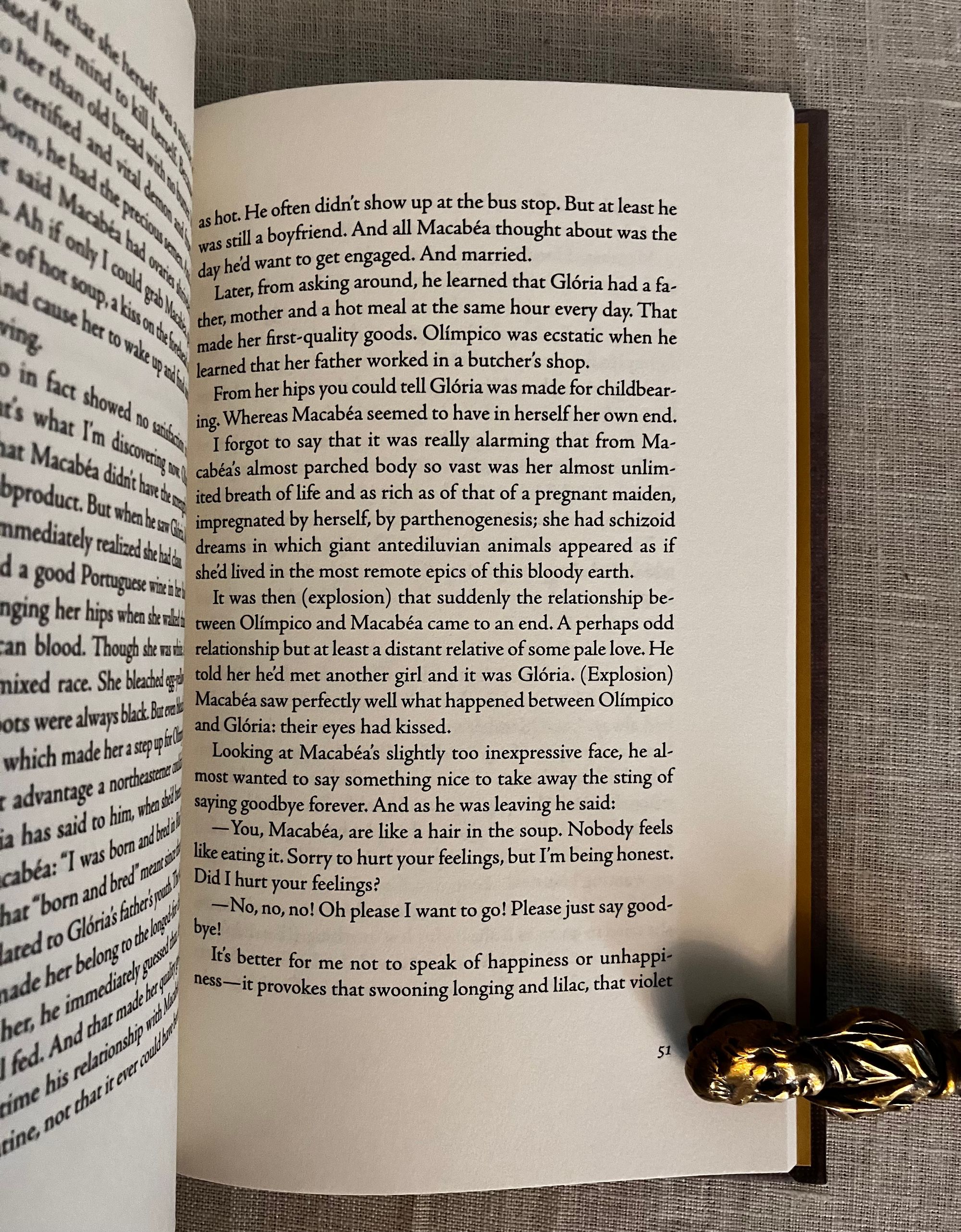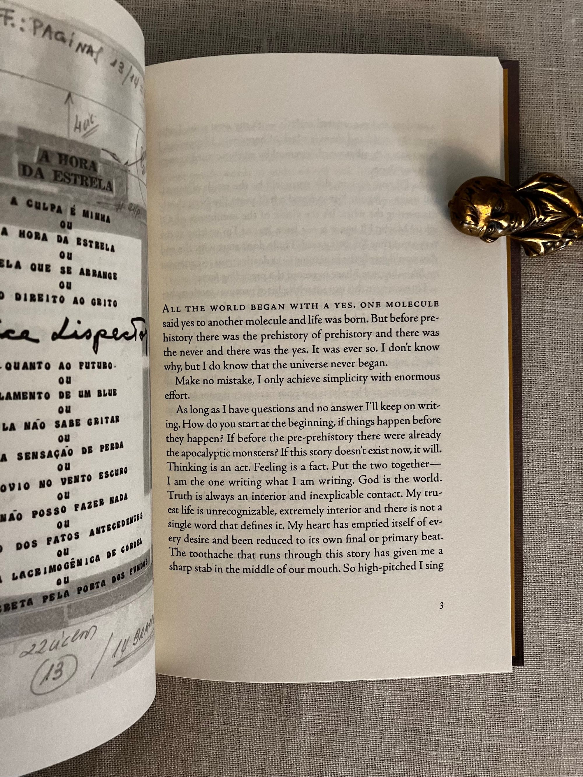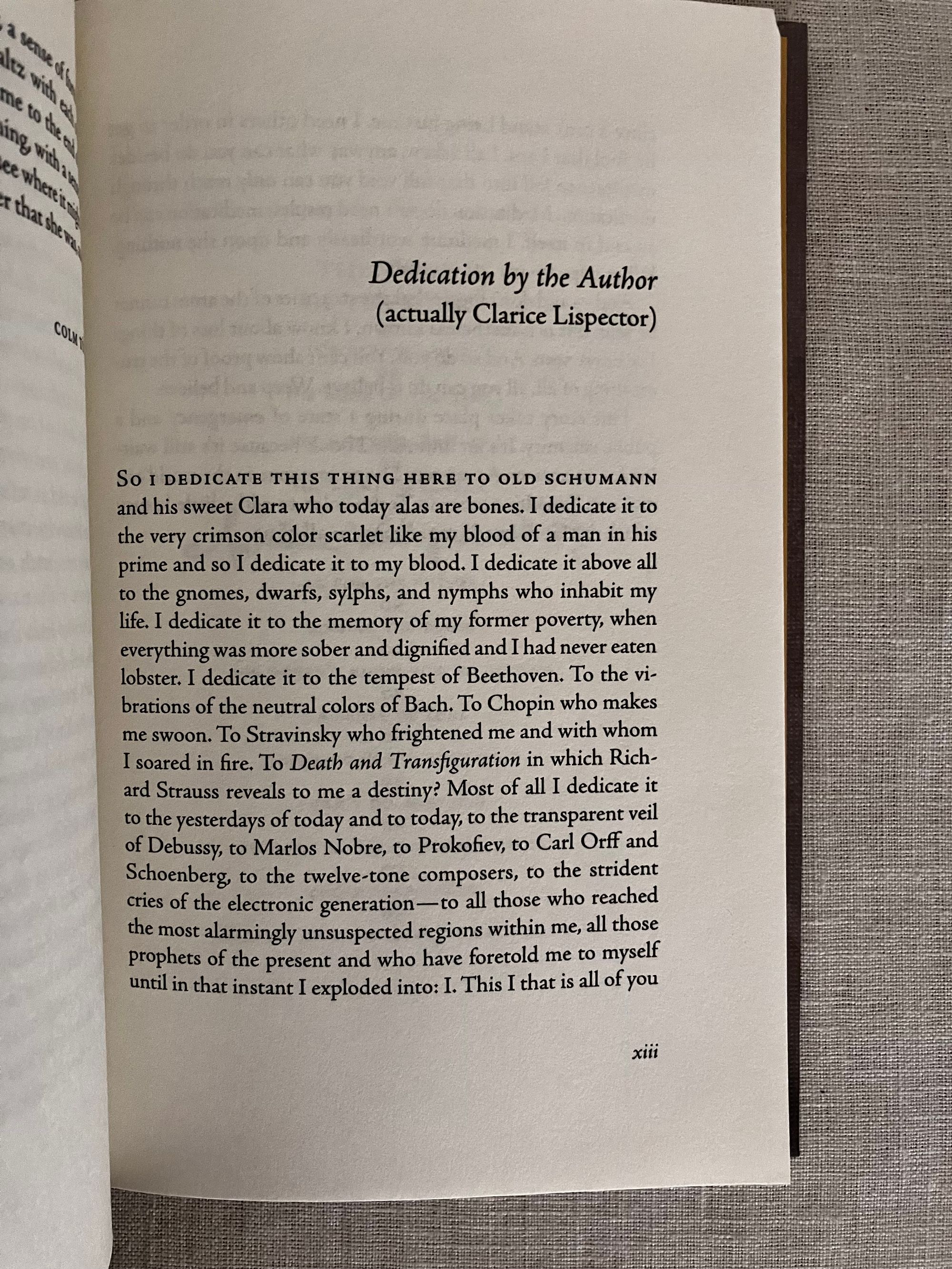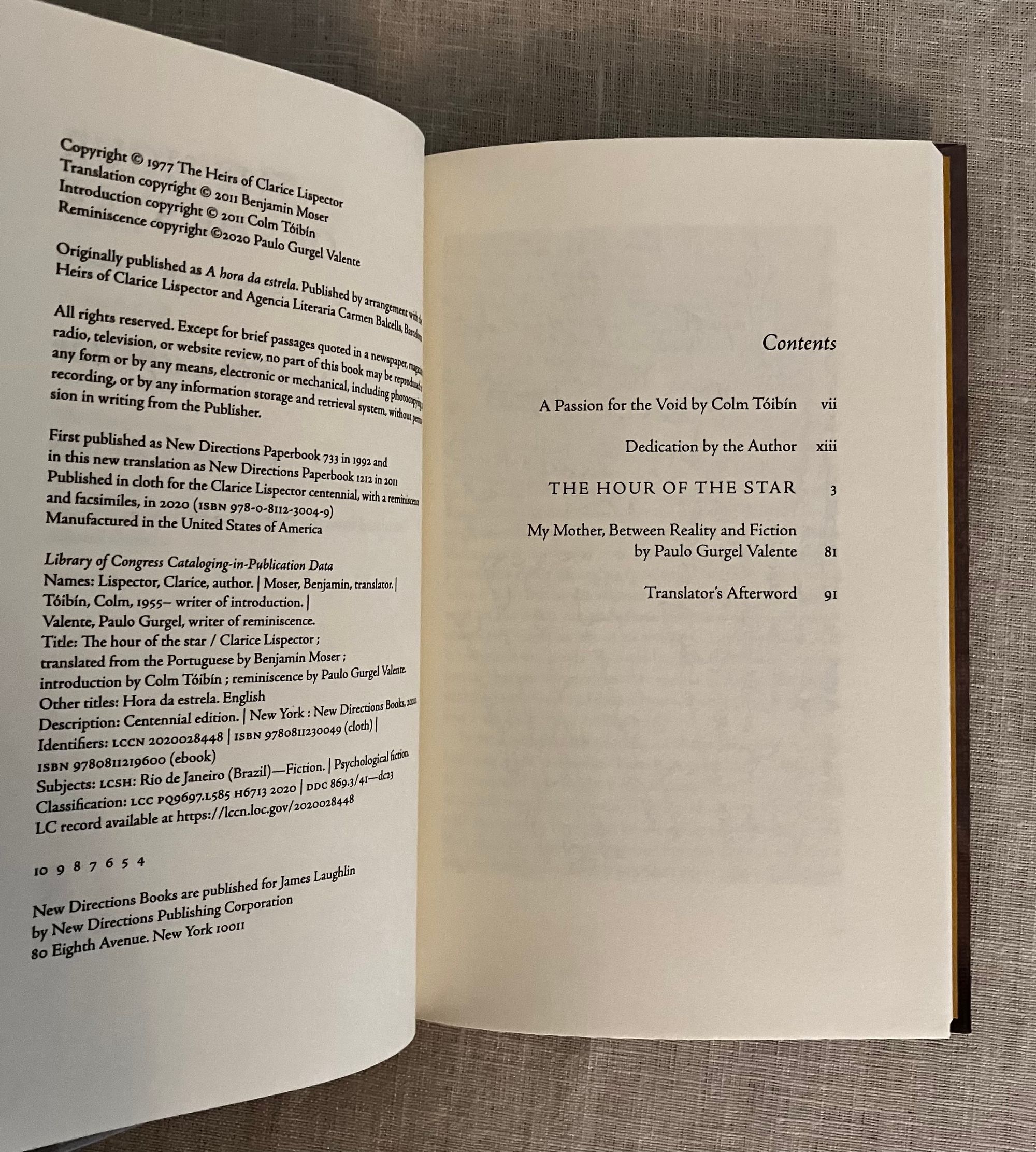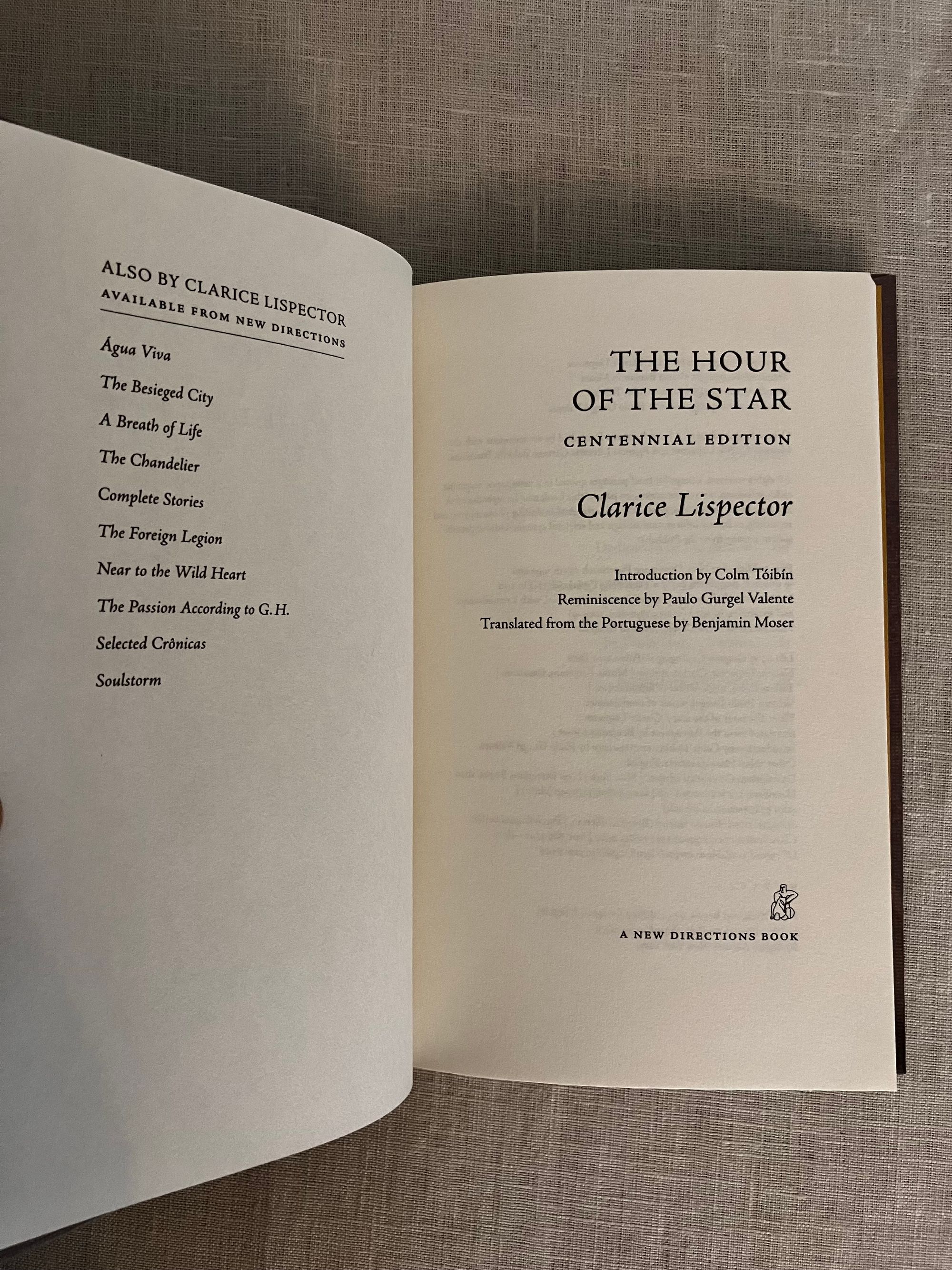 First Edition, fourth printing of the Centennial Edition. Hard cover, 16 mo, in printed paper covered boards with stars in gold, titles to the spine in gold. Without dust jacket, as issued. Gold colored end papers with reviews. vii- viv, 93pp. CONDITION: Fine, like new. ISBN 978-0-8112-3004-9. Features a new translation, reminiscence by her son, and introduction by novelist Colm Tóbín. "Clarice Lispector"s final novel, initially published under the name "A hora da estrela" in her native Portuguese in 1977. A powerfully written and unfinished novelette by the Ukrainian transplant to Brazil, novelist and short story writer Clarice Lispector. (1920-1977.) As described by her admiring introductory writer Colm Tóbín, Lispector's unflinching originality was born of an "outsider" self-trained mentality, in which she rarely read, and therefore managed not to imitate others in syntax, style or substance. In this case, her valedictory novel's action takes the reader on a philosophical journey of the narrator, a man, who observes the main character, Macabéa, a simple impovershed, lonely office worker in Rio de Janeiro with little sympathy, sometimes impatience and always with an eye to his own interests. A fortune teller plays an important role in Macabéa's pursuit of a belatedly planned future in this striking piece of modern writing. ISBN 978-0-8112-3004-9. (AMJ)