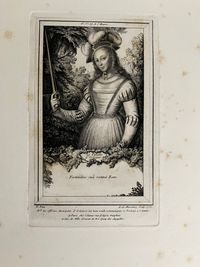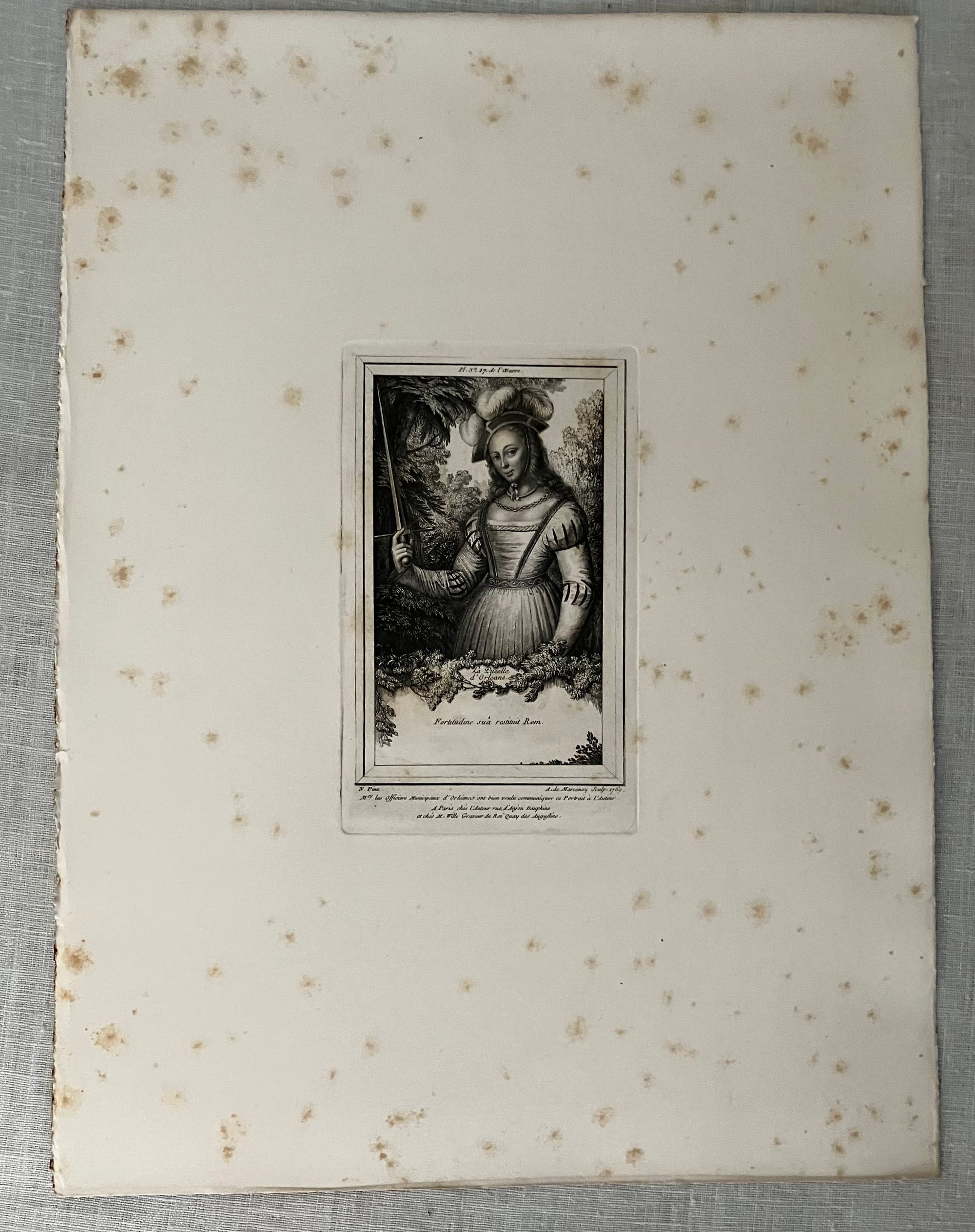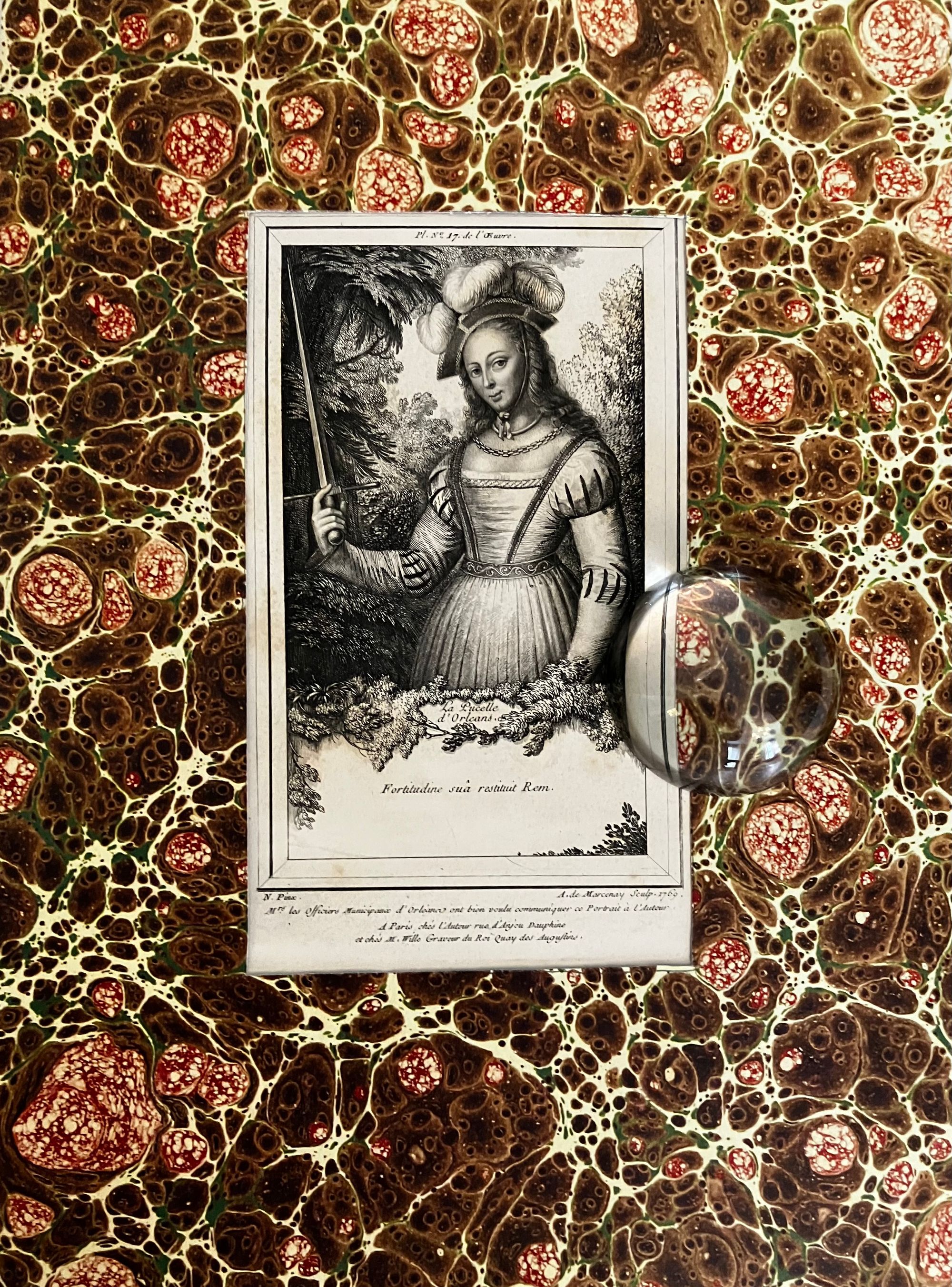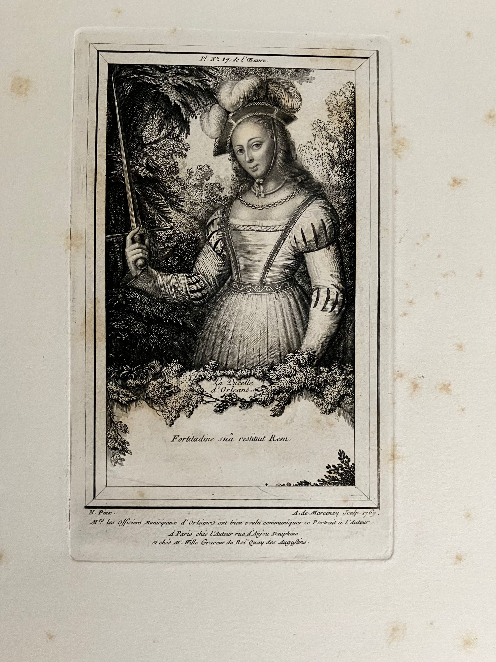 Original Antique Engraved Etching, 4to, dated 1769 in the plate, a single folio leaf measuring 11 x 17 inches, with the plate mark at 16 x 9.5 cm. Text in French. **CONDITION: Very Good. Foxing as seen to margins, and faintly affecting plate in several places. **Please note that the scrapbook marbled paper here is not attached and not included; only used display what the work might look like if matted and framed. Last two photos are provided for information only. **Artist ANTOINE DE MARCENAY DE GHUY (1724-1811) has been described as an amateur painter, engraver and etcher, from an aristocratic family of the Arnay-le-Duc, a commune in the Côte-d'Or region of eastern France. He often worked in the style of Dutch masters Rembrandt, and his student Gerard Dou, experimenting to reproduce the dramatic effect of shadowing or chiaroscuro. Here, however, his inspiration is attributed to work of Lucas Cranach the Elder, the German Renaissance artist. (British Museum). The SUBJECT, "The Maid" of Orlean" refers to Jean d'Arc, the 15th century mystic and military leader later canonized as Patron Saint of France for her part in the French victory at the Siege of Orléans in 1429, resulting in the defeat of the English and Burgundian invaders, thereby enabling the end of the Hundred Years War and elevation of the French King Charles VII. "La Pucelle d'Orleans" was also a saucy epic poem by Voltaire satirizing her life and achievements first produced from the early to mid 18th century. Biographer Louis Morand identifies this as one of the artist's most popular works. Refs: C. LeBlanc, "Manuel de l'amateur d'estampes..."(Paris: P. Jannet, 1854) p. 599, No. 5. L. Morand, "Antoine de Marcenay de Ghuy, peintre et graveur, 1724-1811. Catalogue de son oeuvre..." (Paris, 1901). Fine Art Museum San Francisco A102751. We will mail any prints well protected in a flat box. And please contact us if interested in multiple prints in order to save on postage. (AMJ)
