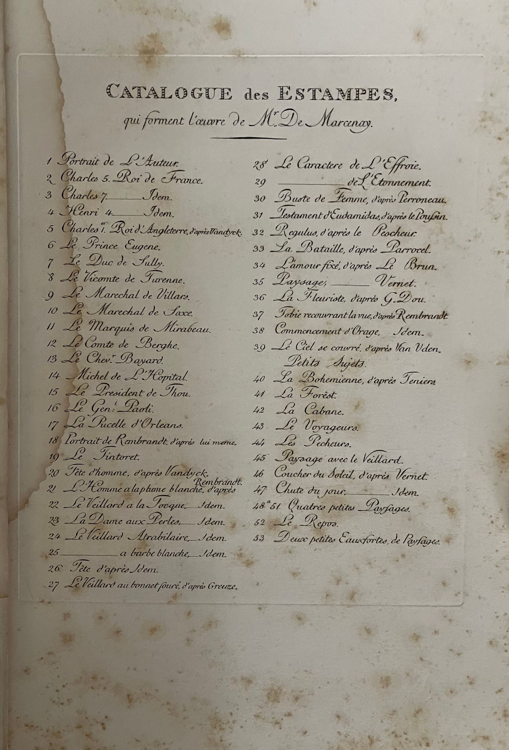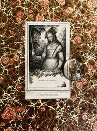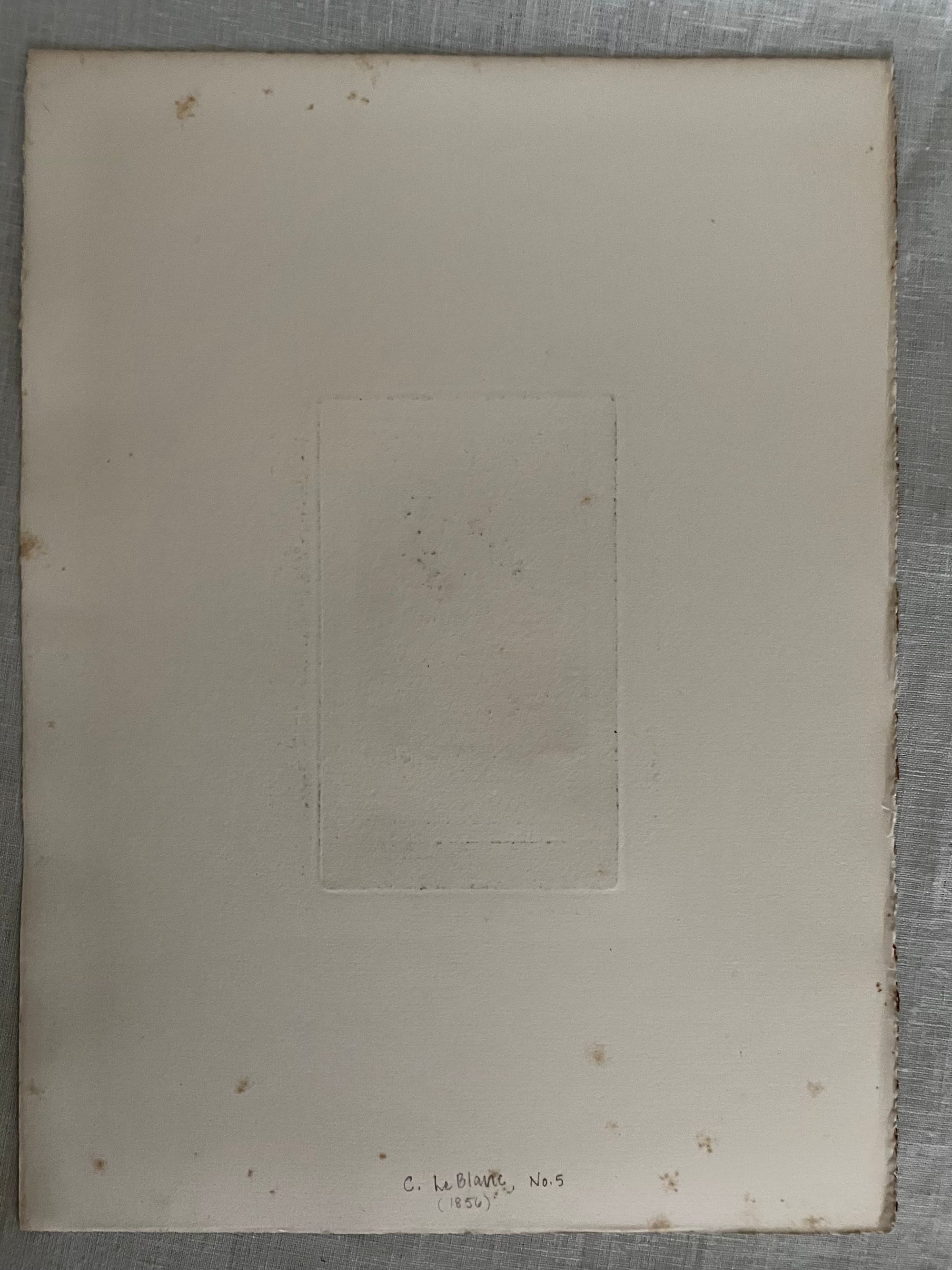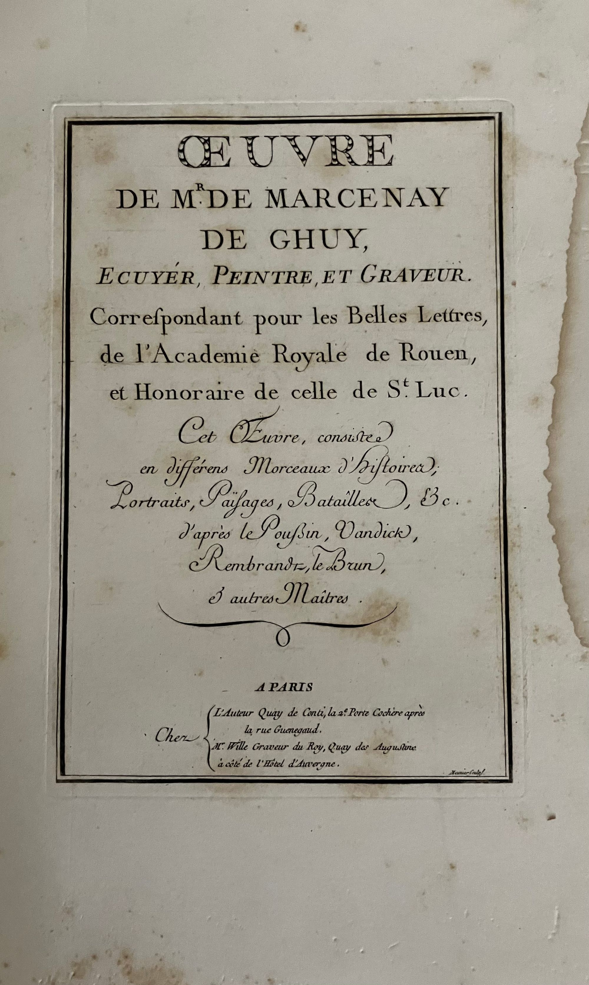 Original Antique Engraved Etching, 4to, dated 1769 in the plate, a single folio leaf measuring 11 x 17 inches, with the plate mark at 16 x 9.5 cm. Text in French. **CONDITION: Very Good. Foxing as seen to margins, and faintly affecting plate in several places. **Please note that the scrapbook marbled paper here is not attached and not included; only used display what the work might look like if matted and framed. Last two photos are provided for information only. **Artist ANTOINE DE MARCENAY DE GHUY (1724-1811) has been described as an amateur painter, engraver and etcher, from an aristocratic family of the Arnay-le-Duc, a commune in the Côte-d'Or region of eastern France. He often worked in the style of Dutch masters Rembrandt, and his student Gerard Dou, experimenting to reproduce the dramatic effect of shadowing or chiaroscuro. Here, however, his inspiration is attributed to work of Lucas Cranach the Elder, the German Renaissance artist. (British Museum). The SUBJECT, "The Maid" of Orlean" refers to Jean d'Arc, the 15th century mystic and military leader later canonized as Patron Saint of France for her part in the French victory at the Siege of Orléans in 1429, resulting in the defeat of the English and Burgundian invaders, thereby enabling the end of the Hundred Years War and elevation of the French King Charles VII. "La Pucelle d'Orleans" was also a saucy epic poem by Voltaire satirizing her life and achievements first produced from the early to mid 18th century. Biographer Louis Morand identifies this as one of the artist's most popular works. Refs: C. LeBlanc, "Manuel de l'amateur d'estampes..."(Paris: P. Jannet, 1854) p. 599, No. 5. L. Morand, "Antoine de Marcenay de Ghuy, peintre et graveur, 1724-1811. Catalogue de son oeuvre..." (Paris, 1901). Fine Art Museum San Francisco A102751. We will mail any prints well protected in a flat box. And please contact us if interested in multiple prints in order to save on postage. (AMJ)