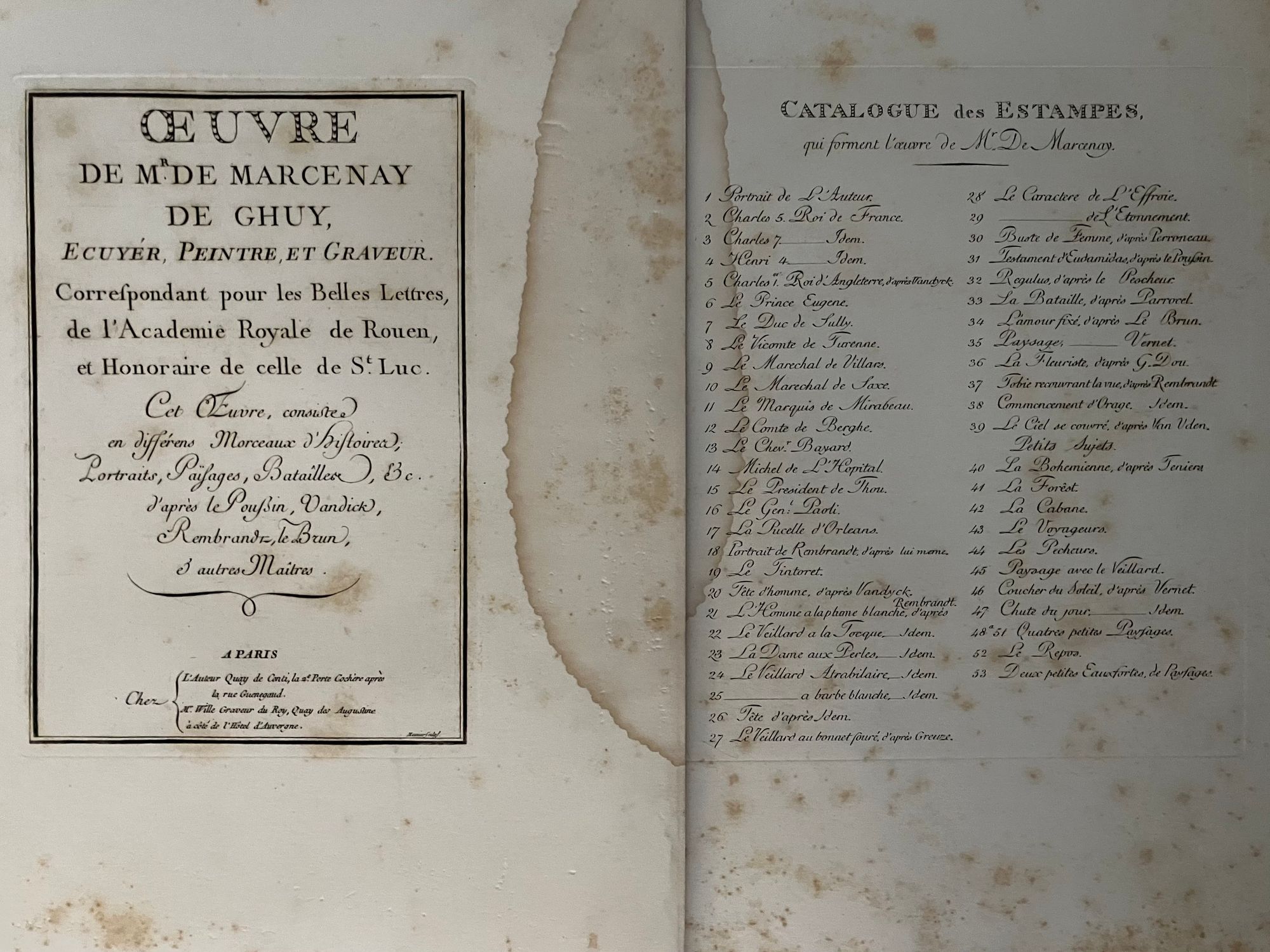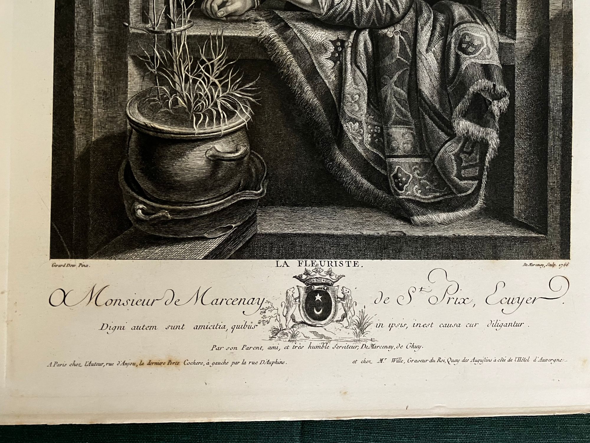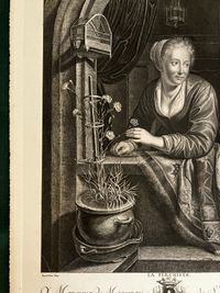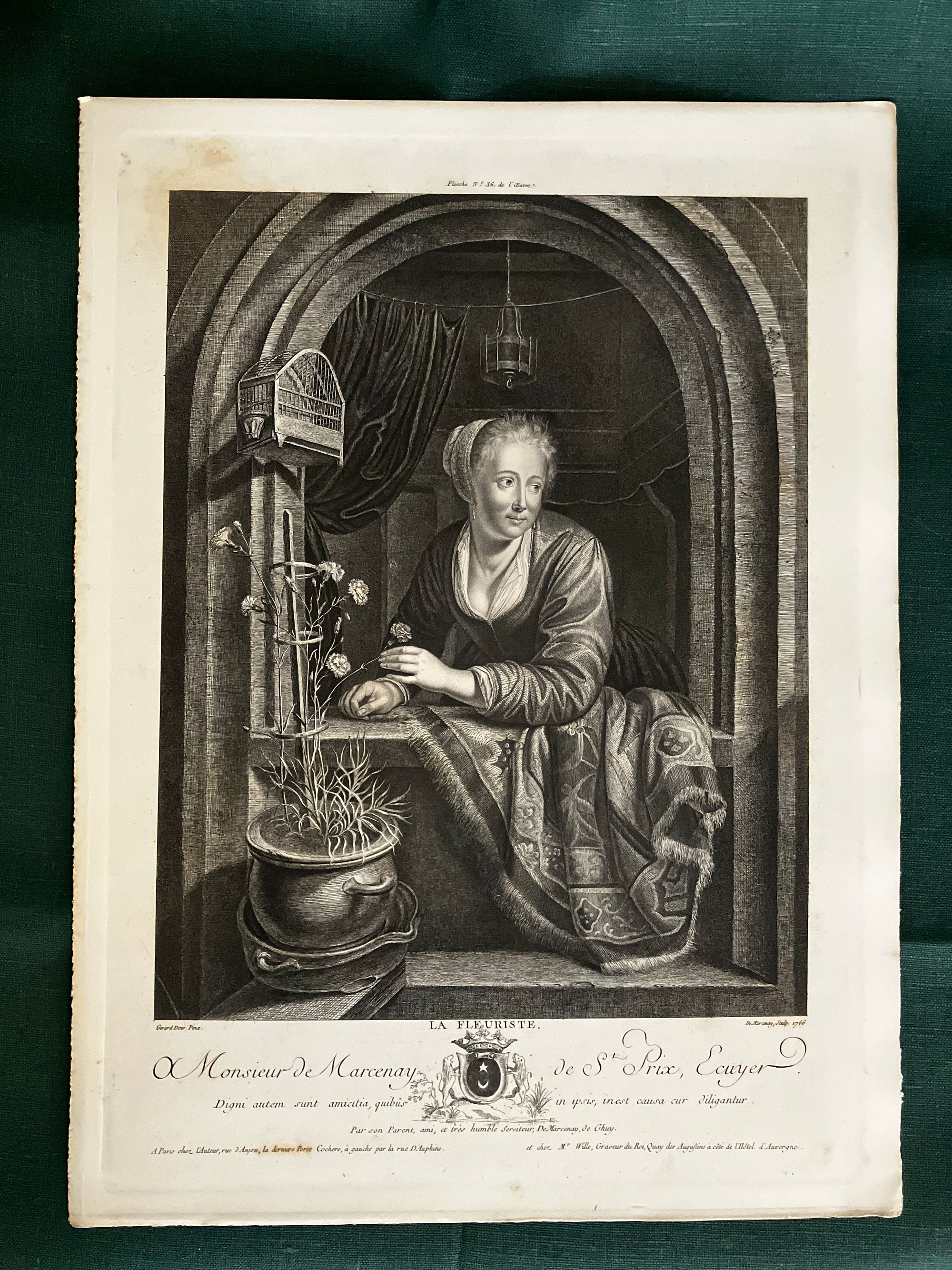 Original Antique Engraved Etching, 4to, dated 1766 within the plate, a single folio leaf measuring 11 x 17 inches, with the plate mark at 35.8 x 25.5 cm. This domestic scene features a young woman in the window of her home, picking, or perhaps about to reach down and smell, a carnation from the pot growing on the balcony while glancing out in the opposite direction at perhaps a street or canal scene. A birdcage hangs in the window. ** CONDITION: Very Good with minor areas of foxing as seen, primarily at margins, although lightly affecting bottom line of text. Would look wonderful matted and framed. Final picture for reference only and not included. **Text:" (top) Planche No. 36 de l'Oeuvre." (bottom) Gerard Dou, pinx. / De Marcenay, Sculp. 1766./ Monsieur de Marcenay de St. Prix, Ecuyer./ Digni autem sunt amicutia quibus in upsis, inest causa cur diligantur./ Par son Parent, ami, et trés humble Servitor, DeMarcenay de Ghuy,/A Paris chez rue d'Anjou, la dermier Porte Cochere, á ganche par la rue D'Auphine et chez Mr. Wille, Graveur du Roi, Quay des Agustins à côte de l'Hotel d'Auvergne." After Gerard Dou, Dutch 18th century artist and disciple of Rembrandt. From the "Oeuvre de Mr. de Marcenay de Ghuy, Ecuyer, Peintre, et Graveur," published around 1780, in which it was Pl.36. The Dutch painter Gerard Dou (1613-1675) was from Leiden, initially trained as a glazier, although later studying painting under Rembrandt. This image is one of a type styled to be within an architectural niche, which was one of his specialties and allowed the artist to explore the textural qualities of the architecture. The coat of arms is of, M. de Marcenay gentleman, of St. Prix, apparently a kinsman of the engraver, to whom he writes an appreciation. British Museum ref. No. 1840,0314,103. LeBlanc No. 46. (AMJ)