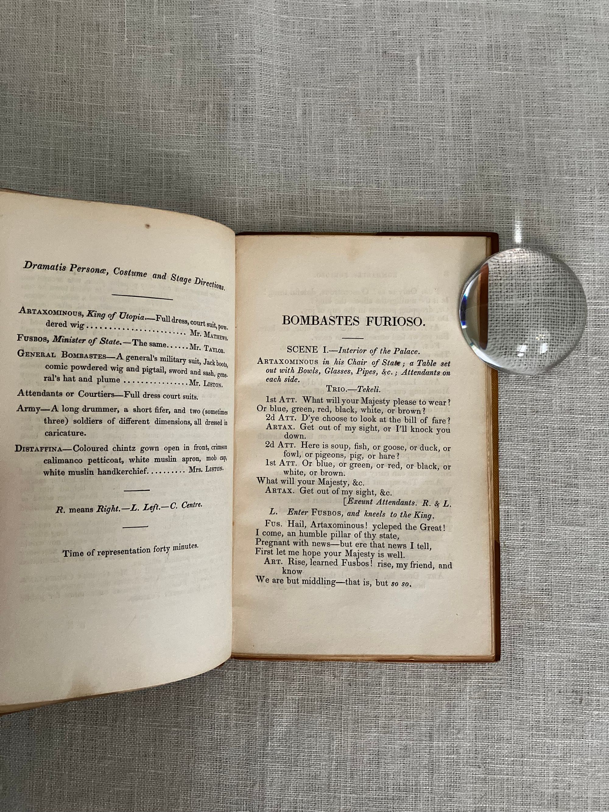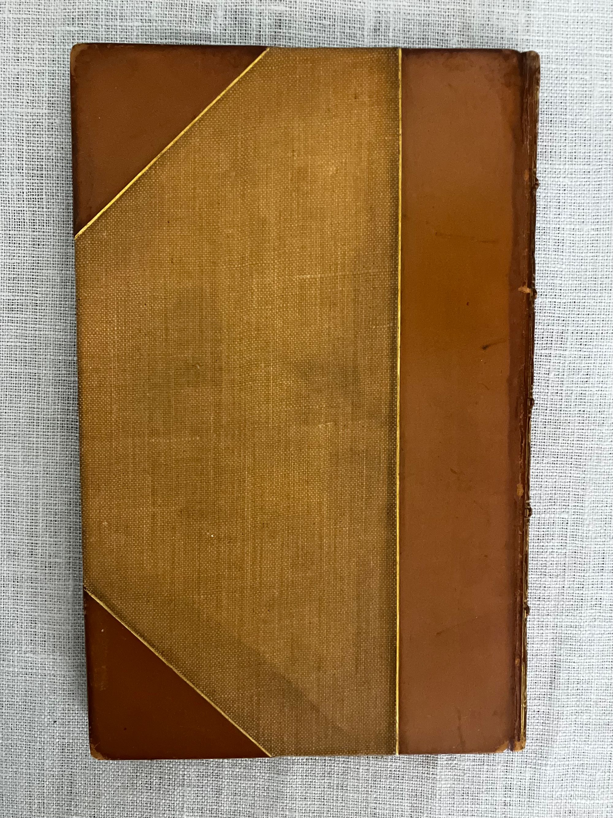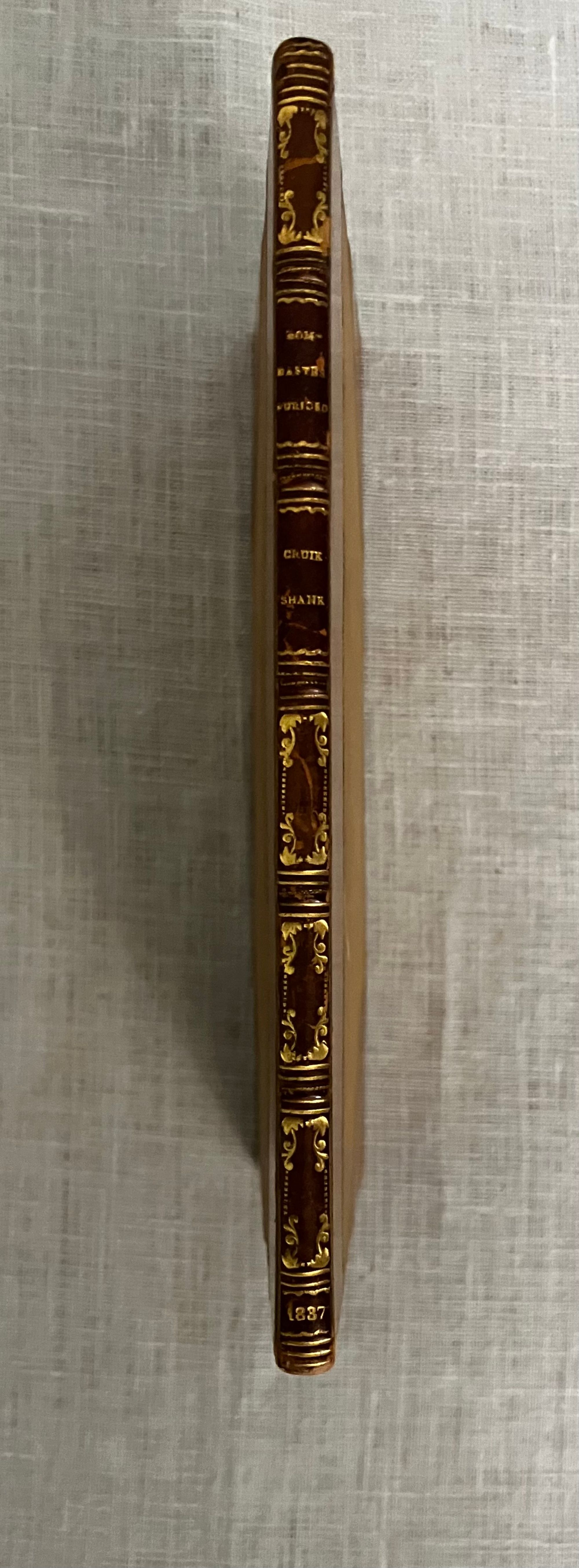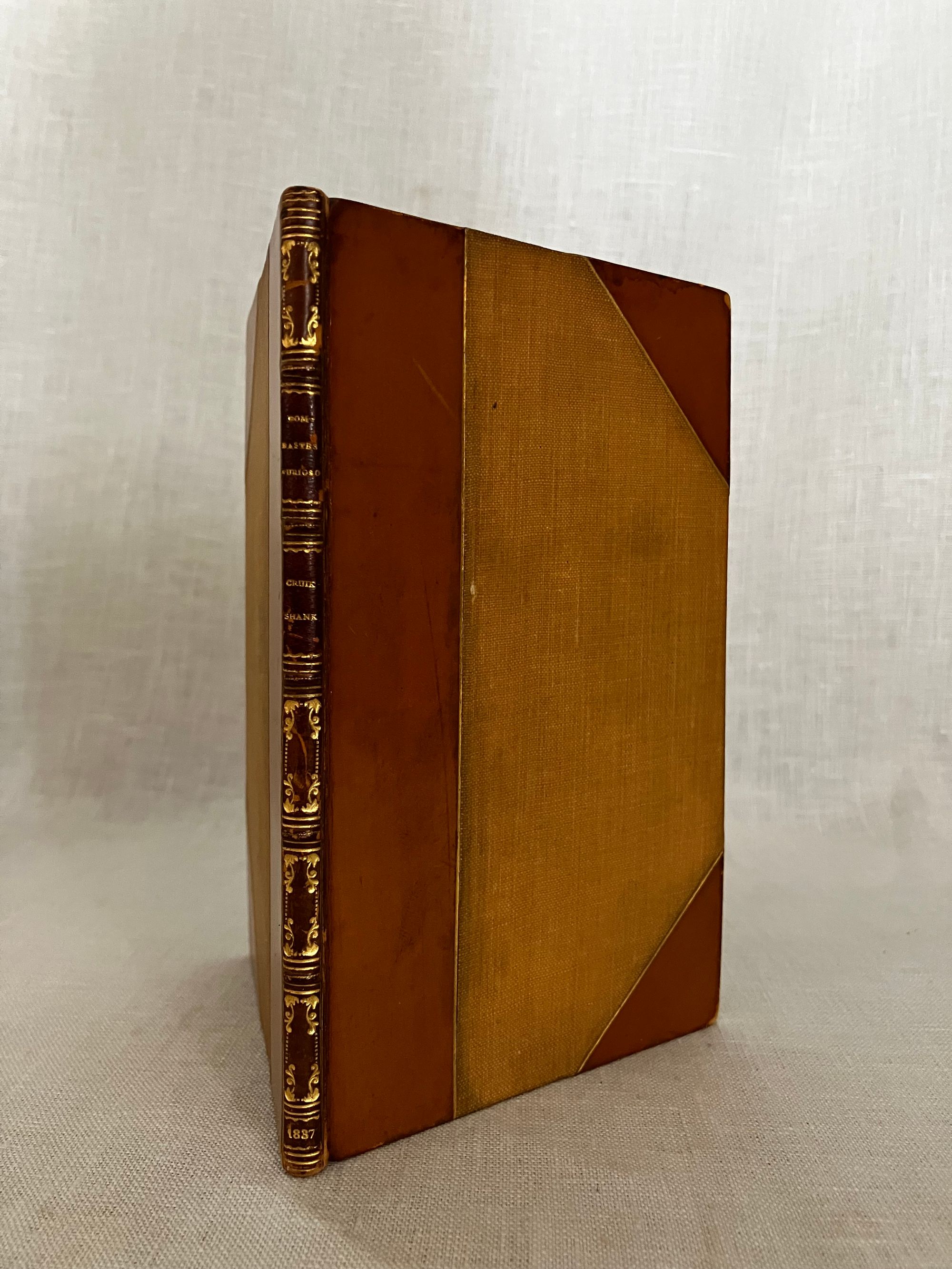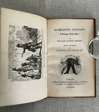First Edition Thus. (First with the Cruikshank woodcut illustrations). Hard cover, 16 mo (4 x 6 3/8 inches), finely bound by Riviere & Sons, stamp signed to verso endpaper, in three-quarter calf with tan cloth-covered boards. Spine with six raised bands tooled with elaborate gilt decorations, all board edges ruled in gilt, a.e.g. The spine with six raised bands tooled with elaborate gilt decoration, and titles, [3] 34, [3] pp. Illustrated frontispiece plus five other full page wood engraved illustrations by renowned British illustrator George Cruikshank ((1792-1878) Also, with smaller vignette at title page and one at "fini". Printed by J. Unwin, St. Peter's Alley, Cornhill. CONDITION: Very Good. Slight soiling to cloth. Joints have light rubbing at head and tail of spine. Tips gently rubbed. Inside, hinges are in order and remains firmly bound. Old polish or glue? offset to the marbled endpapers, including at inside corners, browning some areas of the marbling. Text lightly age toned. Gilt remains bright. **A short, one-act burlesque, to which several songs were added, at least one of which was written by another author (see p. 14.) In the story, the King of Utopia, Artaxominous, holds court --in verse--with a ramshackle audience of functionaries, making light of any real issues of the day to concern himself rather with the romance of a young lady who is not his wife. A silly duel ensues. There is a dramatic death scene, and the stage erupts into song. Wildly popular by all accounts. This 1837 edition, was the first to use the Cruikshank engraved illustrations. Publisher Joseph Thomas was a stationer and news vendor in London's Cornhill; Simpkin and Marshall were publishers and book wholesalers during this period. The Introduction describes the career of the AUTHOR, W. B. Rhodes (1772-1826). After a stint working in an attorney's office, Rhodes was engaged as a teller at The Bank of England and collected large numbers of English plays. "Bombastes Furiouso" was his premier contribution to the genre, although he had several other published titles in a similarly humorous vein. The one-act play was first performed in London at the Haymarket on 7th August, 1810. The British Library has a playbill with the names of the actors listed in this publication on p.6: a Mr. Mathews, Mr. Taylor and Mr. Liston, performing at the Theatre Royal, Covent Garden, London on Jan. 11, 1814. (blplaybillsdotorg.) (AMJ)